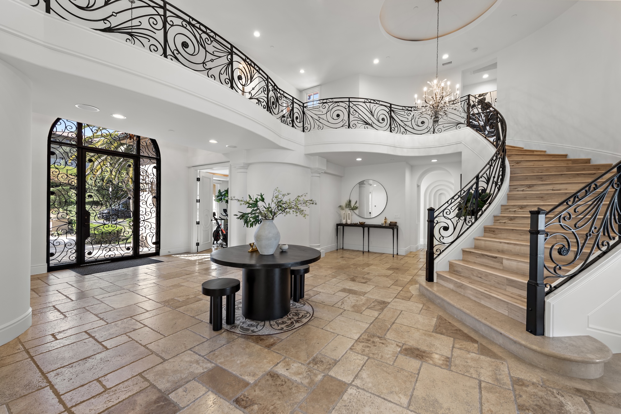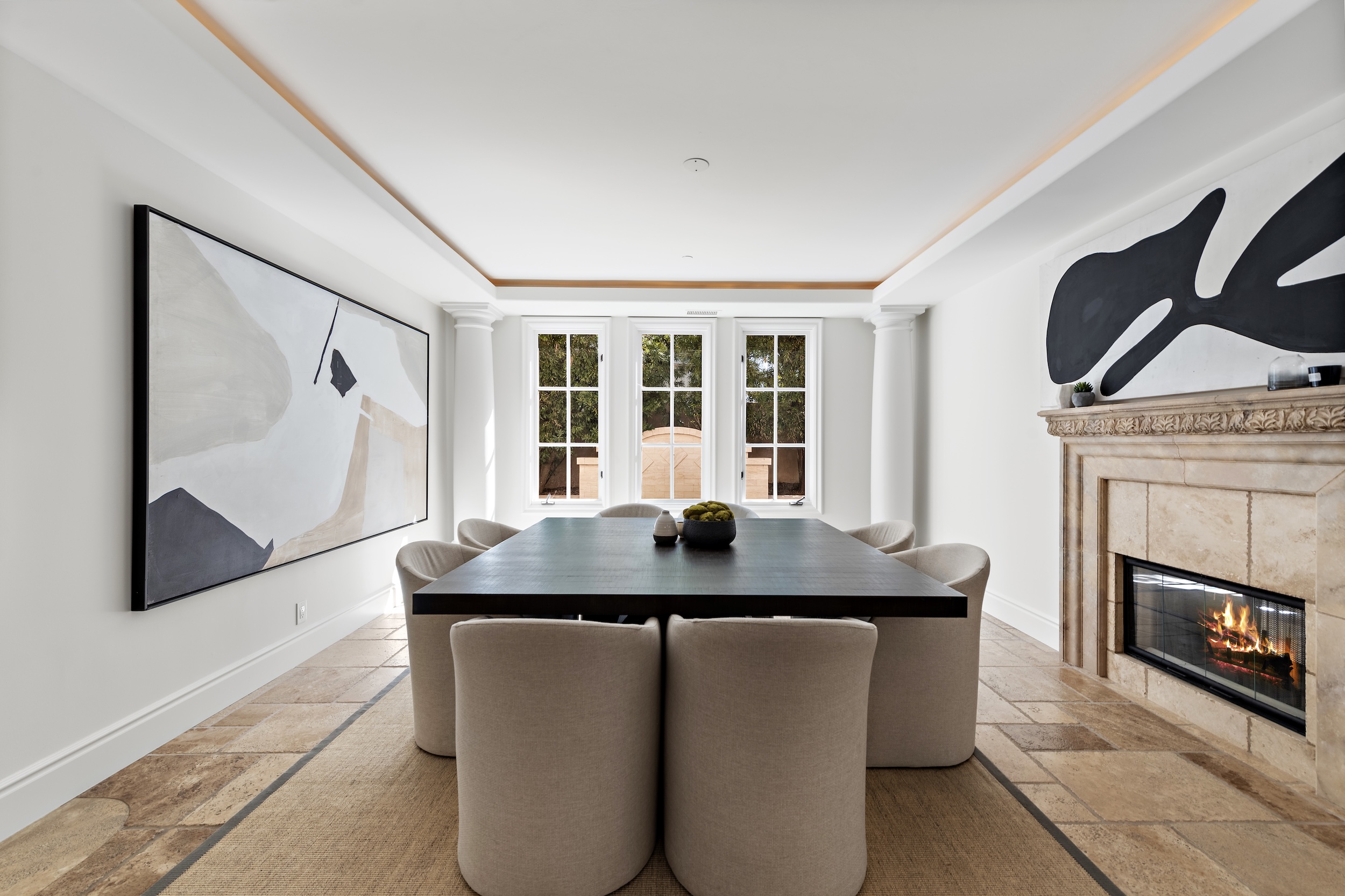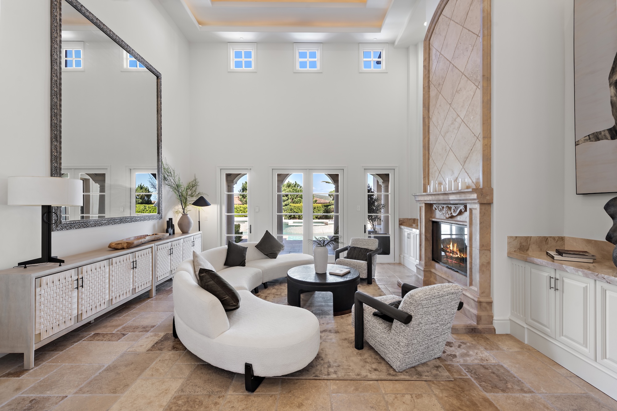 From the moment you enter the light-filled foyer with its sweeping staircase and soaring ceilings, the home exudes sophistication. The layout is thoughtfully designed for both upscale entertaining and everyday living, featuring a formal dining room with French windows and a stone fireplace, a spacious home office easily convertible into a fifth bedroom, and a separate gym adorned with ambient cove lighting. The formal living room stuns with double-height ceilings and a dramatic fireplace, while the inviting family room with coffered ceilings and a wet bar opens seamlessly to the kitchen, breakfast nook, and backyard.