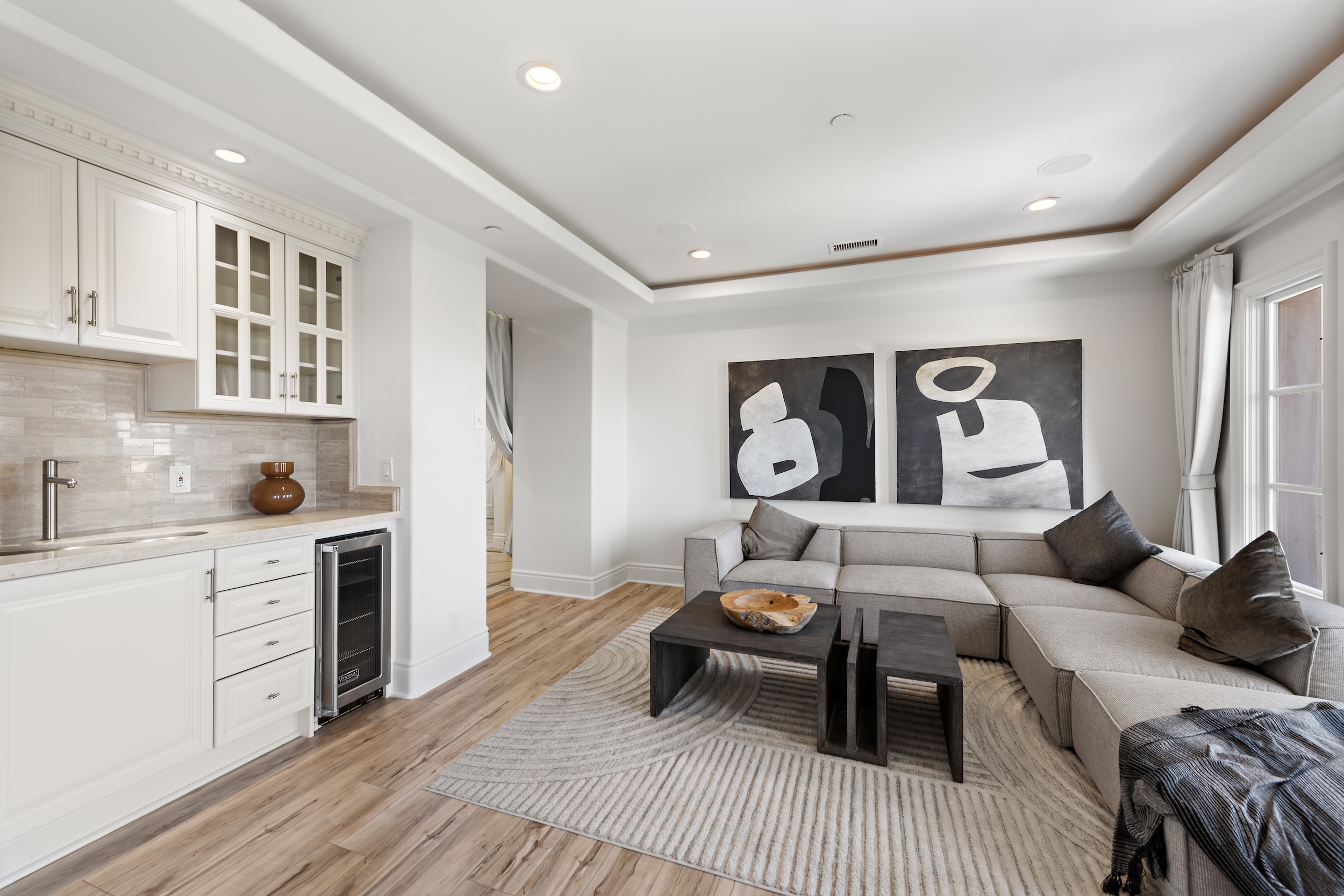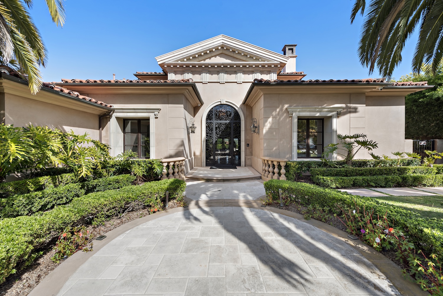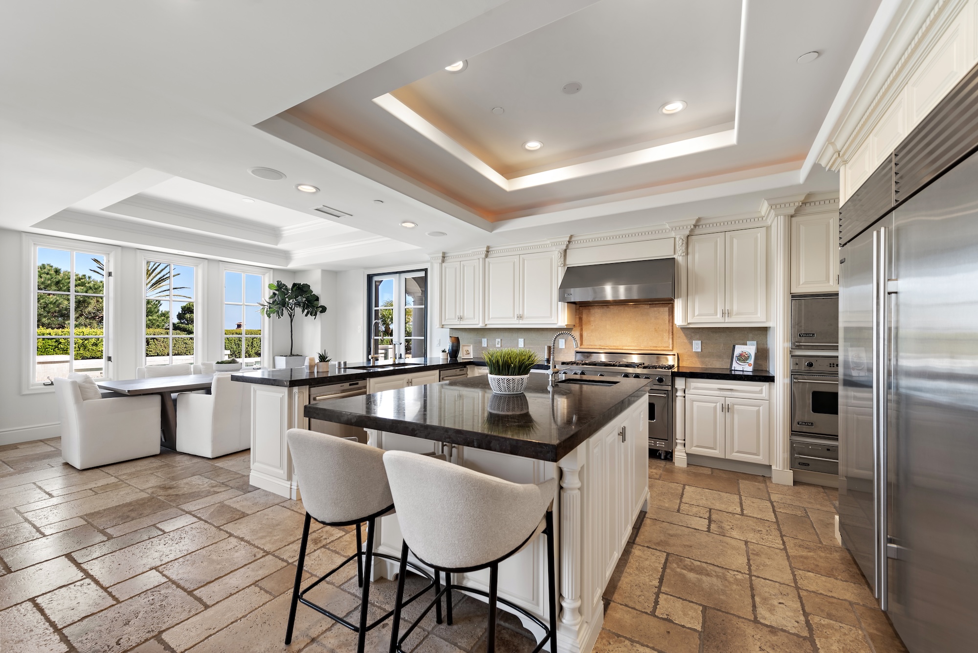 From the moment you enter the light-filled foyer with its sweeping staircase and soaring ceilings, the home exudes sophistication. The layout is thoughtfully designed for both upscale entertaining and everyday living, featuring a formal dining room with French windows and a stone fireplace, a spacious home office easily convertible into a fifth bedroom, and a separate gym adorned with ambient cove lighting. The formal living room stuns with double-height ceilings and a dramatic fireplace, while the inviting family room with coffered ceilings and a wet bar opens seamlessly to the kitchen, breakfast nook, and backyard.