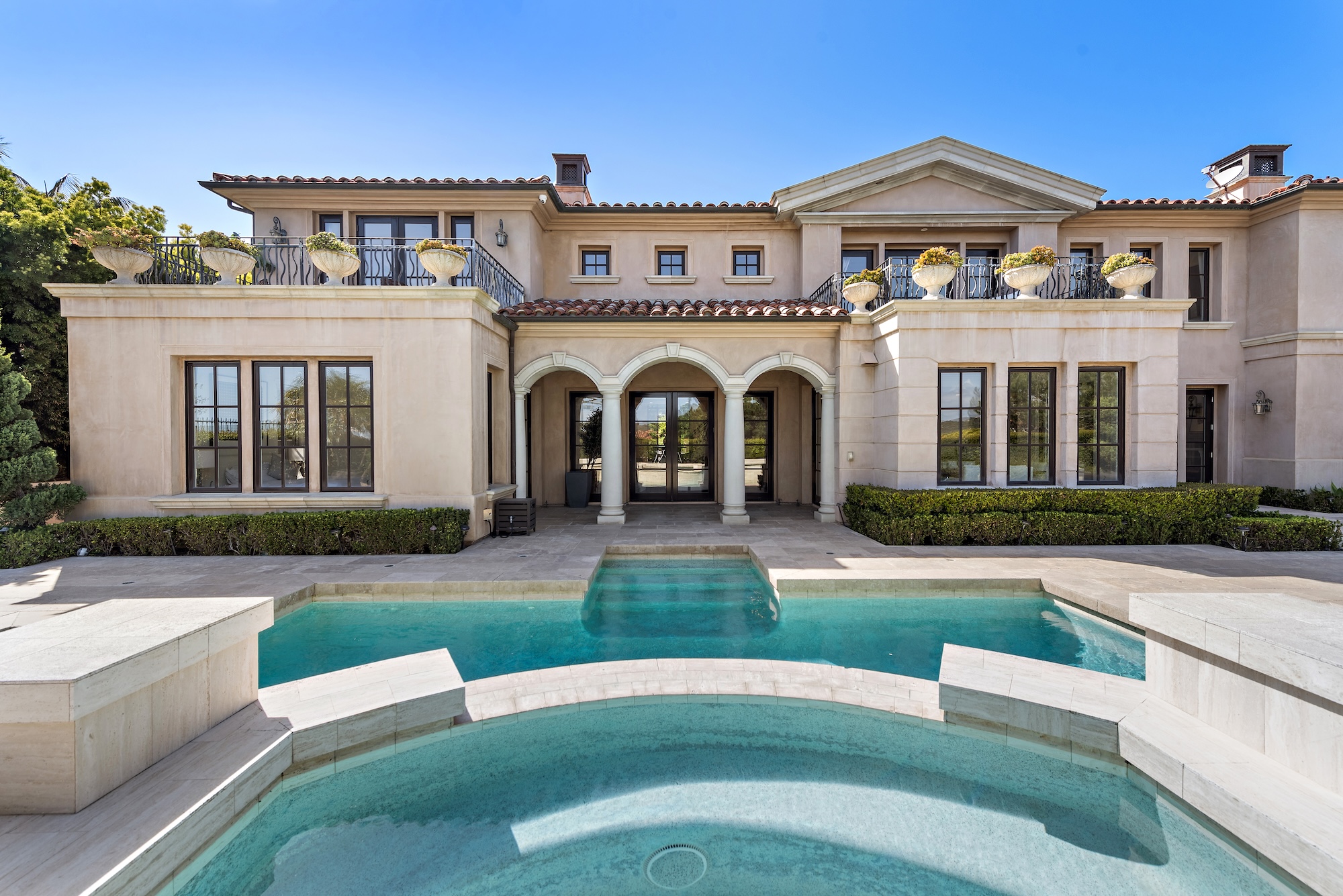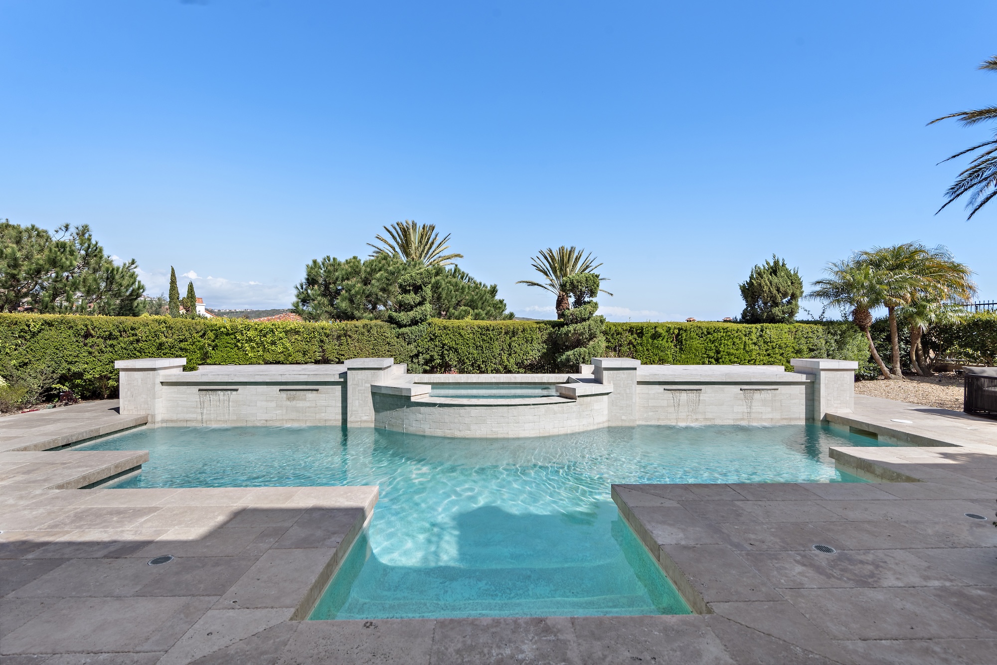 Outdoors, enjoy resort-style living with a sparkling pool, elevated jacuzzi, and cascading water feature—surrounded by mature landscaping for maximum privacy. A covered loggia extends the living space outdoors, while a built-in BBQ kitchen with bar seating creates the perfect backdrop for sunset entertaining. A finished three-car garage adds convenience to this incredible offering.