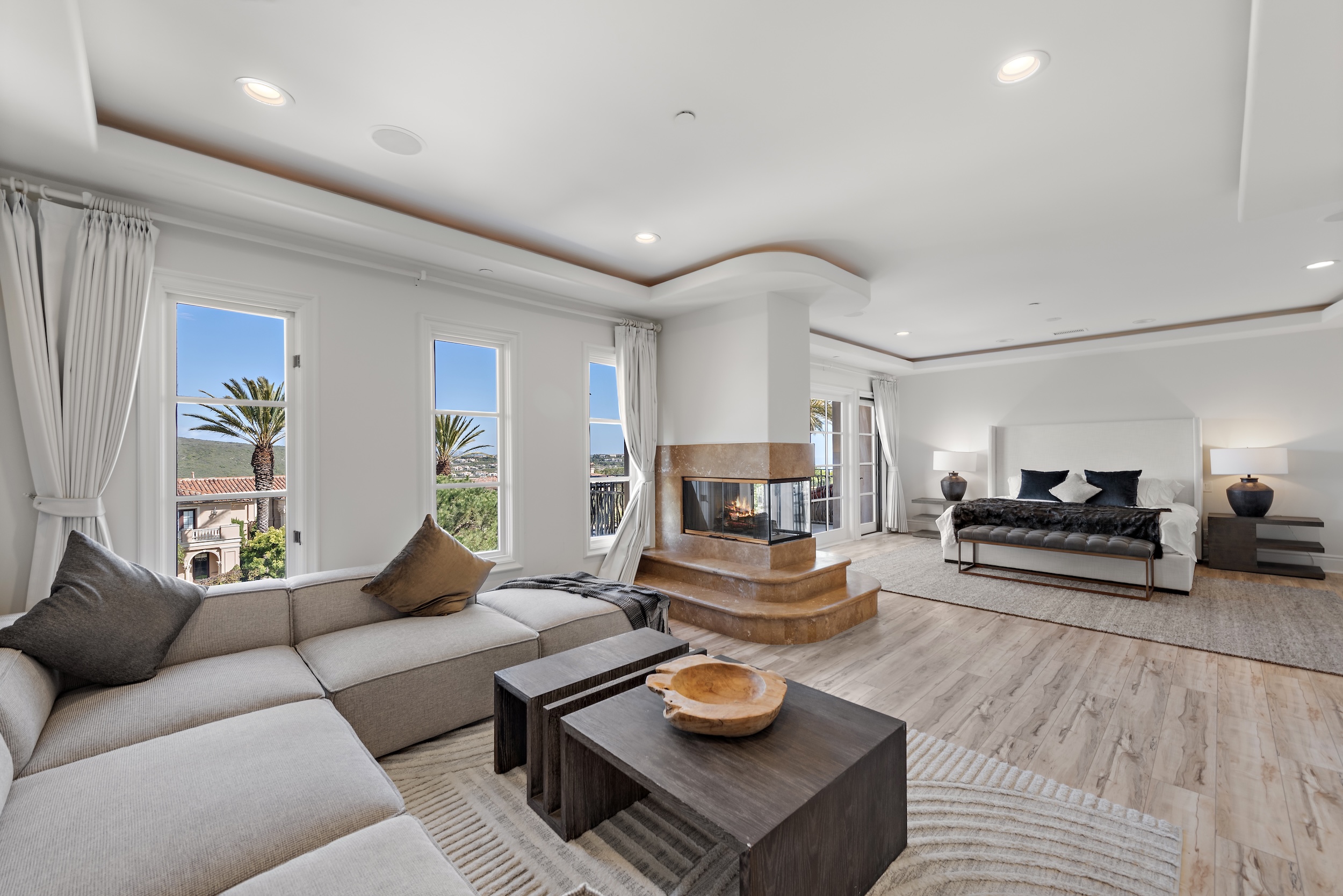 This four-bedroom, five-bathroom estate includes two guest suites on the main floor, each with tranquil garden views and luxurious en-suite baths. Upstairs, the junior suite and expansive primary suite both capture breathtaking views of the Pacific Ocean and surrounding canyon. The primary retreat is a sanctuary, featuring a cozy sitting area, private ocean-facing balcony, double-sided fireplace, spa-inspired bath, and an oversized walk-in closet.