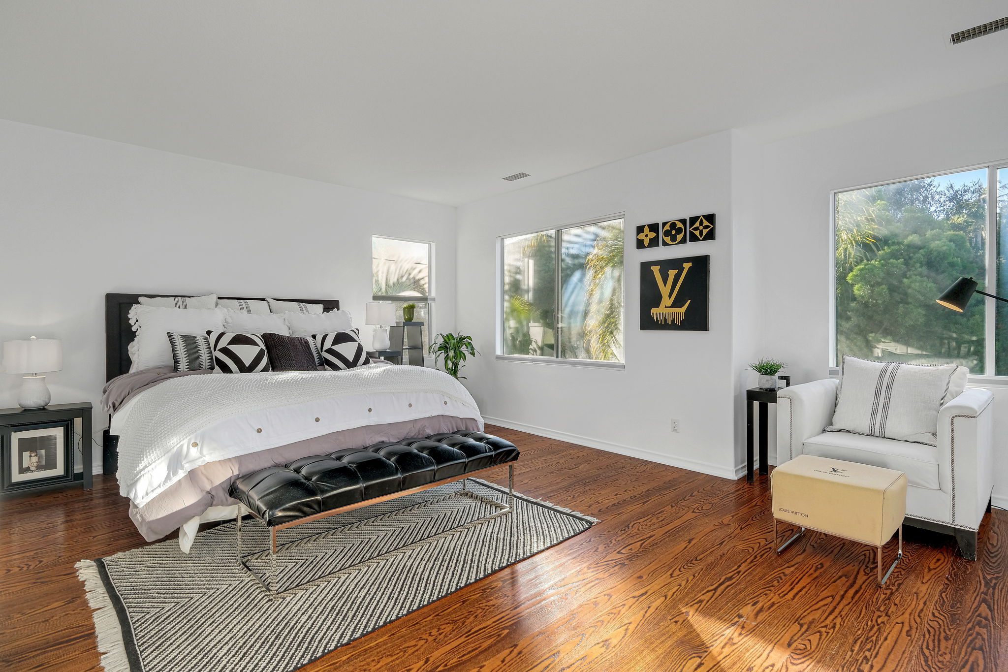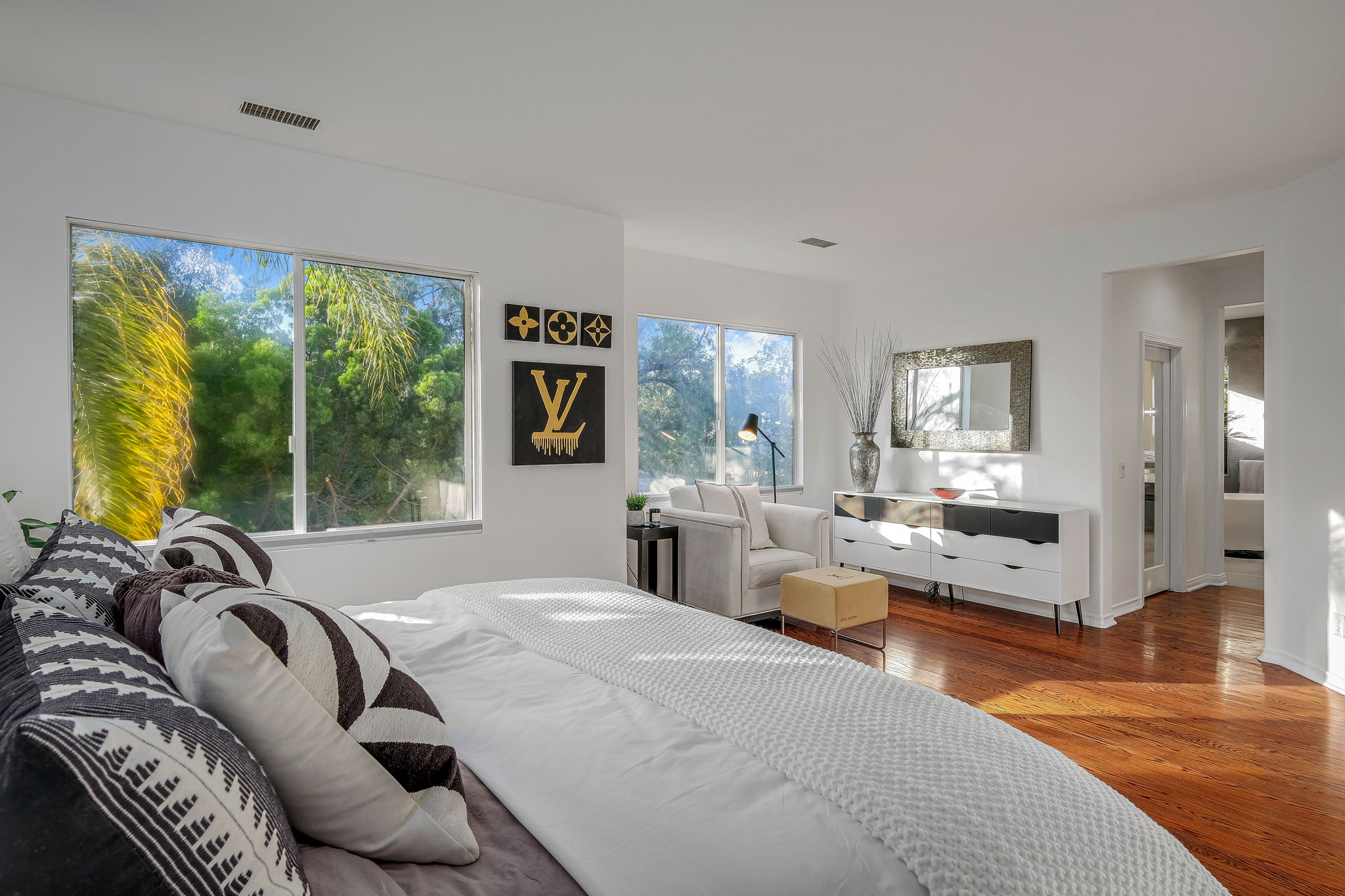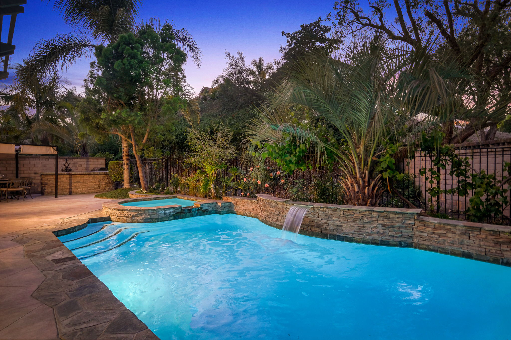 Nestled in the pristine gated community of Oak View Estates in charming Aliso Viejo, this impeccably curated contemporary home boasts a breathtaking entrance with polished concrete flooring, fireplace, soaring vaulted ceilings, and oak flooring throughout. The first floor boasts a generously sized formal dining area and a spacious family room adjacent to the exquisite open concept kitchen with mixed granite and quartz oversized island, top-of-the-line appliances, and a temperature-controlled wine cooler. A completely private and tranquil yard with a pool, spa, and fully-equipped outdoor kitchen is ideal for entertaining. The luxurious owner's suite comes replete with two walk-in closets and a spa-like bathroom with a free-standing tub and walk-in shower. Four additional bedrooms with one of them enjoying its own en-suite bathroom and large balcony. Attached 3-car garage and oversized driveway.