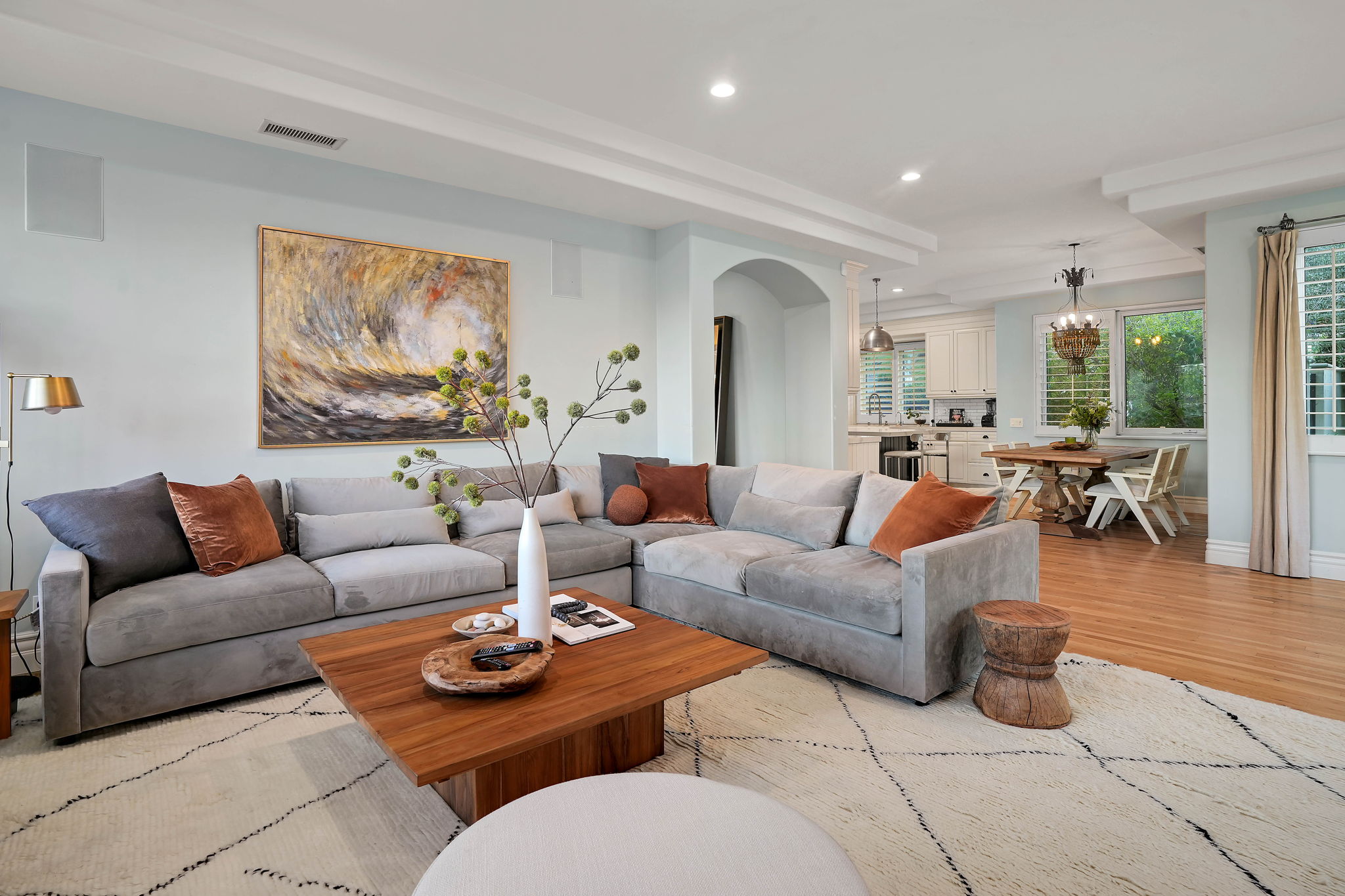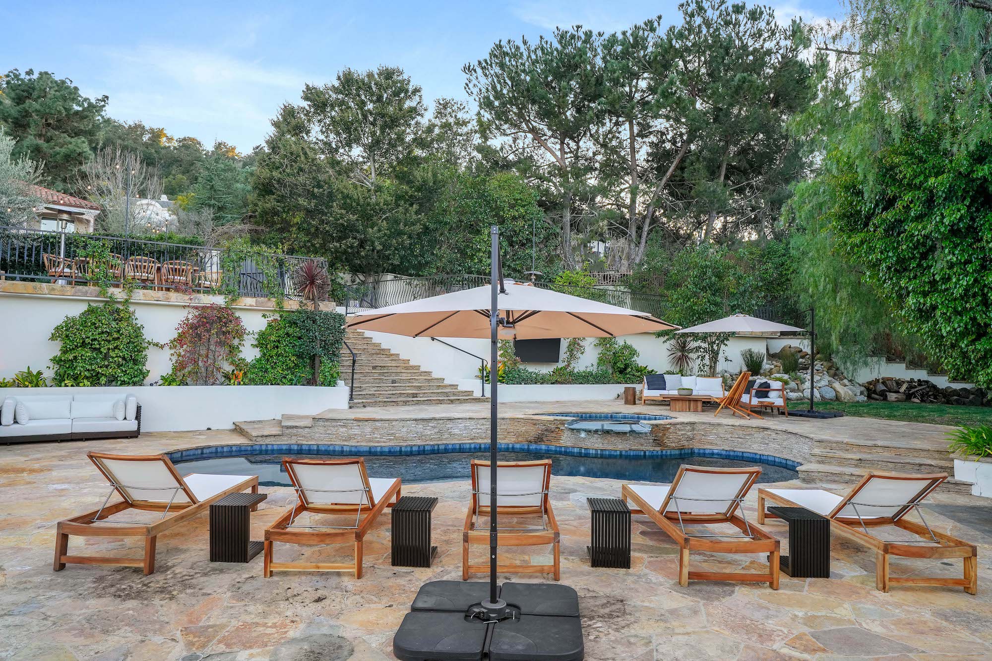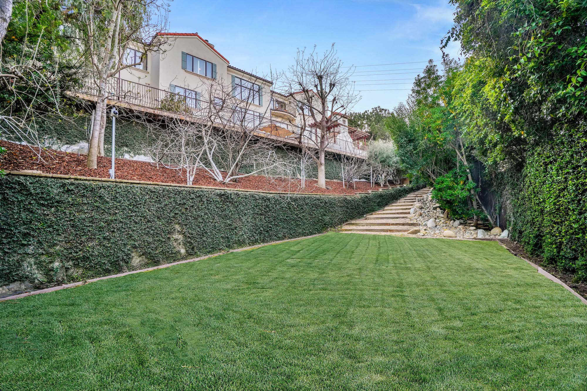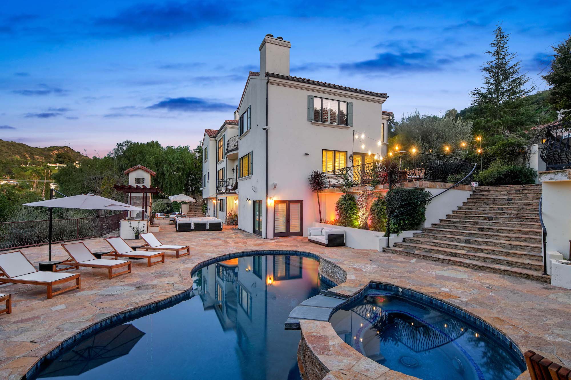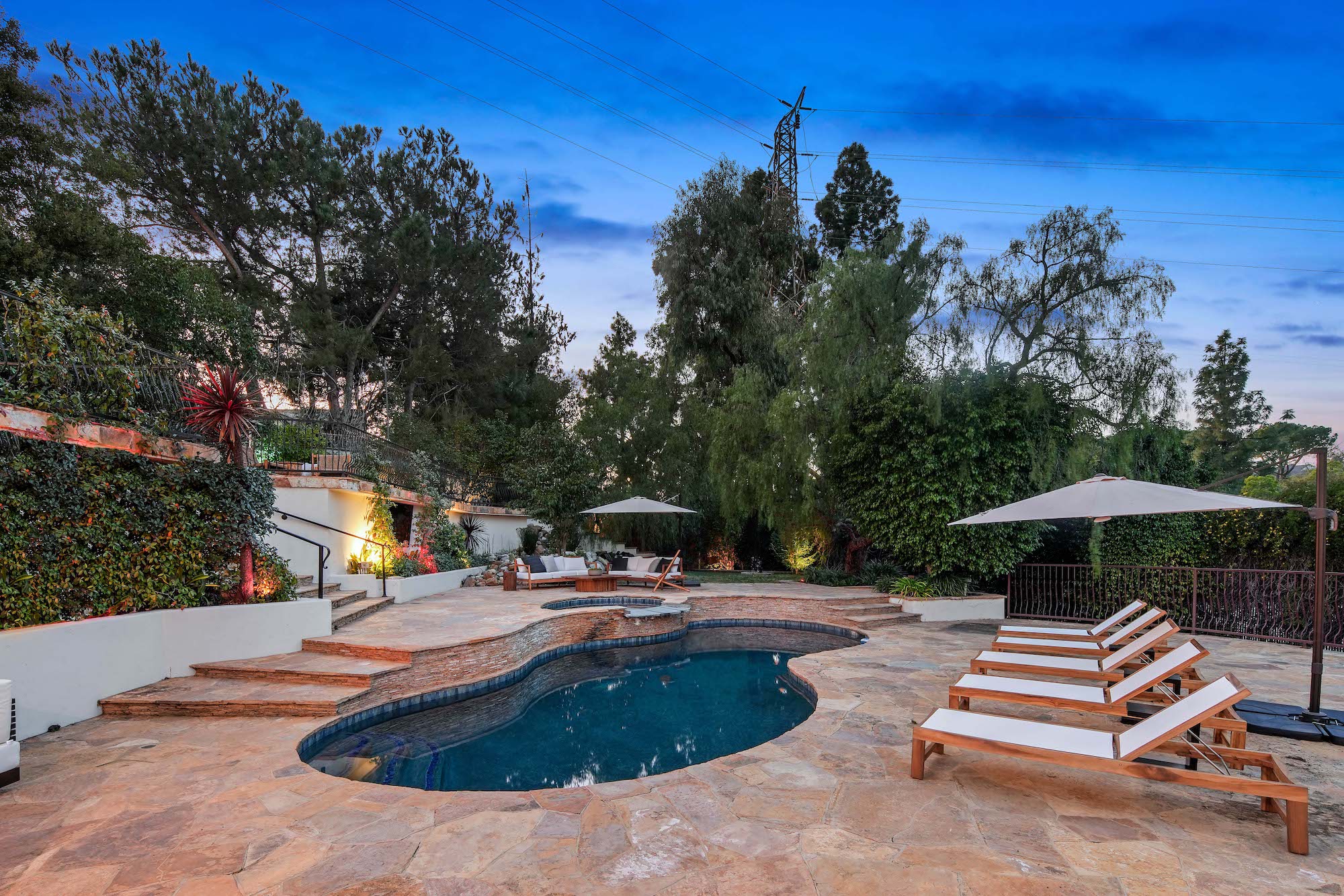 Situated on a private, gated cul-de-sac in the hills of Studio City sits this exclusive Spanish estate with a guest studio overlooking breathtaking canyon and city views. With over a half-acre lot, bask in the sun on expansive resort-like patios, lounge by the pool and spa, and entertain guests with the built-in BBQ and wood-burning fireplace amongst multiple grassy lawns. The spacious 5-bedroom home boasts an abundance of natural light, soaring ceilings, and custom details throughout. The recently remodeled gourmet kitchen features top-of-the-line appliances and breakfast area, with a separate formal dining room. A cinema quality theater and guest bedroom complete the first floor. The master suite is a true oasis, complete with a sitting area, fireplace, dual walk-in closets, and an oversized bathroom with a jacuzzi tub. The property also offers an attached guest studio with a separate entrance featuring its own kitchenette, bathroom, and walk-in closet. Three-car garage and walled courtyard offer ample parking and seclusion behind secured gates.