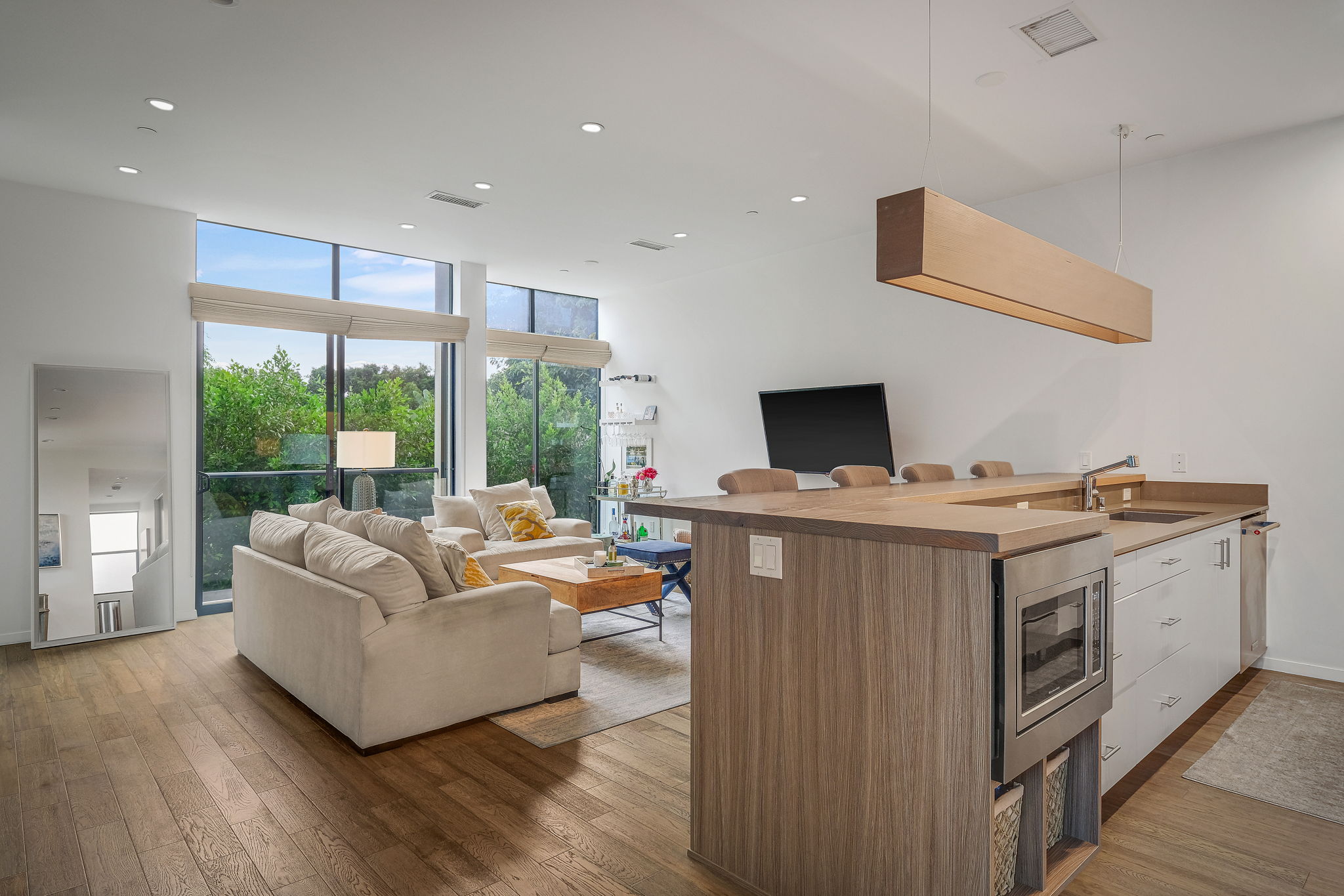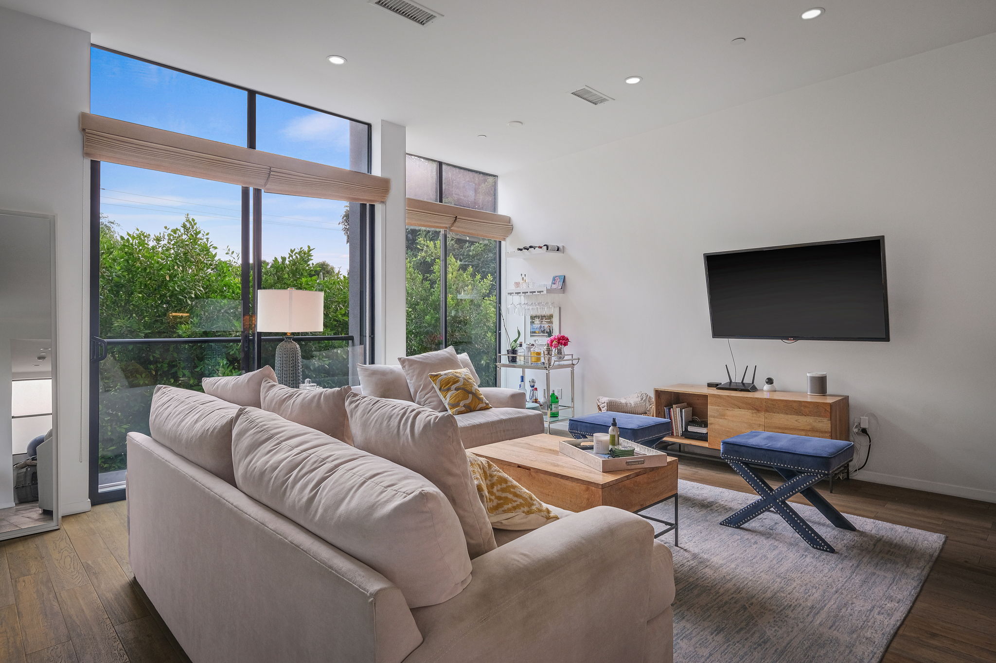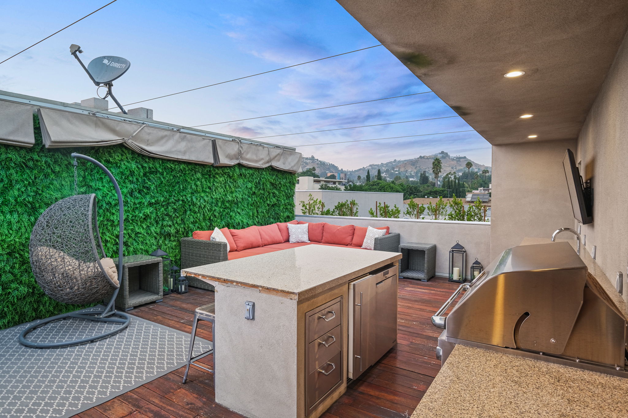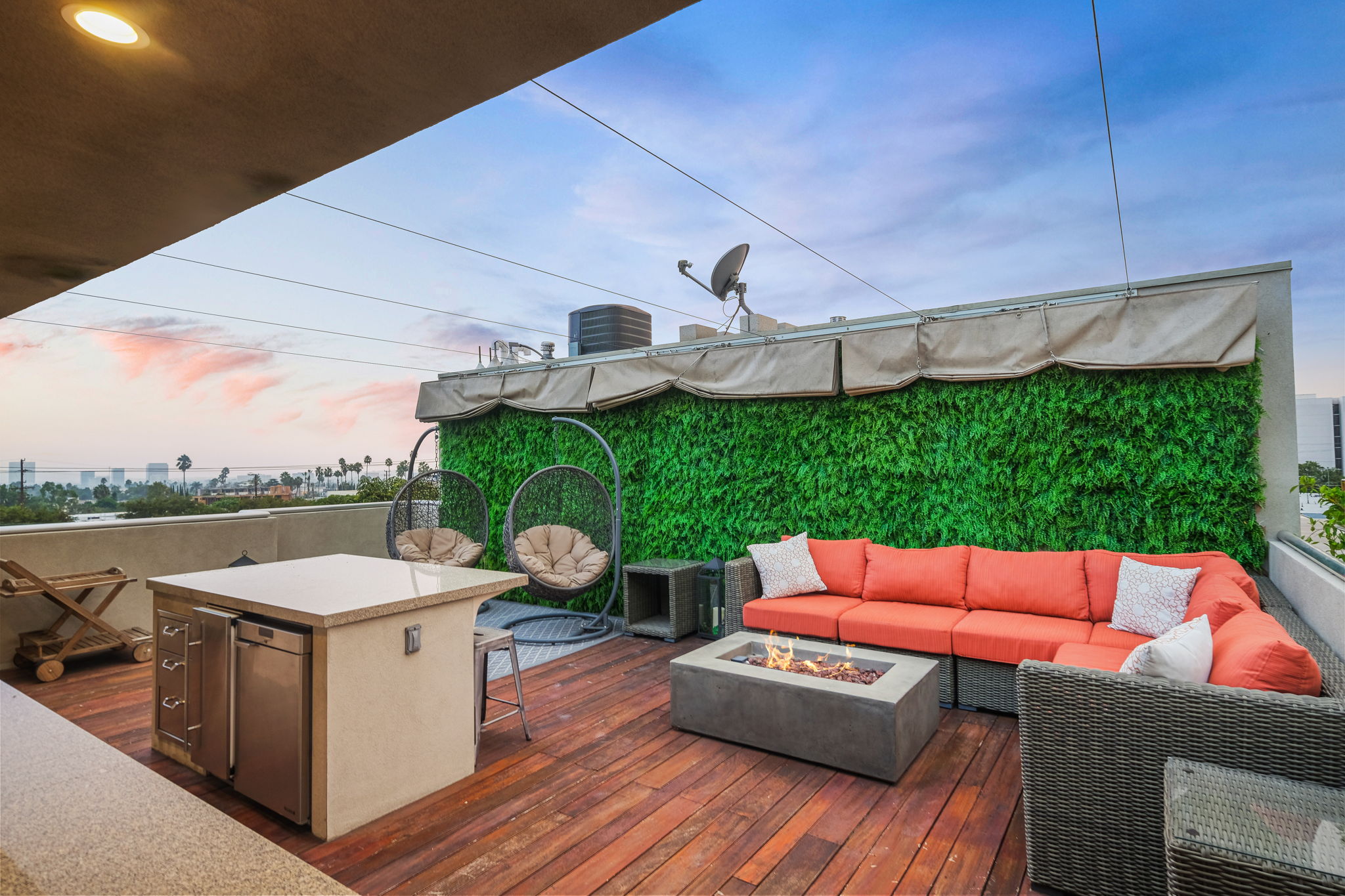 A stunning contemporary townhouse with 3 beds and 3 baths, private yard, and massive rooftop deck with views from the Hollywood Hills, to DTLA, and Santa Monica. With mesmerizing architectural design and soaring 10-foot high ceilings, this home features an abundance of natural light, American oak wood floors, and custom finishes throughout. A gourmet kitchen comes replete with a solid oak breakfast bar, Caesarstone countertops, and Subzero/Bertizzoni appliances. The luxurious owner's suite has an ensuite bathroom finished with beautiful stone tile, and a large walk-in closet with built-in cabinets. Two additional bedrooms and a spacious laundry room. The private rooftop deck is an entertainer's dream with a full outdoor kitchen, center island with bar seating, fireplace, and breathtaking views. Private attached 2-car garage with extra room for storage and direct access to unit. Fit for the most discerning client, this property is in a prime West Hollywood location and exceeds WEHO Green and LEED Silver standards.