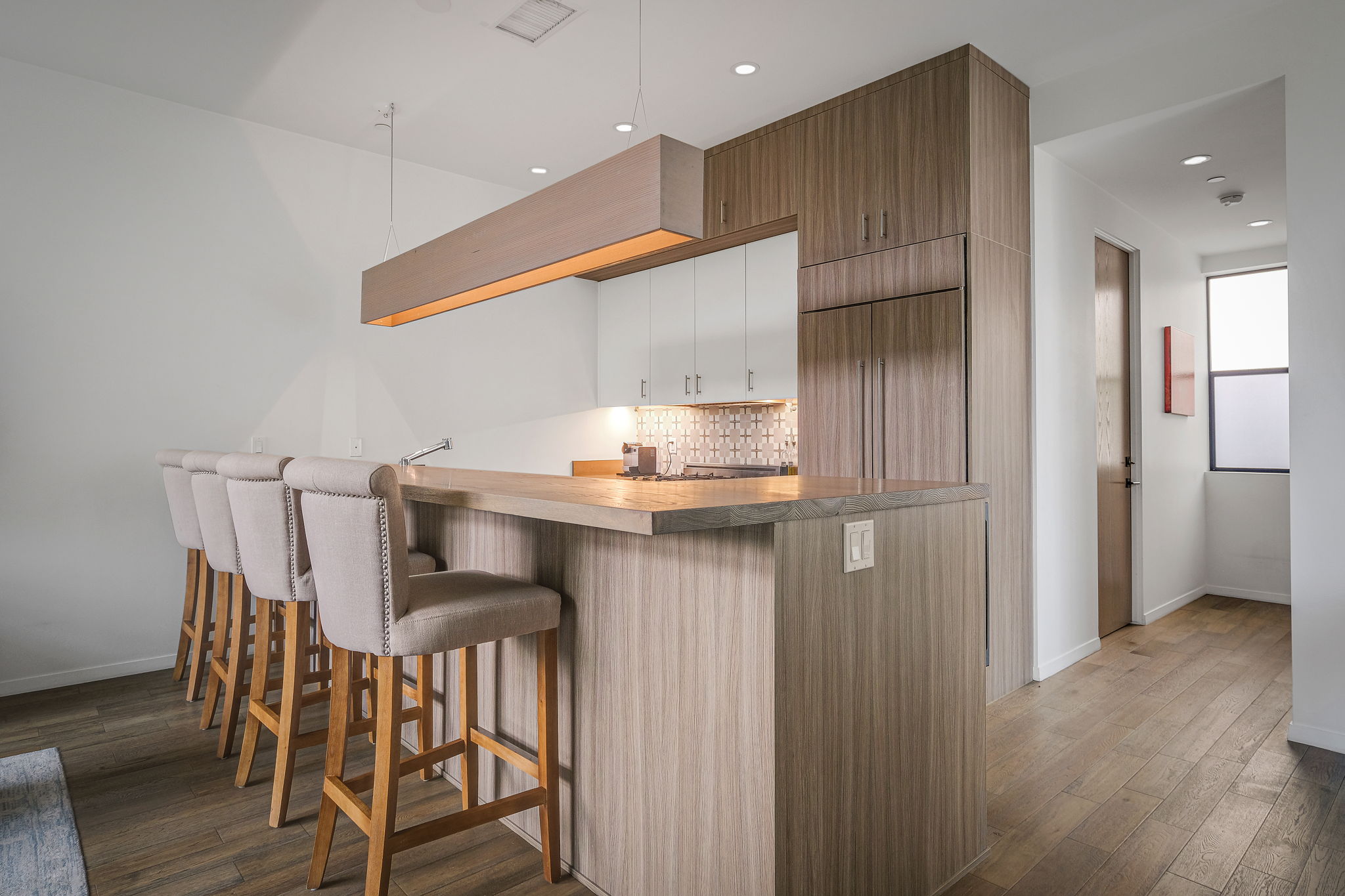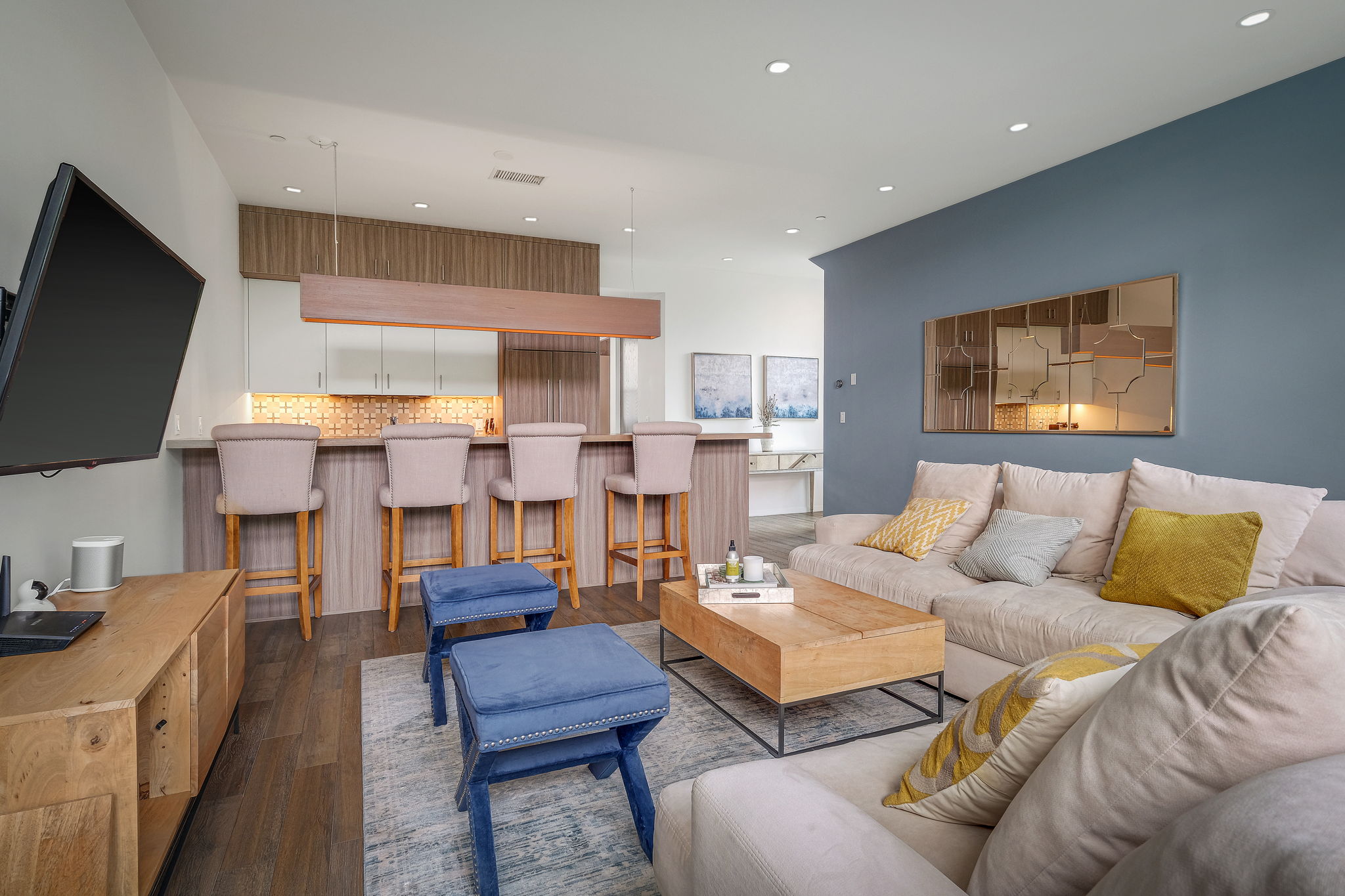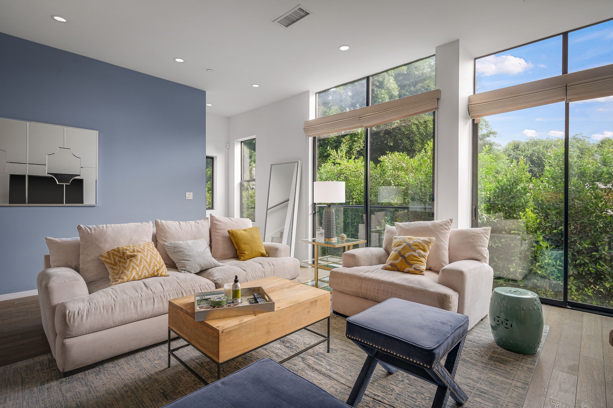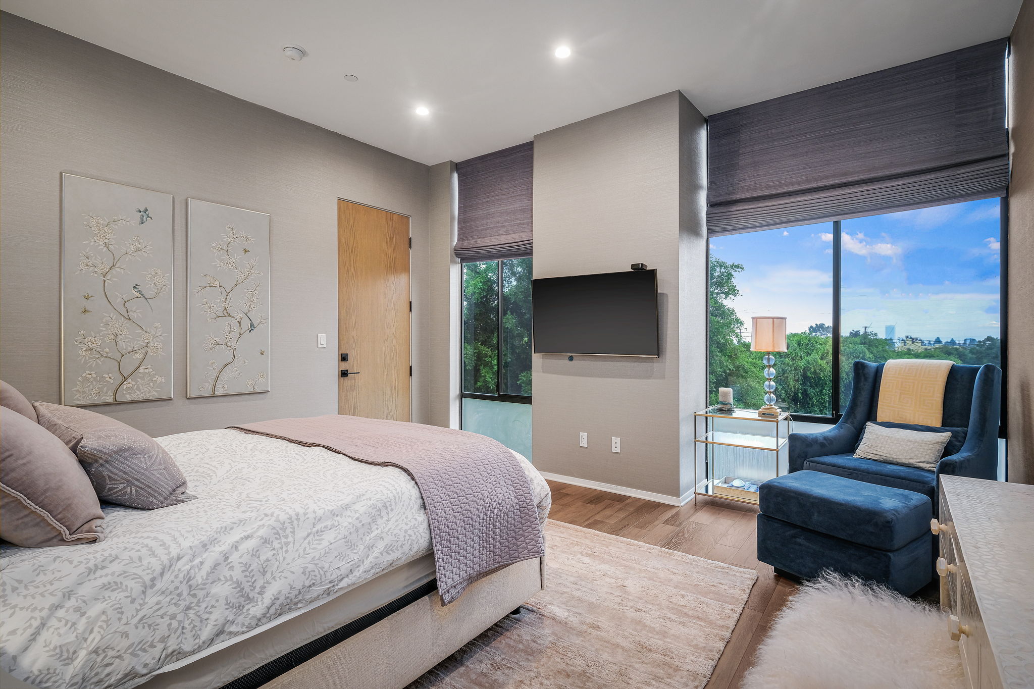 A stunning contemporary townhouse with 3 beds and 3 baths, private yard, and massive rooftop deck with views from the Hollywood Hills, to DTLA, and Santa Monica. With mesmerizing architectural design and soaring 10-foot high ceilings, this home features an abundance of natural light, American oak wood floors, and custom finishes throughout. A gourmet kitchen comes replete with a solid oak breakfast bar, Caesarstone countertops, and Subzero/Bertizzoni appliances. The luxurious owner's suite has an ensuite bathroom finished with beautiful stone tile, and a large walk-in closet with built-in cabinets. Two additional bedrooms and a spacious laundry room. The private rooftop deck is an entertainer's dream with a full outdoor kitchen, center island with bar seating, fireplace, and breathtaking views. Private attached 2-car garage with extra room for storage and direct access to unit. Fit for the most discerning client, this property is in a prime West Hollywood location and exceeds WEHO Green and LEED Silver standards.