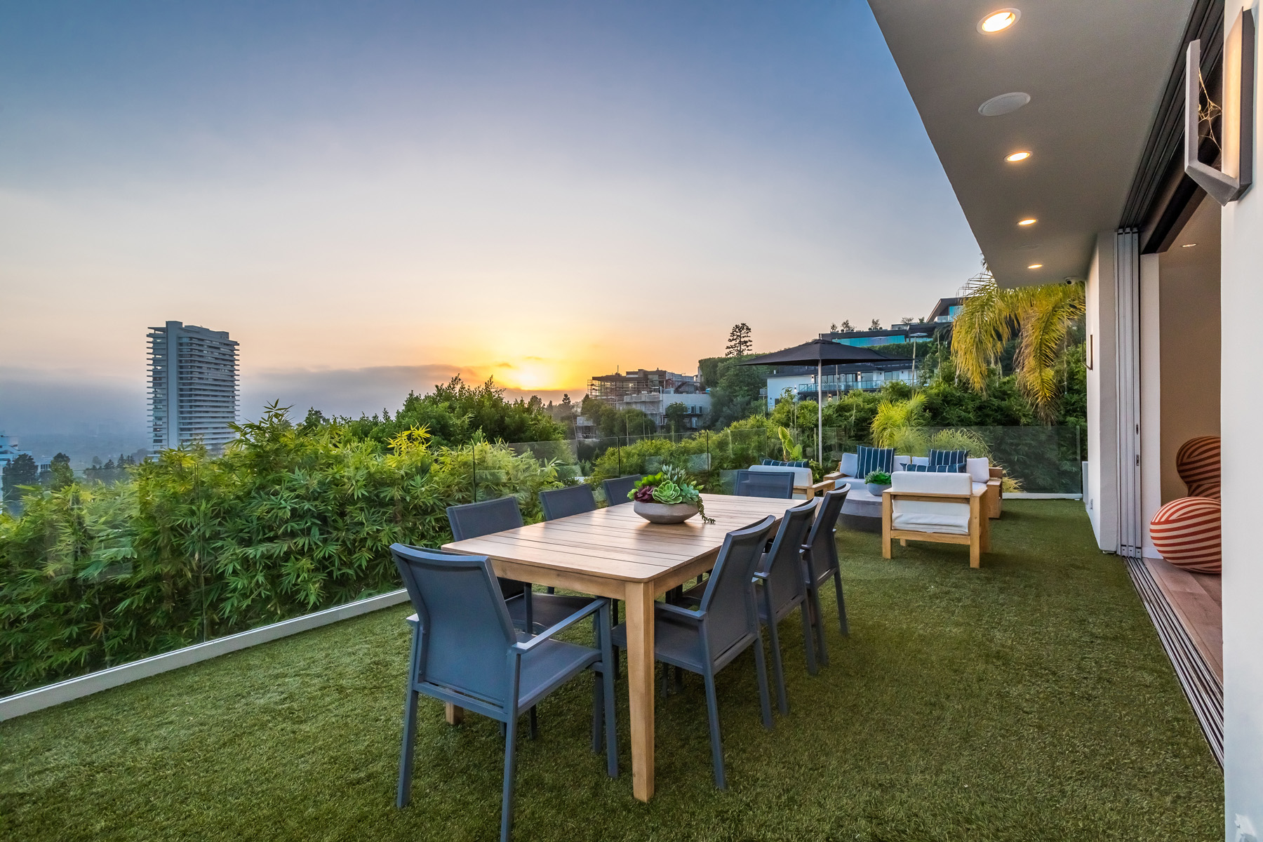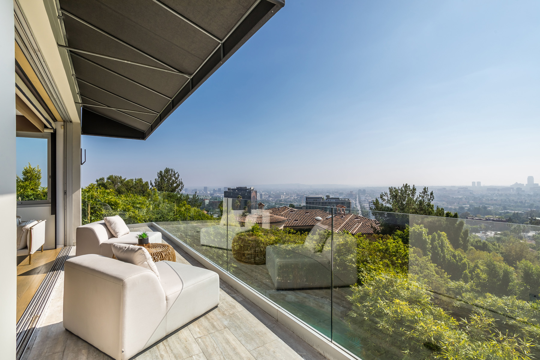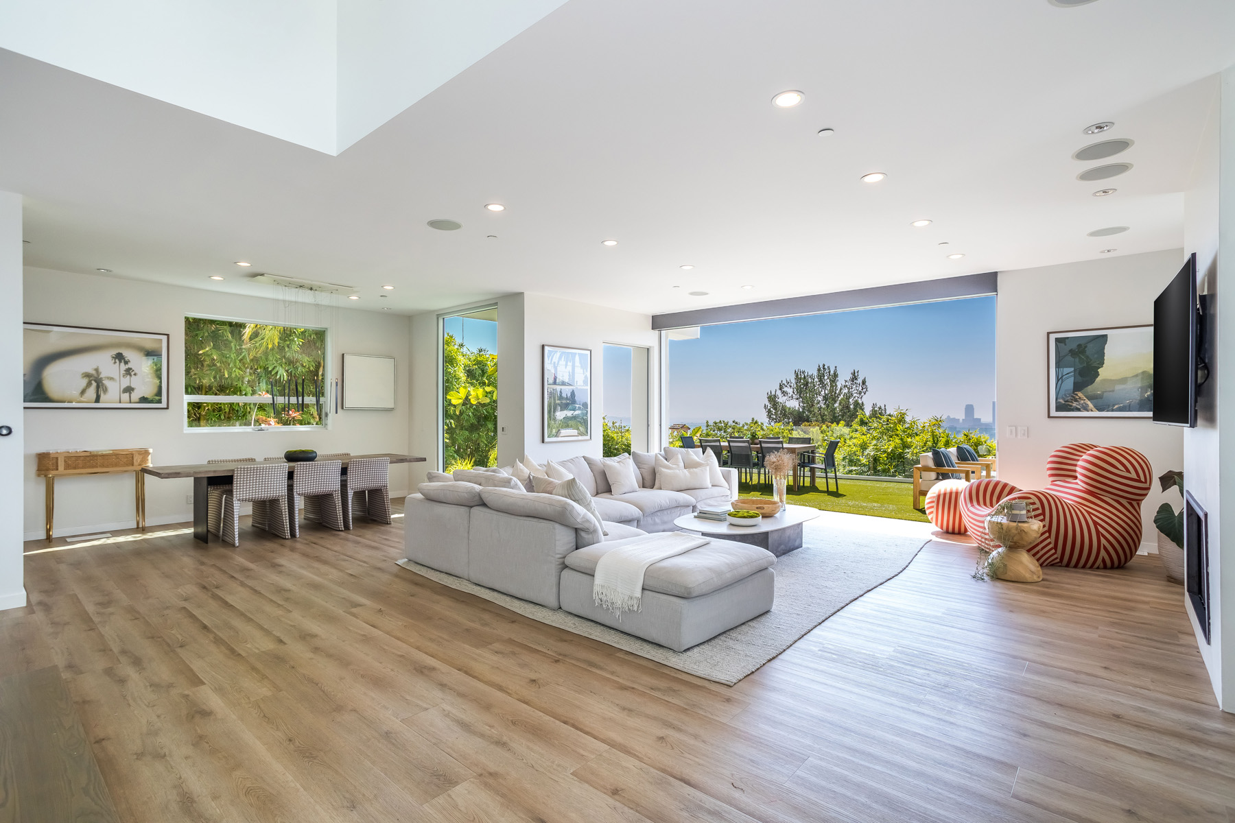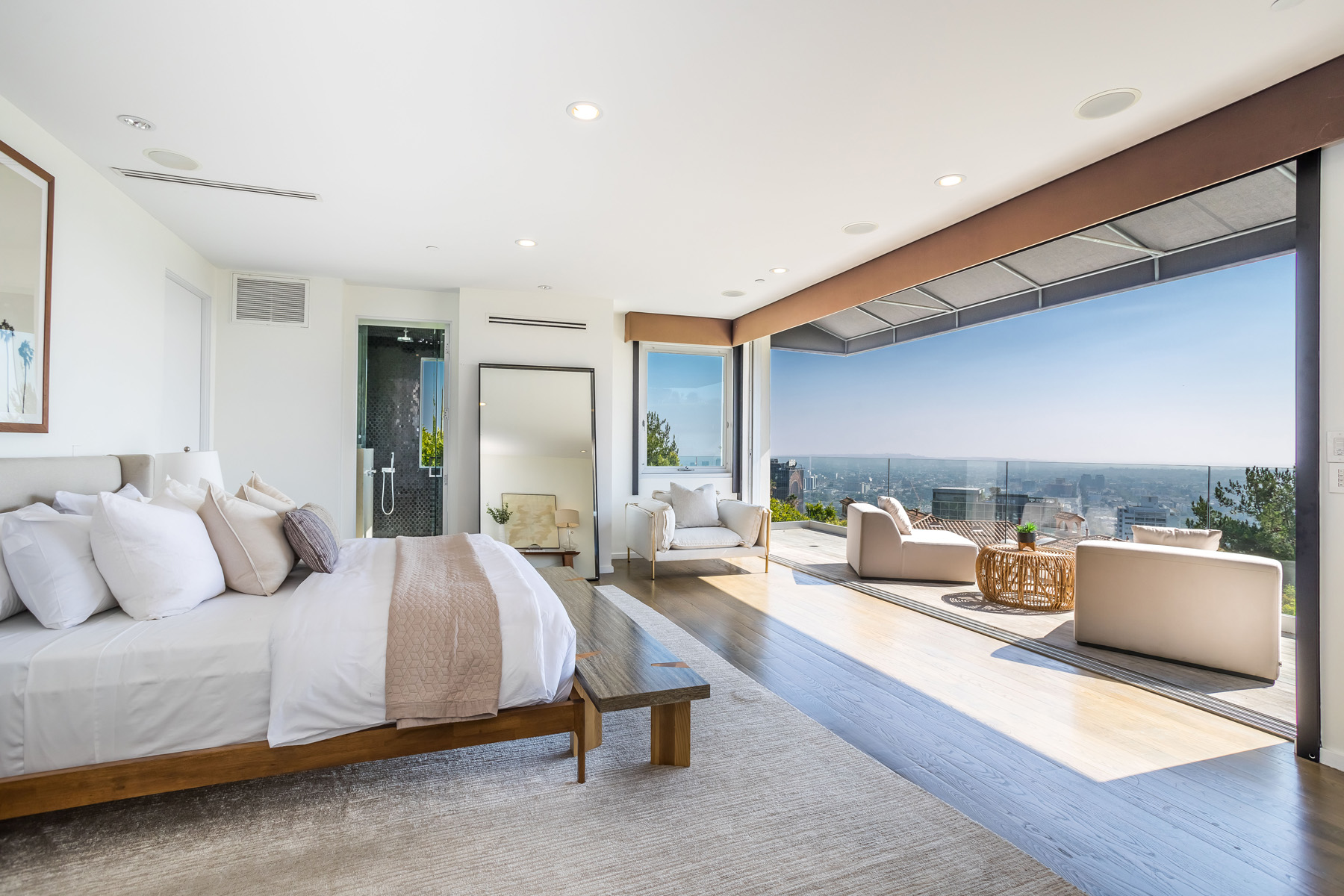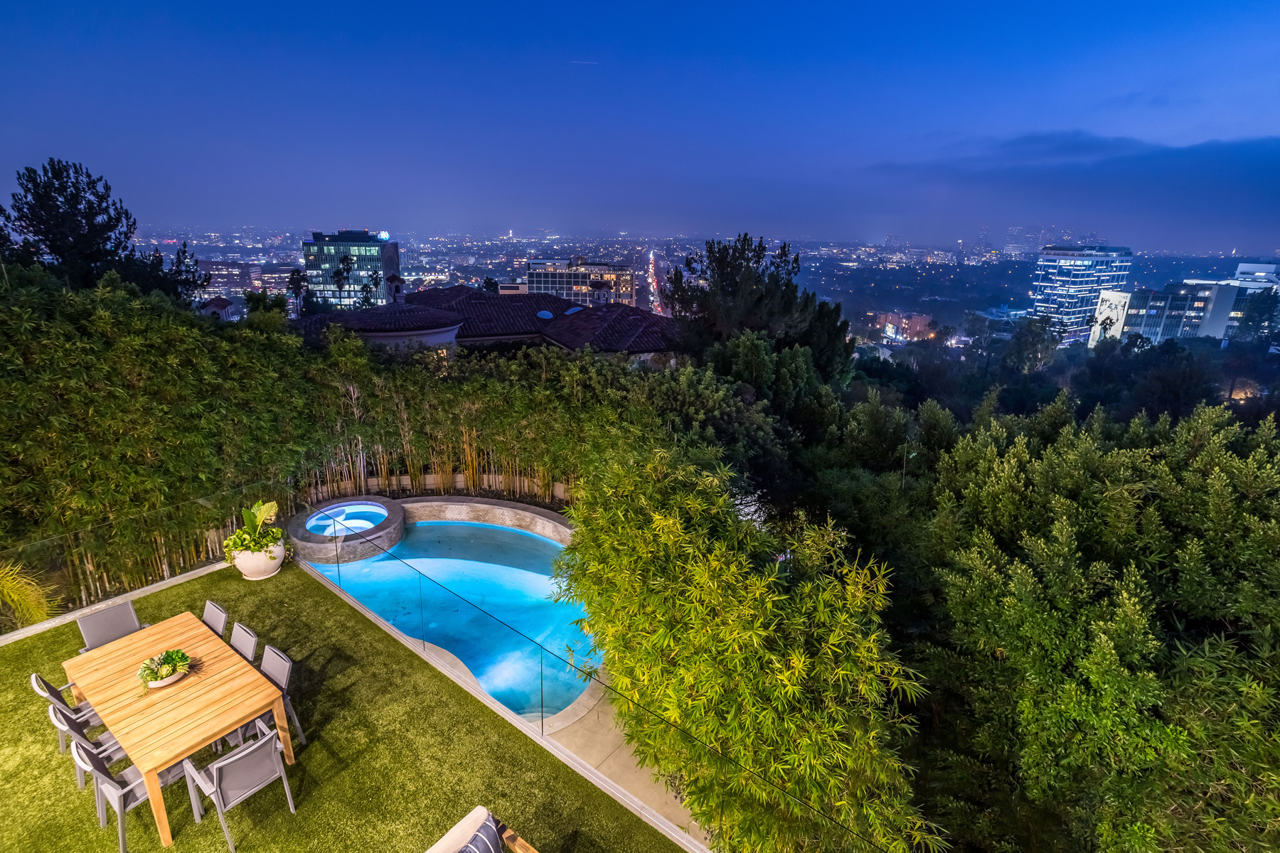 Located behind private gates above the Sunset Strip, this Modern home boasts spectacular panoramic views from Downtown to the ocean. The main level features an open floor plan with soaring ceilings and hardwood flooring throughout. The living area with a fireplace and disappearing walls of glass opens up to a grassy terrace with expansive views. The gourmet kitchen comes replete with sleek white cabinetry, grey stone countertops, a large center island, and top-of-the-line appliances. Upstairs, the luxurious owner's suite offers breathtaking jetliner views, a private balcony, a walk-in closet, and a spa-like bathroom with dual vanity, sumptuous tile work, a large infinity-edge tub, and a walk-in shower with more panoramic views. All additional spacious guest bedrooms each include an exquisite ensuite bathroom. The backyard is a private oasis, with a sparkling pool and hot tub surrounded by mature greenery and an impressive cabana with a sitting area, bar, and bathroom, perfect for entertaining. Other amenities include a home theater, gym, office, and a large private terrace upstairs with plenty of room and head-on views of the downtown LA skyline. A large 2-car garage and a long private driveway with motor court/additional parking. Only minutes away from the best dining and shopping West Hollywood has to offer.