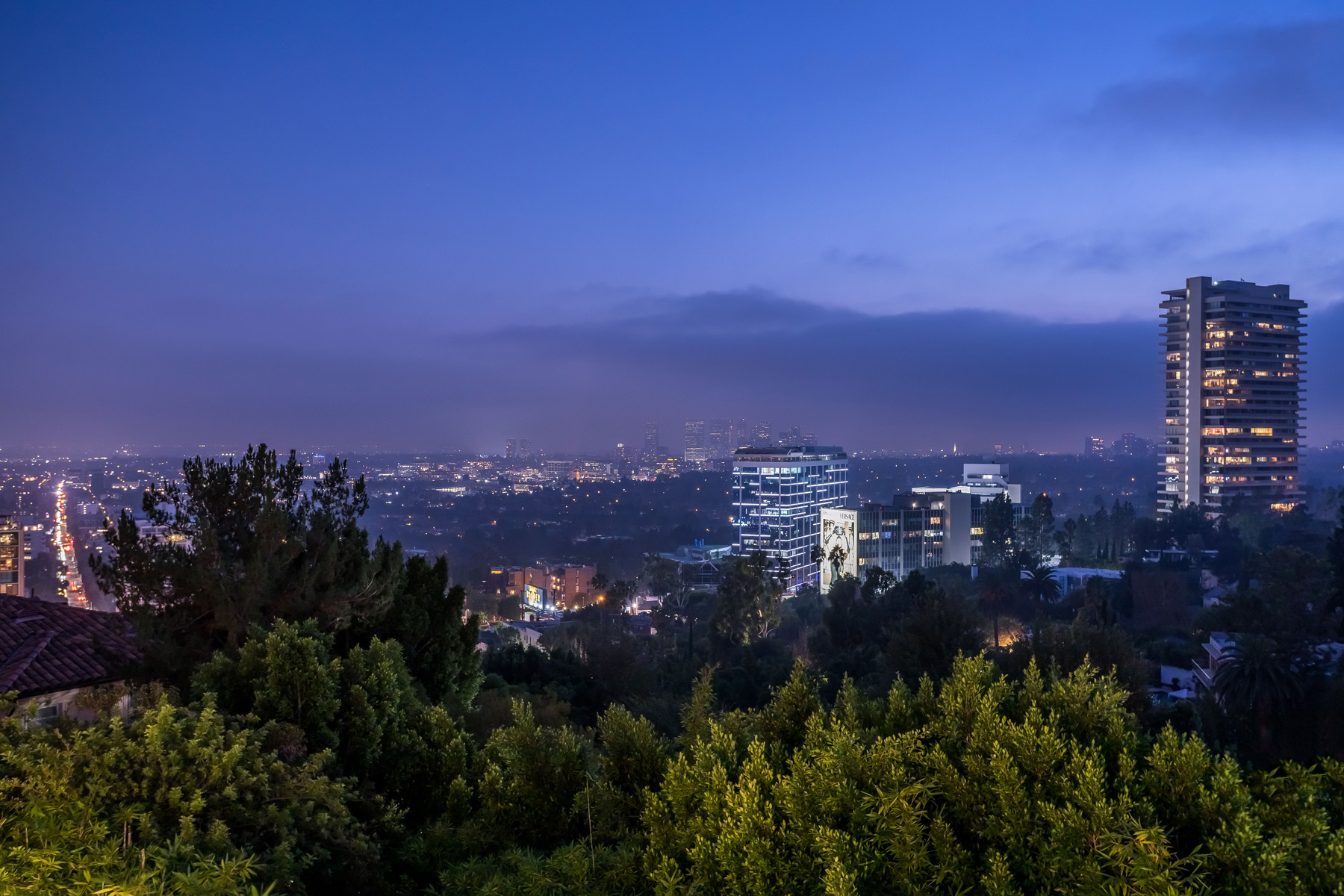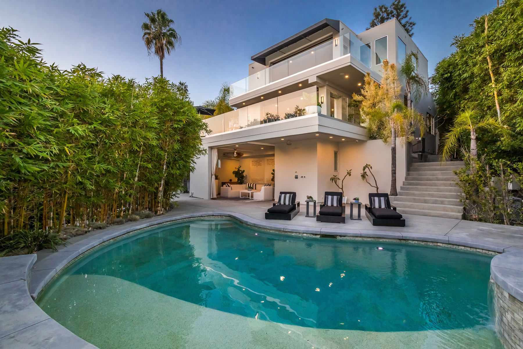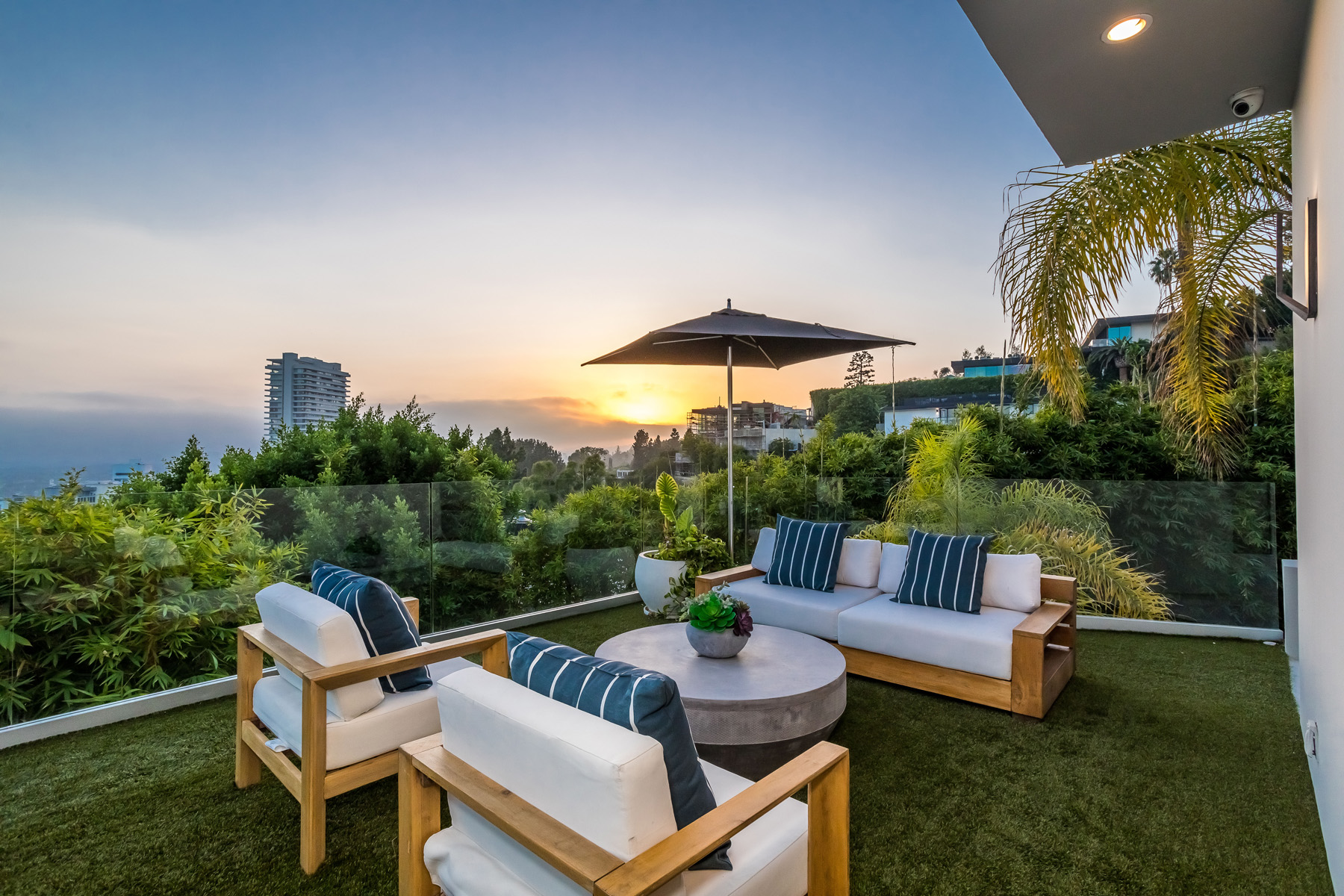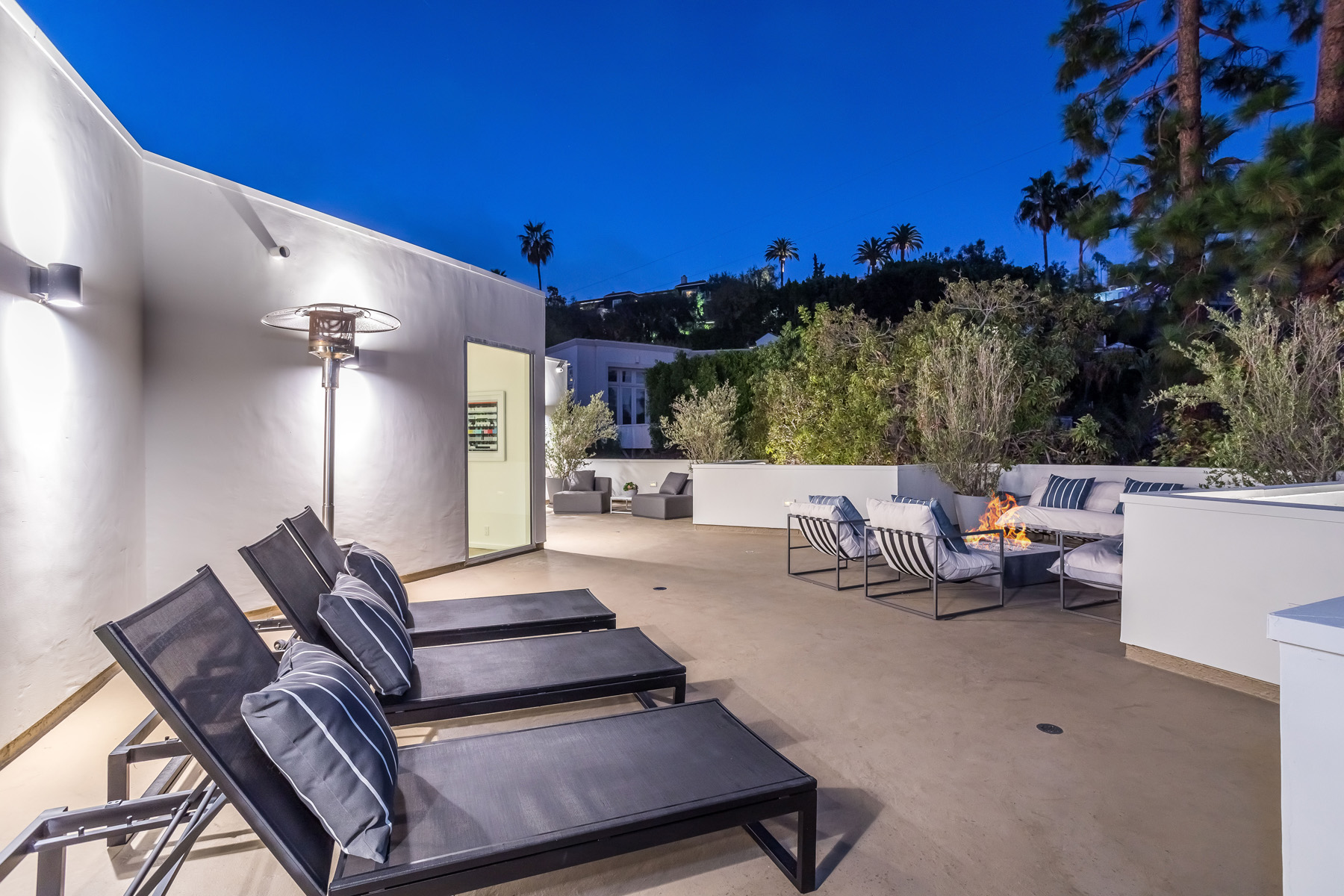 Located behind private gates above the Sunset Strip, this Modern home boasts spectacular panoramic views from Downtown to the ocean. The main level features an open floor plan with soaring ceilings and hardwood flooring throughout. The living area with a fireplace and disappearing walls of glass opens up to a grassy terrace with expansive views. The gourmet kitchen comes replete with sleek white cabinetry, grey stone countertops, a large center island, and top-of-the-line appliances. Upstairs, the luxurious owner's suite offers breathtaking jetliner views, a private balcony, a walk-in closet, and a spa-like bathroom with dual vanity, sumptuous tile work, a large infinity-edge tub, and a walk-in shower with more panoramic views. All additional spacious guest bedrooms each include an exquisite ensuite bathroom. The backyard is a private oasis, with a sparkling pool and hot tub surrounded by mature greenery and an impressive cabana with a sitting area, bar, and bathroom, perfect for entertaining. Other amenities include a home theater, gym, office, and a large private terrace upstairs with plenty of room and head-on views of the downtown LA skyline. A large 2-car garage and a long private driveway with motor court/additional parking. Only minutes away from the best dining and shopping West Hollywood has to offer.