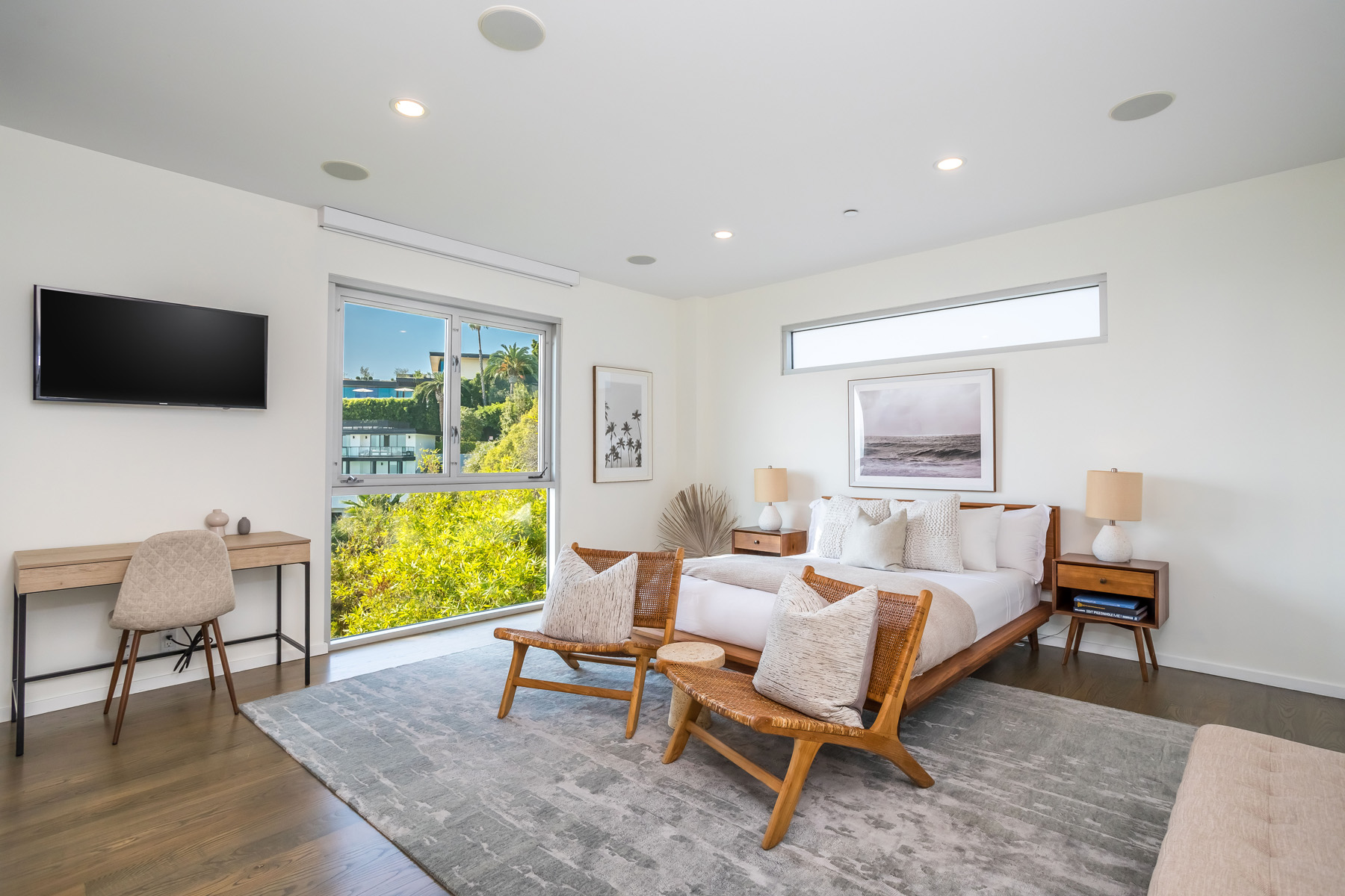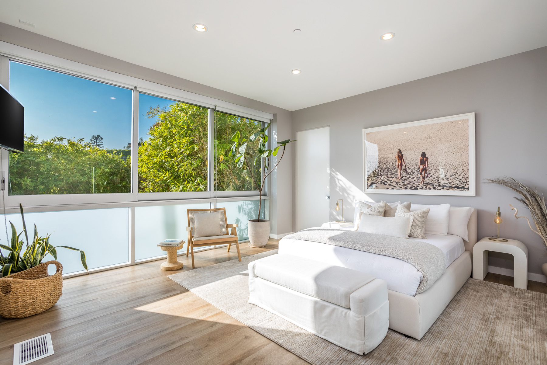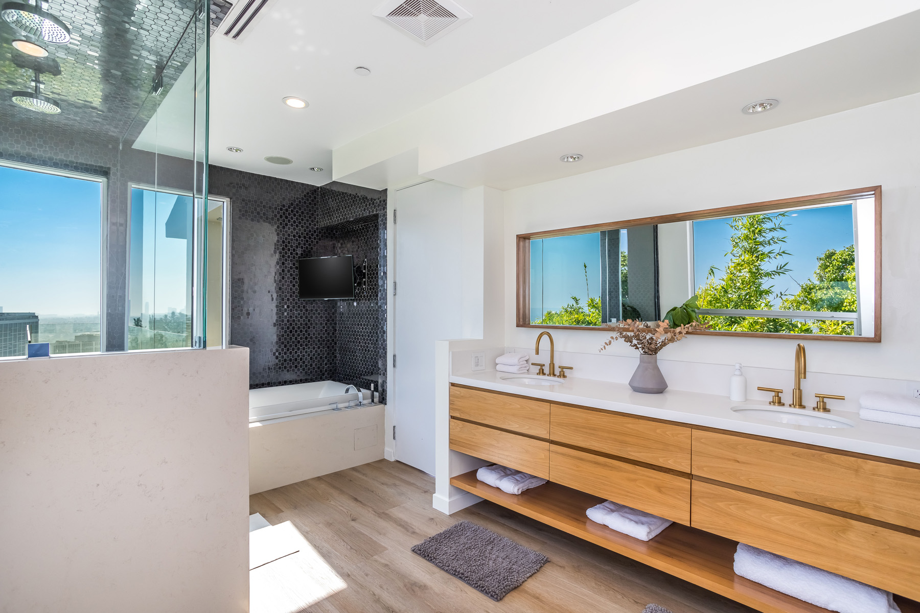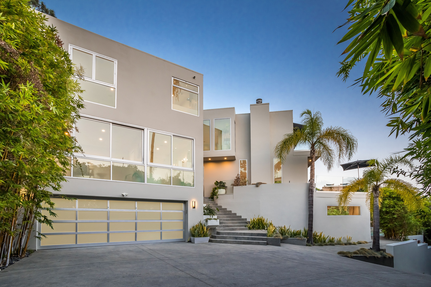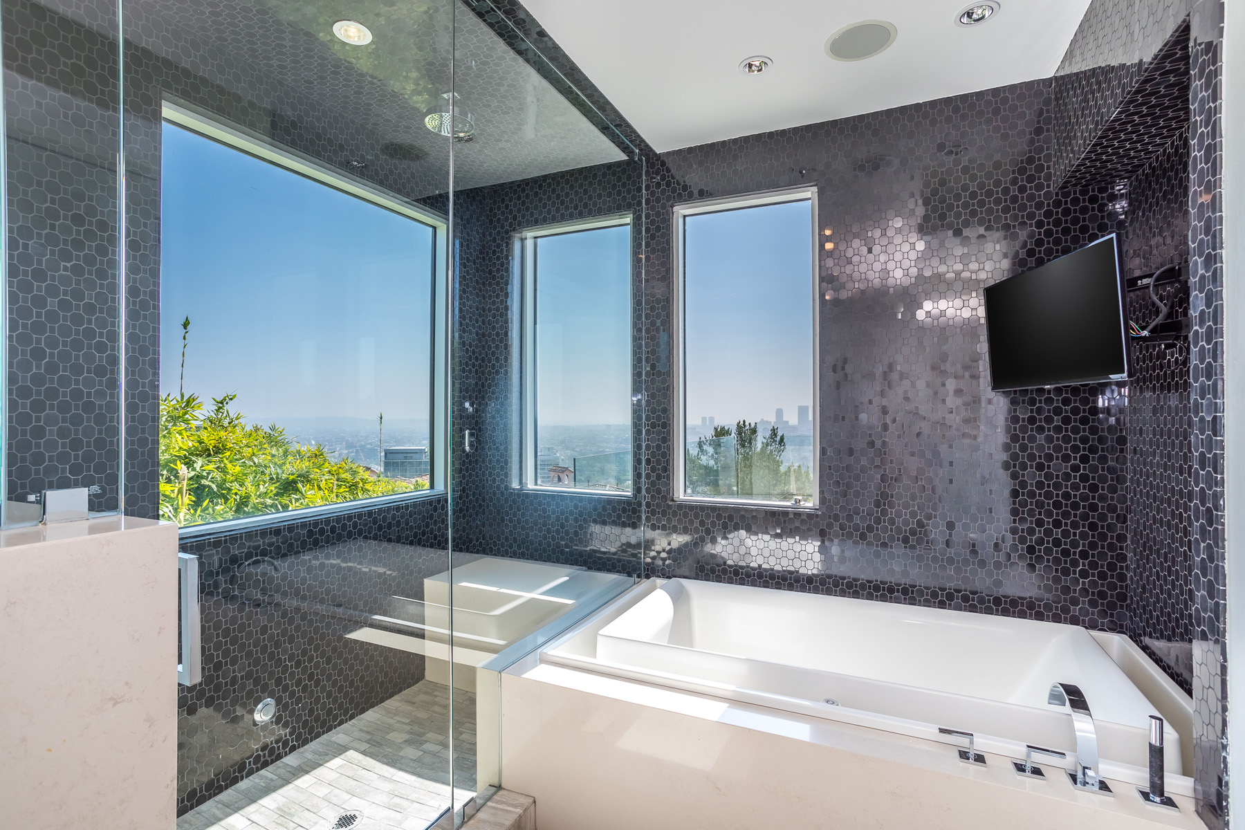 Located behind private gates above the Sunset Strip, this Modern home boasts spectacular panoramic views from Downtown to the ocean. The main level features an open floor plan with soaring ceilings and hardwood flooring throughout. The living area with a fireplace and disappearing walls of glass opens up to a grassy terrace with expansive views. The gourmet kitchen comes replete with sleek white cabinetry, grey stone countertops, a large center island, and top-of-the-line appliances. Upstairs, the luxurious owner's suite offers breathtaking jetliner views, a private balcony, a walk-in closet, and a spa-like bathroom with dual vanity, sumptuous tile work, a large infinity-edge tub, and a walk-in shower with more panoramic views. All additional spacious guest bedrooms each include an exquisite ensuite bathroom. The backyard is a private oasis, with a sparkling pool and hot tub surrounded by mature greenery and an impressive cabana with a sitting area, bar, and bathroom, perfect for entertaining. Other amenities include a home theater, gym, office, and a large private terrace upstairs with plenty of room and head-on views of the downtown LA skyline. A large 2-car garage and a long private driveway with motor court/additional parking. Only minutes away from the best dining and shopping West Hollywood has to offer.