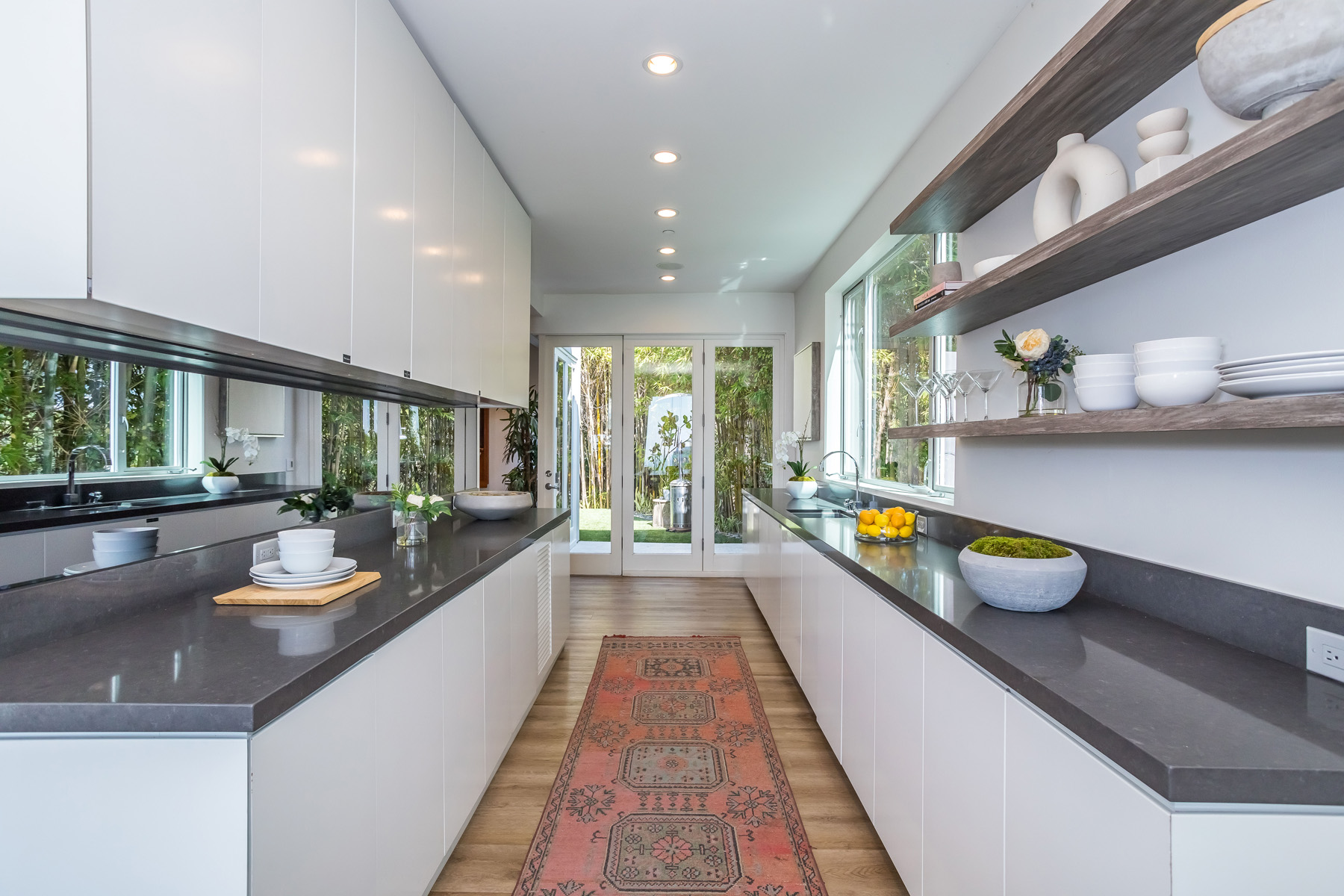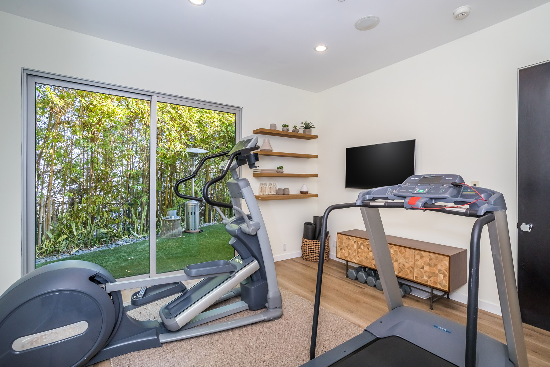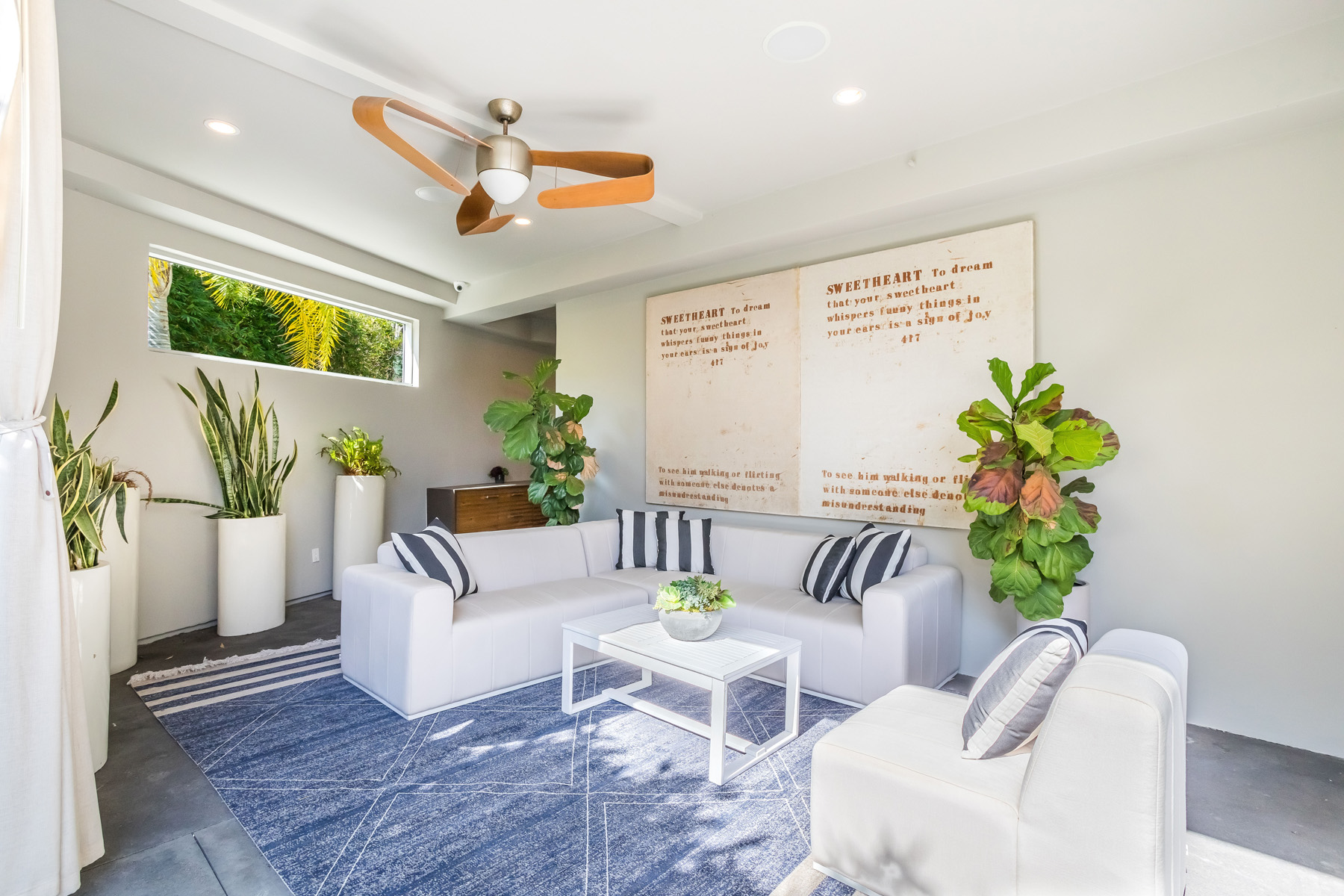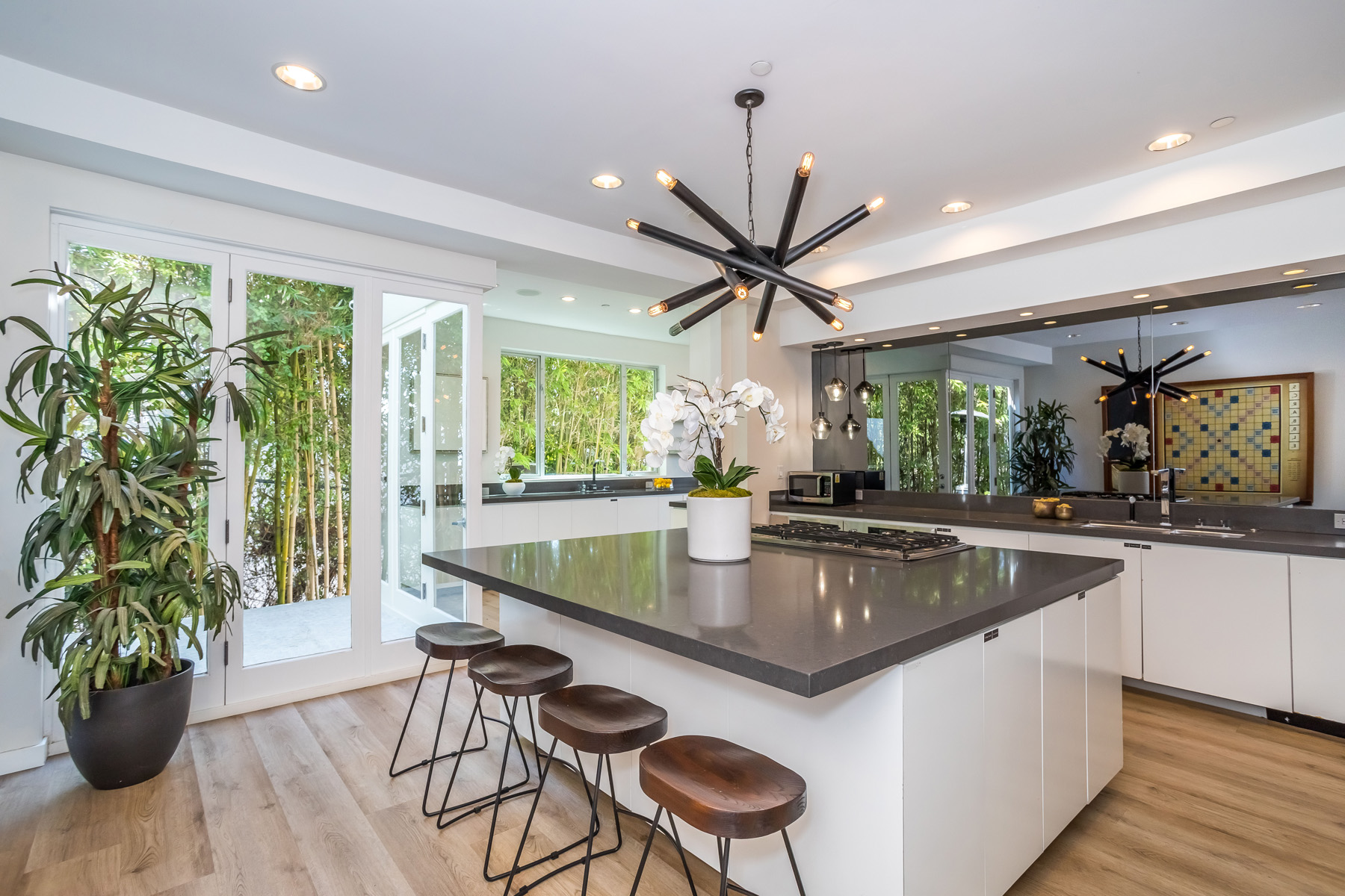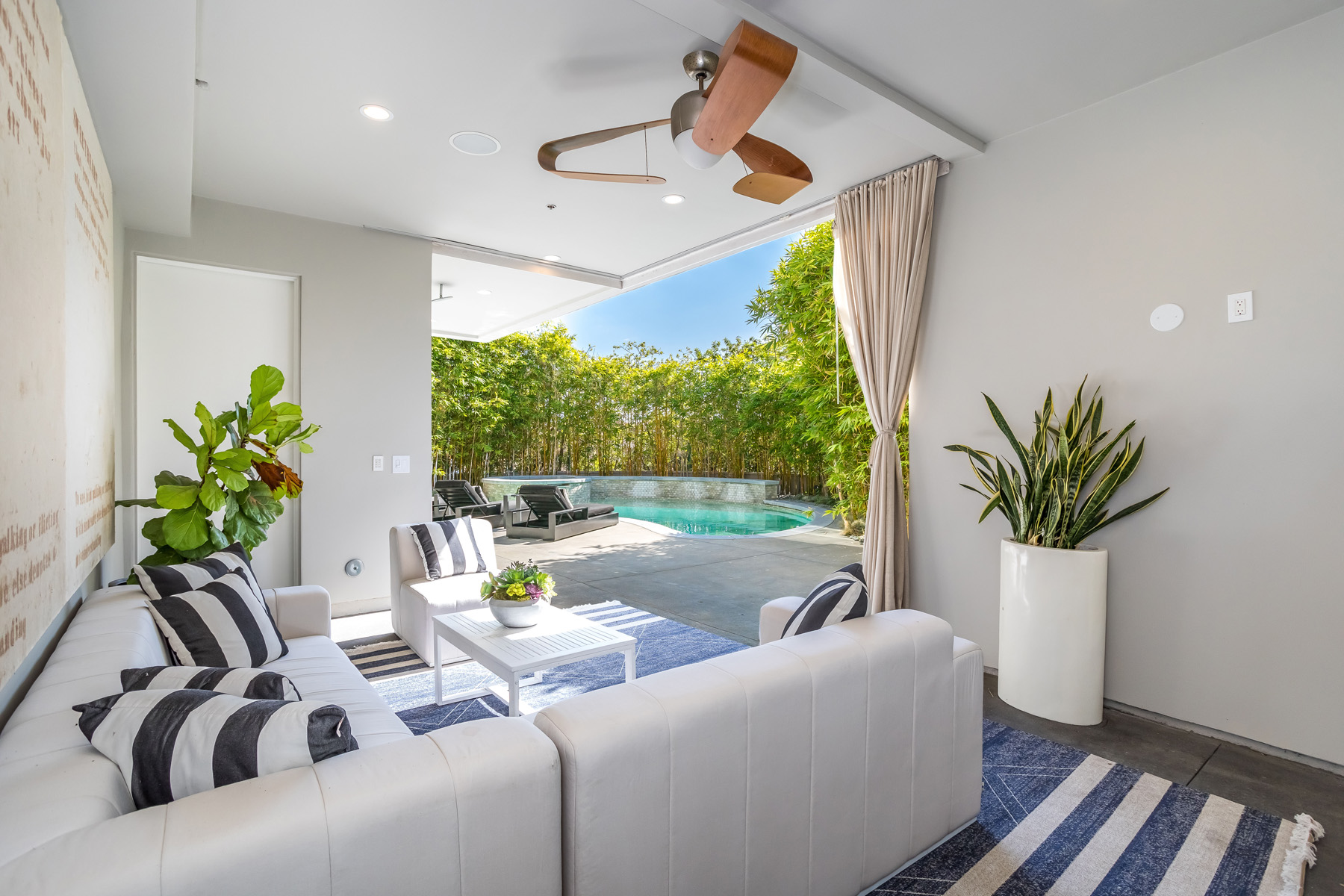 Located behind private gates above the Sunset Strip, this Modern home boasts spectacular panoramic views from Downtown to the ocean. The main level features an open floor plan with soaring ceilings and hardwood flooring throughout. The living area with a fireplace and disappearing walls of glass opens up to a grassy terrace with expansive views. The gourmet kitchen comes replete with sleek white cabinetry, grey stone countertops, a large center island, and top-of-the-line appliances. Upstairs, the luxurious owner's suite offers breathtaking jetliner views, a private balcony, a walk-in closet, and a spa-like bathroom with dual vanity, sumptuous tile work, a large infinity-edge tub, and a walk-in shower with more panoramic views. All additional spacious guest bedrooms each include an exquisite ensuite bathroom. The backyard is a private oasis, with a sparkling pool and hot tub surrounded by mature greenery and an impressive cabana with a sitting area, bar, and bathroom, perfect for entertaining. Other amenities include a home theater, gym, office, and a large private terrace upstairs with plenty of room and head-on views of the downtown LA skyline. A large 2-car garage and a long private driveway with motor court/additional parking. Only minutes away from the best dining and shopping West Hollywood has to offer.
