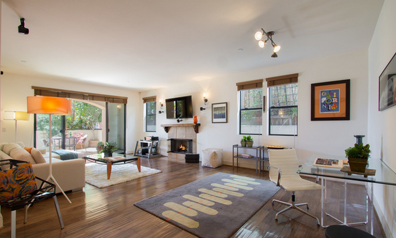 Ideally located a block south of Wilshire, this beautiful condo features a spacious open floor plan with high ceilings, opening to a large, western exposure, front facing patio spanning the entire unit. The living room has a fireplace, surround sound and a flat screen TV. The gourmet kitchen has granite counter tops, stainless steel appliances and ample storage. The adjacent dining area could also be converted to a den. The master bedroom has a luxurious bath with separate tub and shower, double sinks, and a walk-in closet. There are French doors opening to the patio. Other upgrades include gorgeous wood floors throughout, alarm system, wooded blinds. Washer/dryer in the unit. Two car tandem parking, guest parking in secure garage. EQ insurance.