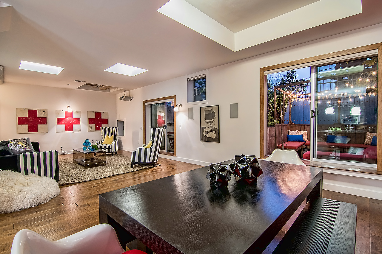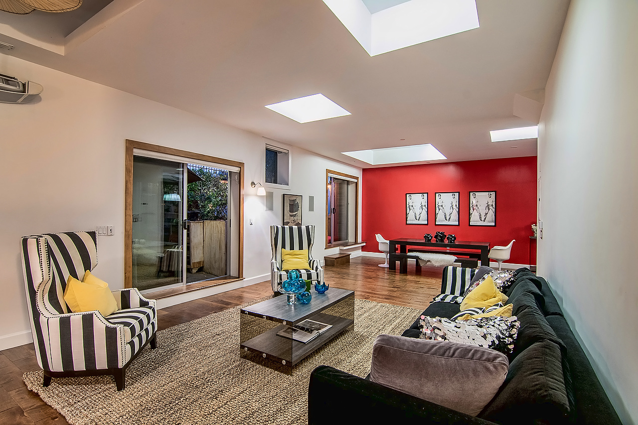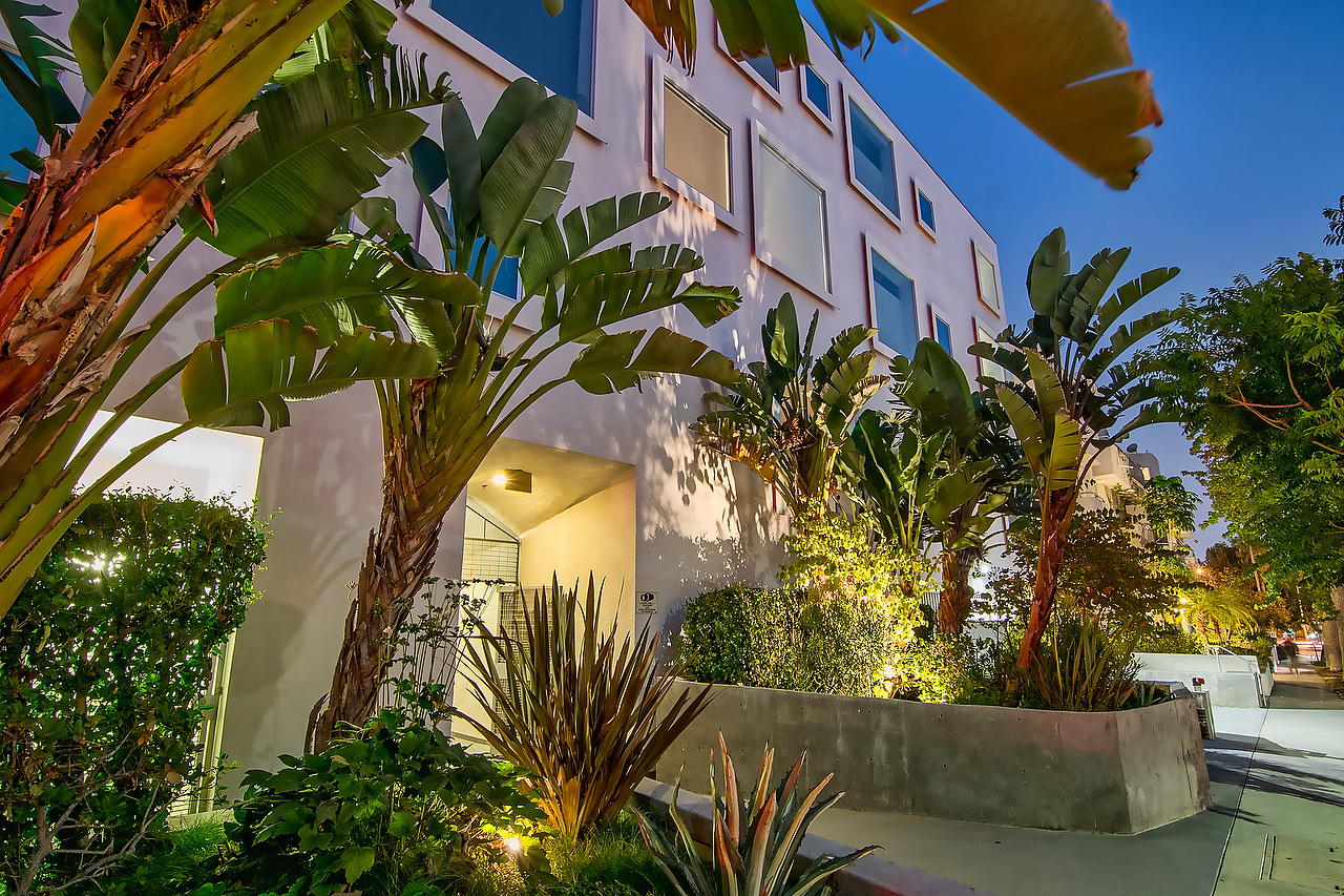 With over $200,000 of remodel/upgrades and winner of the AIA design award by famed architects Predrock/Frane, this stunning ground floor 2-bedroom condo is located just steps from some of the best West Hollywood has to offer. Inviting entry opens to a gourmet chef's kitchen with built-in Miele appliances, custom cabinetry, coffee/cappuccino machine, and flat-screen TV. Expansive living and dining area with 1080p projector and 100" electric movie screen, subtle faux-skylights accents, and exits to two charming, private patios with mature greenery. A downstairs bedroom is complimented with a Grohe digital spa/teak shower, mirror-TV, walk-in closet, and outdoor patio. The upstairs master bedroom features a spa-like bathroom with ample closet place. High end features include a wine refrigerator, top-of-the-line Electrolux washer/dryer, electric bike lift, electric blinds throughout, and two separate garage parking spaces.