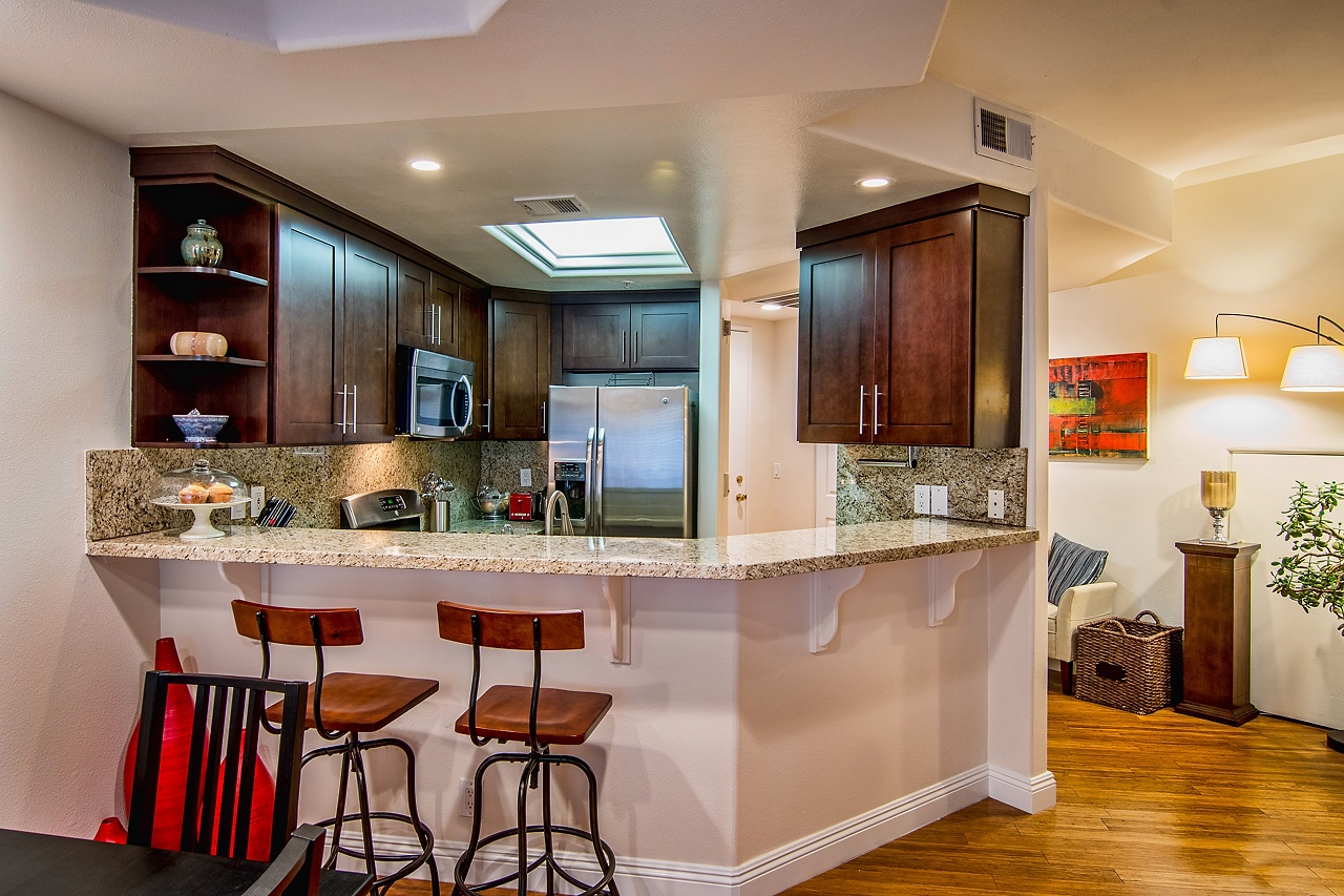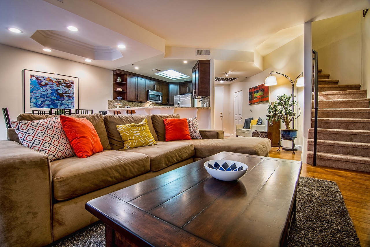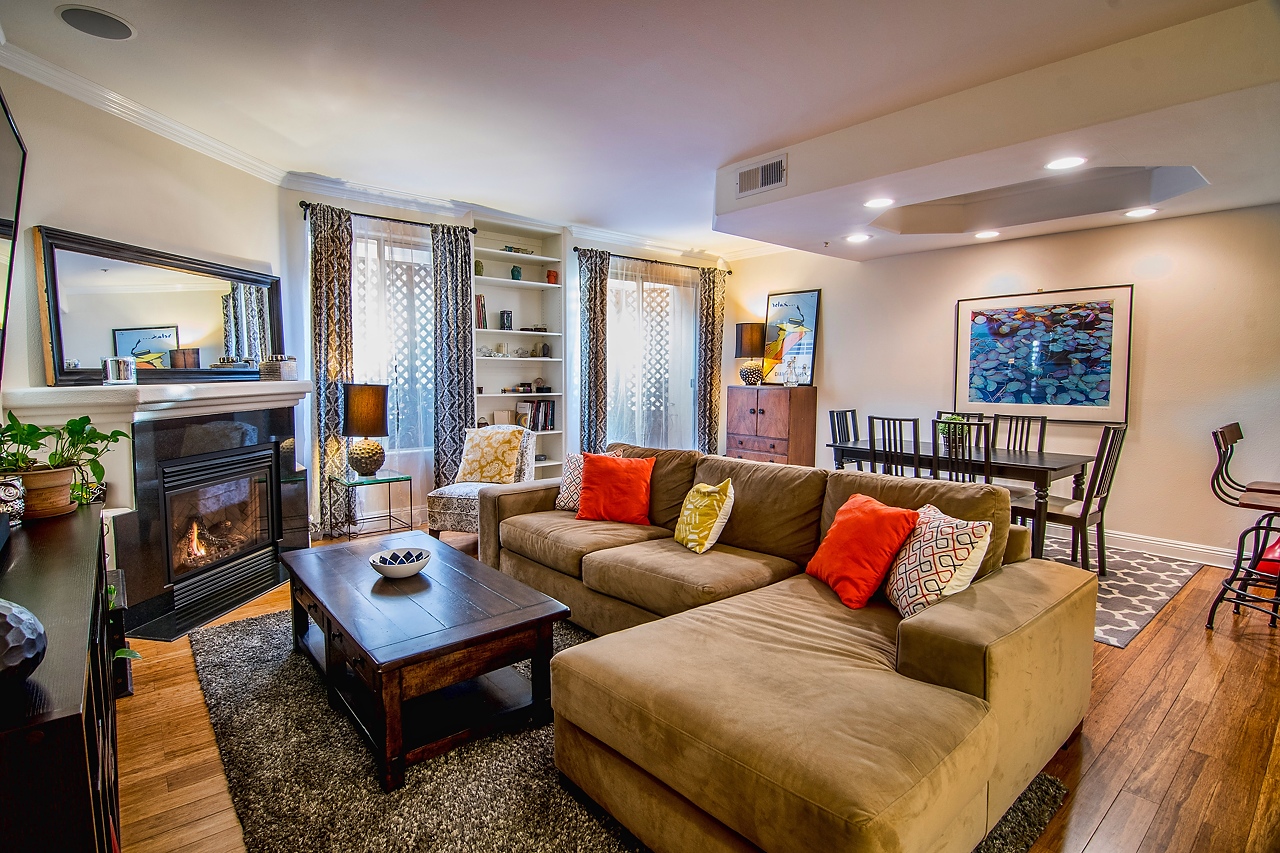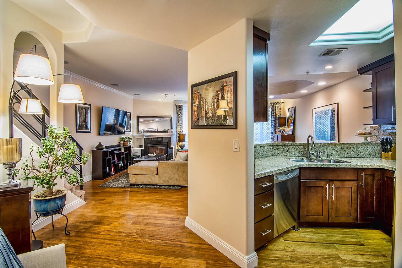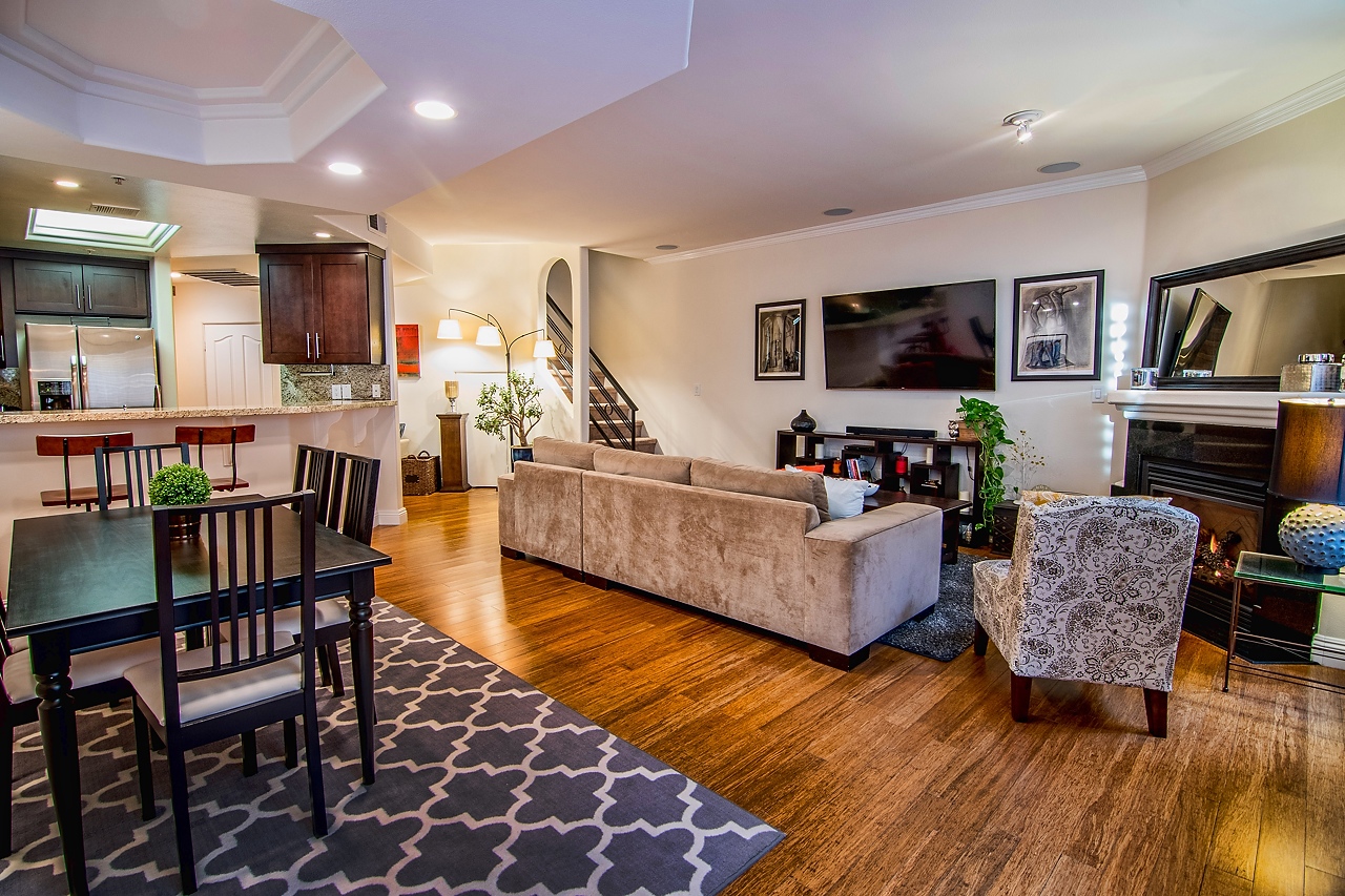 Sleek and sophisticated Townhome in prime Sunset Strip/Spaulding Square area. With 2 bedrooms and 2.5 bathrooms, this spacious floor plan features carbonized bamboo floors downstairs, a romantic fireplace, recessed lighting, expansive ceilings with detailed moldings, integrated sound system, and a private outdoor patio. Open-concept chef’s kitchen with granite countertops, gas stove, and stainless steel appliances. Two large en-suite bedrooms upstairs with high ceilings, new carpet throughout, and luxurious full bathrooms. Dual AC units. Laundry room inside unit with washer/dryer. Low HOA dues include earthquake insurance. Two-car tandem parking.