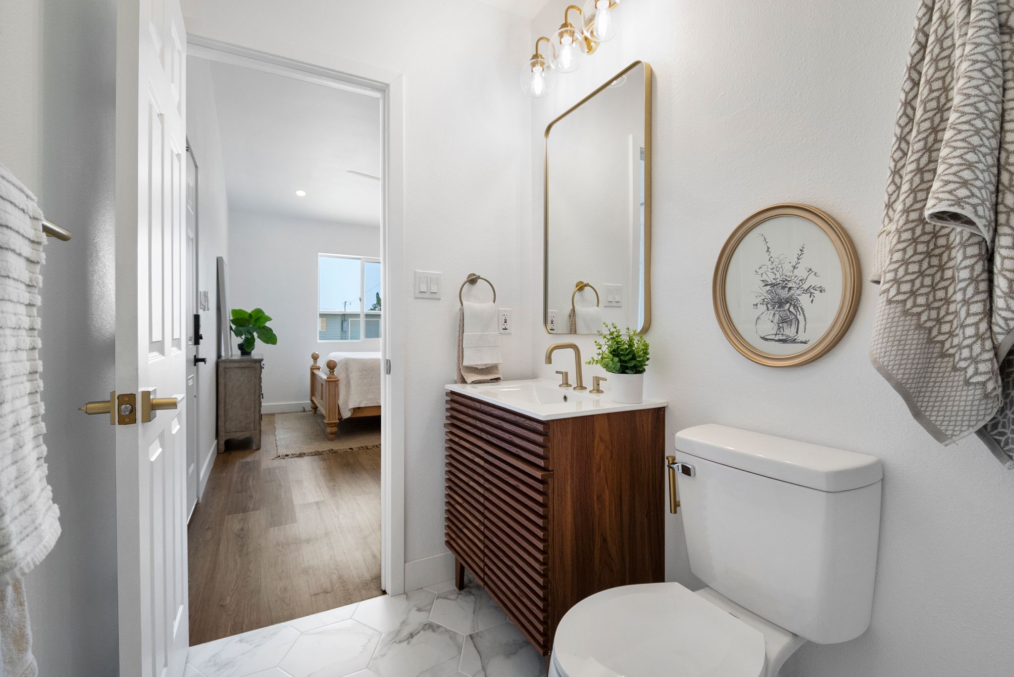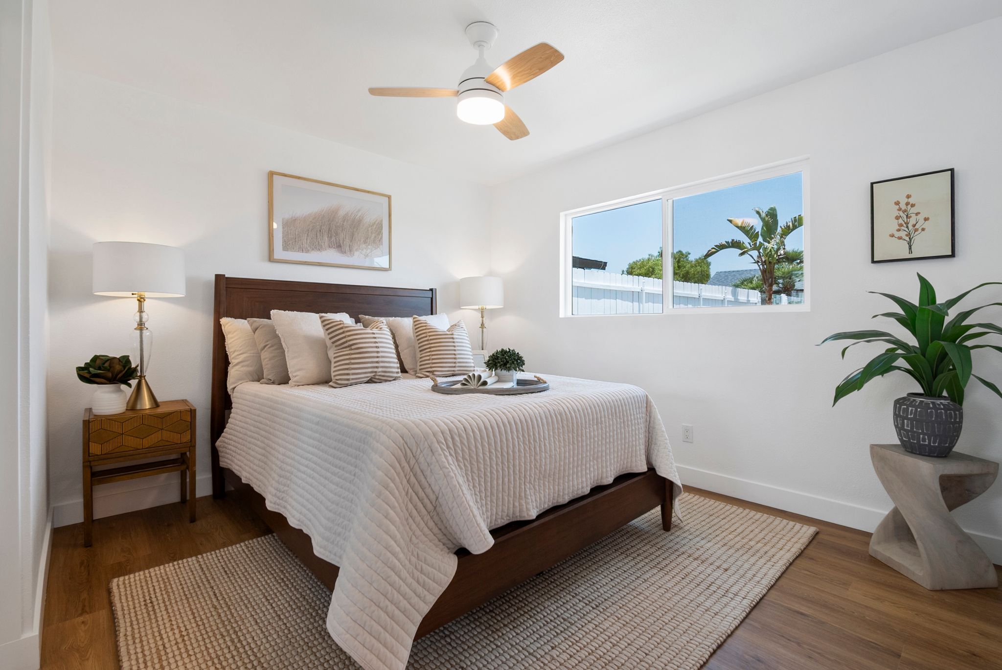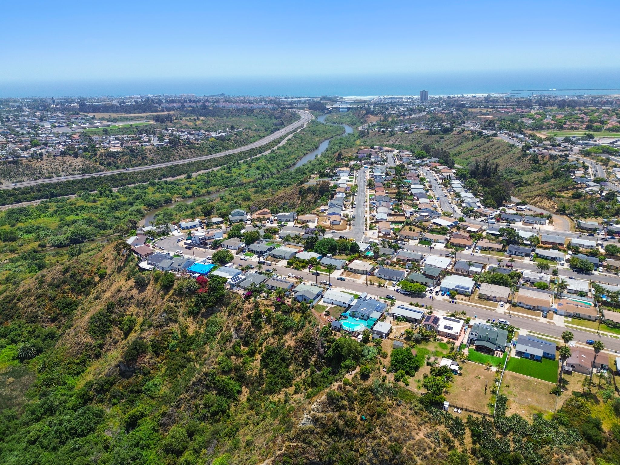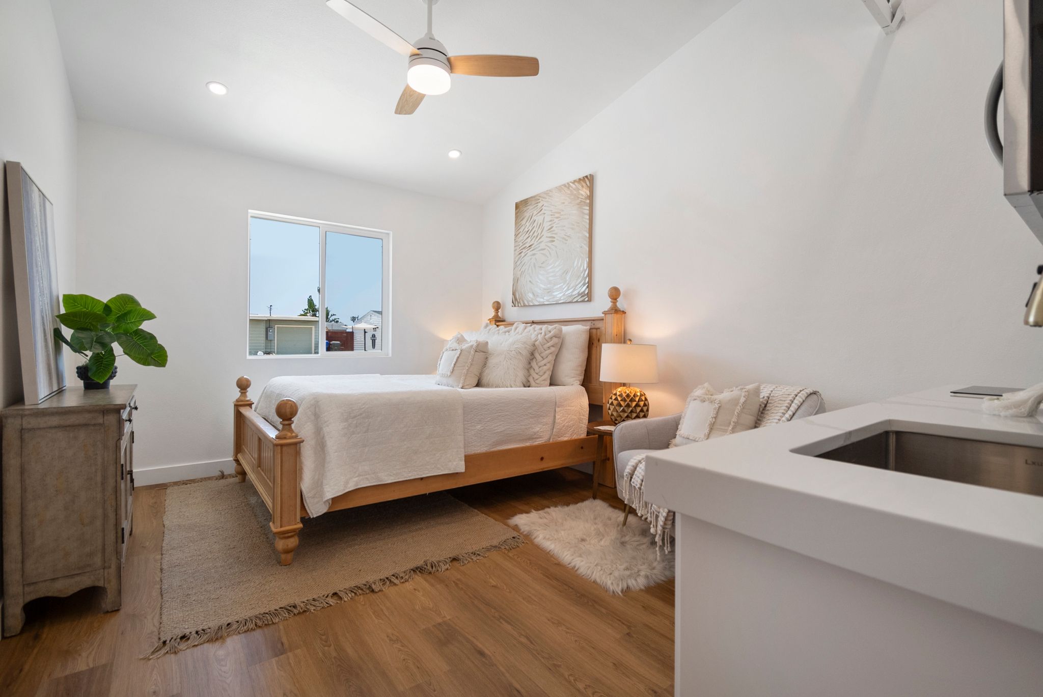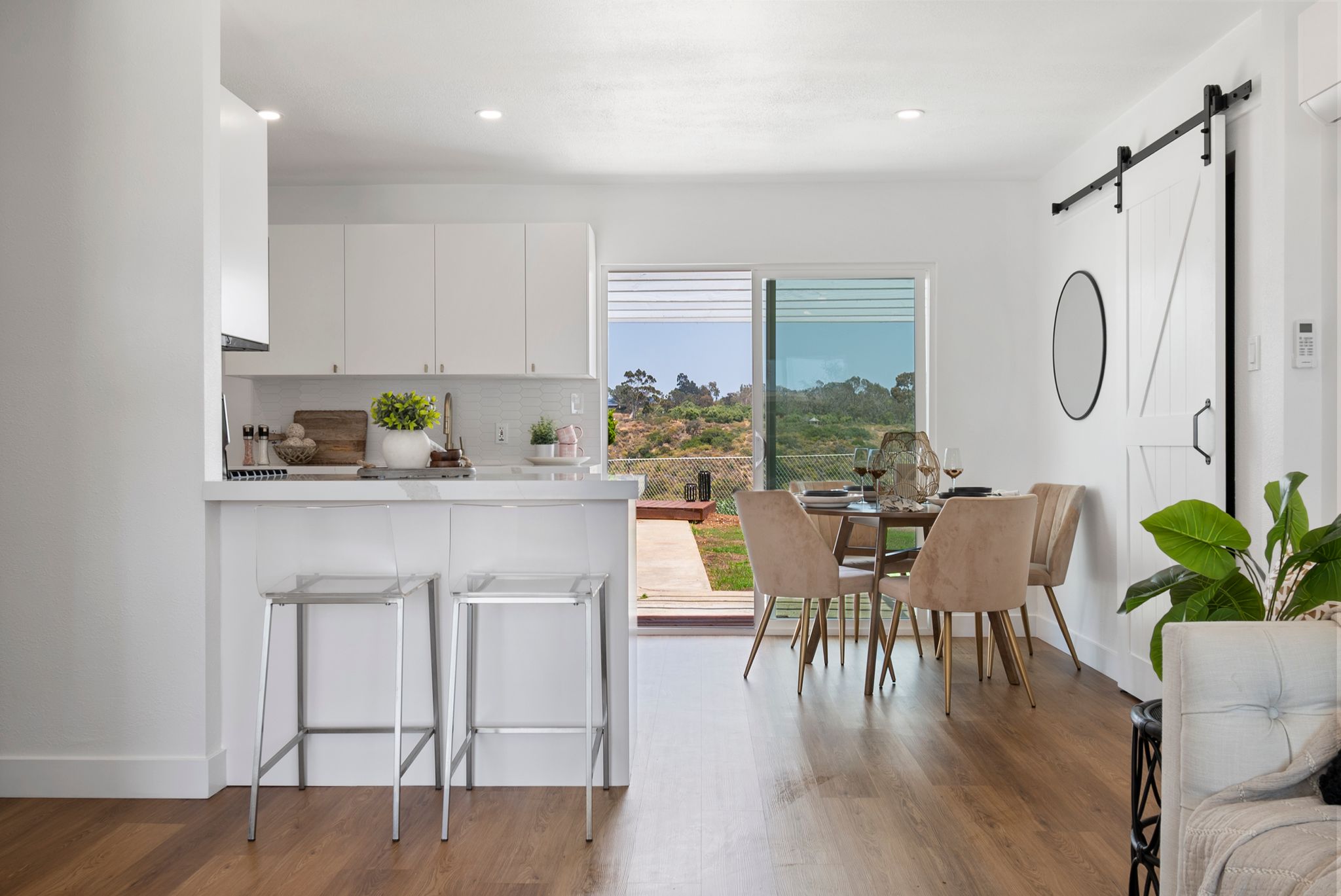 Introducing a meticulously remodeled single-story residence with an ADU in the desirable Eastside Capistrano neighborhood. Embrace the quintessential California coastal lifestyle, just a mile from the beach and Oceanside Harbor. Set on one of the larger, elevated, pool-sized lots, this home offers breathtaking panoramic valley and hill views. Completely renovated to the highest standards, the main house features a spacious layout with 3 bedrooms and 2 bathrooms. The newly built attached ADU (2024) includes 1 bedroom and 1 bathroom, a private entrance, kitchenette, laundry facilities, separate utilities and limitless possibilities—whether as a rental income opportunity or an ideal guest house for multi-generational living. The thoughtfully appointed kitchen boasts new stainless steel appliances, quartz countertops with bar seating, ample cabinet storage, a large sink and gold faucet and hardware. The beautifully designed yard is an entertainers dream with multiple seating patios. Retreat to the primary suite of your dreams, featuring a prewired ceiling fan, spacious mirrored closet and an ensuite with a walk-in shower showcasing stunning herringbone pattern tile, gold hardware and a modern vanity with slatted 3D wood paneling. Designed with a timeless modern coastal aesthetic, each detail of this home has been intentionally selected to create the perfect blend of luxury and functionality. Additional features include recessed lighting, luxury vinyl plank flooring, new vinyl dual-pane windows, mini-split climate control and fresh paint inside and out. No HOA and potential parking for RV and Boat.