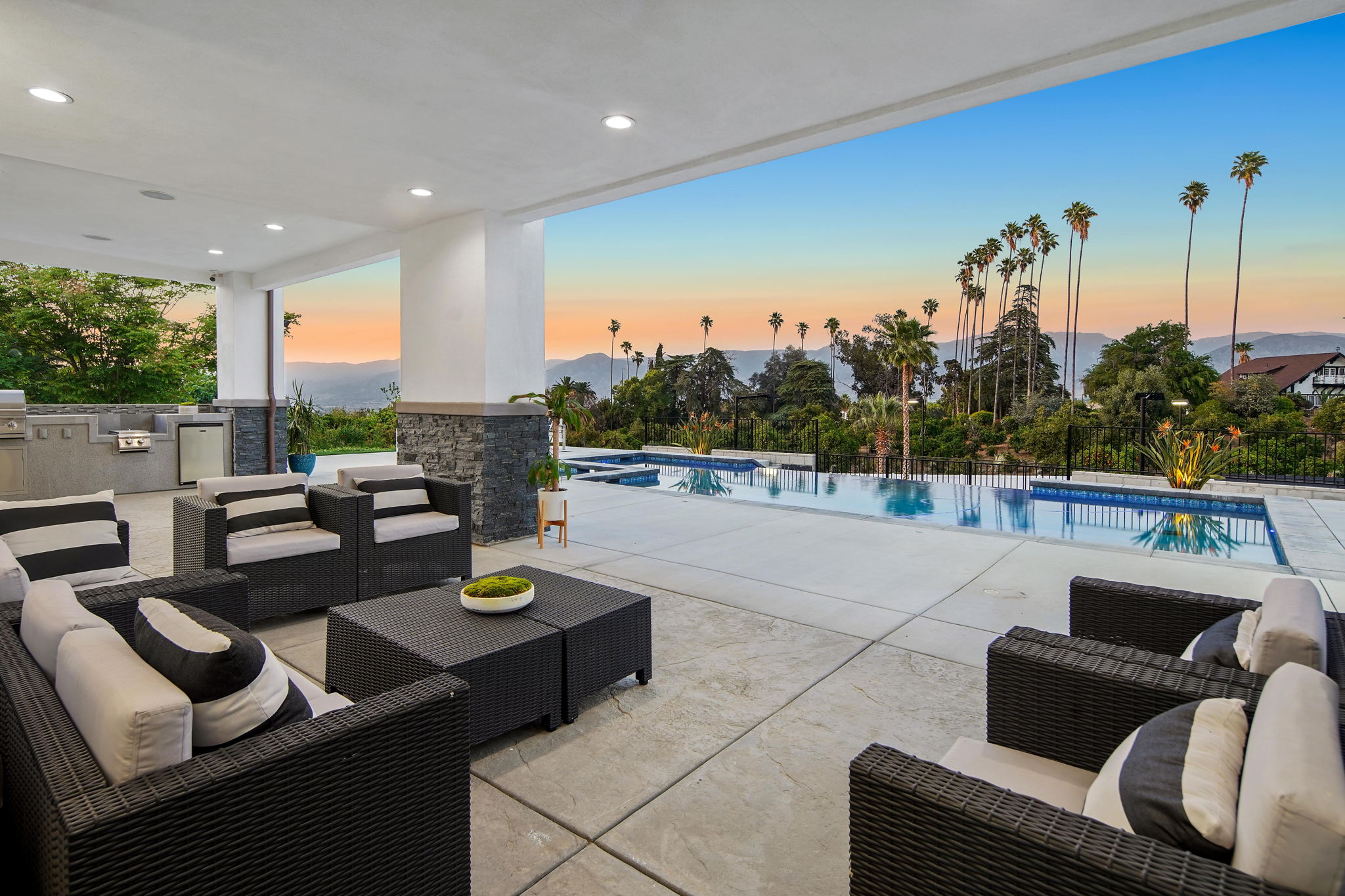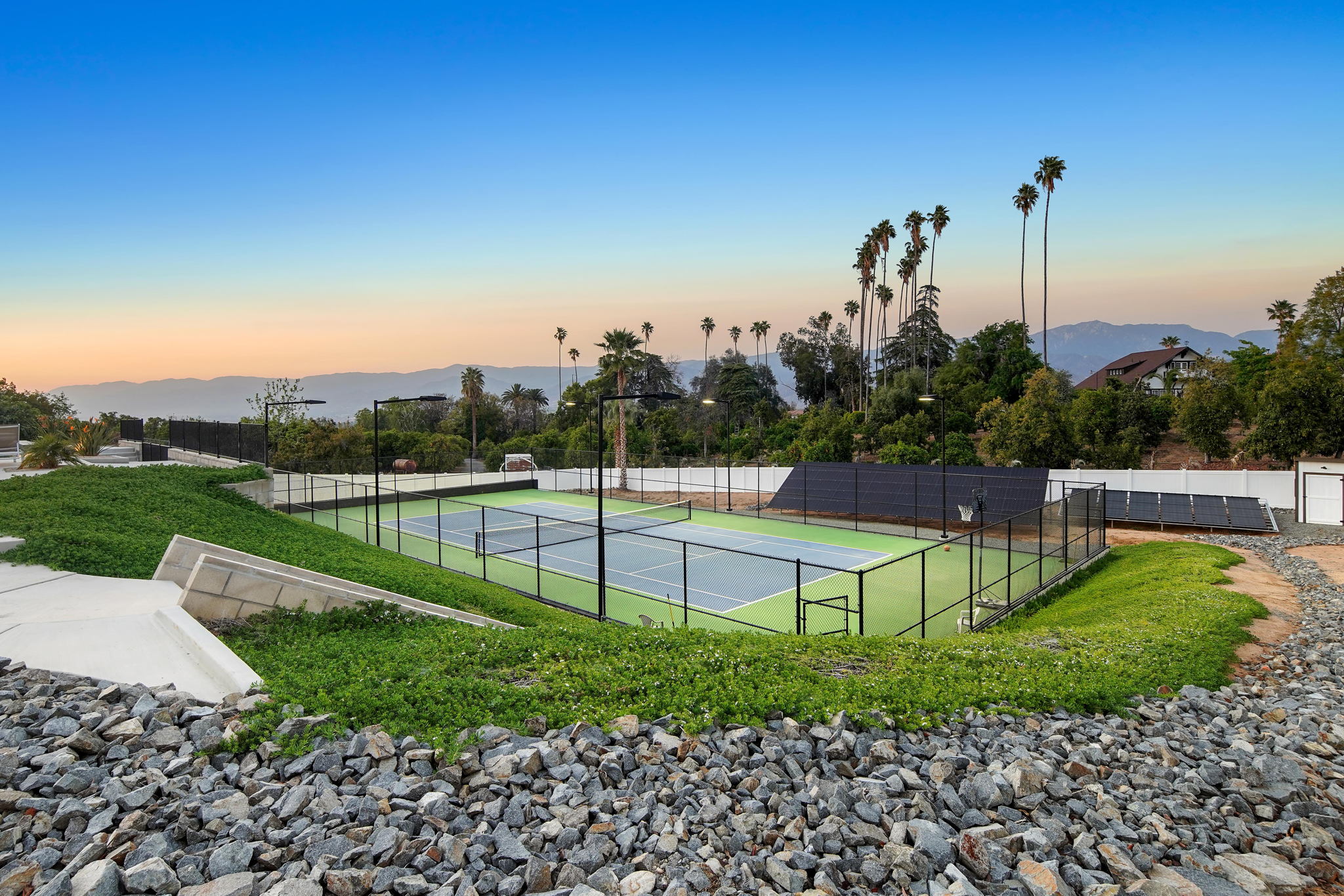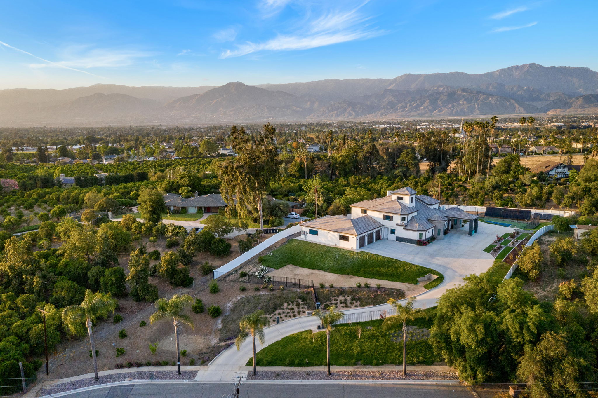 Situated behind private gates and a long driveway, this custom-built tennis court estate with over an acre of land was recently completed in 2019. The layout was crafted with Vastu Shastra in mind and every room was built to maximize practicality, comfort, and ease while maintaining a sleek and stylish design. The home features soaring ceilings complete with made-to-measure windows and an open gourmet kitchen seamlessly flowing through the formal dining room. 6 bedrooms, 5 bathrooms, a home gym, theatre room, and an intimate master retreat allowing private space for rest and rejuvenation complete this one-of-a-kind estate. The lavish interior flows effortlessly to the private covered patio perfect for entertaining and boasting breathtaking mountain and valley views. Other highlights of the property include a solar-heated infinity pool with baja edge and spa, outdoor kitchen, outdoor bathroom with shower, professional tennis court with LED lighting, full house water softener, 3 AC units, two pantries, automatic window coverings, 5-car insulated garage with Tesla charger, fully-owned solar panels, and much more. Less than a 10 minute drive from Redlands Country Club, San Timoteo Canyon, University of Redlands, and some of the finest dining in San Bernardino County.