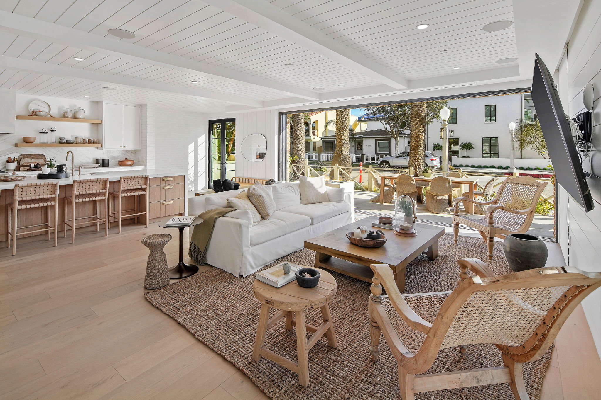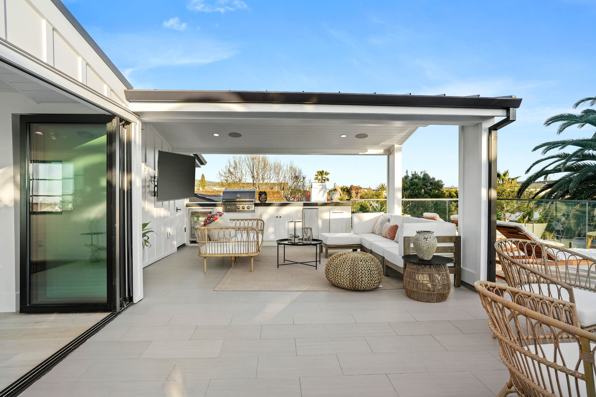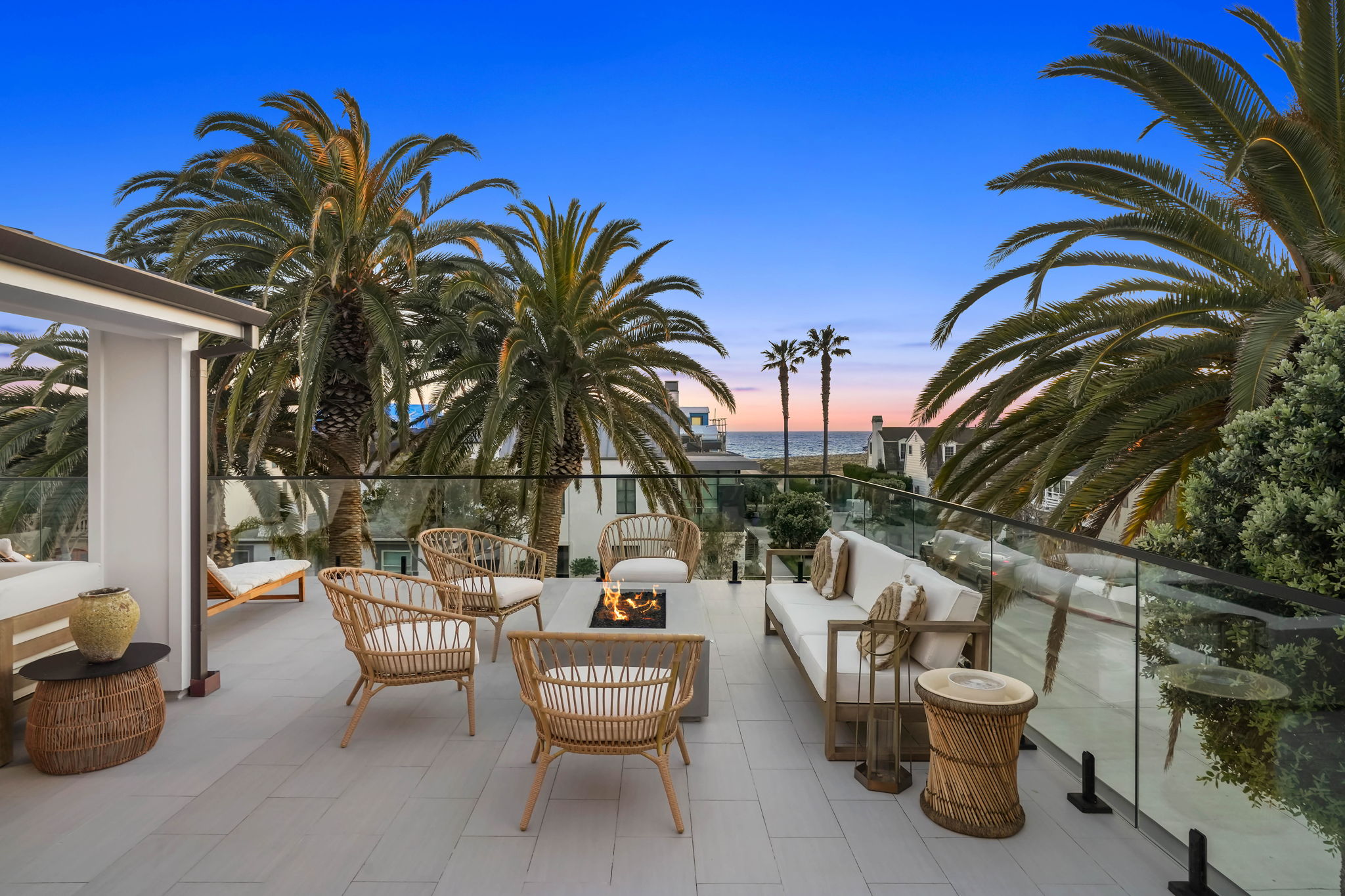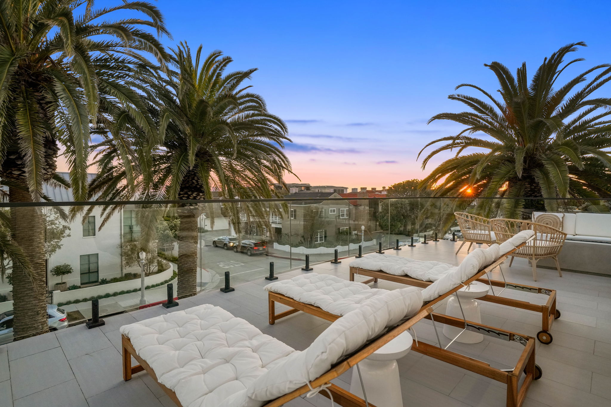 The upper level has a custom-built minibar and a full bathroom complete with signature red-bricked walls. Behind folding glass doors, this level opens up to arguably the largest roof deck in the area. The magnificent 1,000+ sq. ft. rooftop terrace is truly an entertainer's dream with its multiple covered and uncovered lounging areas, fire pit, and a built-in grill and mini fridge, overlooking the ocean, city and snowcapped mountains. A 3-car garage with Tesla/charging port, Sub-Zero fridge completes this rare offering, making it one of the best options out there for any discerning buyer.