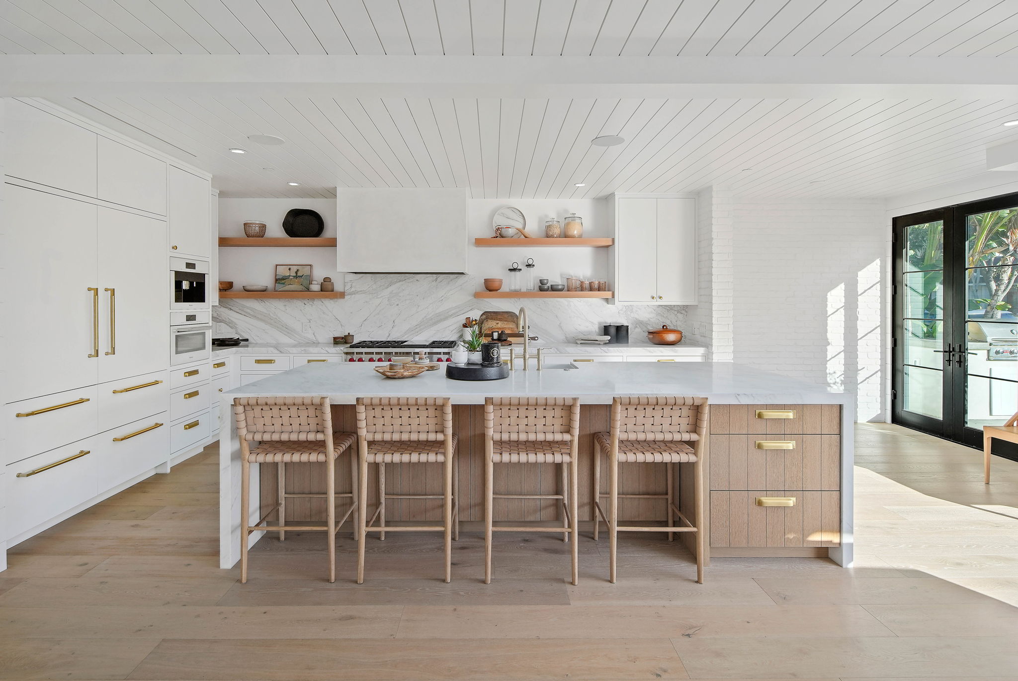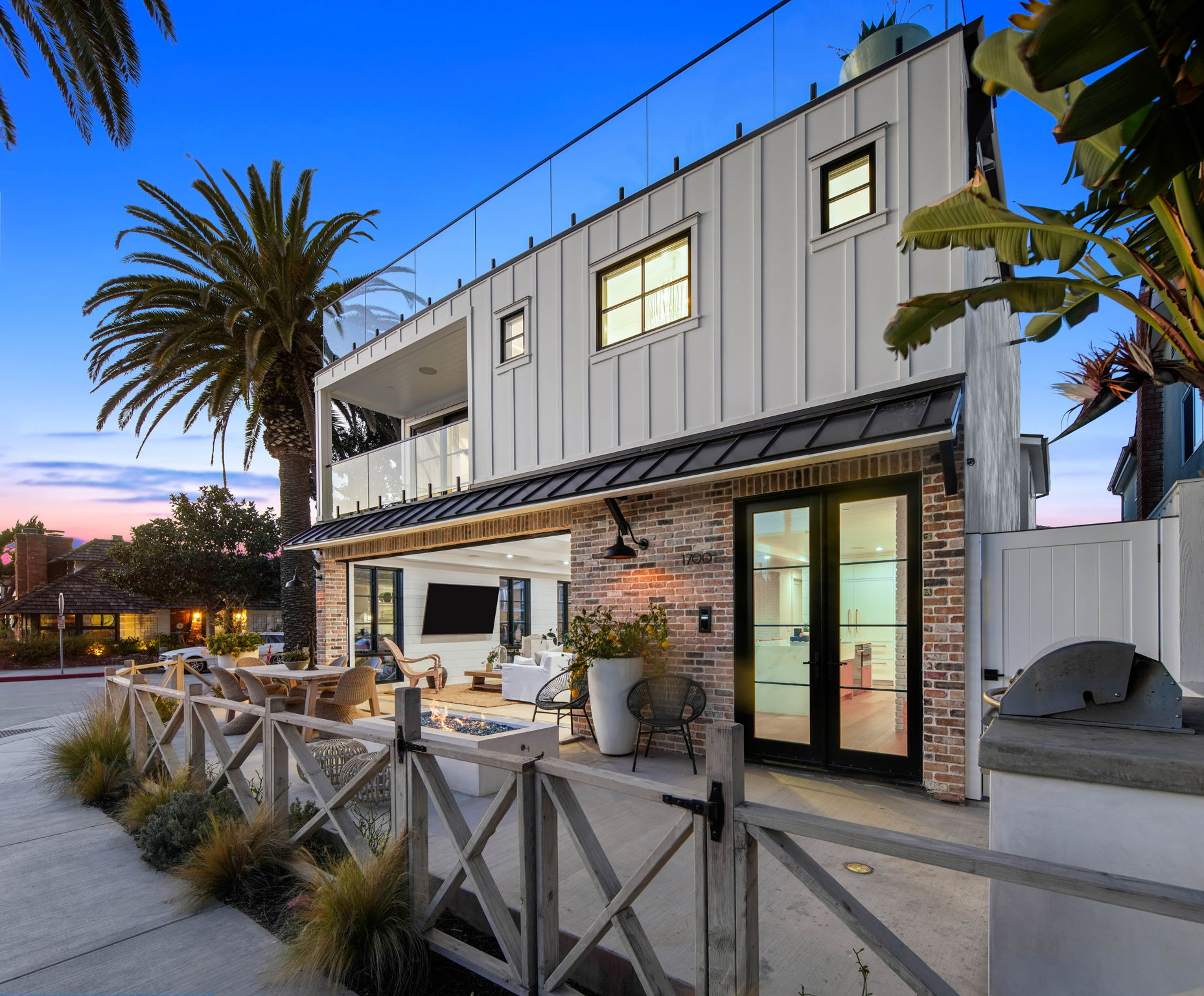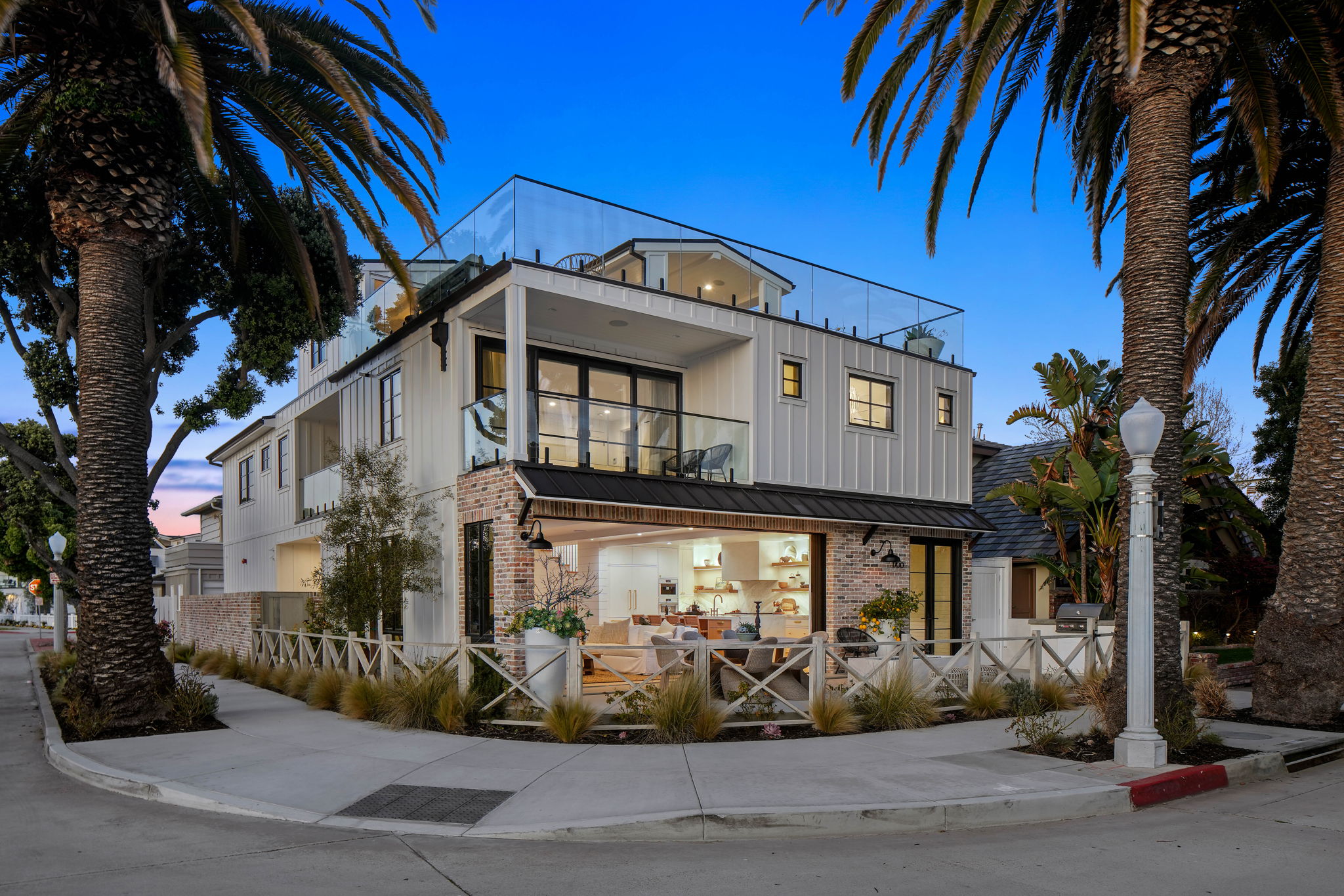 Stunningly warm coastal farmhouse enveloped by iconic palm trees, situated on an oversized wide corner lot on the prestigious Peninsula Point. Offers magnificent views spanning from the Pacific Ocean to Mount Baldy and is just steps from the sand. The 3-level home boasts pristine design and high-end finishes, including inviting white European oak floors outfitting the interiors, coupled with various specialty tiles throughout the bathrooms. Custom White shiplap walls add another appealing component to each floor in the house. A chef’s kiss to the kitchen, it is topped with Calacatta marble and designer brass hardware with a large cascading waterfall island, large farmhouse sink, sleek white cabinets, and high-end appliances. The main level, with an open floor plan, comes replete with an airy and light-filled living area, a spacious dining area accentuated by a rustic white brick feature wall, cozy bar area, laundry room with double stacked appliances and powder bath.