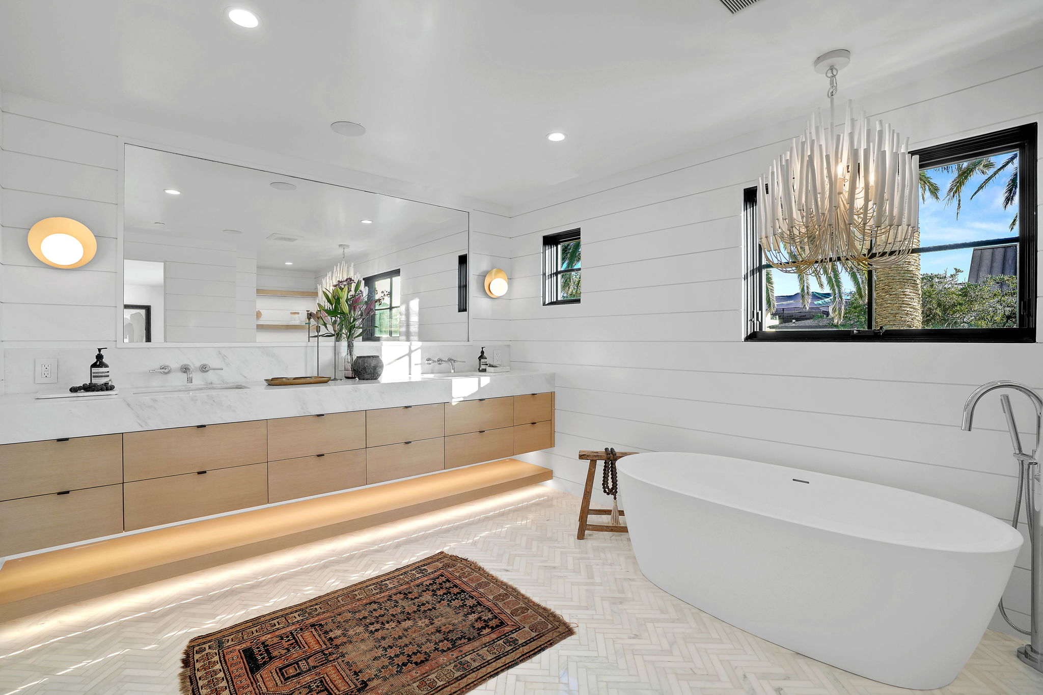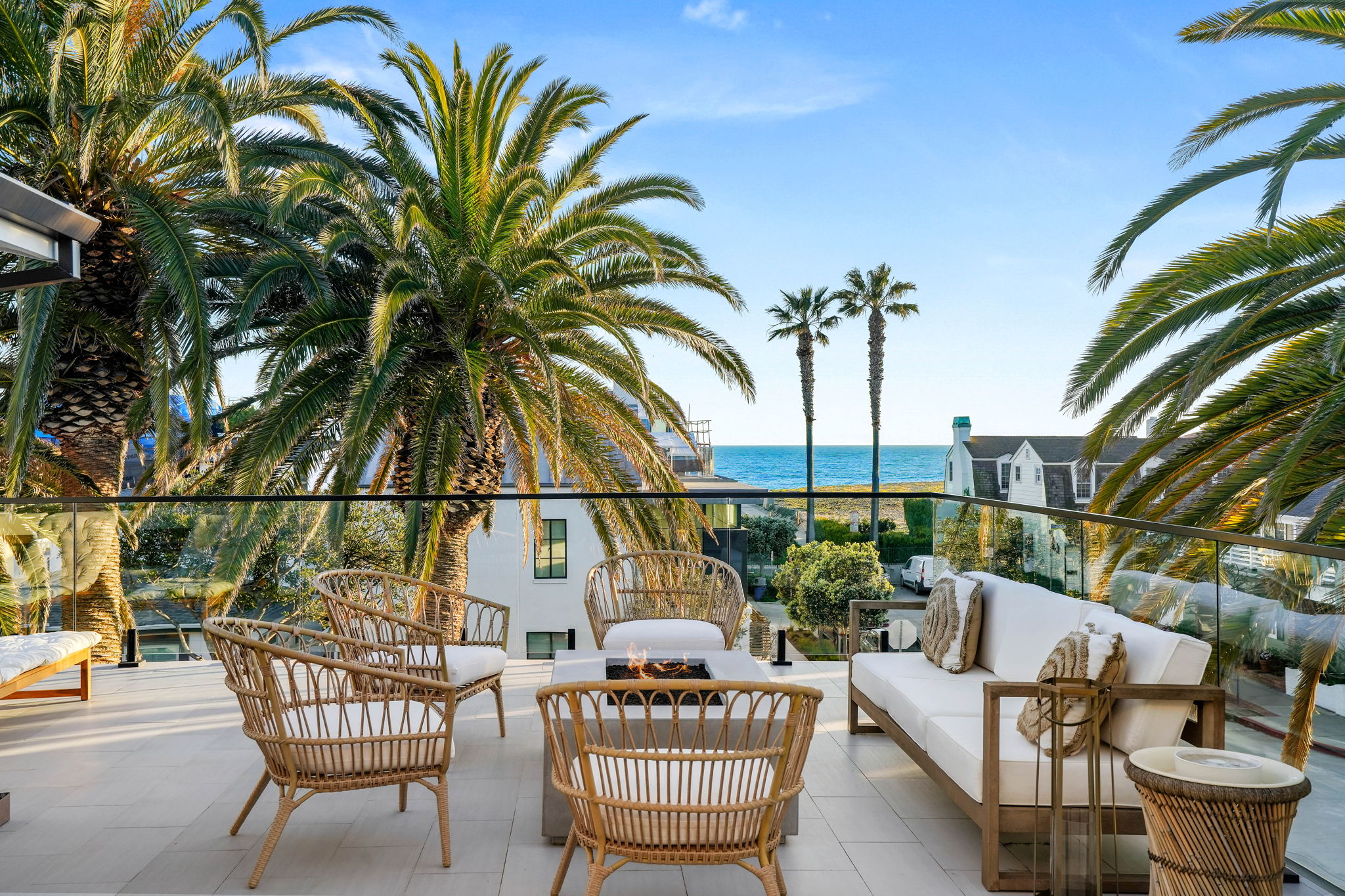 The custom pocket doors open the main level to the lower terrace boasting a fire pit, grill, and plenty of space for entertaining guests. The sleek primary suite includes large private balcony with breathtaking ocean view, spacious walk-in closet and a luxurious spa bathroom with dual vanities, a large soaking tub, oversized walk-in shower clad in marble and encased in glass doors, custom wood cabinetry with marble countertops, chic herringbone tile flooring, and mood lighting. The three spacious guest bedrooms luxuriate custom features throughout with one enjoying its own private balcony.