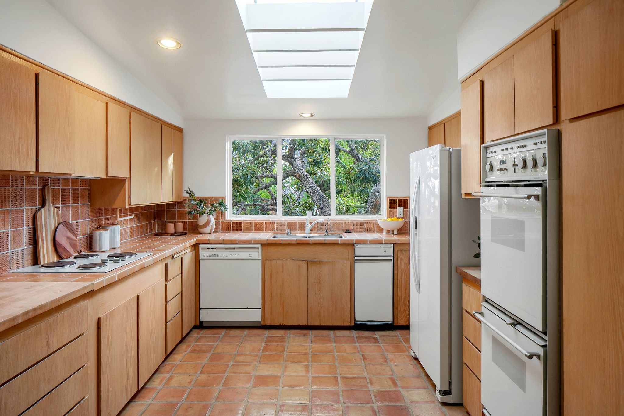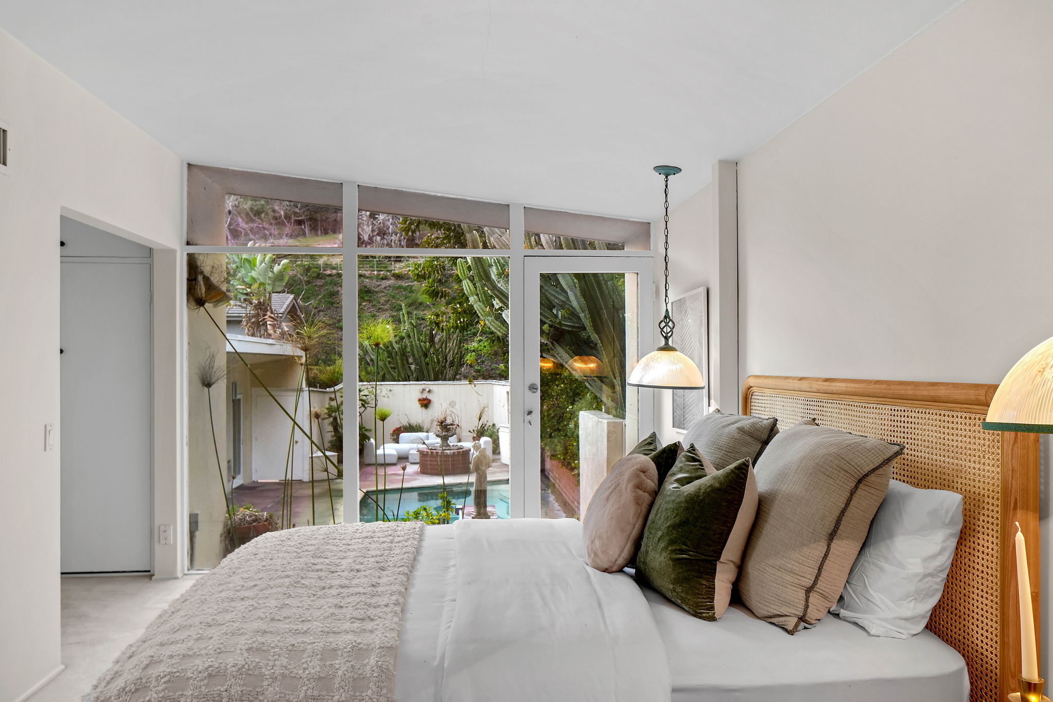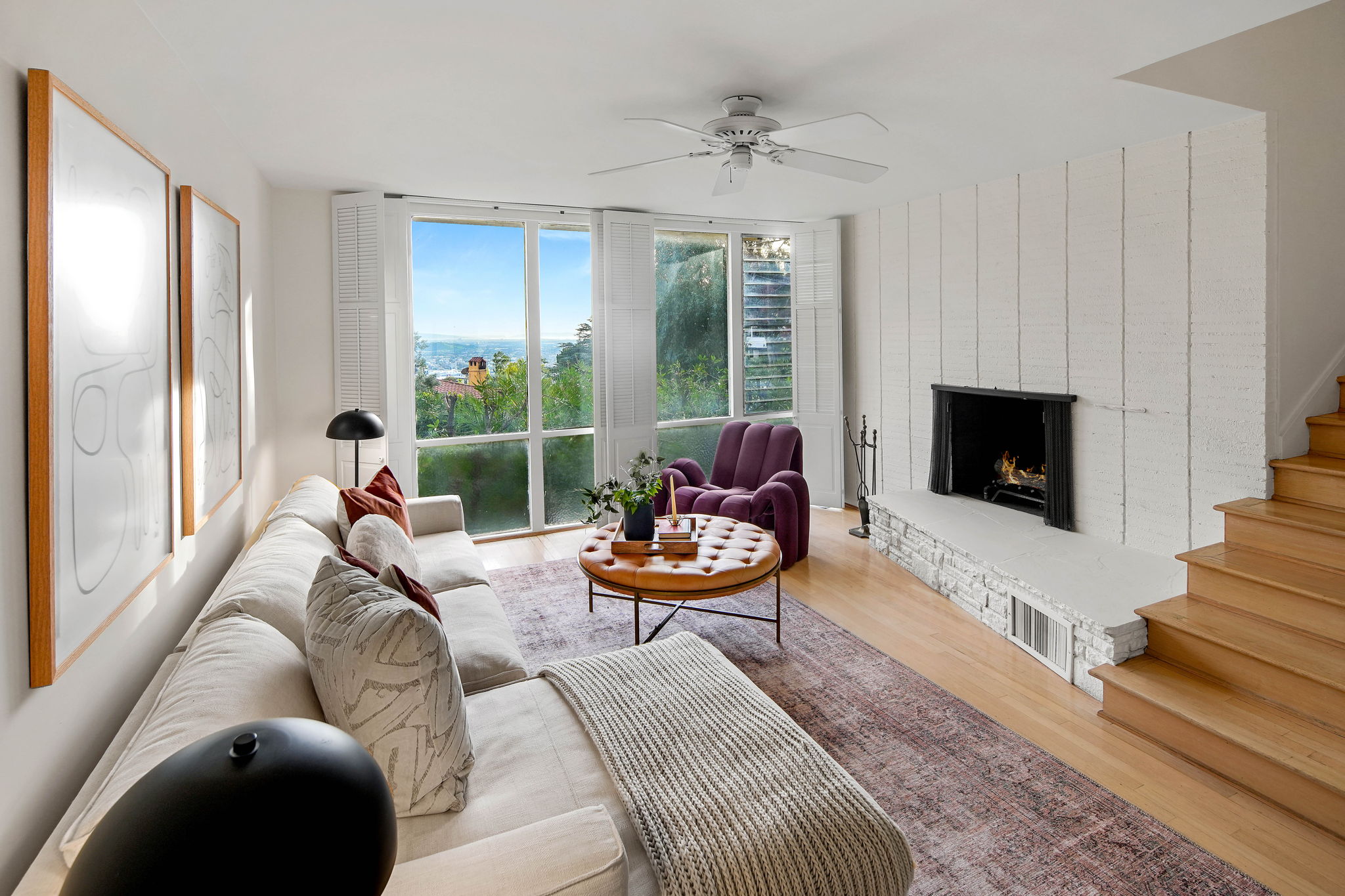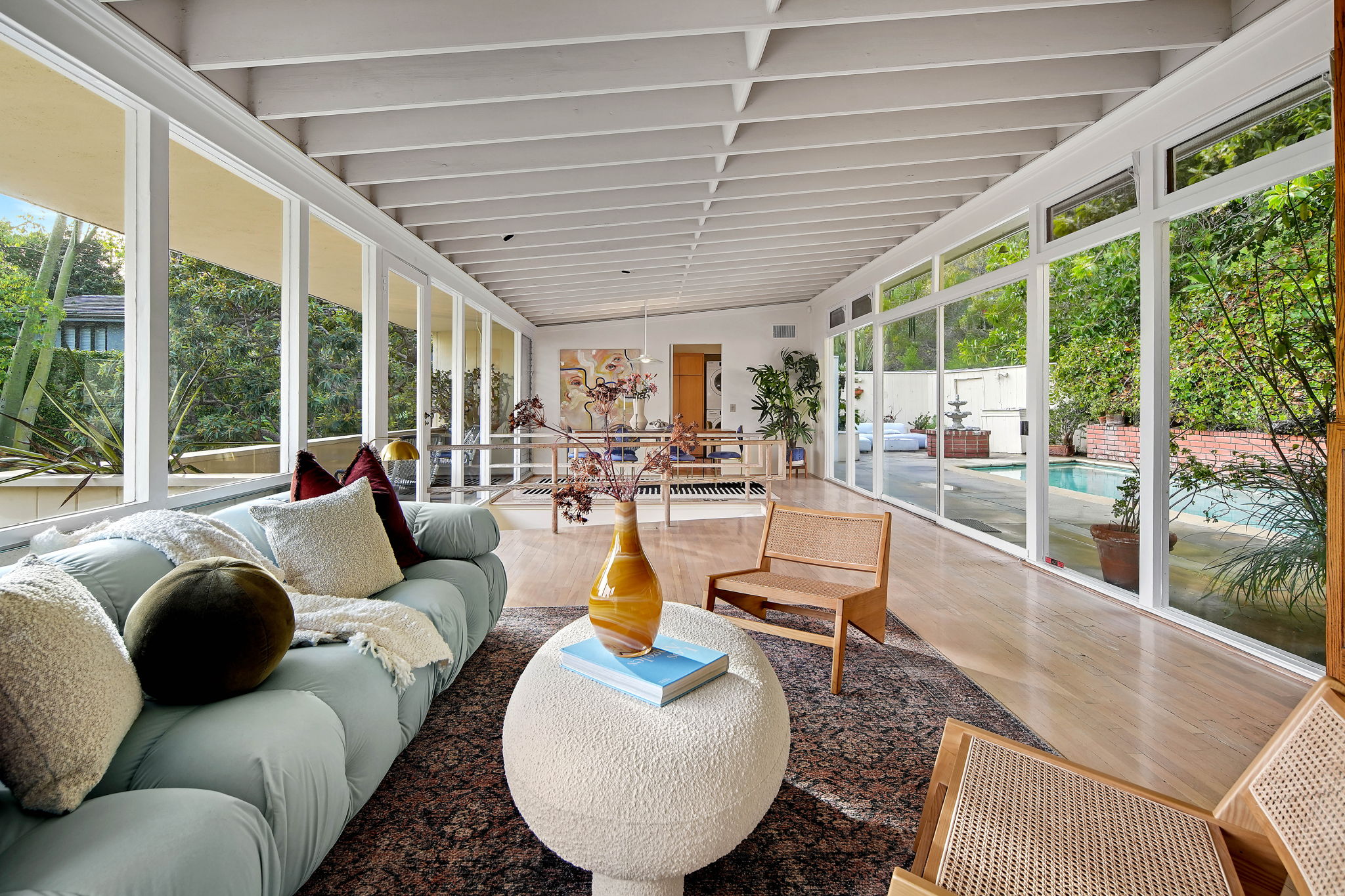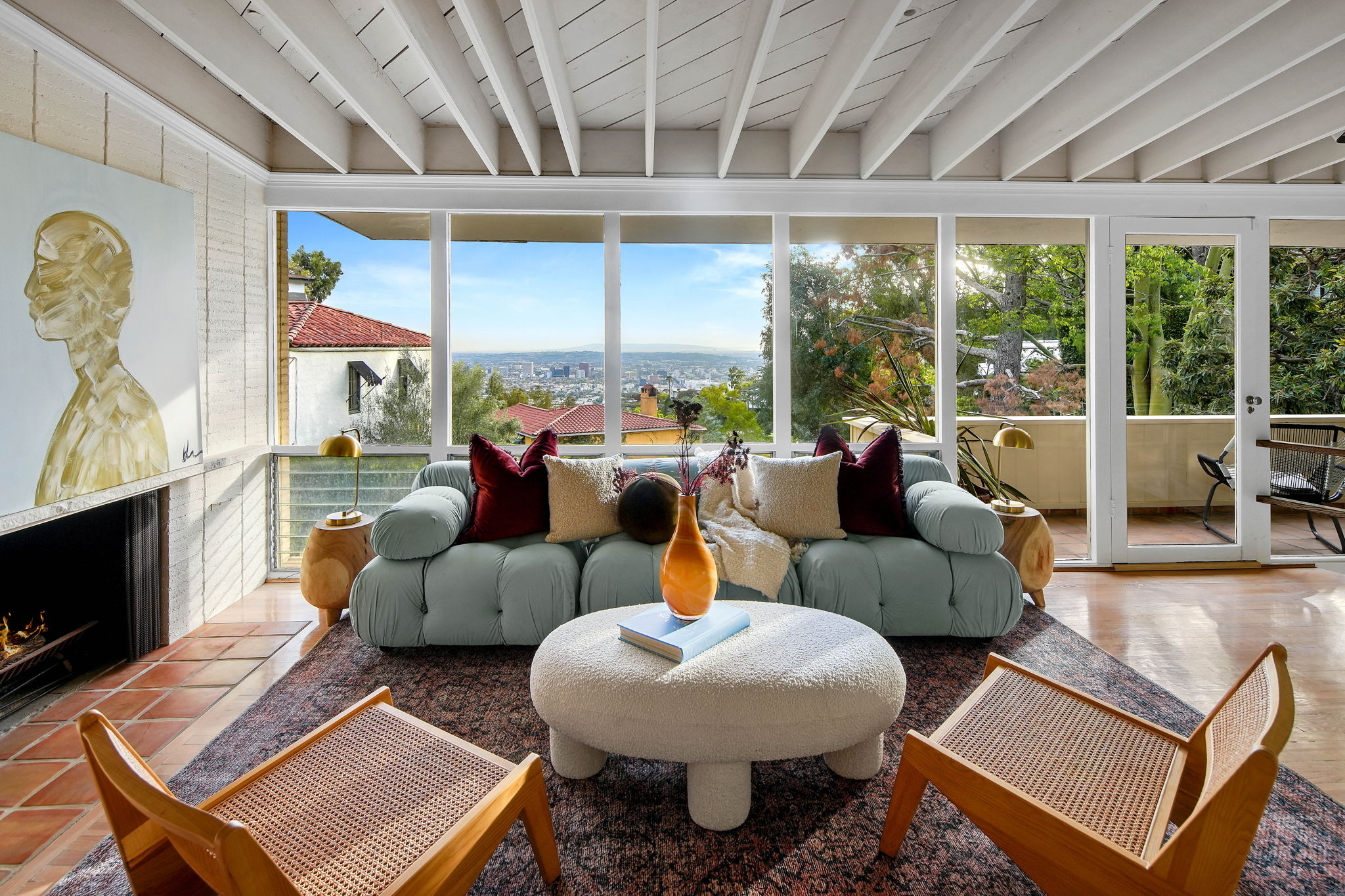 This is a rare opportunity to renovate a classic, charming 1950s mid-century home located just above the Sunset Strip with spectacular city and coastline views. The living room on the main level features floor-to-ceiling windows on both sides, seamlessly connecting the backyard with a large pool to the deck along the front of the house that showcases the expansive views. The living room also features a traditional built-in wet bar and fireplace. On the other side of this fireplace sits a media room and office with floor-to-ceiling windows that look out to green foliage and the city. The kitchen and dining area complete the main level (the kitchen could easily be opened to the dining/living room). The lower level has an additional cozy bedroom/den area with a full bathroom attached. Two more bedrooms and bathrooms are located upstairs; the front bedroom has stunning views and the back bedroom connects to the backyard. An attached 2-car garage and driveway provide ample parking.