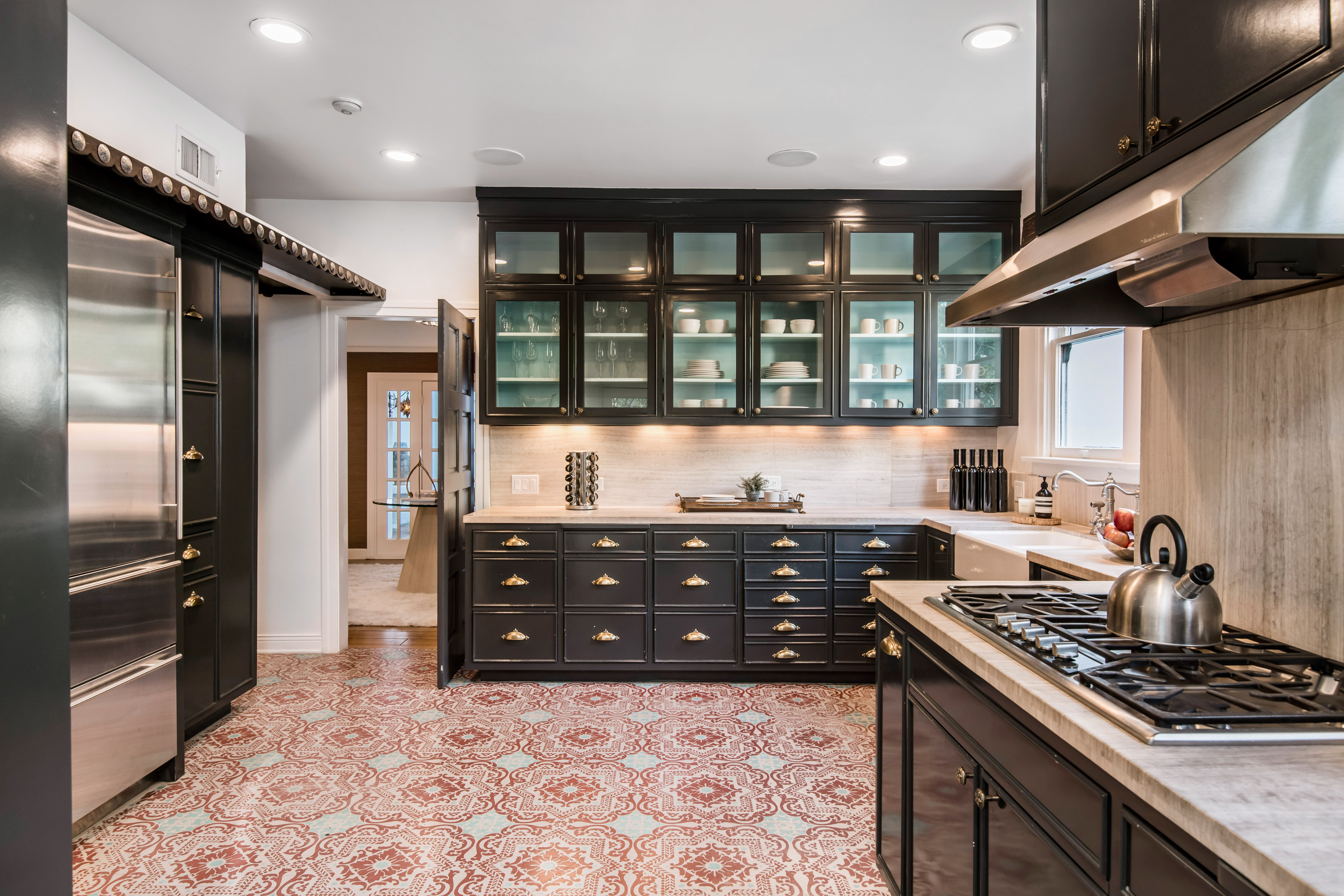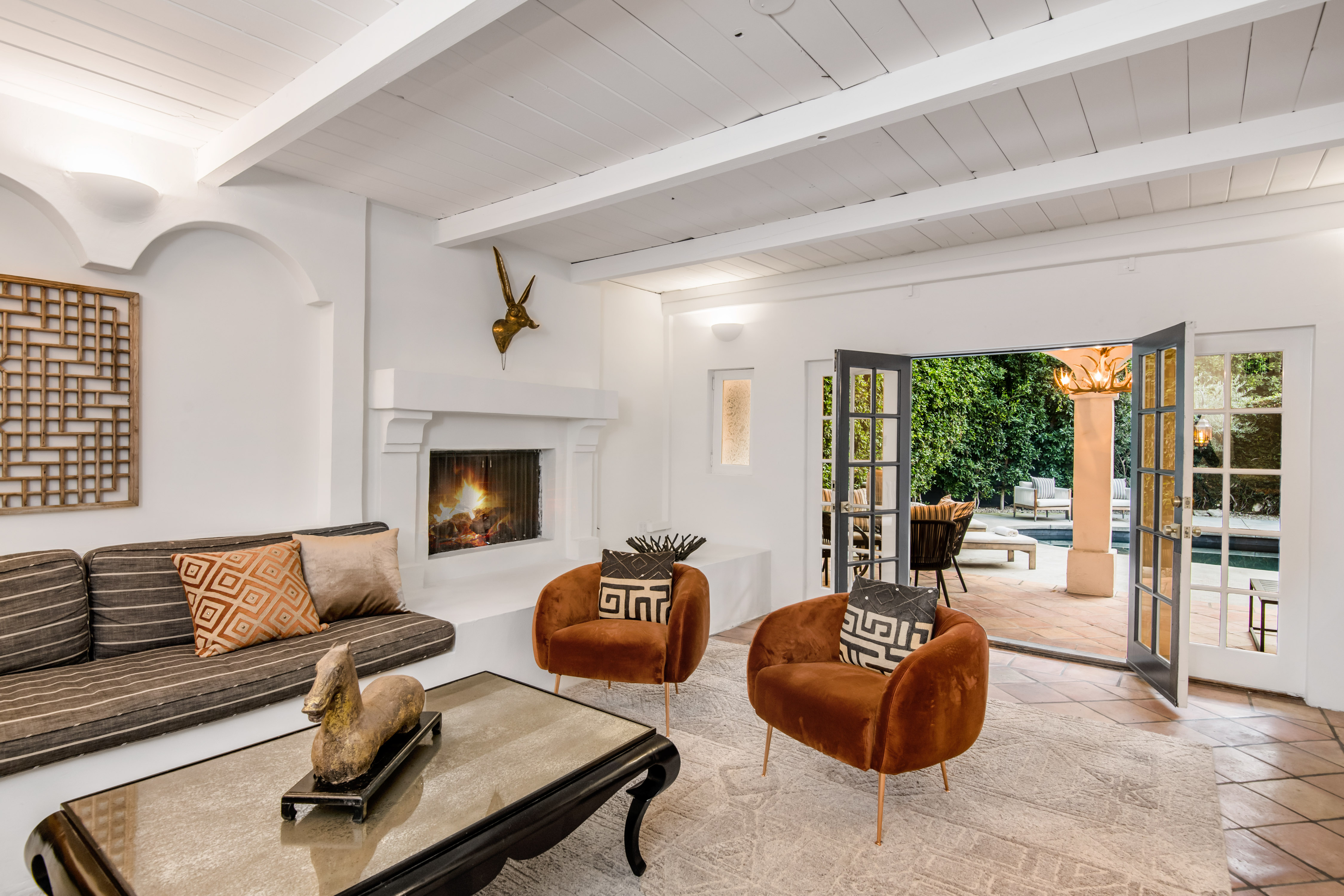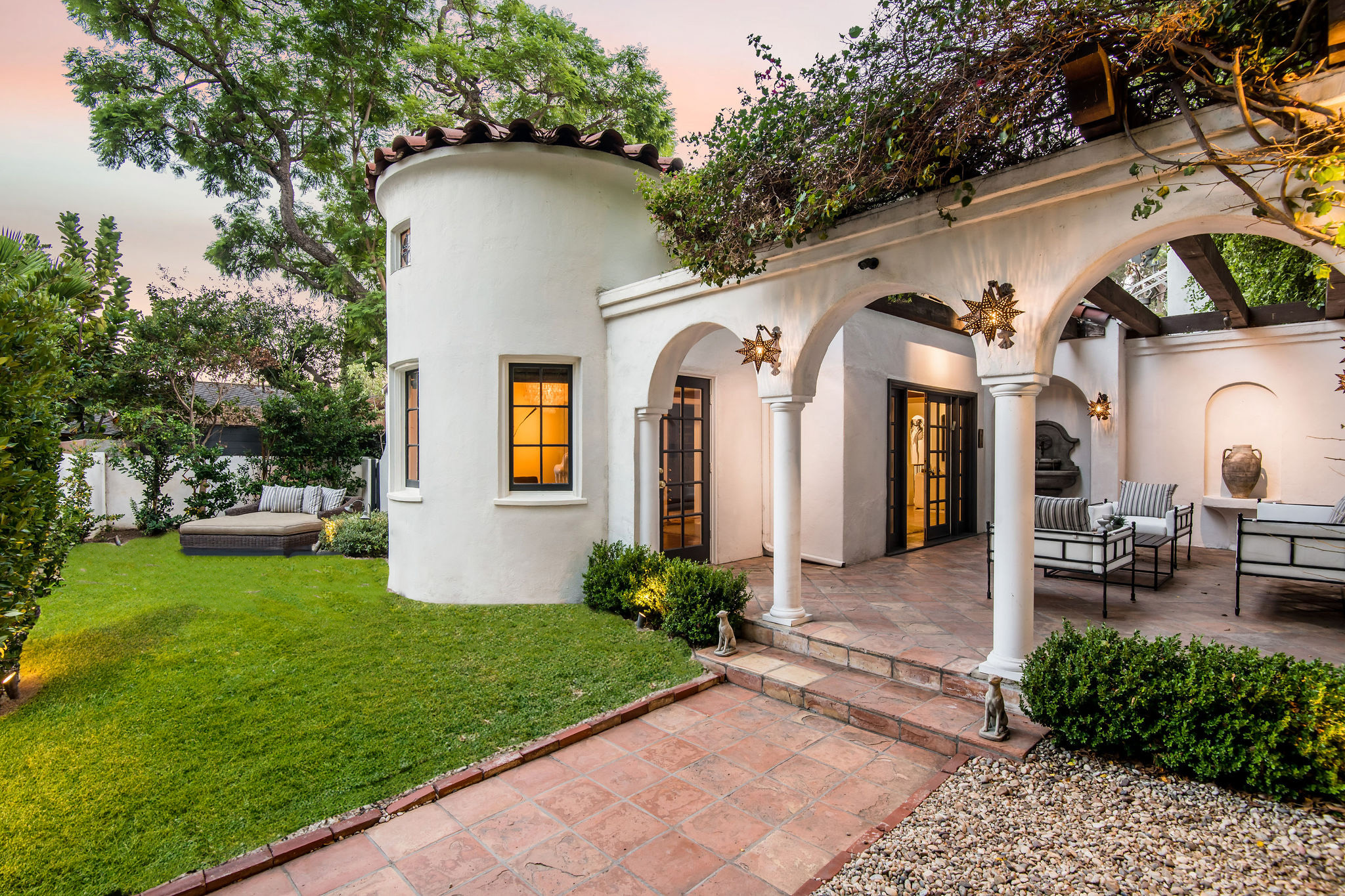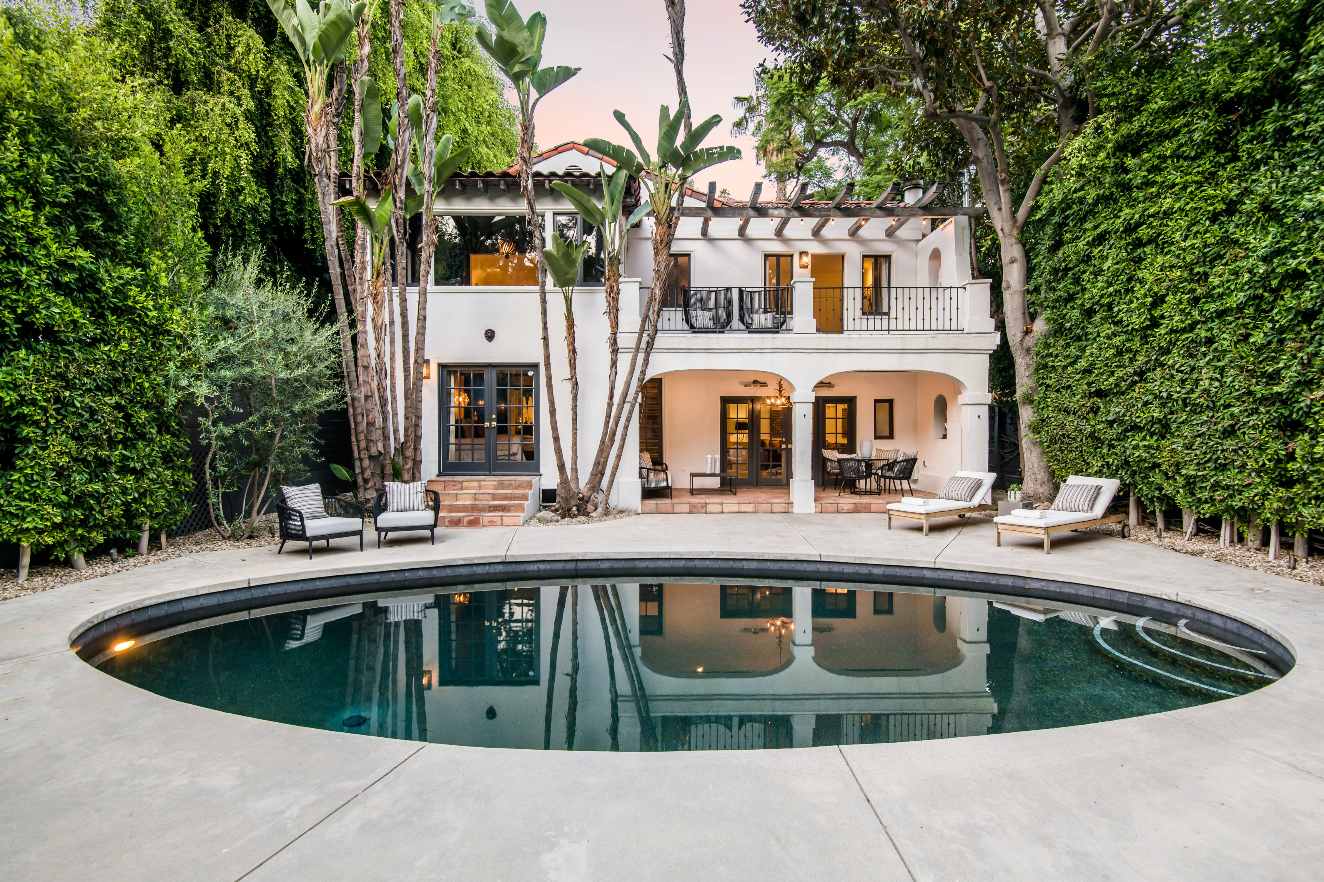 Discover this exquisite 1924 Spanish, a meticulously restored gem in the highly desirable Nichols Canyon. Walled, gated, and surrounded by lush, mature landscaping, this timeless residence offers unparalleled privacy and charm, creating a tranquil oasis just minutes from the city. A romantic bougainvillea-draped terrace and soothing fountain welcome you to the property. Step inside to find a foyer with coved ceilings leading to an expansive living room featuring a wood-burning fireplace and an adjacent office/library with walls of glass overlooking the serene backyard. The formal dining room, crowned by a soaring turret ceiling, connects seamlessly to the updated chef’s kitchen. Showcasing hand-stenciled floors, stone countertops, a custom marble sink imported from Turkey, and professional-grade appliances, the kitchen perfectly balances historic character with modern convenience. The primary suite is a luxurious retreat with a spacious walk-in closet, additional storage, and a marble bathroom boasting dual sinks, a soaking tub, and a glass-enclosed shower. French doors lead directly to the backyard, creating a seamless indoor-outdoor flow. The home boasts two additional bedrooms with richly finished en-suite baths and one with access to a private balcony. A Moroccan-inspired media room with a fireplace adds to the home’s allure, ideal for movie nights or gatherings. The backyard is a private sanctuary, featuring a newly refinished saline pool, ivy-covered walls, a tiled dining veranda, and multiple outdoor lounge spaces bathed in sunlight. Additional highlights include a gated two-car port, driveway parking for two more vehicles, and ample space for guests. This Nichols Canyon treasure perfectly blends architectural integrity with modern amenities, offering a rare opportunity to own a piece of California history on one of the most sought-after streets in the Hollywood Hills