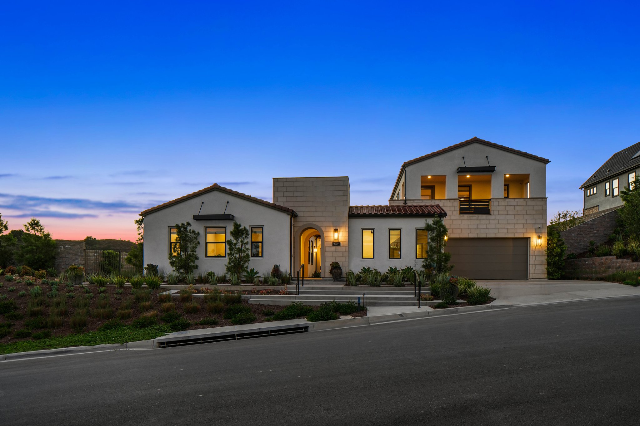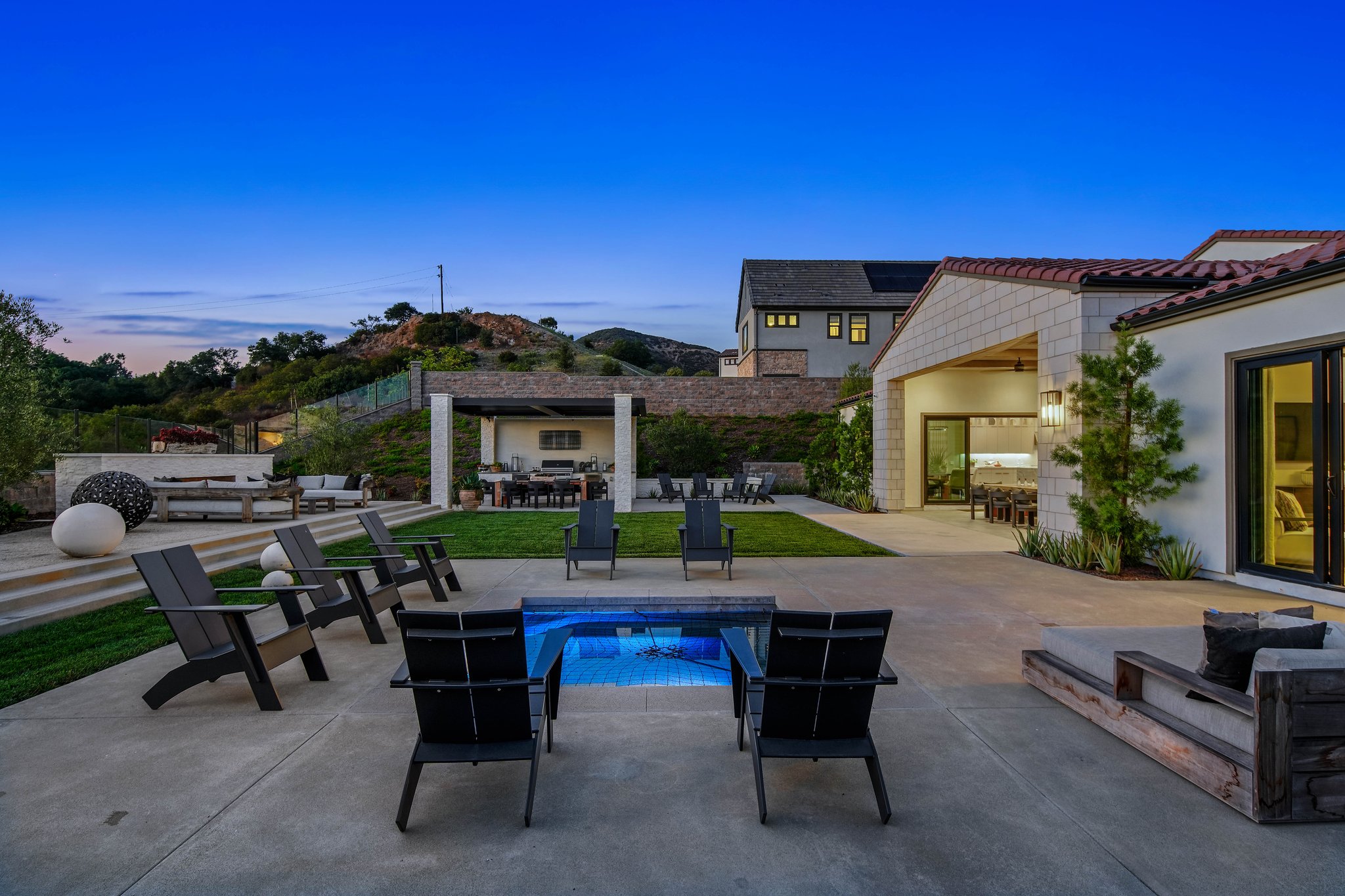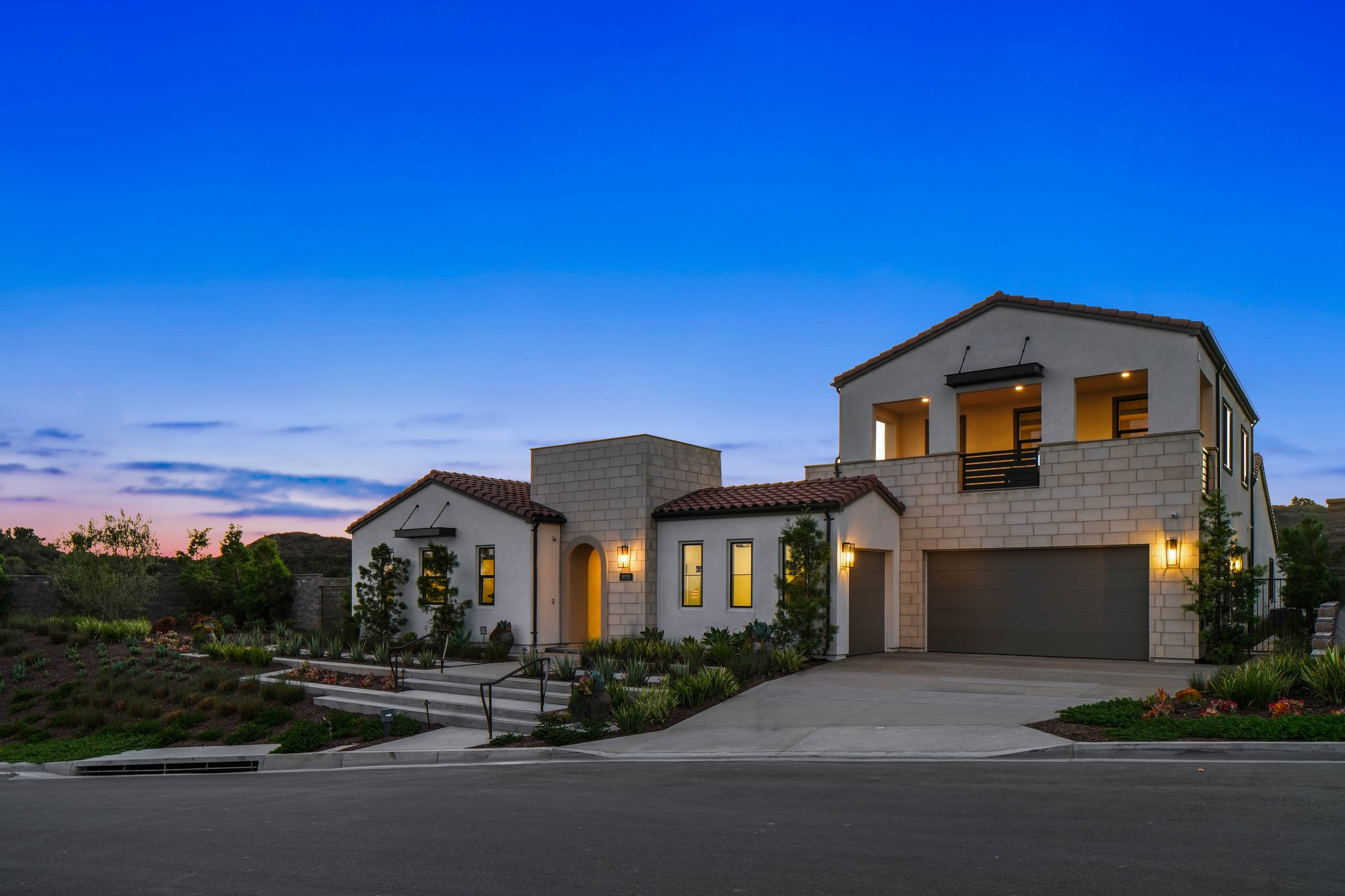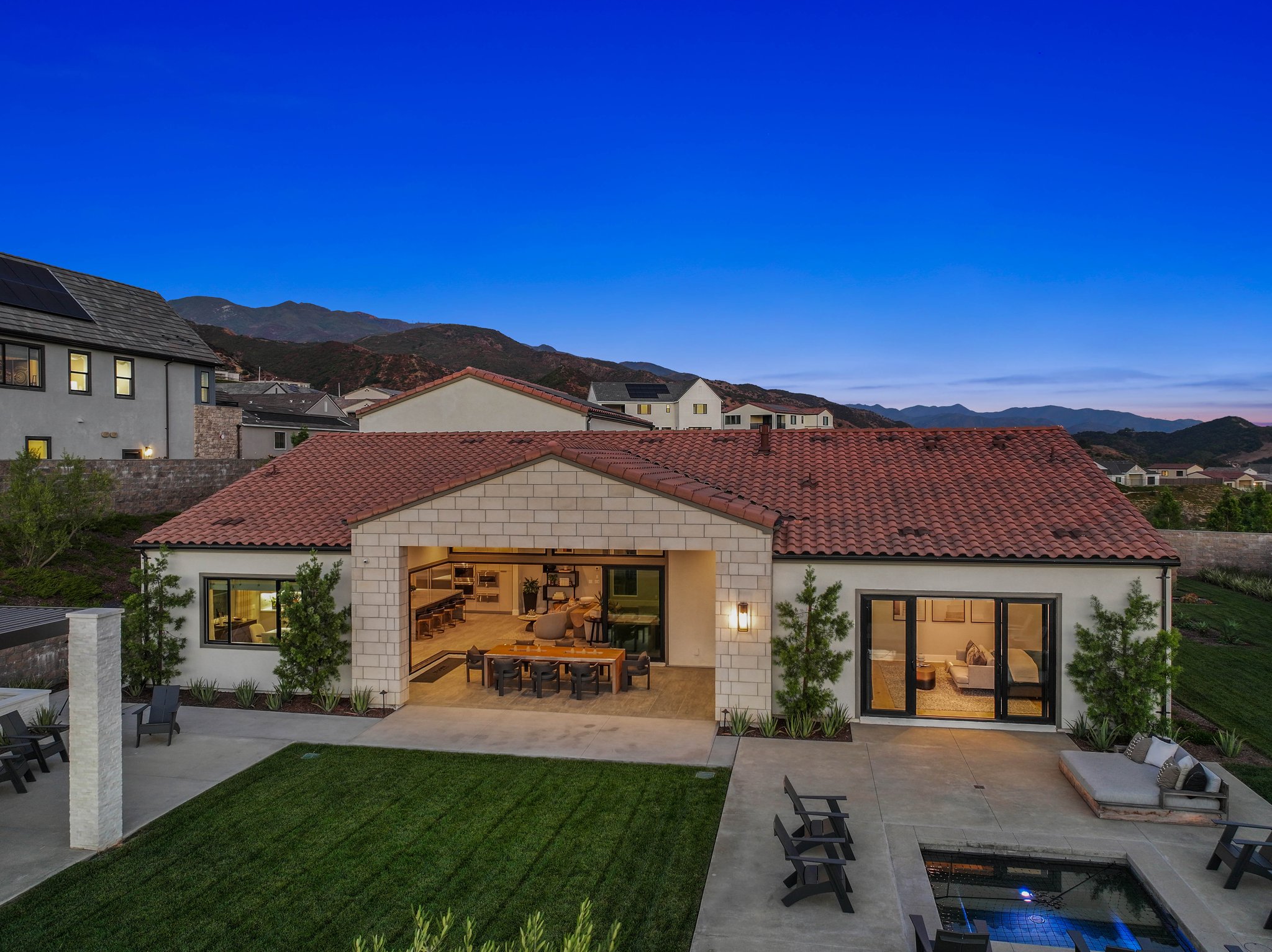 Welcome to Adler at Saddle Crest, a gated community that offers the perfect balance of tranquility and accessibility, allowing you to enjoy the best of what Orange County has to offer while feeling away from it all. This stunning Tri Pointe Homes Adler Plan 2 model home is now available in the beautiful Silverado/Silverado Canyon community. This home masterfully offers a harmonious blend of modern elegance and functional living, set against the breathtaking backdrop of stunning mountain views on just over half an acre. Upon entry, you are greeted by a grand courtyard leading to an outdoor seating area featuring a cozy fireplace and ambient lighting that creates an ideal, relaxed atmosphere. The layout features seamless connectivity between the great room, dining area, kitchen, and covered outdoor living space, creating an inviting atmosphere for both relaxation and entertaining. The kitchen serves as the focal point of the home, showcasing light, neutral, flat-panel stacked cabinets paired with elegant quartz countertops and a waterfall-edge quartzite kitchen island. Large gray flooring tiles throughout the main living areas provide a contemporary feel, while the primary and guest bedrooms feature luxurious wood flooring for added warmth. Additional features include a dedicated office or flex room, a luxurious primary suite with an expansive walk-in closet, and an oversized laundry room with ample storage space. Custom built-ins are thoughtfully incorporated into the design, enhancing the great room fireplace, drop zone, office, and bonus room. The spacious great room opens directly to a large covered patio, ideal for outdoor living and relaxation by the fireplace. This space flows into a generous backyard designed for entertaining, complete with a built-in spa that serves as a luxurious retreat. The expansive outdoor area is perfect for gatherings, providing ample space for dining and entertaining, all while offering breathtaking views of the surrounding mountains. The 769 square feet second-floor bonus room, complete with its own private entry, offers flexibility for guests or additional living space. This home is thoughtfully crafted to meet the needs of modern living while maintaining a sense of comfort and style.