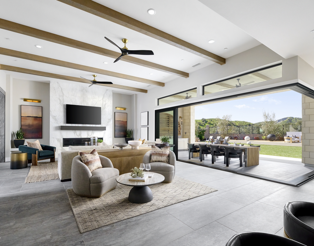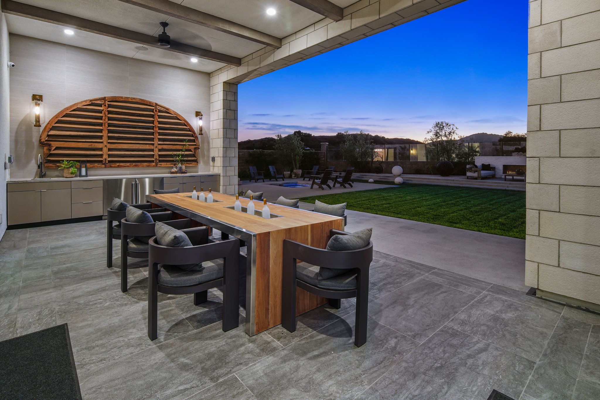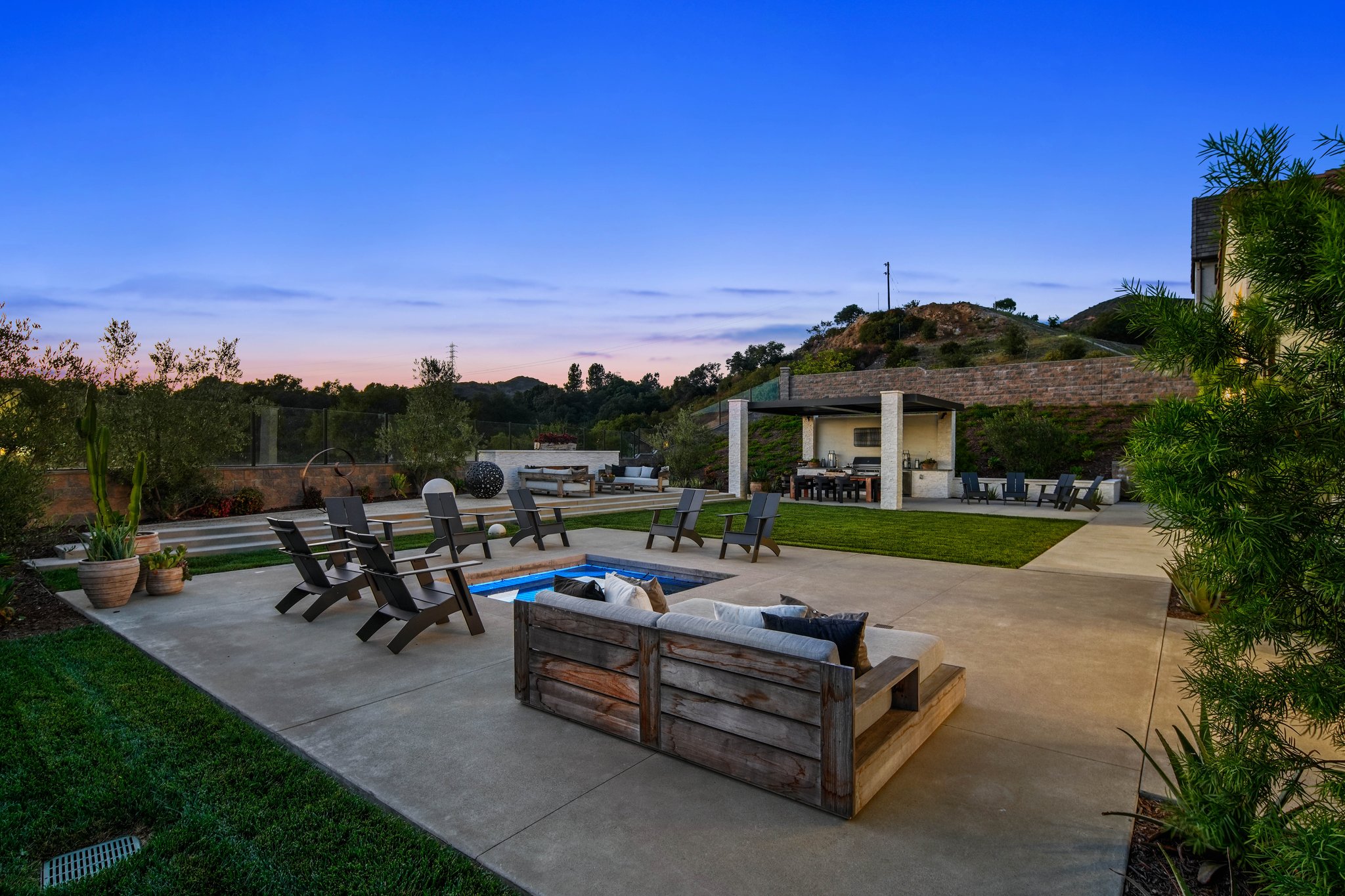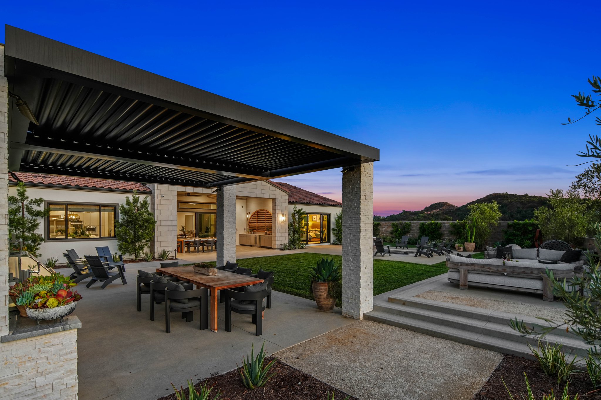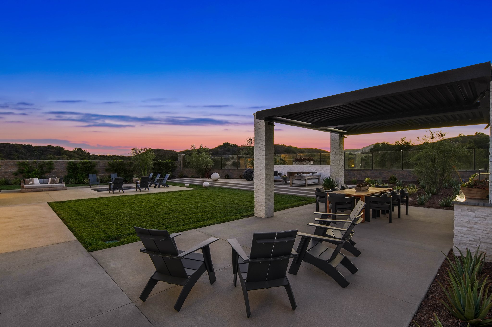 Welcome to Adler at Saddle Crest, a gated community that offers the perfect balance of tranquility and accessibility, allowing you to enjoy the best of what Orange County has to offer while feeling away from it all. This stunning Tri Pointe Homes Adler Plan 2 model home is now available in the beautiful Silverado/Silverado Canyon community. This home masterfully offers a harmonious blend of modern elegance and functional living, set against the breathtaking backdrop of stunning mountain views on just over half an acre. Upon entry, you are greeted by a grand courtyard leading to an outdoor seating area featuring a cozy fireplace and ambient lighting that creates an ideal, relaxed atmosphere. The layout features seamless connectivity between the great room, dining area, kitchen, and covered outdoor living space, creating an inviting atmosphere for both relaxation and entertaining. The kitchen serves as the focal point of the home, showcasing light, neutral, flat-panel stacked cabinets paired with elegant quartz countertops and a waterfall-edge quartzite kitchen island. Large gray flooring tiles throughout the main living areas provide a contemporary feel, while the primary and guest bedrooms feature luxurious wood flooring for added warmth. Additional features include a dedicated office or flex room, a luxurious primary suite with an expansive walk-in closet, and an oversized laundry room with ample storage space. Custom built-ins are thoughtfully incorporated into the design, enhancing the great room fireplace, drop zone, office, and bonus room. The spacious great room opens directly to a large covered patio, ideal for outdoor living and relaxation by the fireplace. This space flows into a generous backyard designed for entertaining, complete with a built-in spa that serves as a luxurious retreat. The expansive outdoor area is perfect for gatherings, providing ample space for dining and entertaining, all while offering breathtaking views of the surrounding mountains. The 769 square feet second-floor bonus room, complete with its own private entry, offers flexibility for guests or additional living space. This home is thoughtfully crafted to meet the needs of modern living while maintaining a sense of comfort and style.