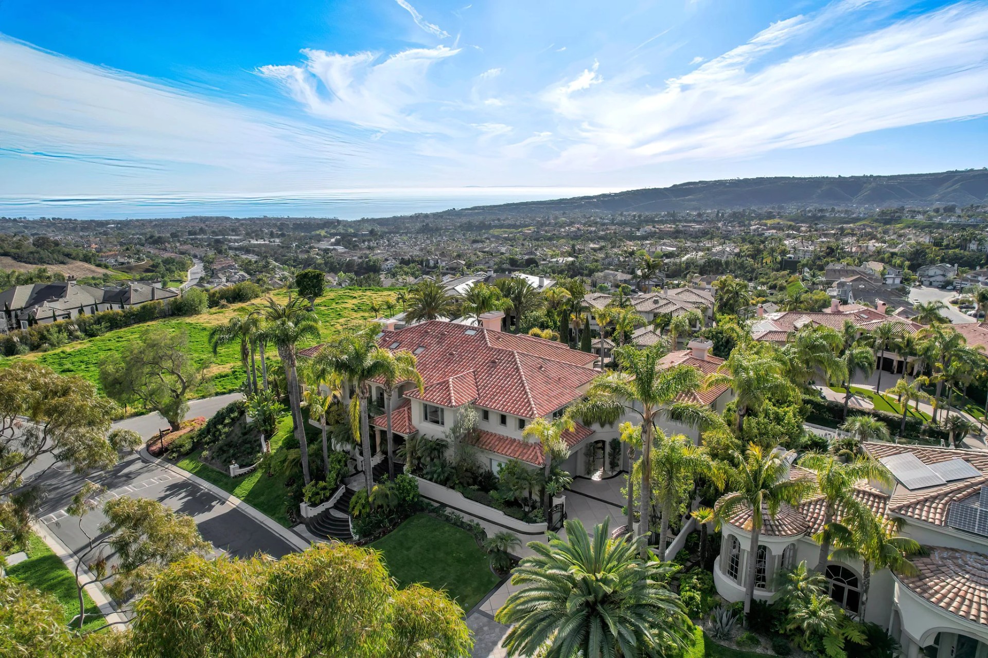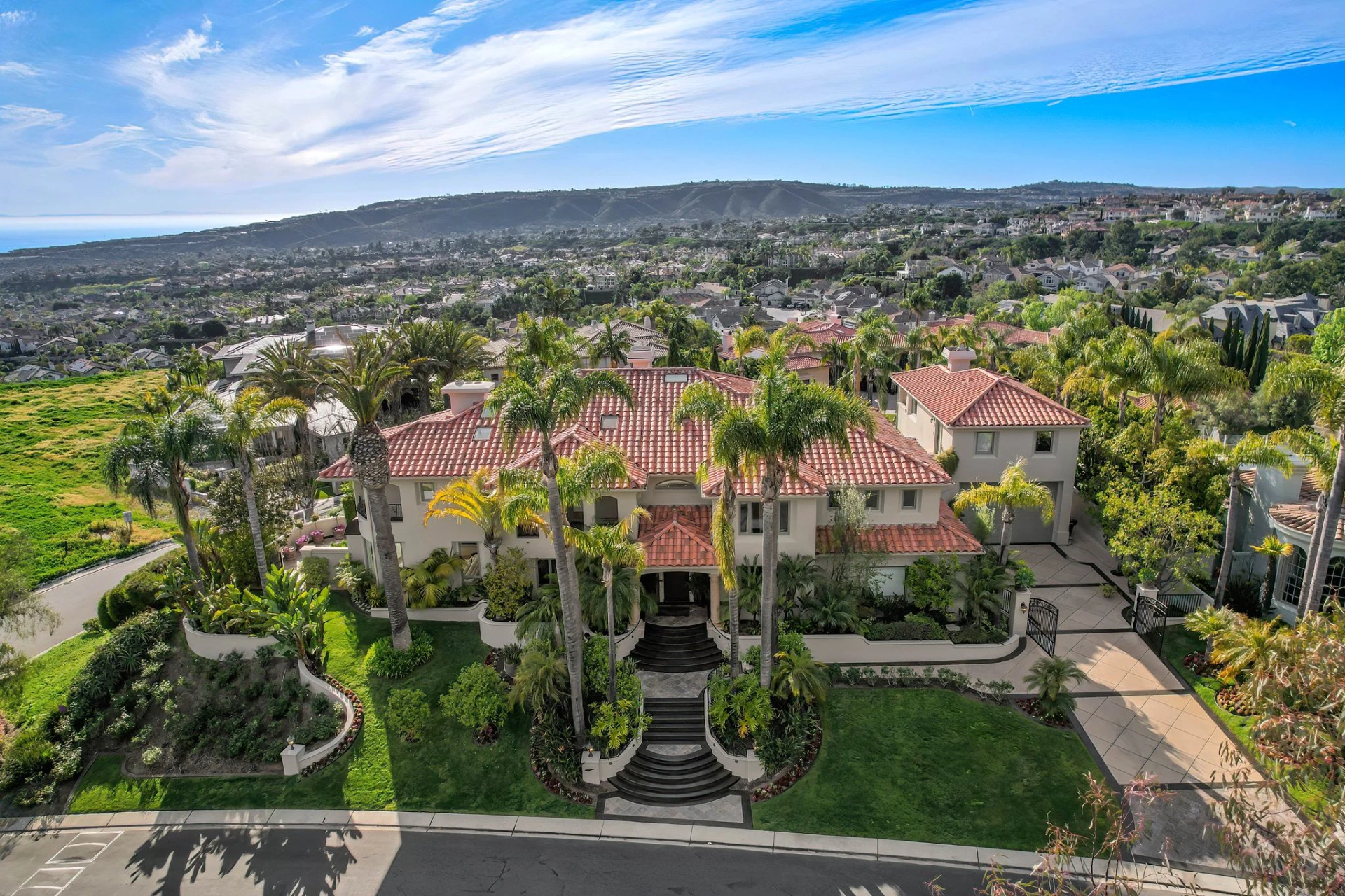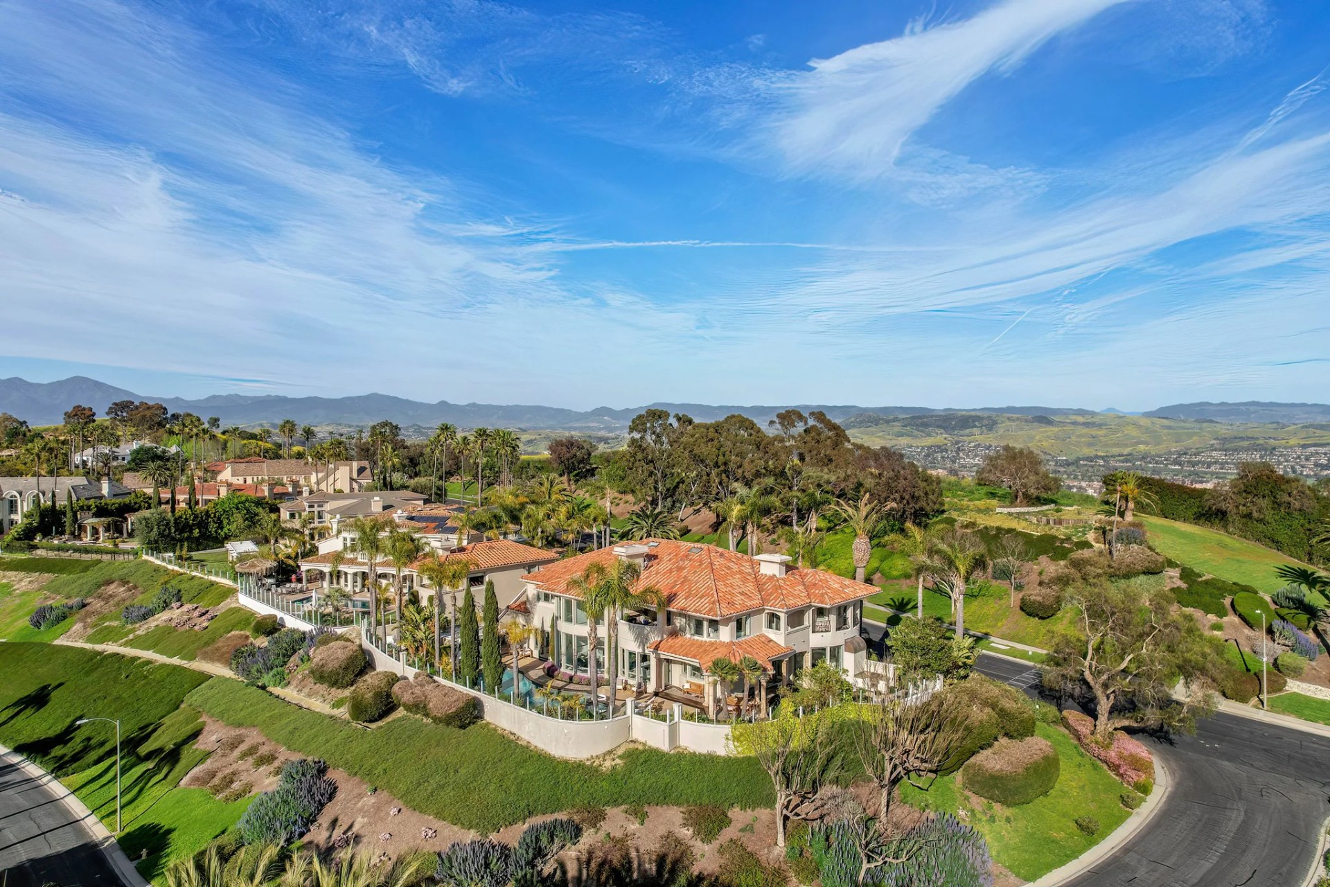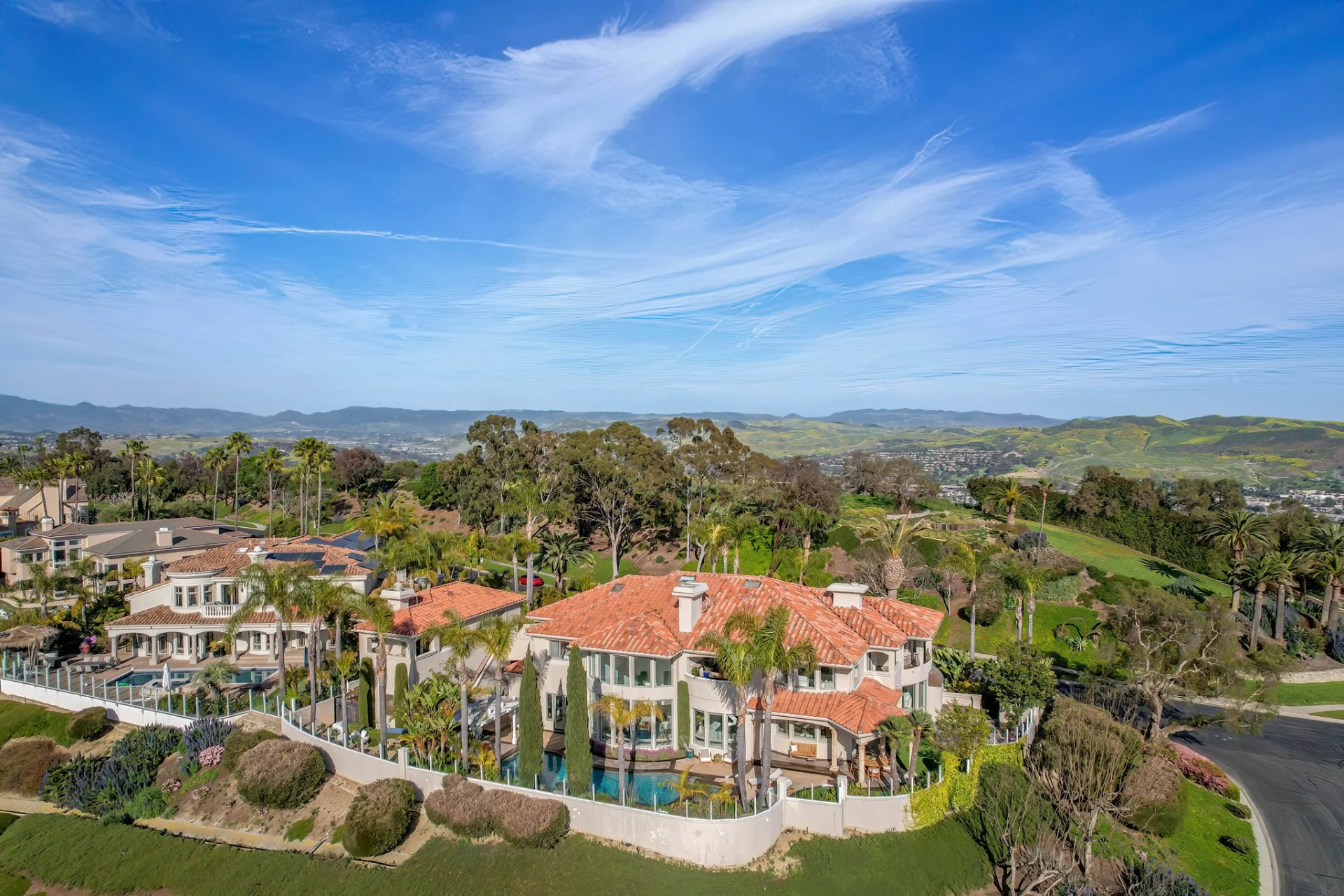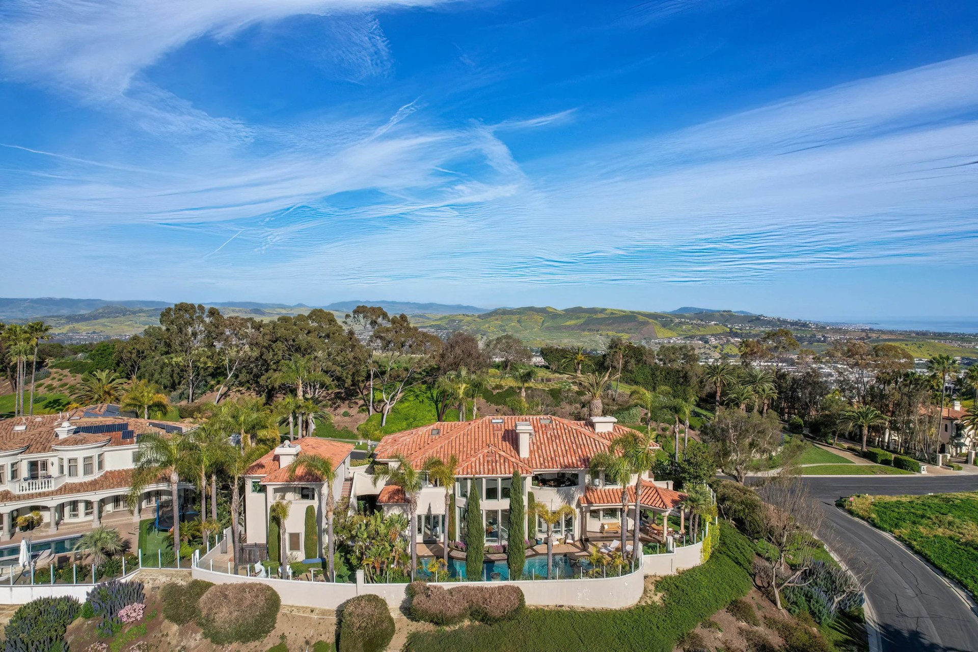 Located within the prestigious Bear Brand Ranch community in Laguna Niguel, this 7,500+ sq. ft. home sits on an expansive corner lot with views of Pacific Ocean and boasts 6 beds, 8 baths, and every amenity imaginable. Upon entrance, the foyer features a double-height ceiling, wrought iron chandelier and railings, and a grand hardwood curving staircase. The living room, also with a double-height ceiling, has an abundance of light thanks to a wall of windows overlooking the sparkling pool. The elegant dining room has a two-sided fireplace, shared with the adjacent living room, large windows with views of the pool, and a modern glass chandelier. The chef’s kitchen comes with SubZero and Wolf appliances, beautiful tile backsplash, sleek white cabinetry with Crystalo quartzite counters, and a large center island with breakfast bar. The cozy family room is bright and airy and comes with a double-sided fireplace and a bar - which is shared with the billiard room with bar seating. An ensuite guest bedroom and a gorgeous office with custom wood paneling and coffered ceiling complete this main level. The primary suite is a luxurious retreat with high vaulted ceilings, chandelier, large windows, double- sided fireplace, massive walk-in closet, and a private covered terrace with fireplace and ocean views. The spacious spa-like bathroom boasts dual sinks and vanity with marble countertops, a free-standing soaking tub, walk-in shower, and fireplace. Three additional ensuite bedrooms can be found on this level. Above the garage, you’ll find a spacious casita with vaulted ceilings and exposed wood beams, sink, mini-fridge, and a full bathroom. The expansive backyard is perfect for either a peaceful retreat or for entertaining guests. This space offers multiple covered seating/eating areas, pool and spa, and an outdoor BBQ. A fully equipped gym (located in the RV garage) and a 5-car garage complete this unique offering. Property is located near excellent public and private schools, shops, restaurants, hiking/biking trails, and world-class beaches.