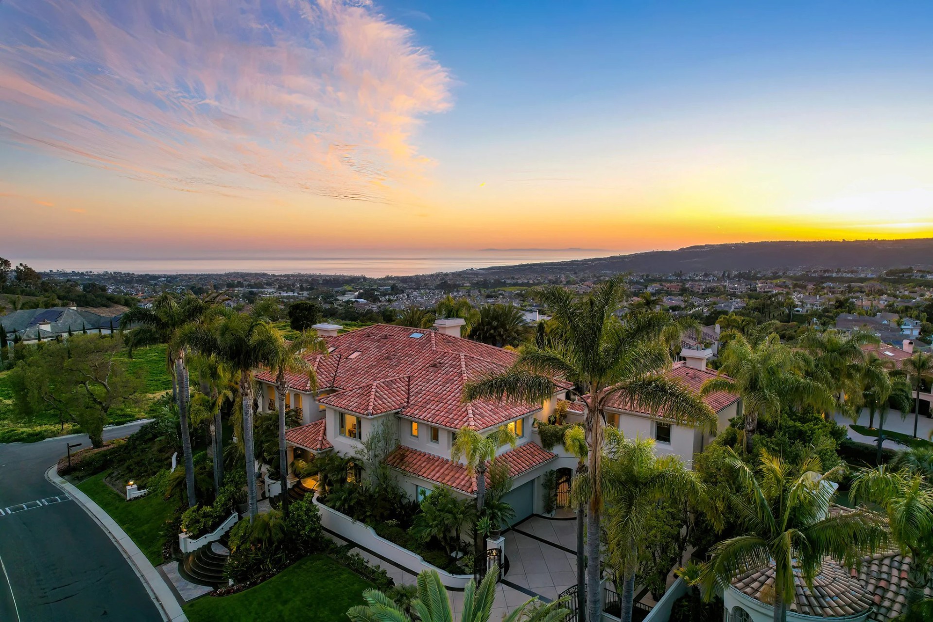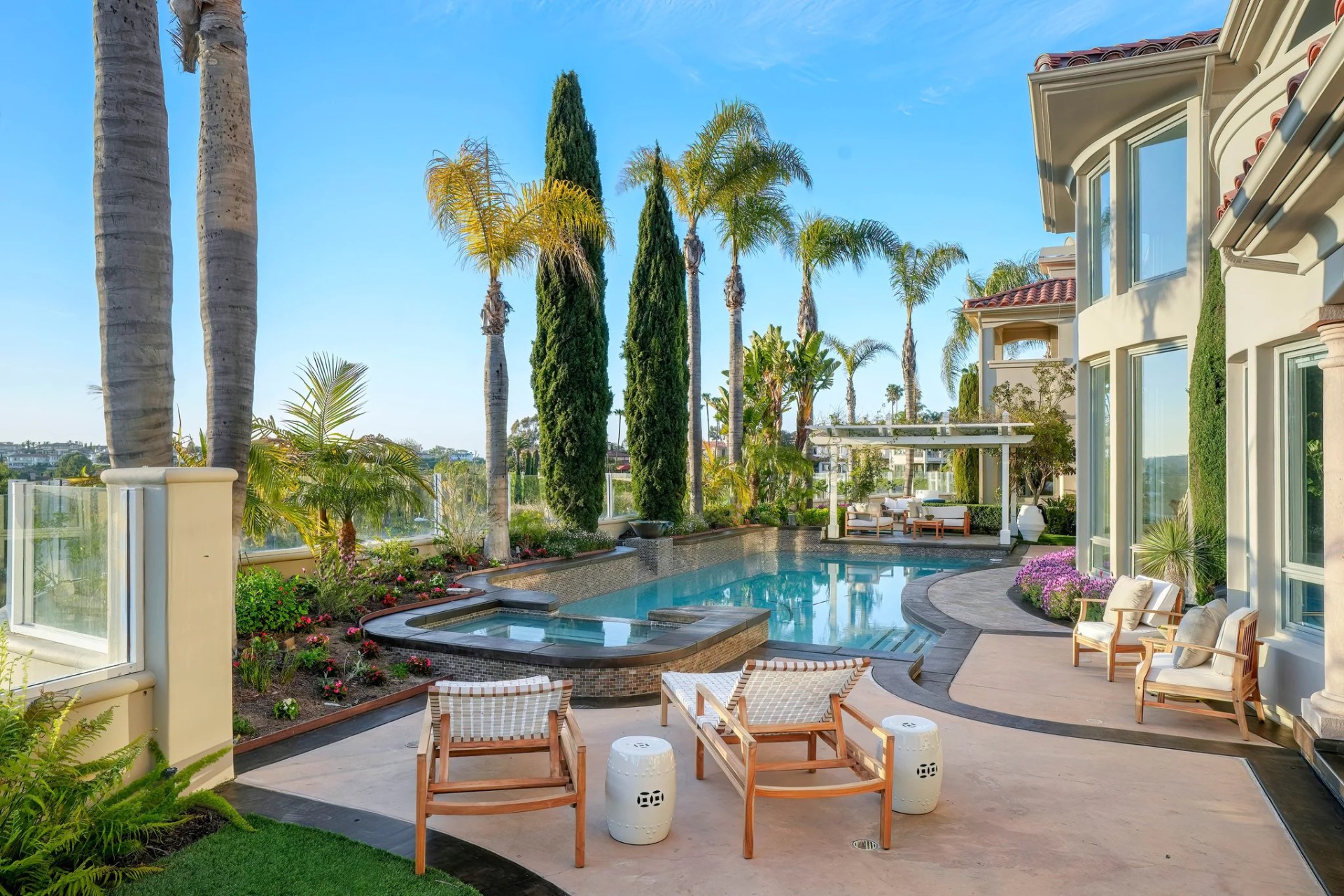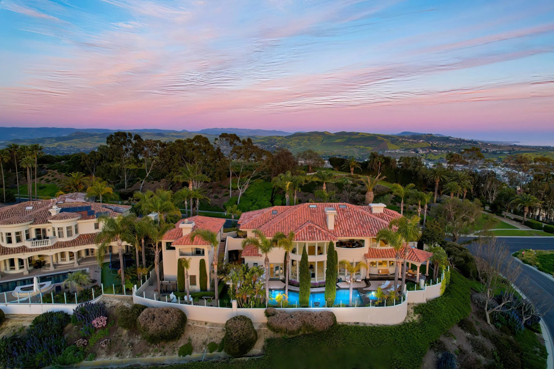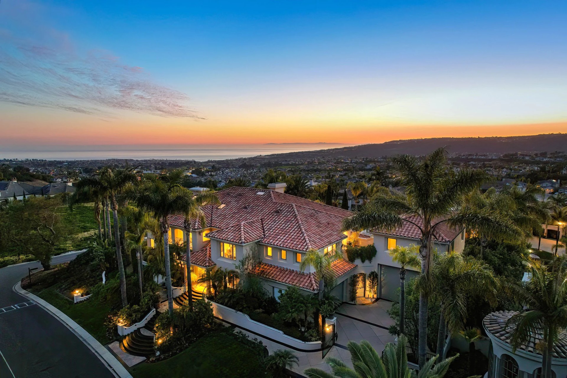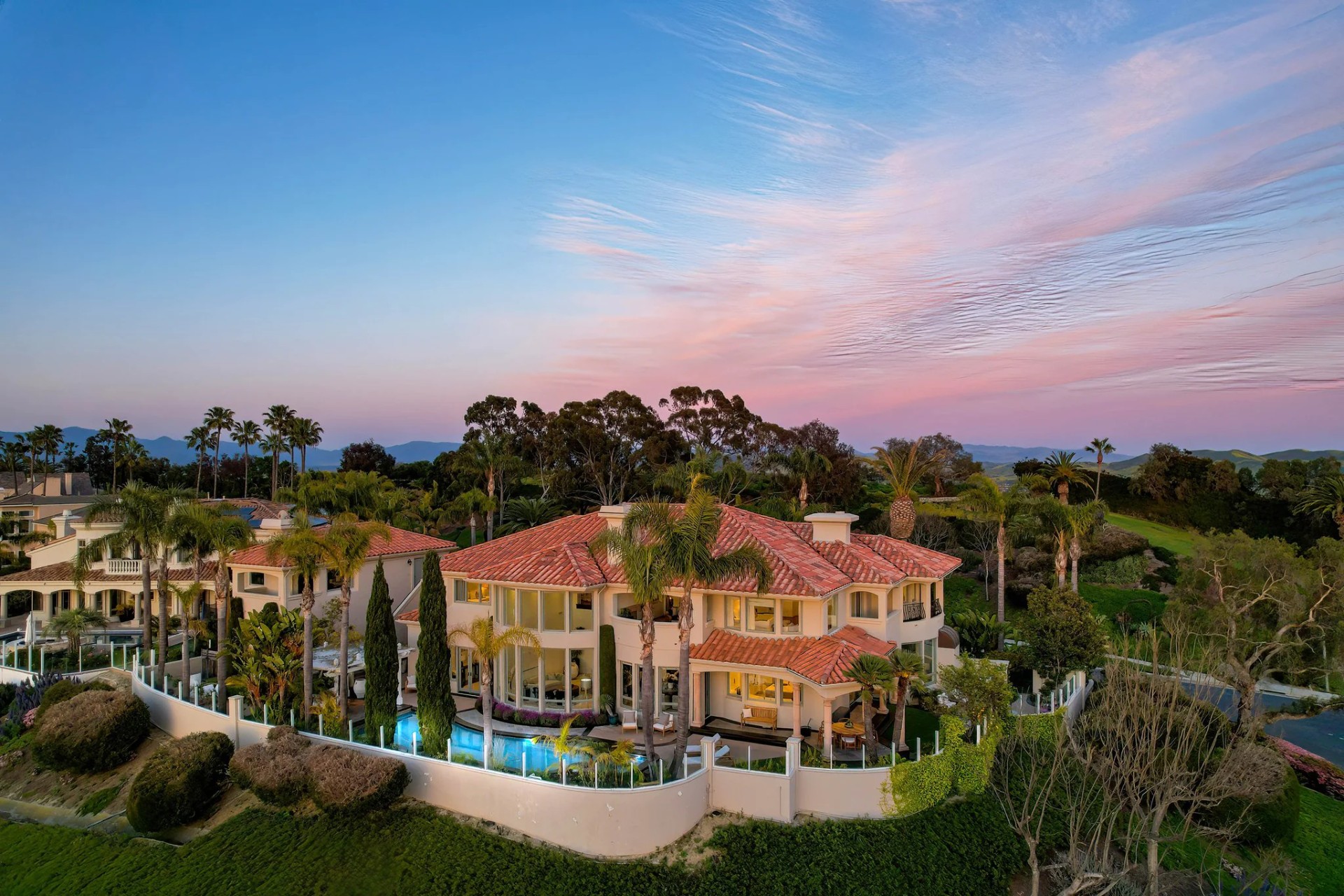 Located within the prestigious Bear Brand Ranch community in Laguna Niguel, this 7,500+ sq. ft. home sits on an expansive corner lot with views of Pacific Ocean and boasts 6 beds, 8 baths, and every amenity imaginable. Upon entrance, the foyer features a double-height ceiling, wrought iron chandelier and railings, and a grand hardwood curving staircase. The living room, also with a double-height ceiling, has an abundance of light thanks to a wall of windows overlooking the sparkling pool. The elegant dining room has a two-sided fireplace, shared with the adjacent living room, large windows with views of the pool, and a modern glass chandelier. The chef’s kitchen comes with SubZero and Wolf appliances, beautiful tile backsplash, sleek white cabinetry with Crystalo quartzite counters, and a large center island with breakfast bar. The cozy family room is bright and airy and comes with a double-sided fireplace and a bar - which is shared with the billiard room with bar seating. An ensuite guest bedroom and a gorgeous office with custom wood paneling and coffered ceiling complete this main level. The primary suite is a luxurious retreat with high vaulted ceilings, chandelier, large windows, double- sided fireplace, massive walk-in closet, and a private covered terrace with fireplace and ocean views. The spacious spa-like bathroom boasts dual sinks and vanity with marble countertops, a free-standing soaking tub, walk-in shower, and fireplace. Three additional ensuite bedrooms can be found on this level. Above the garage, you’ll find a spacious casita with vaulted ceilings and exposed wood beams, sink, mini-fridge, and a full bathroom. The expansive backyard is perfect for either a peaceful retreat or for entertaining guests. This space offers multiple covered seating/eating areas, pool and spa, and an outdoor BBQ. A fully equipped gym (located in the RV garage) and a 5-car garage complete this unique offering. Property is located near excellent public and private schools, shops, restaurants, hiking/biking trails, and world-class beaches.