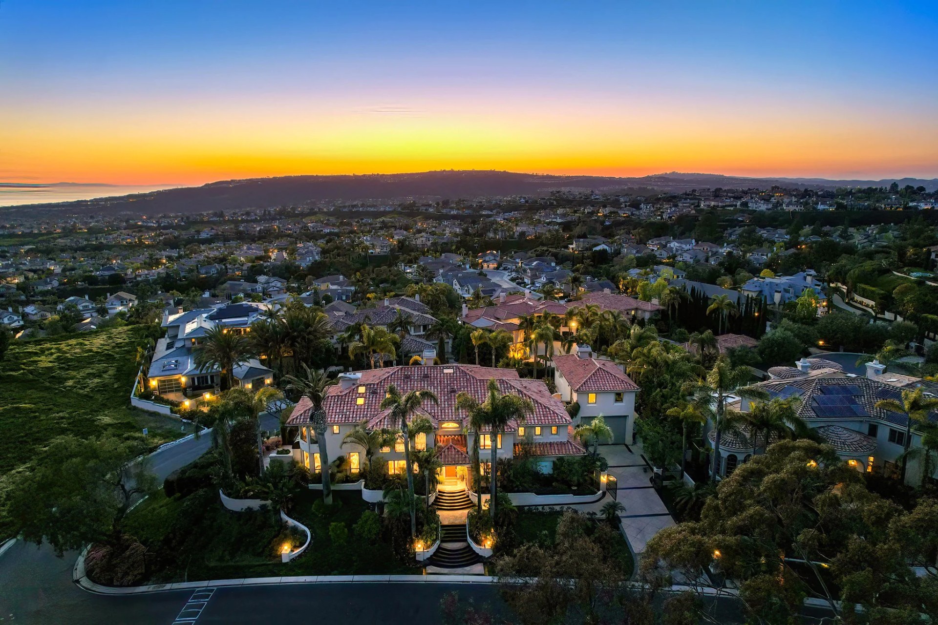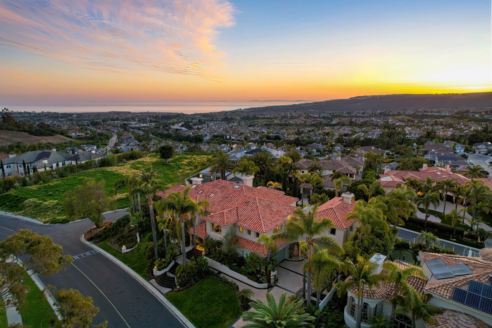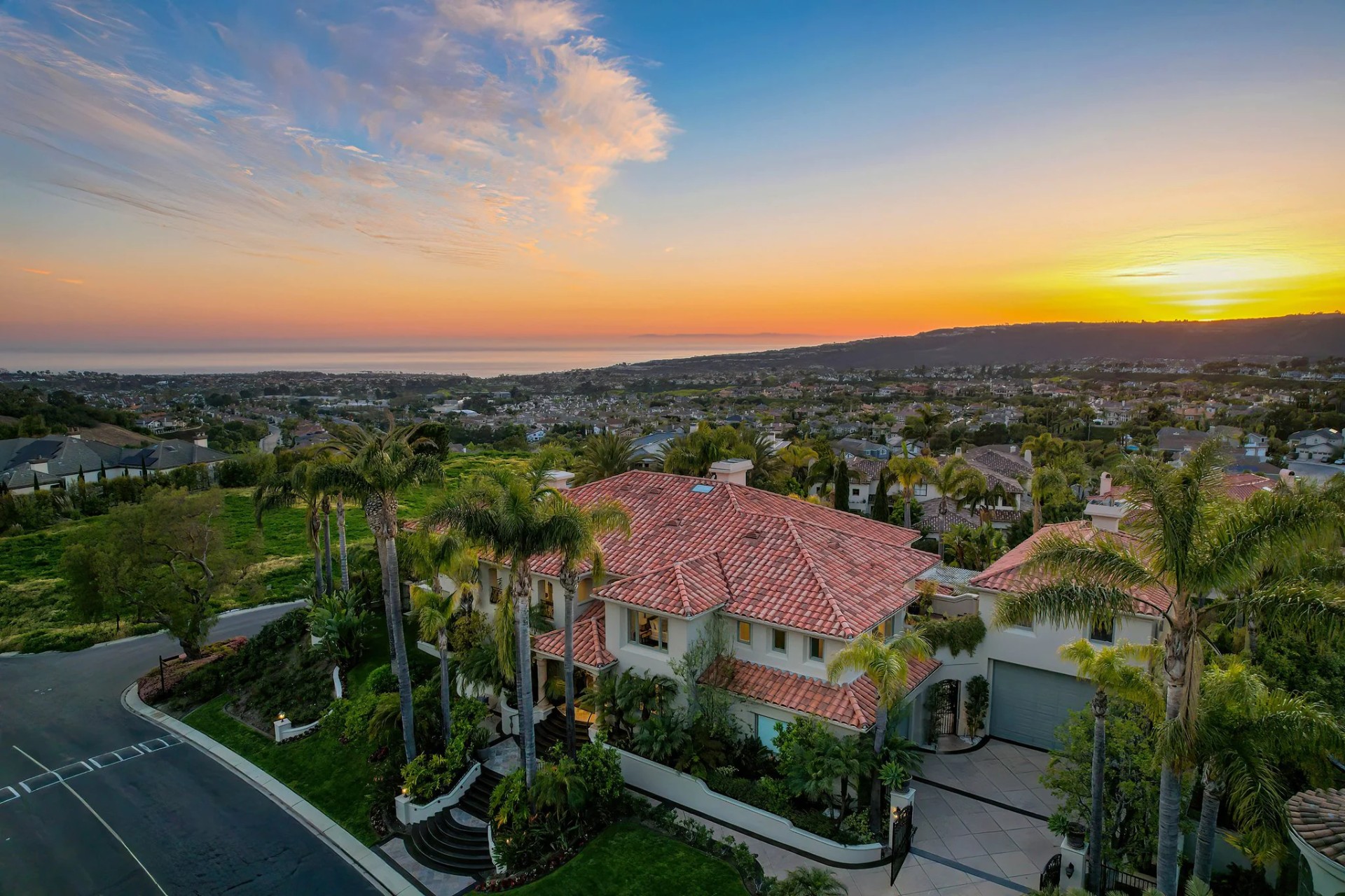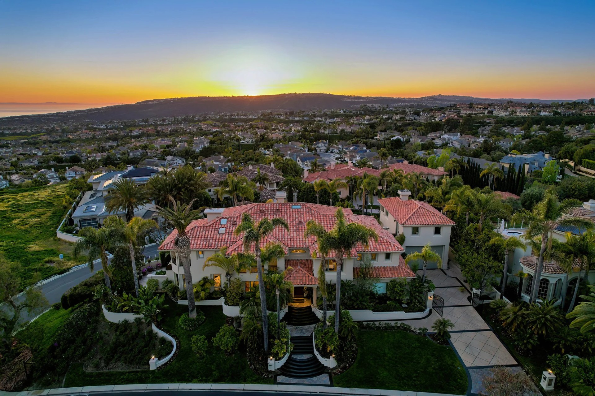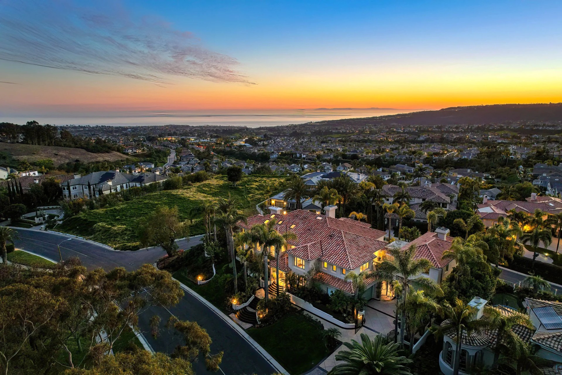 Located within the prestigious Bear Brand Ranch community in Laguna Niguel, this 7,500+ sq. ft. home sits on an expansive corner lot with views of Pacific Ocean and boasts 6 beds, 8 baths, and every amenity imaginable. Upon entrance, the foyer features a double-height ceiling, wrought iron chandelier and railings, and a grand hardwood curving staircase. The living room, also with a double-height ceiling, has an abundance of light thanks to a wall of windows overlooking the sparkling pool. The elegant dining room has a two-sided fireplace, shared with the adjacent living room, large windows with views of the pool, and a modern glass chandelier. The chef’s kitchen comes with SubZero and Wolf appliances, beautiful tile backsplash, sleek white cabinetry with Crystalo quartzite counters, and a large center island with breakfast bar. The cozy family room is bright and airy and comes with a double-sided fireplace and a bar - which is shared with the billiard room with bar seating. An ensuite guest bedroom and a gorgeous office with custom wood paneling and coffered ceiling complete this main level. The primary suite is a luxurious retreat with high vaulted ceilings, chandelier, large windows, double- sided fireplace, massive walk-in closet, and a private covered terrace with fireplace and ocean views. The spacious spa-like bathroom boasts dual sinks and vanity with marble countertops, a free-standing soaking tub, walk-in shower, and fireplace. Three additional ensuite bedrooms can be found on this level. Above the garage, you’ll find a spacious casita with vaulted ceilings and exposed wood beams, sink, mini-fridge, and a full bathroom. The expansive backyard is perfect for either a peaceful retreat or for entertaining guests. This space offers multiple covered seating/eating areas, pool and spa, and an outdoor BBQ. A fully equipped gym (located in the RV garage) and a 5-car garage complete this unique offering. Property is located near excellent public and private schools, shops, restaurants, hiking/biking trails, and world-class beaches.