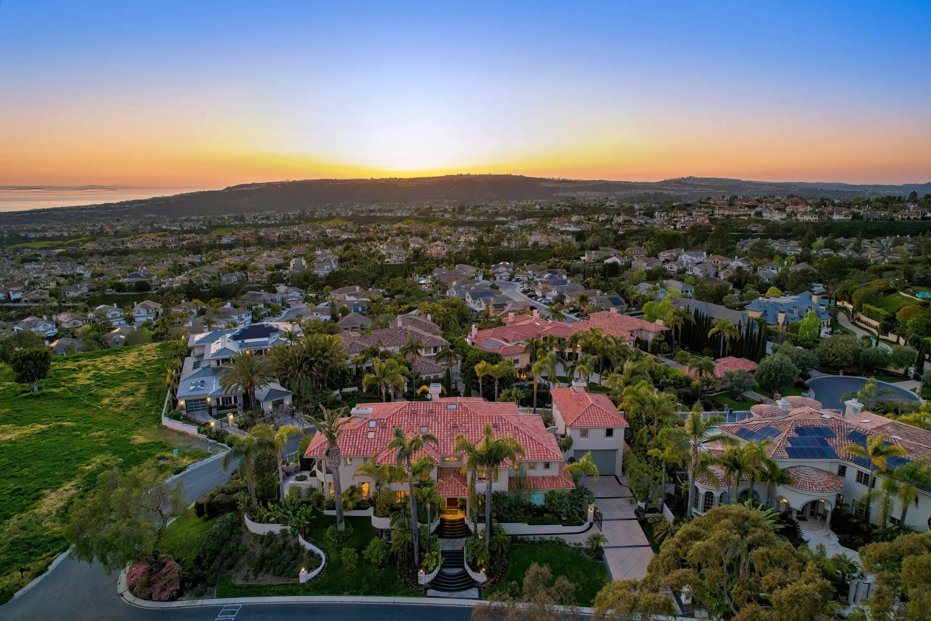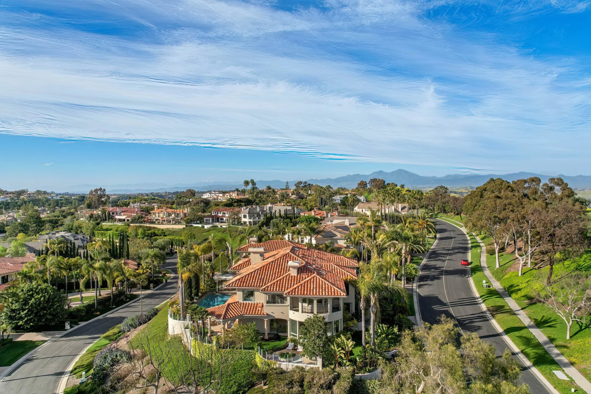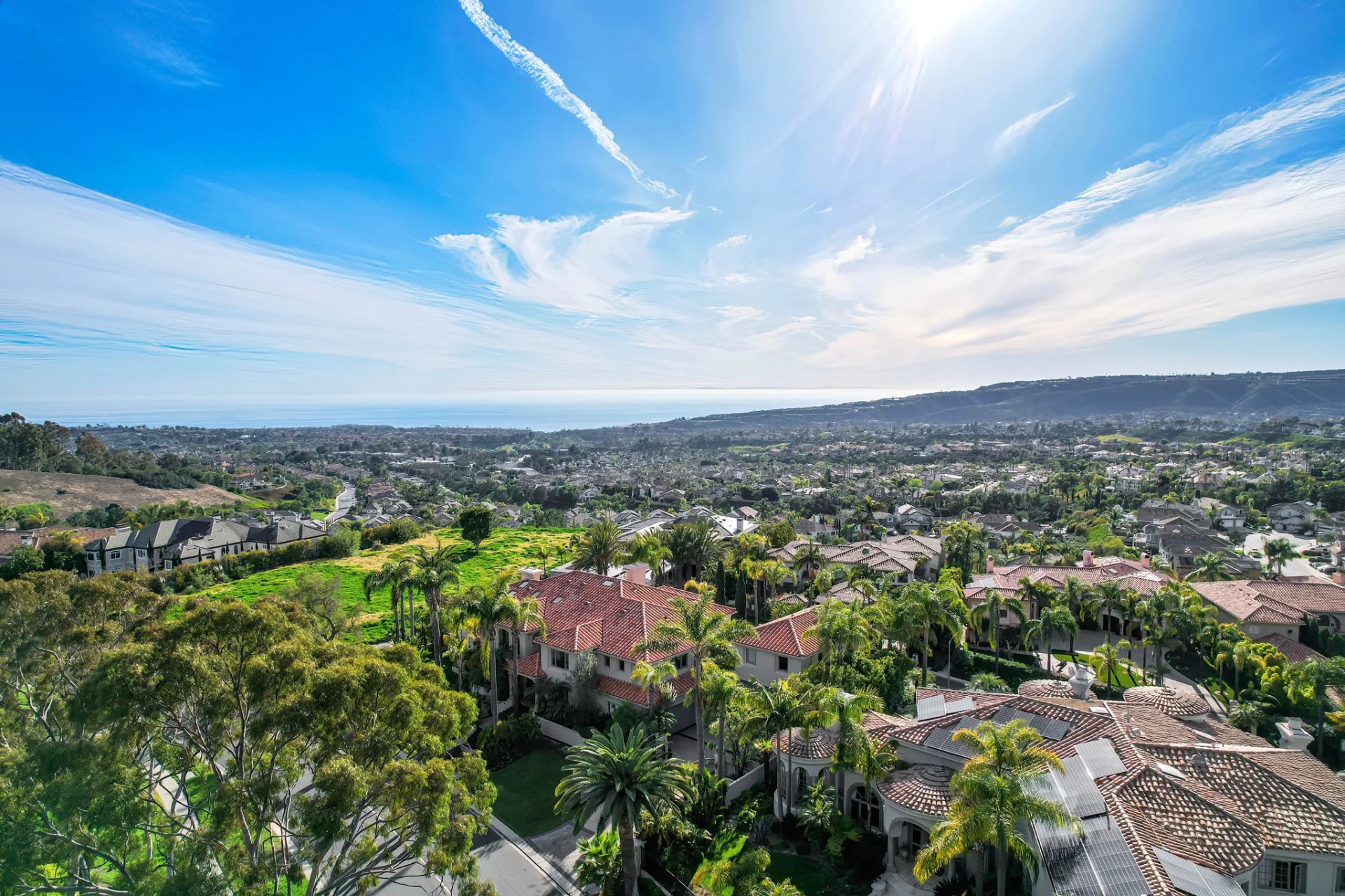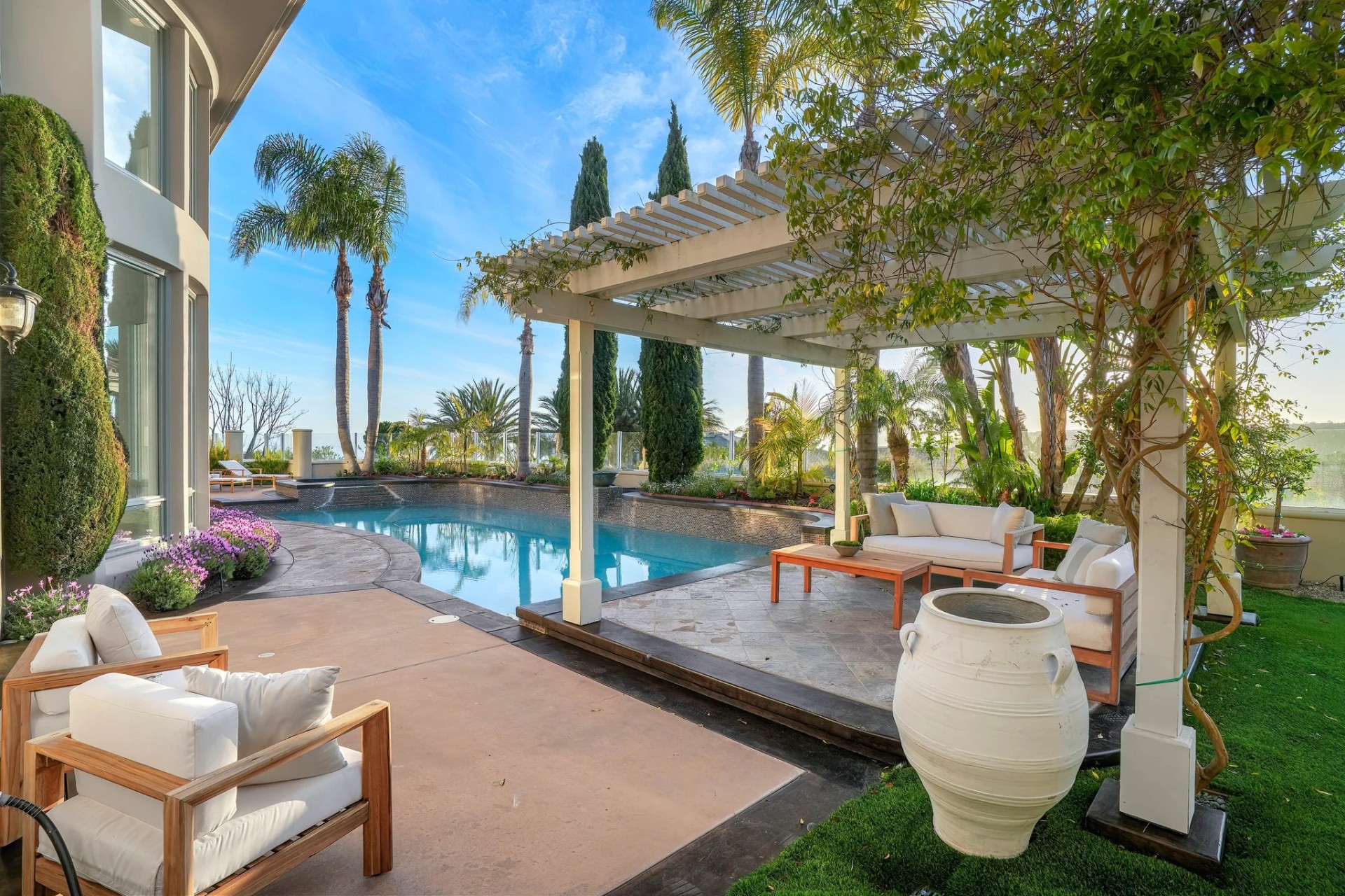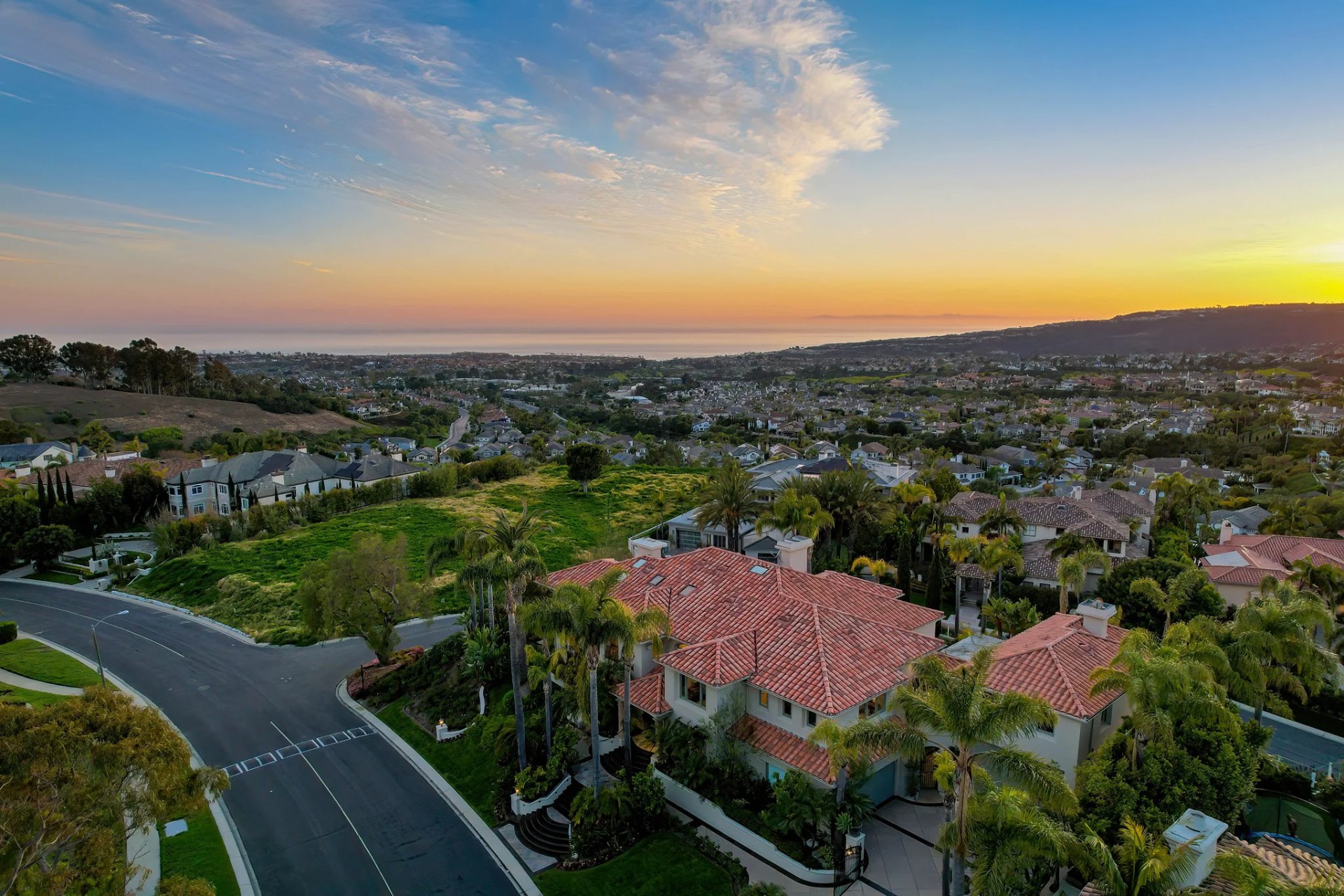 Located within the prestigious Bear Brand Ranch community in Laguna Niguel, this 7,500+ sq. ft. home sits on an expansive corner lot with views of Pacific Ocean and boasts 6 beds, 8 baths, and every amenity imaginable. Upon entrance, the foyer features a double-height ceiling, wrought iron chandelier and railings, and a grand hardwood curving staircase. The living room, also with a double-height ceiling, has an abundance of light thanks to a wall of windows overlooking the sparkling pool. The elegant dining room has a two-sided fireplace, shared with the adjacent living room, large windows with views of the pool, and a modern glass chandelier. The chef’s kitchen comes with SubZero and Wolf appliances, beautiful tile backsplash, sleek white cabinetry with Crystalo quartzite counters, and a large center island with breakfast bar. The cozy family room is bright and airy and comes with a double-sided fireplace and a bar - which is shared with the billiard room with bar seating. An ensuite guest bedroom and a gorgeous office with custom wood paneling and coffered ceiling complete this main level. The primary suite is a luxurious retreat with high vaulted ceilings, chandelier, large windows, double- sided fireplace, massive walk-in closet, and a private covered terrace with fireplace and ocean views. The spacious spa-like bathroom boasts dual sinks and vanity with marble countertops, a free-standing soaking tub, walk-in shower, and fireplace. Three additional ensuite bedrooms can be found on this level. Above the garage, you’ll find a spacious casita with vaulted ceilings and exposed wood beams, sink, mini-fridge, and a full bathroom. The expansive backyard is perfect for either a peaceful retreat or for entertaining guests. This space offers multiple covered seating/eating areas, pool and spa, and an outdoor BBQ. A fully equipped gym (located in the RV garage) and a 5-car garage complete this unique offering. Property is located near excellent public and private schools, shops, restaurants, hiking/biking trails, and world-class beaches.