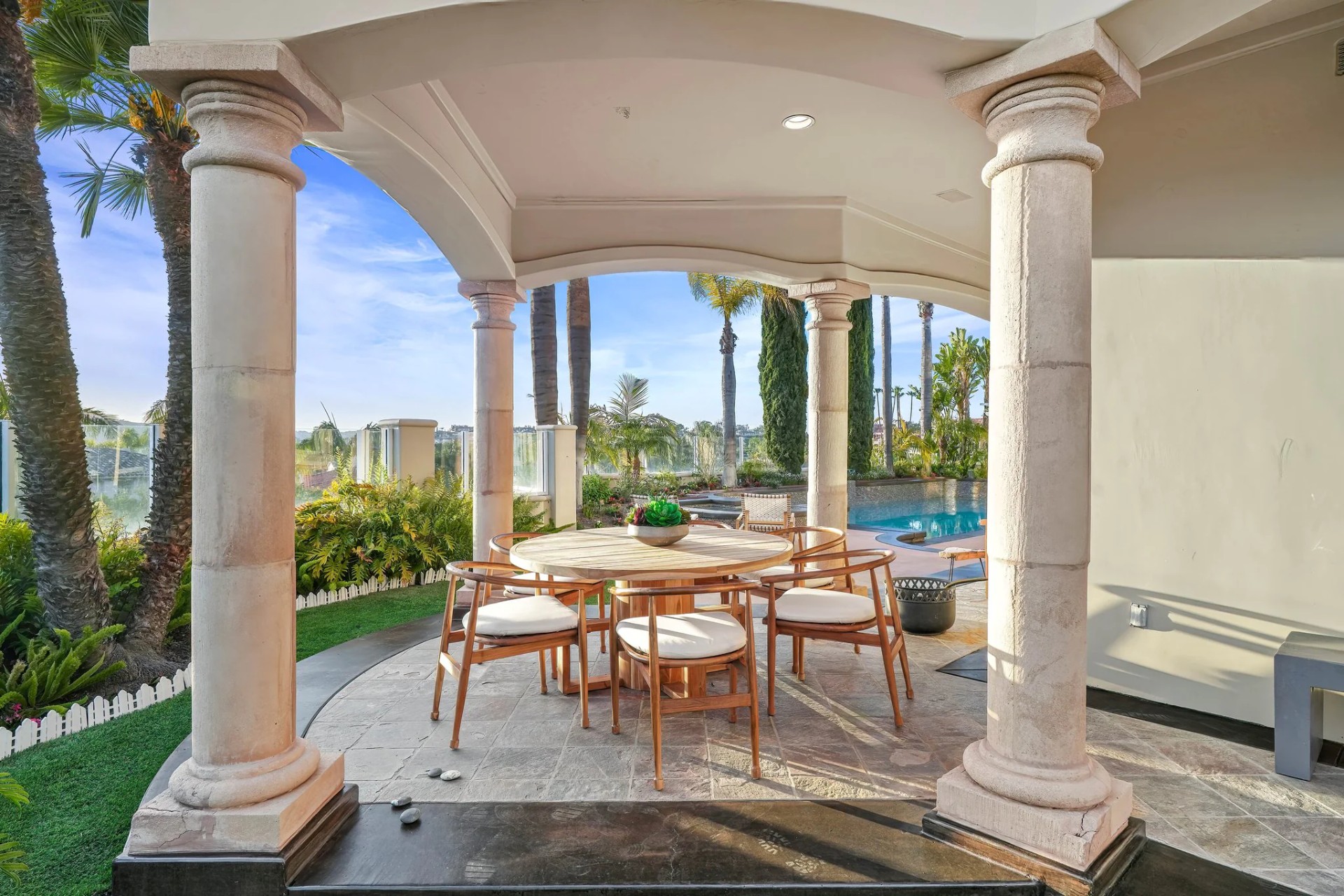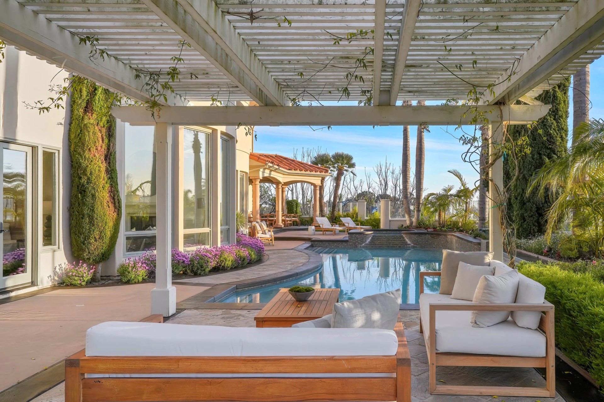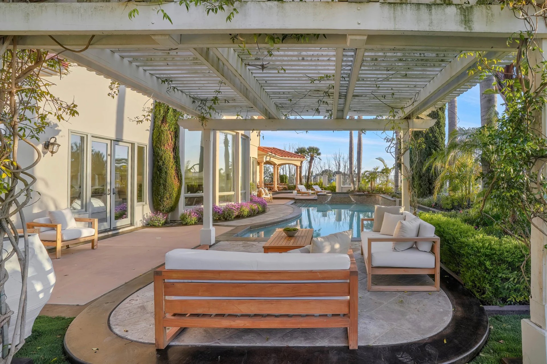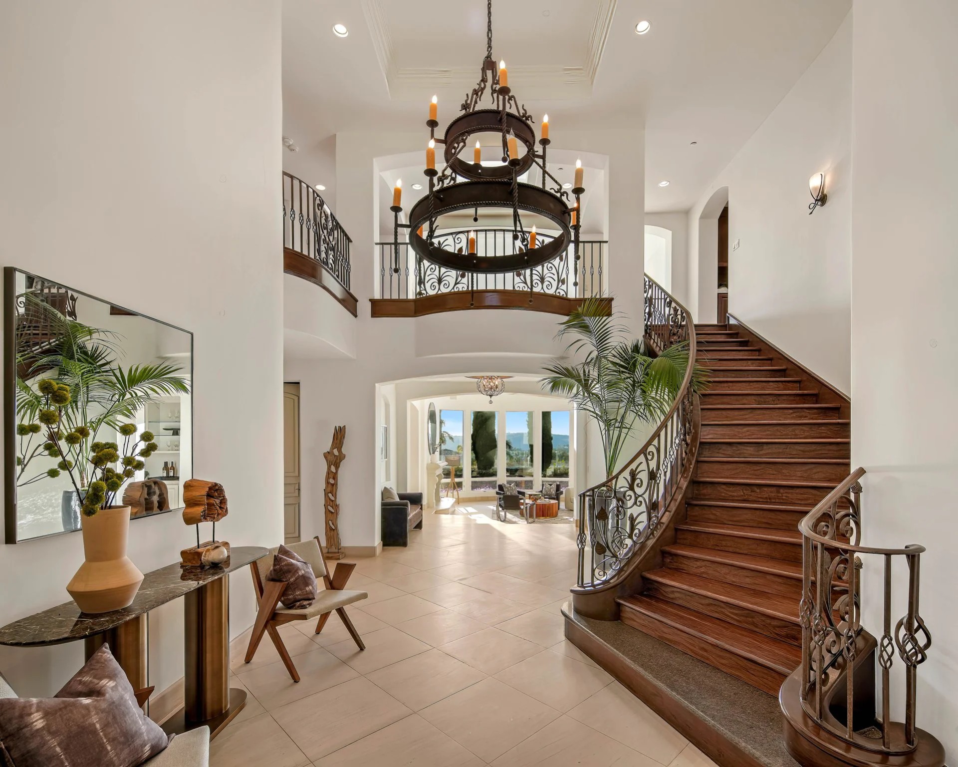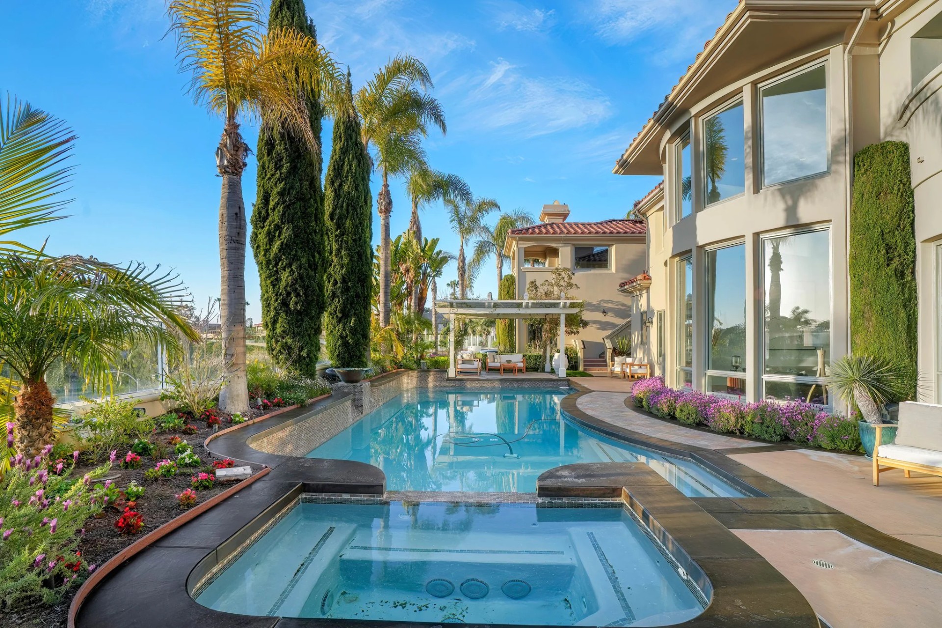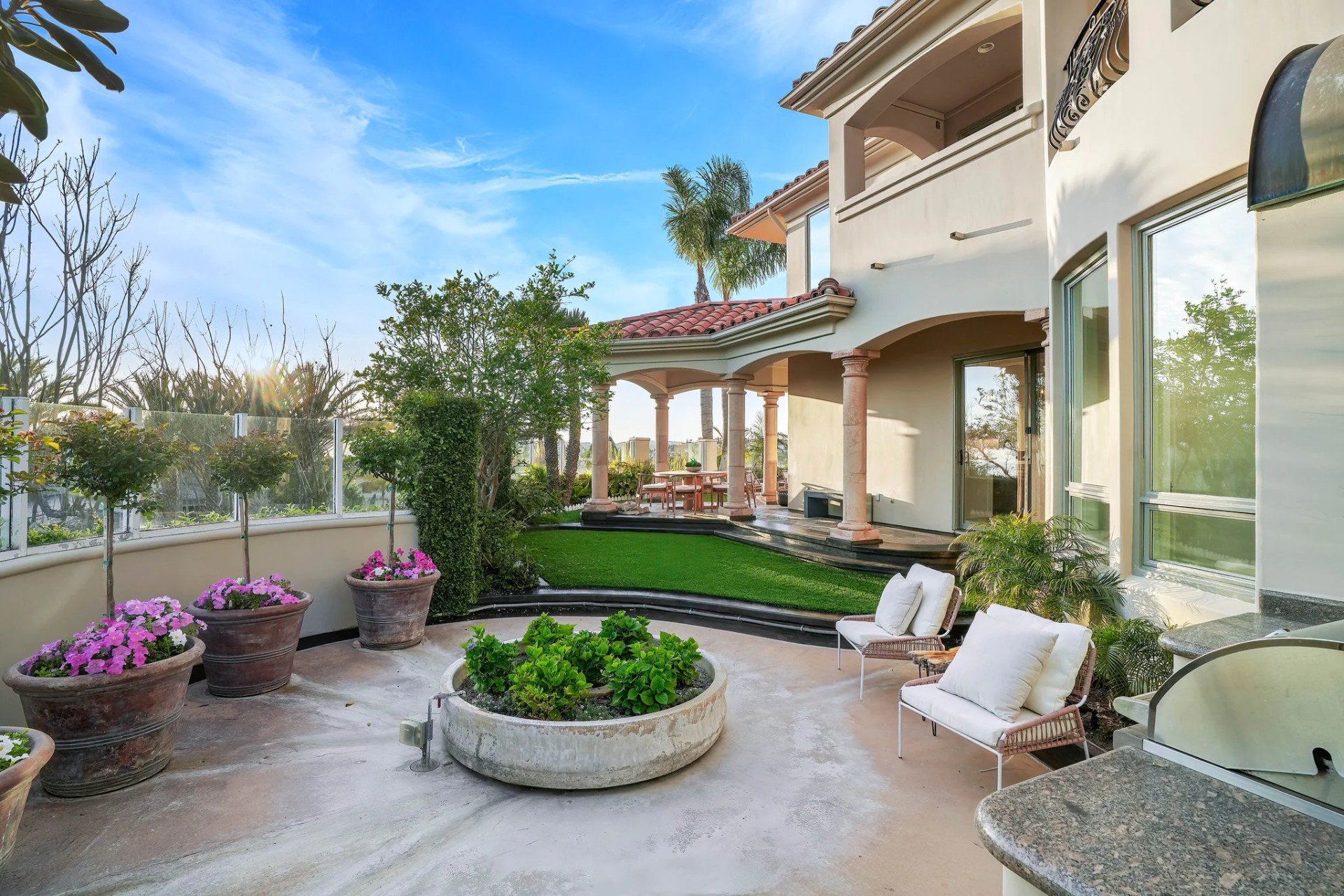 Located within the prestigious Bear Brand Ranch community in Laguna Niguel, this 7,500+ sq. ft. home sits on an expansive corner lot with views of Pacific Ocean and boasts 6 beds, 8 baths, and every amenity imaginable. Upon entrance, the foyer features a double-height ceiling, wrought iron chandelier and railings, and a grand hardwood curving staircase. The living room, also with a double-height ceiling, has an abundance of light thanks to a wall of windows overlooking the sparkling pool. The elegant dining room has a two-sided fireplace, shared with the adjacent living room, large windows with views of the pool, and a modern glass chandelier. The chef’s kitchen comes with SubZero and Wolf appliances, beautiful tile backsplash, sleek white cabinetry with Crystalo quartzite counters, and a large center island with breakfast bar. The cozy family room is bright and airy and comes with a double-sided fireplace and a bar - which is shared with the billiard room with bar seating. An ensuite guest bedroom and a gorgeous office with custom wood paneling and coffered ceiling complete this main level. The primary suite is a luxurious retreat with high vaulted ceilings, chandelier, large windows, double- sided fireplace, massive walk-in closet, and a private covered terrace with fireplace and ocean views. The spacious spa-like bathroom boasts dual sinks and vanity with marble countertops, a free-standing soaking tub, walk-in shower, and fireplace. Three additional ensuite bedrooms can be found on this level. Above the garage, you’ll find a spacious casita with vaulted ceilings and exposed wood beams, sink, mini-fridge, and a full bathroom. The expansive backyard is perfect for either a peaceful retreat or for entertaining guests. This space offers multiple covered seating/eating areas, pool and spa, and an outdoor BBQ. A fully equipped gym (located in the RV garage) and a 5-car garage complete this unique offering. Property is located near excellent public and private schools, shops, restaurants, hiking/biking trails, and world-class beaches.