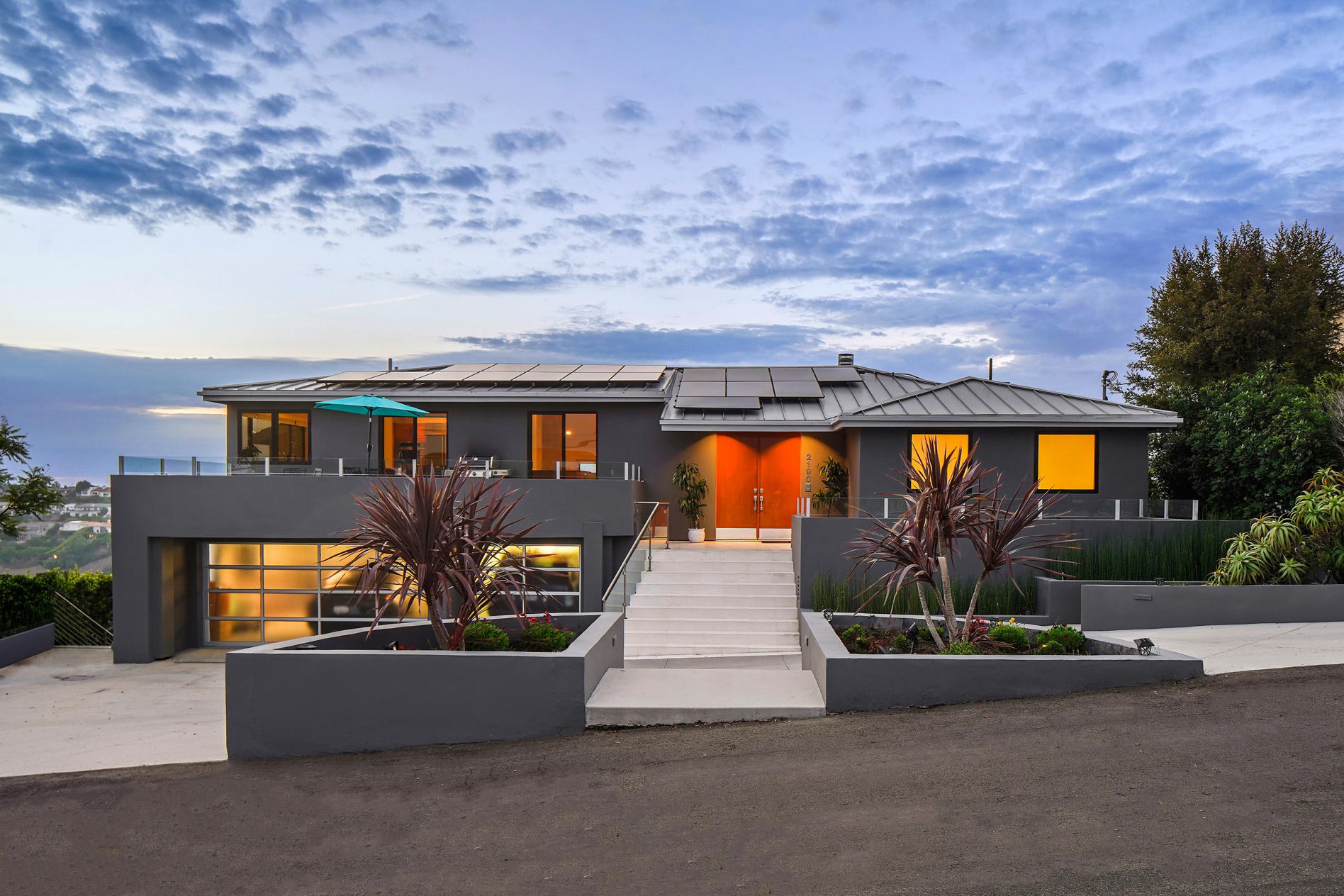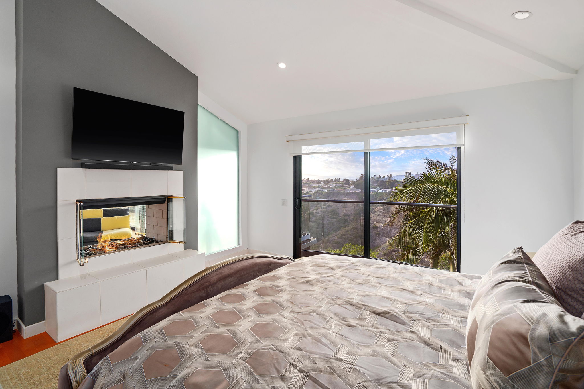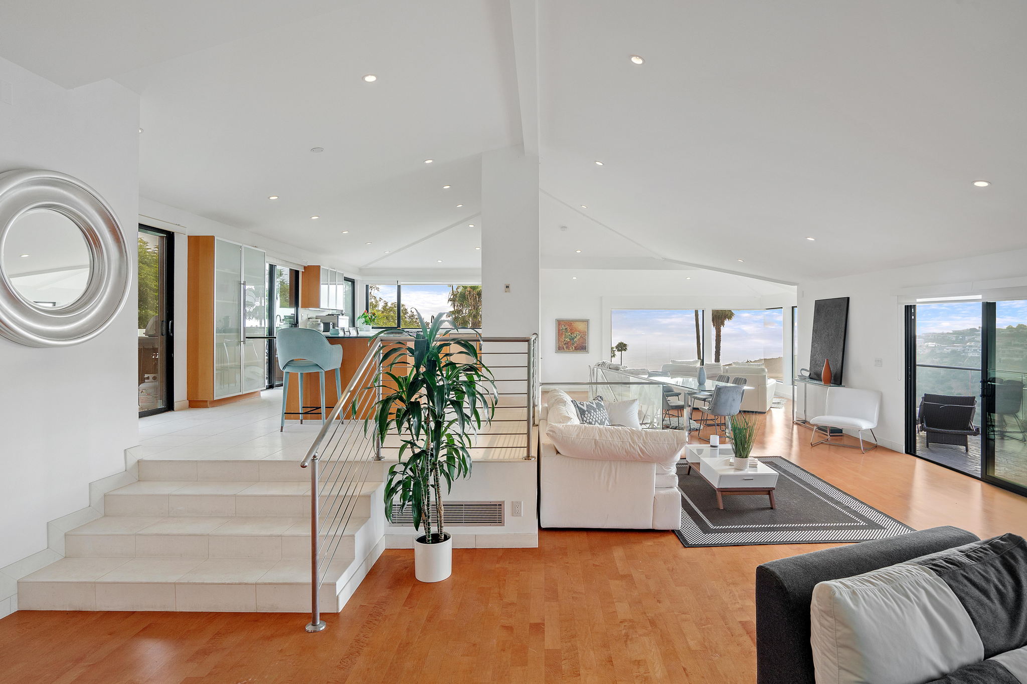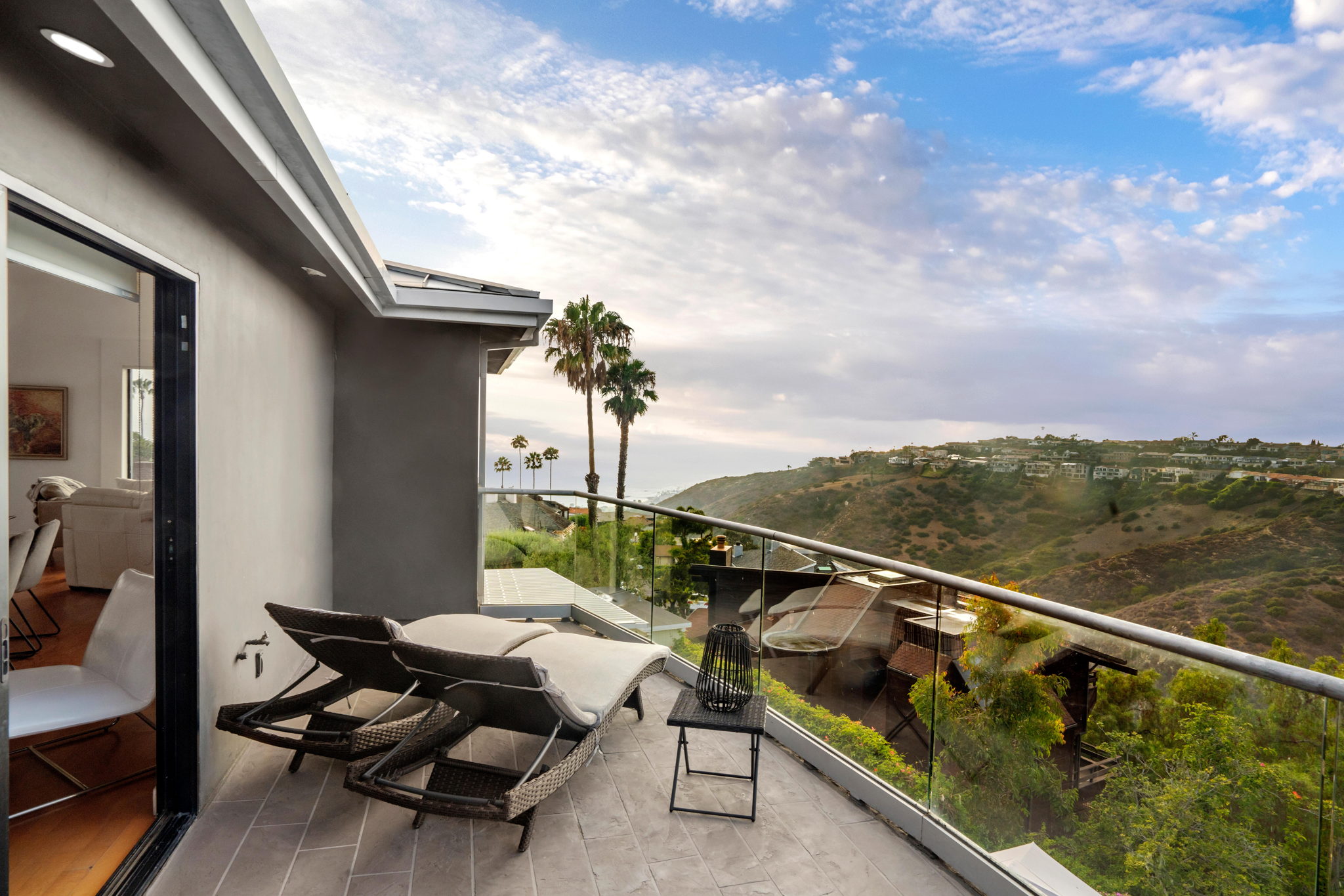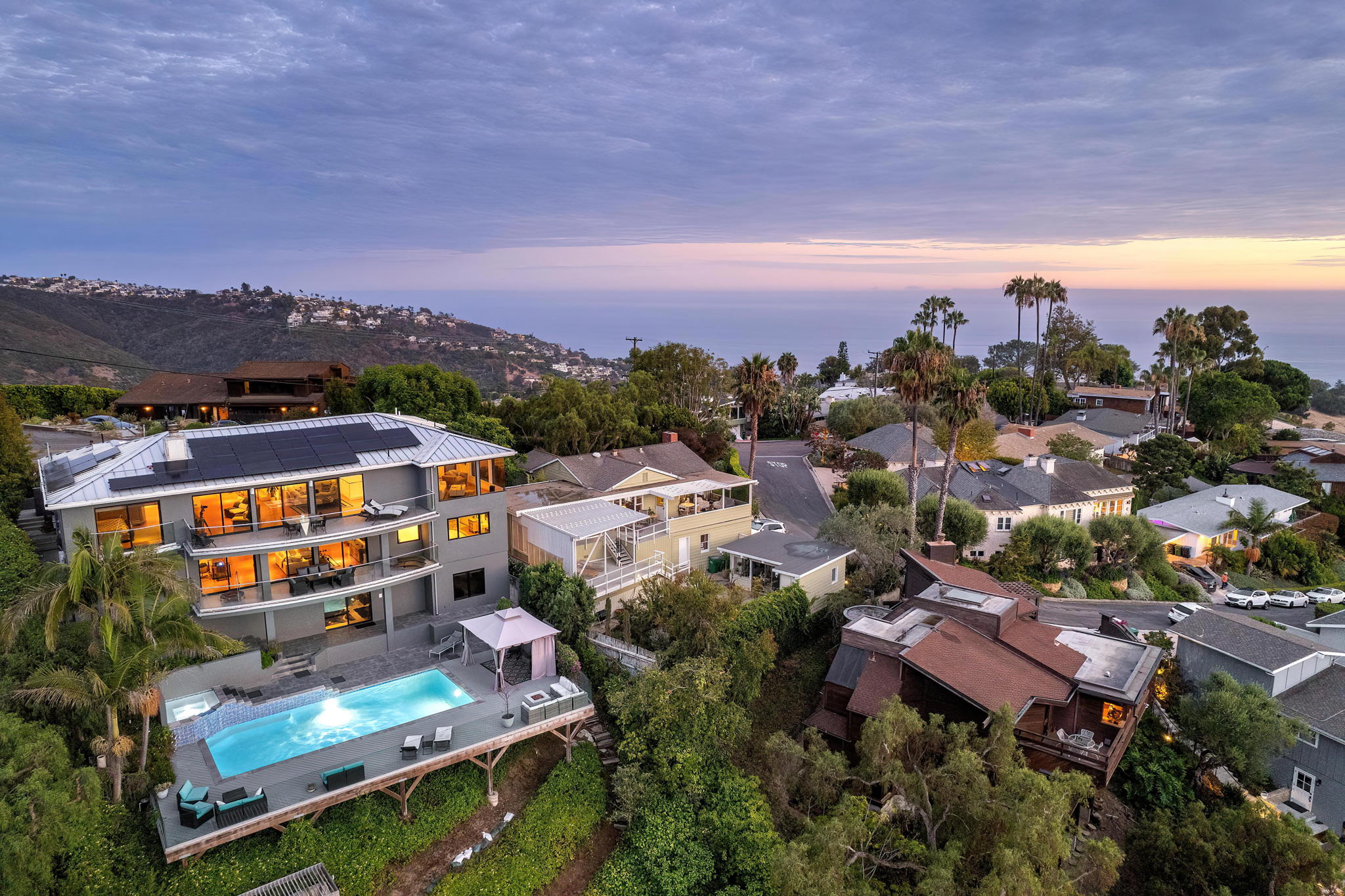 This contemporary private retreat, nestled in the serene area of Temple Hills, boasts unobstructed views of ocean and canyon. Natural lighting and ocean breeze flows throughout the home with its open floor plan and vaulted ceilings. The main level includes a formal living room with fireplace, formal dining room, sitting area, full kitchen, and luxurious owner suite with fireplace and access to a full-size deck. Down a short flight of stairs, the second level features a family room, two en-suite bedrooms, full-size sauna, exercise room, laundry room, an additional deck, and tons of storage space. The lowest level highlights a mother-in-law suite with an open kitchen and living space. The private backyard is ideal for entertainment and relaxation, with a poolside cabana, renovated salt water pool, and spa, all overlooking the breathtaking views. An oversized three-car garage and circular driveway with plenty of space for multiple additional cars complete this one-of-a-kind home, perfect for those who are looking for a modern hideaway in the hills of Laguna Beach.