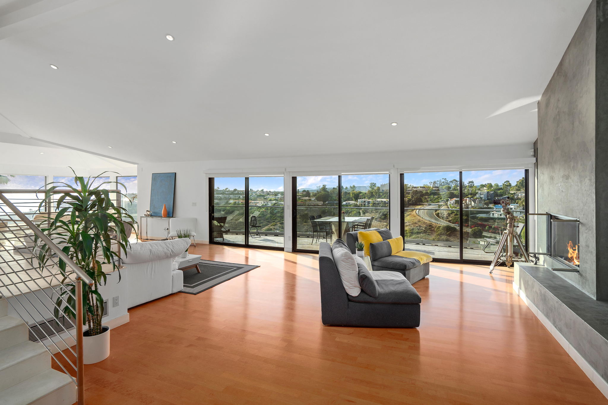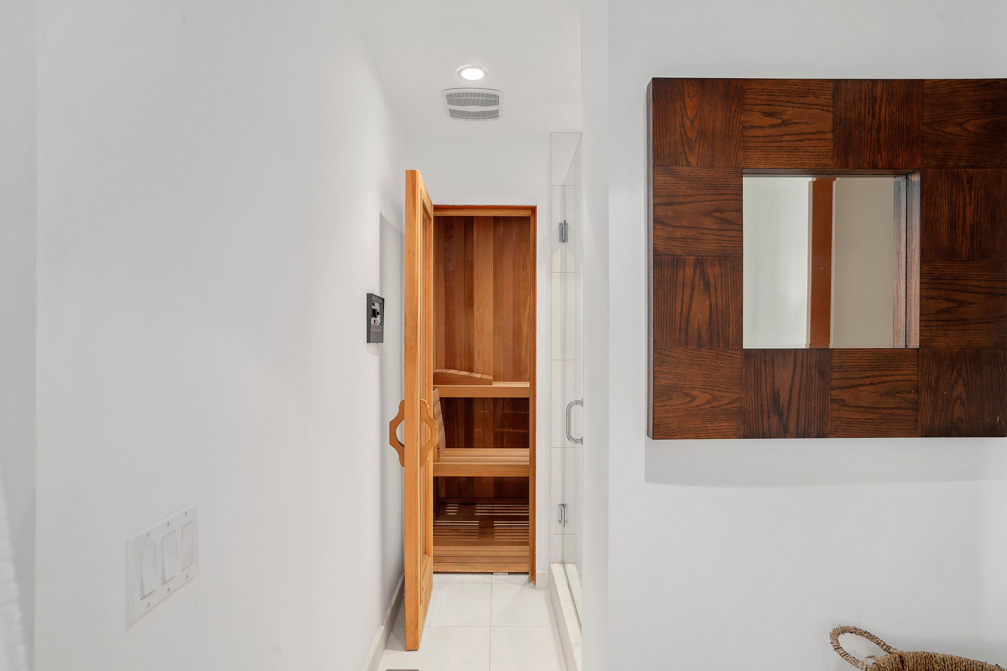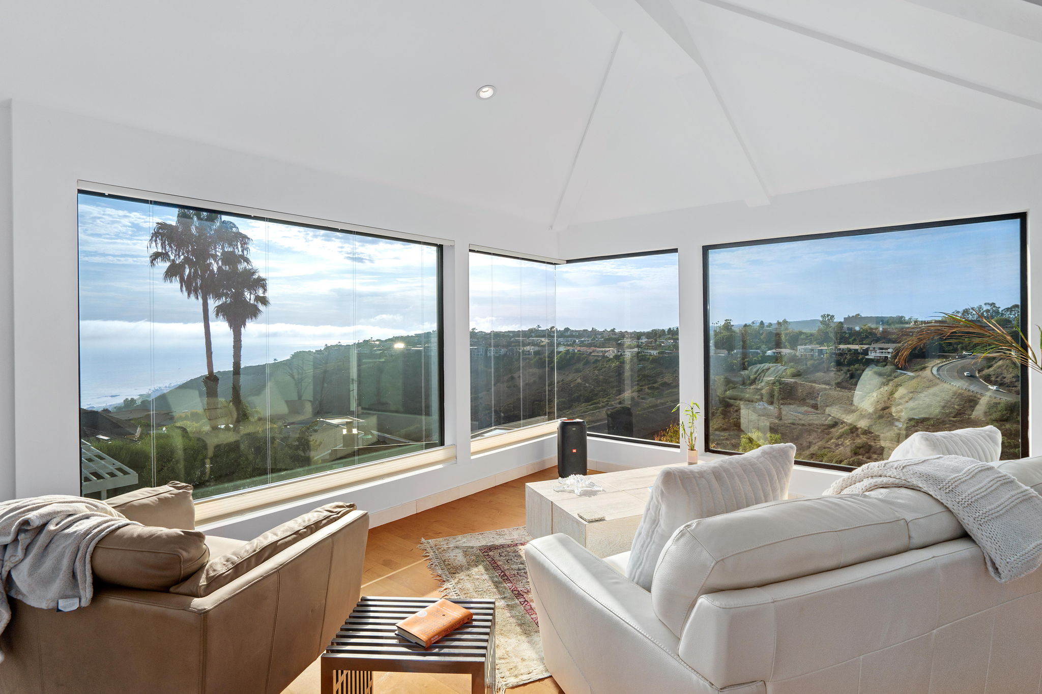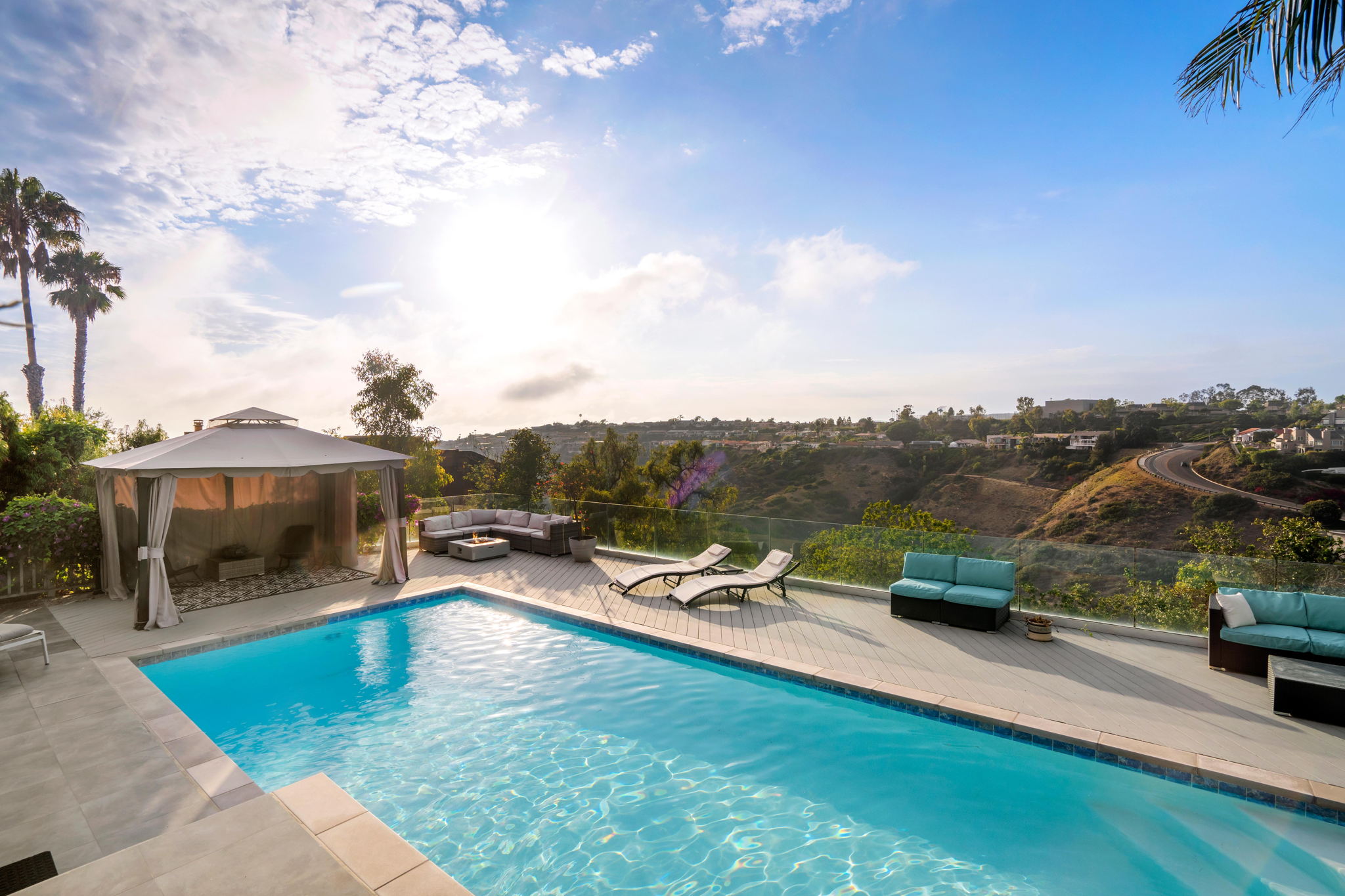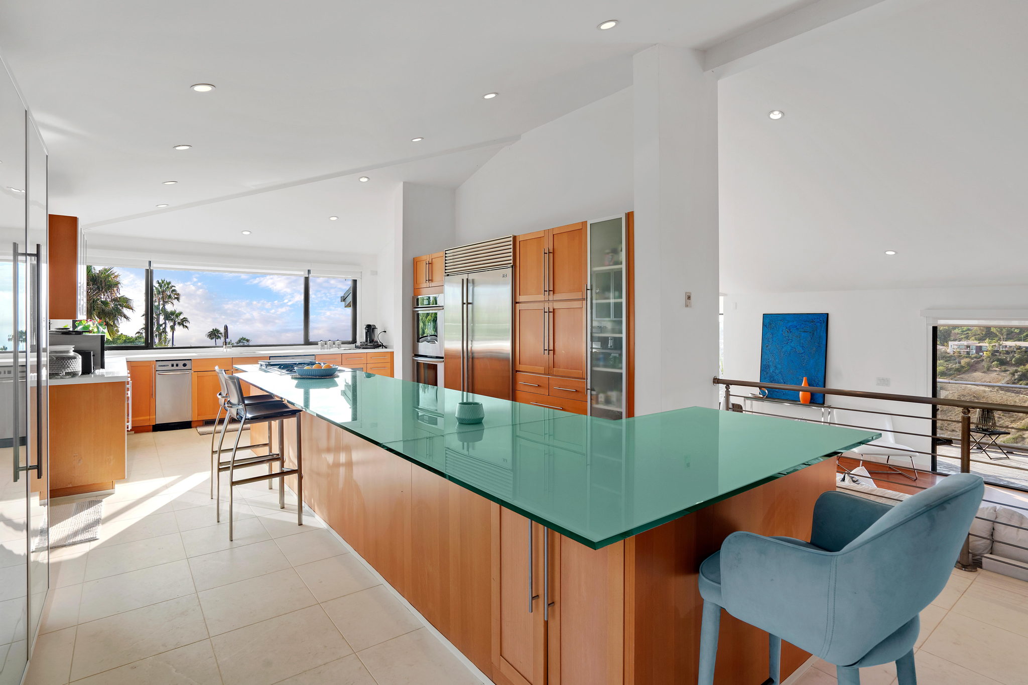 This contemporary private retreat, nestled in the serene area of Temple Hills, boasts unobstructed views of ocean and canyon. Natural lighting and ocean breeze flows throughout the home with its open floor plan and vaulted ceilings. The main level includes a formal living room with fireplace, formal dining room, sitting area, full kitchen, and luxurious owner suite with fireplace and access to a full-size deck. Down a short flight of stairs, the second level features a family room, two en-suite bedrooms, full-size sauna, exercise room, laundry room, an additional deck, and tons of storage space. The lowest level highlights a mother-in-law suite with an open kitchen and living space. The private backyard is ideal for entertainment and relaxation, with a poolside cabana, renovated salt water pool, and spa, all overlooking the breathtaking views. An oversized three-car garage and circular driveway with plenty of space for multiple additional cars complete this one-of-a-kind home, perfect for those who are looking for a modern hideaway in the hills of Laguna Beach.