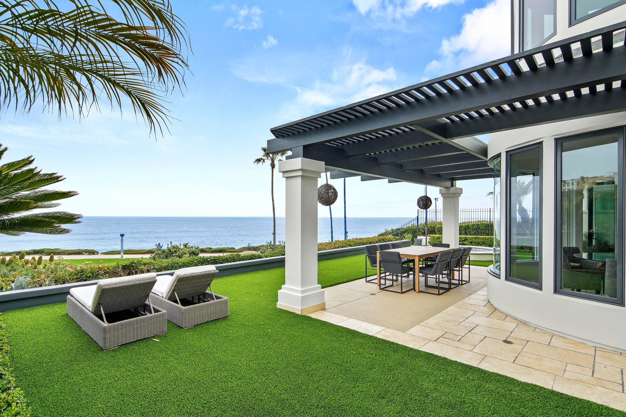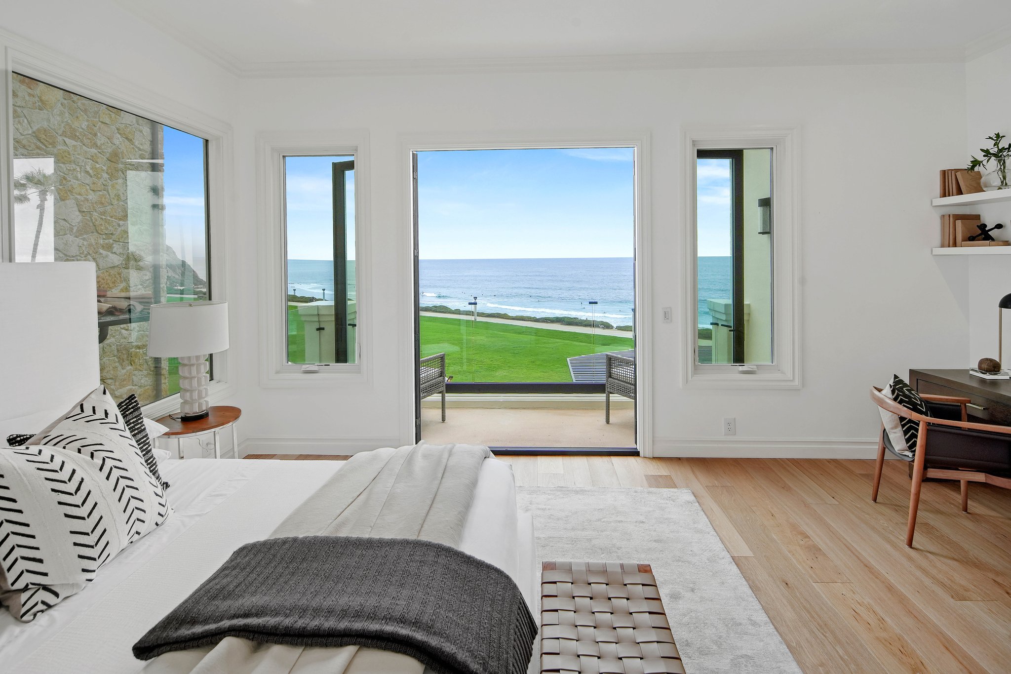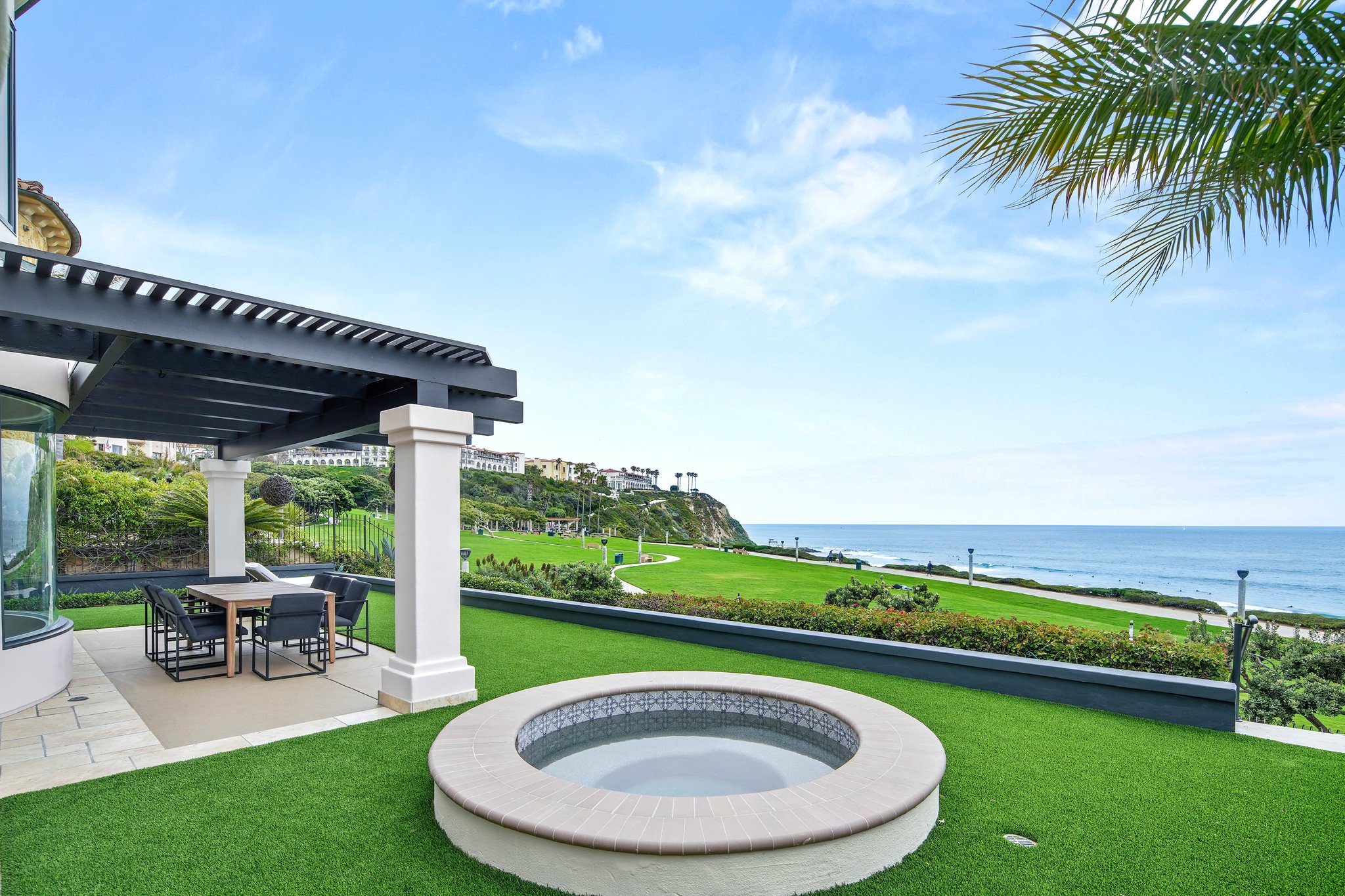 Welcome to this exquisite oceanfront residence situated in the guard-gated community of Ritz Cove, one of the most sought-after coastal communities in Orange County where unrivaled luxury and exclusivity converge. Nestled between the iconic Ritz Carlton luxury hotel and the Monarch Beach Golf Course, this one-of-a-kind beachfront property offers breathtaking year-round views of sunsets over the break at Salt Creek Beach and Catalina Island from nearly every room in the home. Upon entering, you are enveloped by the welcoming, bright and airy floor plan and feel instantly at peace in your own private oasis. Five bedrooms and five bathrooms are spread across two levels, and a bonus room provides the flexibility to create a home office, media room, or gym. Each room is generously apportioned and flows seamlessly into the next, while bespoke finishes blend architectural elements with contemporary design, resulting in a truly captivating aesthetic. The large curved glass window in the kitchen invites the ocean inside, while the attached living room space creates an entertaining paradise that opens up onto the private patio with spa, setting the perfect stage for outdoor gatherings and sophisticated entertaining. The master suite is a true sanctuary, featuring an expansive bedroom and private balcony with sweeping views of the Pacific Ocean and the Ritz Carlton, which shimmers in the evening sky. The master bath boasts a lavish soaking tub for two, a separate shower, and exquisite dual vanities, all under a skylight that bathes the room in a glowing light, creating a spa-like ambiance that elevates daily rituals to moments of bliss. The suite extends into an extensive private master closet space apportioned with all the necessary amenities, including a 3-way mirror and attached locking closet. Additionally, a private stairway with a private gated entrance grants direct access to the pristine beach and countless walking trails directly from the backyard. This breathtaking beachfront property presents an unparalleled opportunity for a personal haven of relaxation and entertaining while offering the most captivating ocean and white-water views.