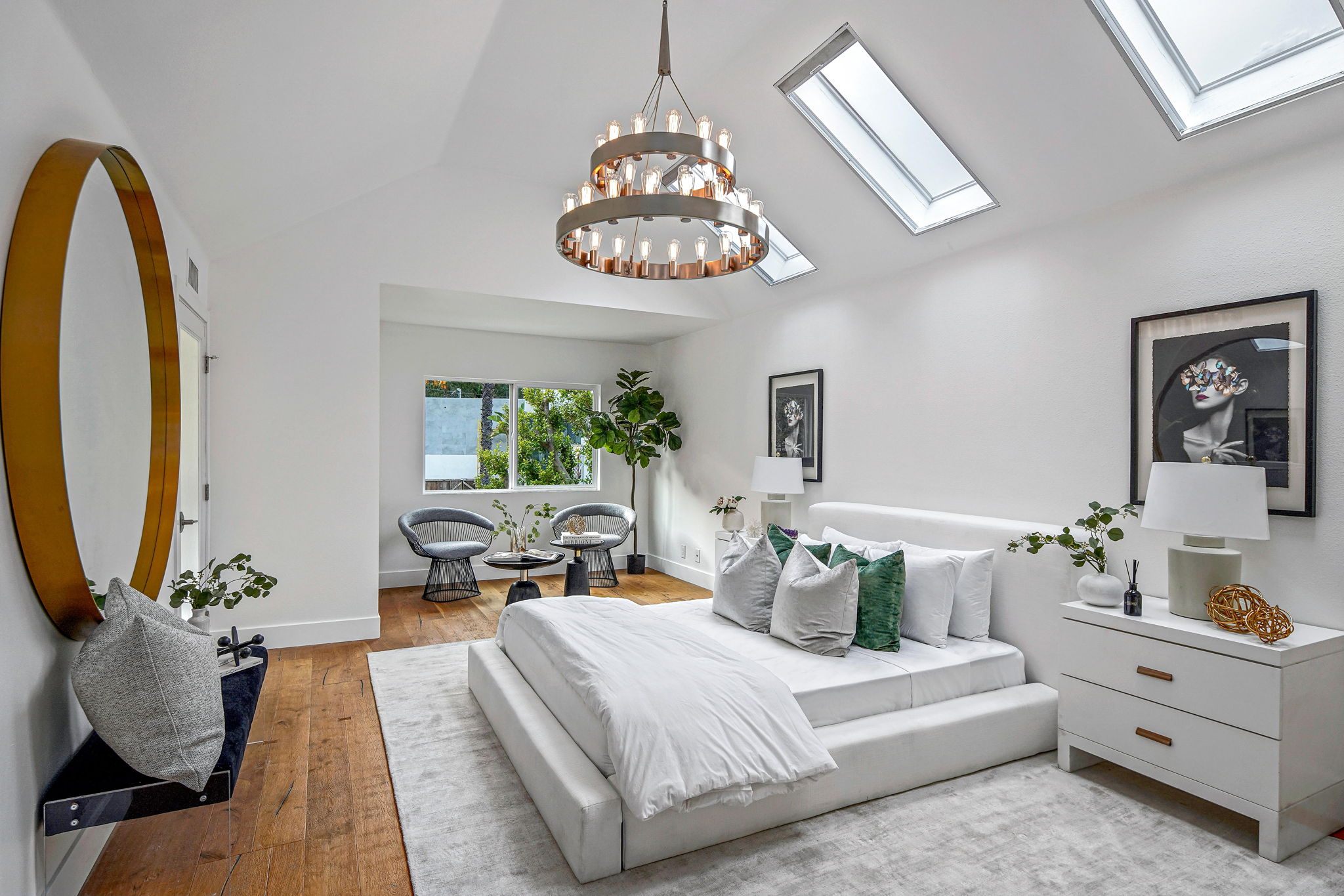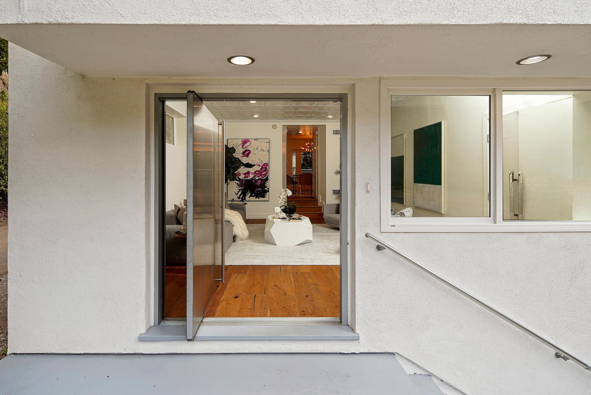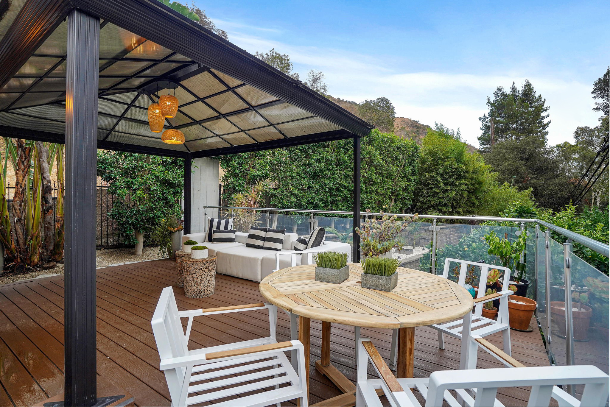 A stunning, industrial farmhouse-style home nestled in the Hollywood Hills. The bright, expansive living room features a unique, textured ceiling and leads to a luxurious gourmet kitchen enhanced with high-end appliances, exposed wood beams, and beautiful marble countertops with a separate butler's pantry behind sliding doors. The impressive owners' suite boasts vaulted ceilings with skylights, providing an abundance of natural light. A spa-like bathroom features an oversized, polished steel tub and gorgeous marble shower. Relax in the serene and private backyard, surrounded by multiple fountains and lush greenery, with a covered patio and grassy yard, perfect for entertaining. Bonus room below patio with separate entry. Attached 2-car garage.