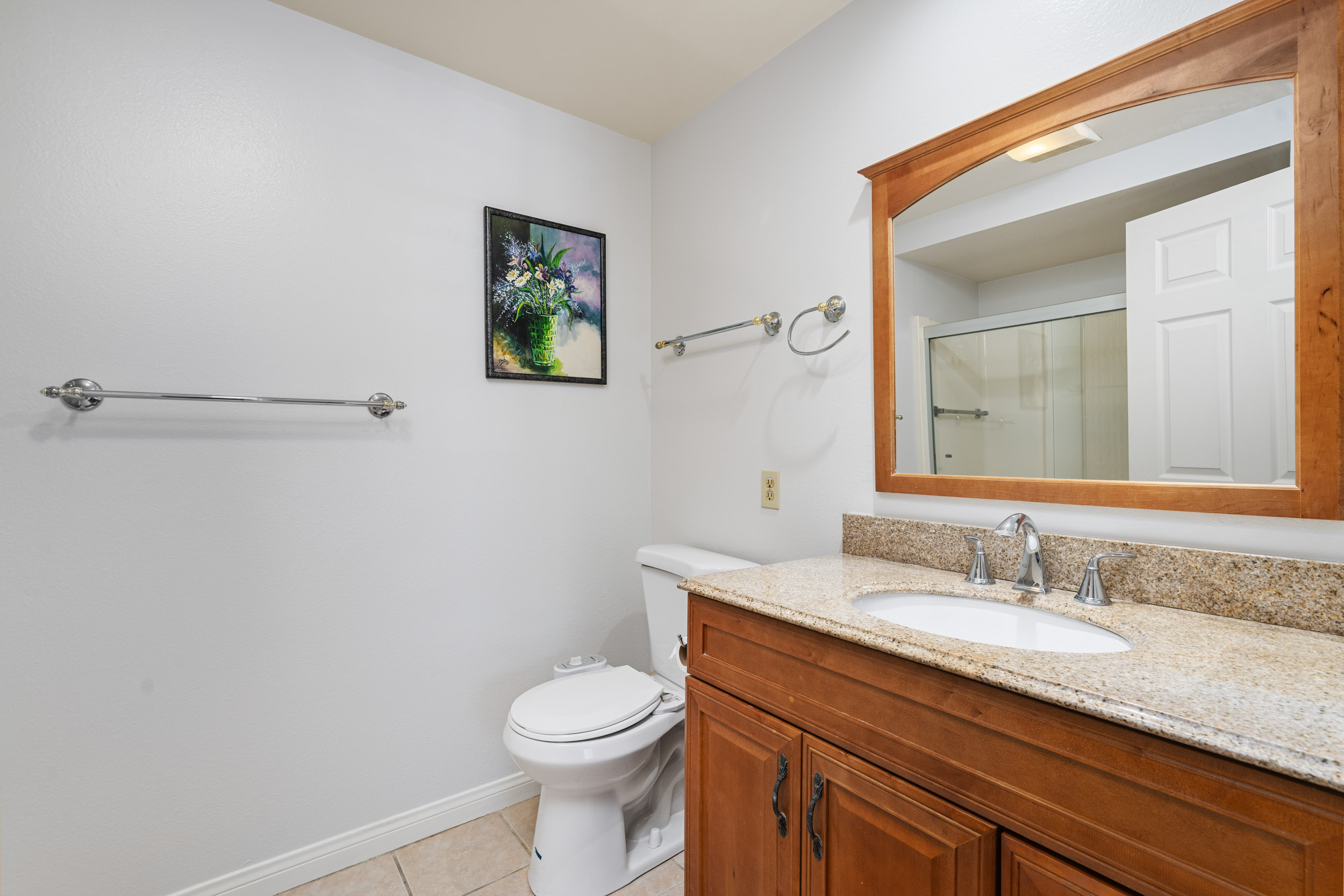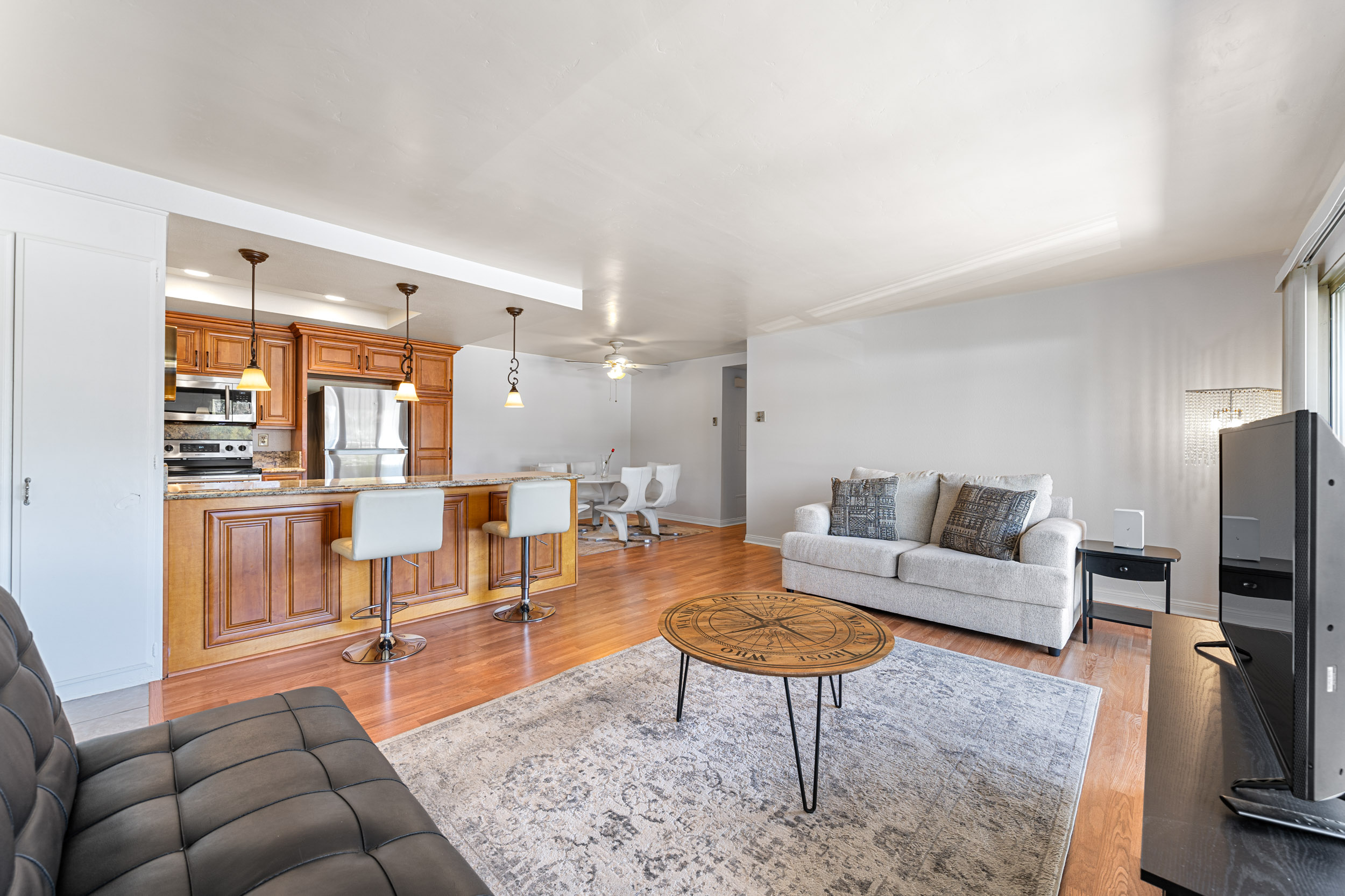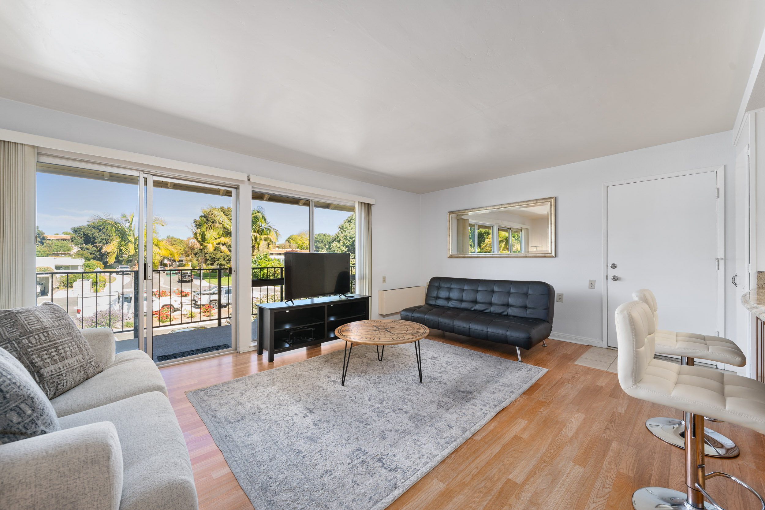 This charming 2-bedroom, 2-bath home is located on the second floor with no one above and features a spacious open layout, perfect for everyday comfort or entertaining. Step inside to find freshly painted walls, smooth ceilings, and rich laminate flooring with no carpet throughout. The fully remodeled kitchen has been thoughtfully opened up to the living area, creating a seamless flow. It features custom cabinetry with soft-close drawers, granite countertops, recessed lighting, stainless steel appliances, and stylish pendant lighting. The oversized front balcony is accessible from both the living room and guest bedroom—ideal for enjoying your morning coffee or unwinding with sunset views. The bathrooms have been updated with granite counters, tile floors, and modern fixtures. Additional upgrades include mirrored closet doors, an in-unit dishwasher, garbage disposal, and air conditioning. This condo also includes a covered carport with storage just steps from the unit, and there's ample guest parking right out front. Conveniently located in one of the quietest corners of the community, you’ll enjoy both privacy and accessibility. Community Highlights: Laguna Woods Village is a 55+ resort-style community offering an unmatched lifestyle with amenities that include a 27-hole championship golf course, 9-hole executive course, 5 pools, tennis and pickleball courts, gyms, horse stables, over 200 clubs, 7 clubhouses, and a performing arts theater. HOA dues include: water, trash, cable TV, bus transportation, fitness centers, golf, and more. Don’t miss your chance to own this turn-key home in one of Orange County’s most vibrant active adult communities!