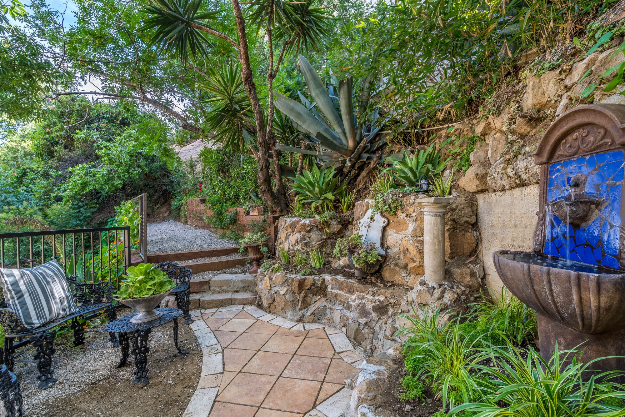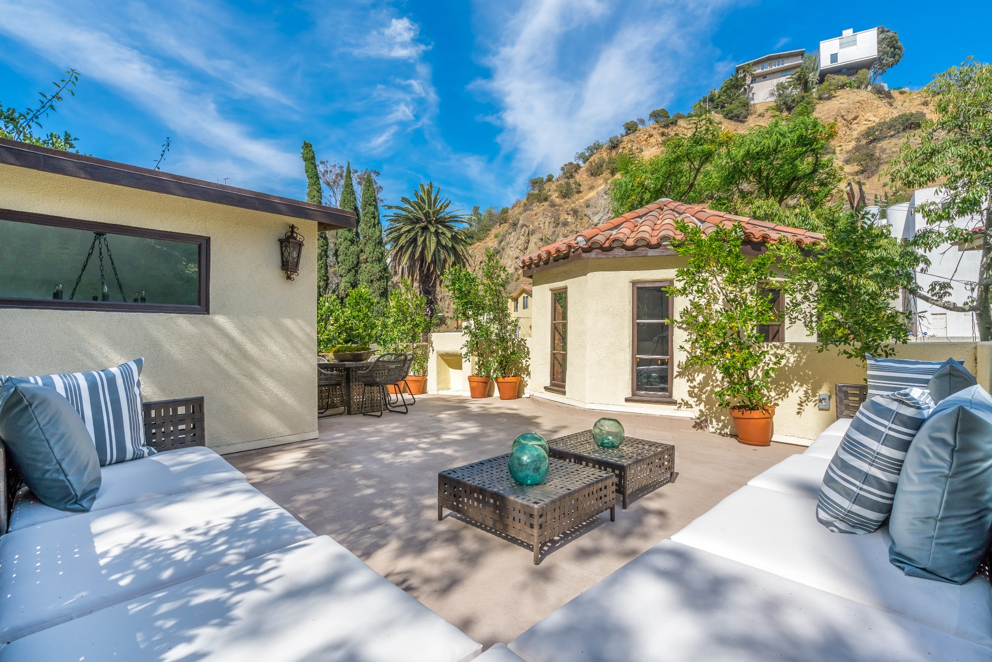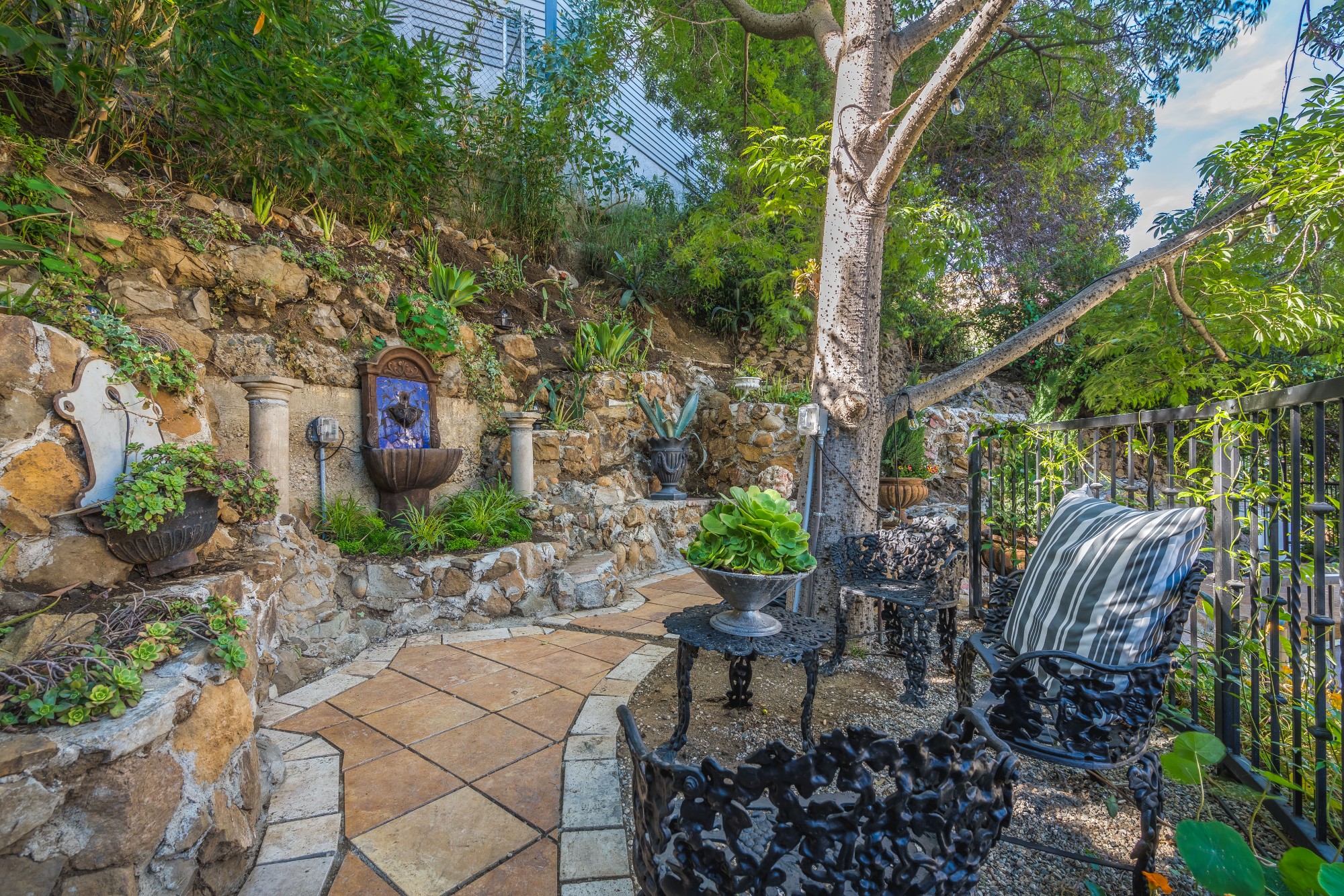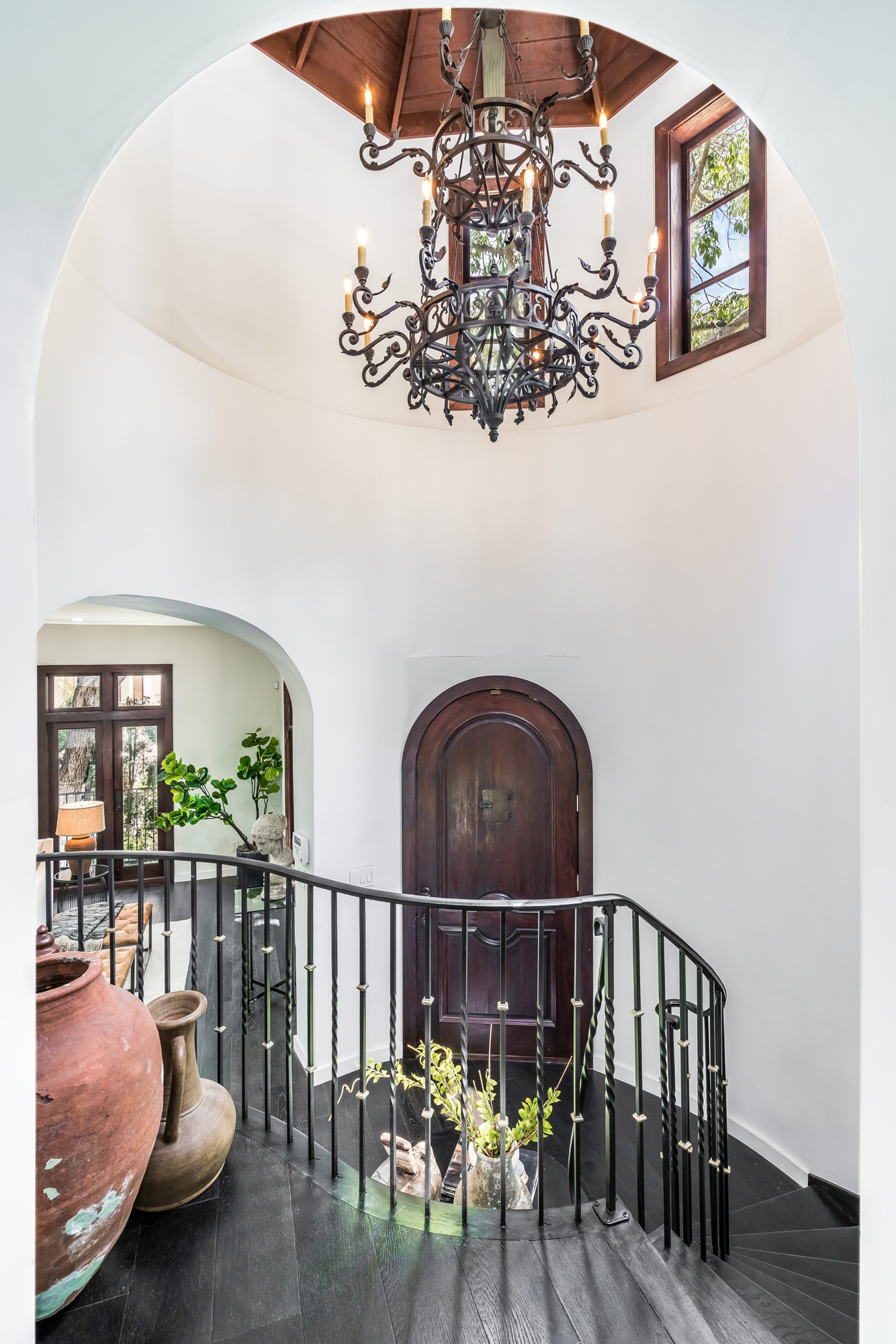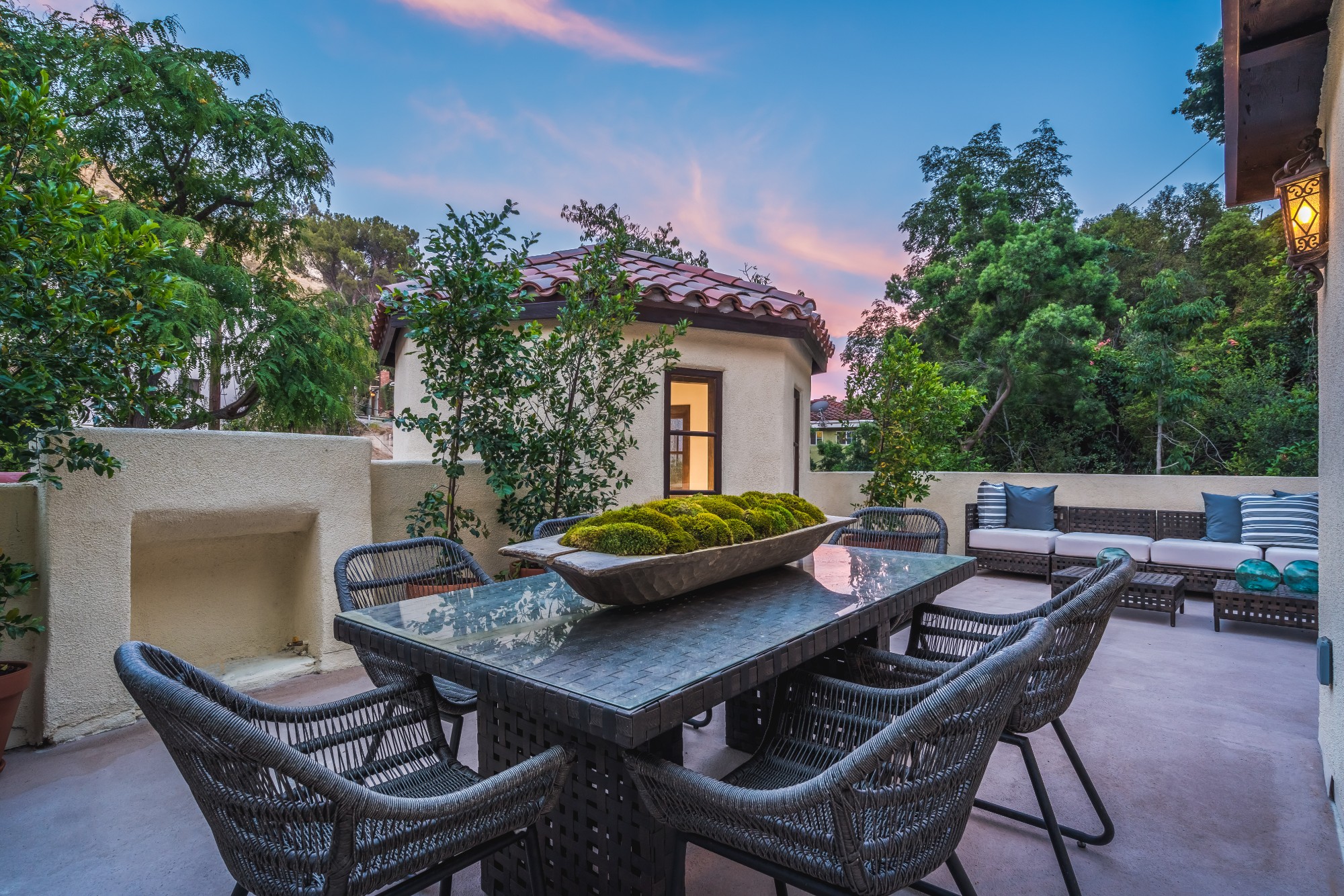 Exquisitely remodeled and restored Spanish Revival located in prime Hollywood Dell. No expense was spared and no detail missed. Enter into an expansive 20' turret entryway which leads to an oversized formal living area, complete with wood-burning fireplace, soaring ceilings, and french doors opening to breezy balconies. Archways with hand-carved wooden details lead to a gourmet chef's kitchen complete with stainless steel appliances, Marble countertops, and backsplash, and eating area with cozy fireplace. Three bedrooms with private balconies, including an owner's suite with walk-in closet and a luxurious, spa-like bathroom with carrera marble flooring, dual sinks, shower, and bathtub. Generously-sized downstairs living/media room with fireplace, perfect for entertaining. Tranquil rooftop terrace surrounded by mature greenery and immaculate landscaping. Stunning backyard with rock-wall vertical garden, fountain, and private grotto nestled into the hillside. 2-car garage with additional parking.