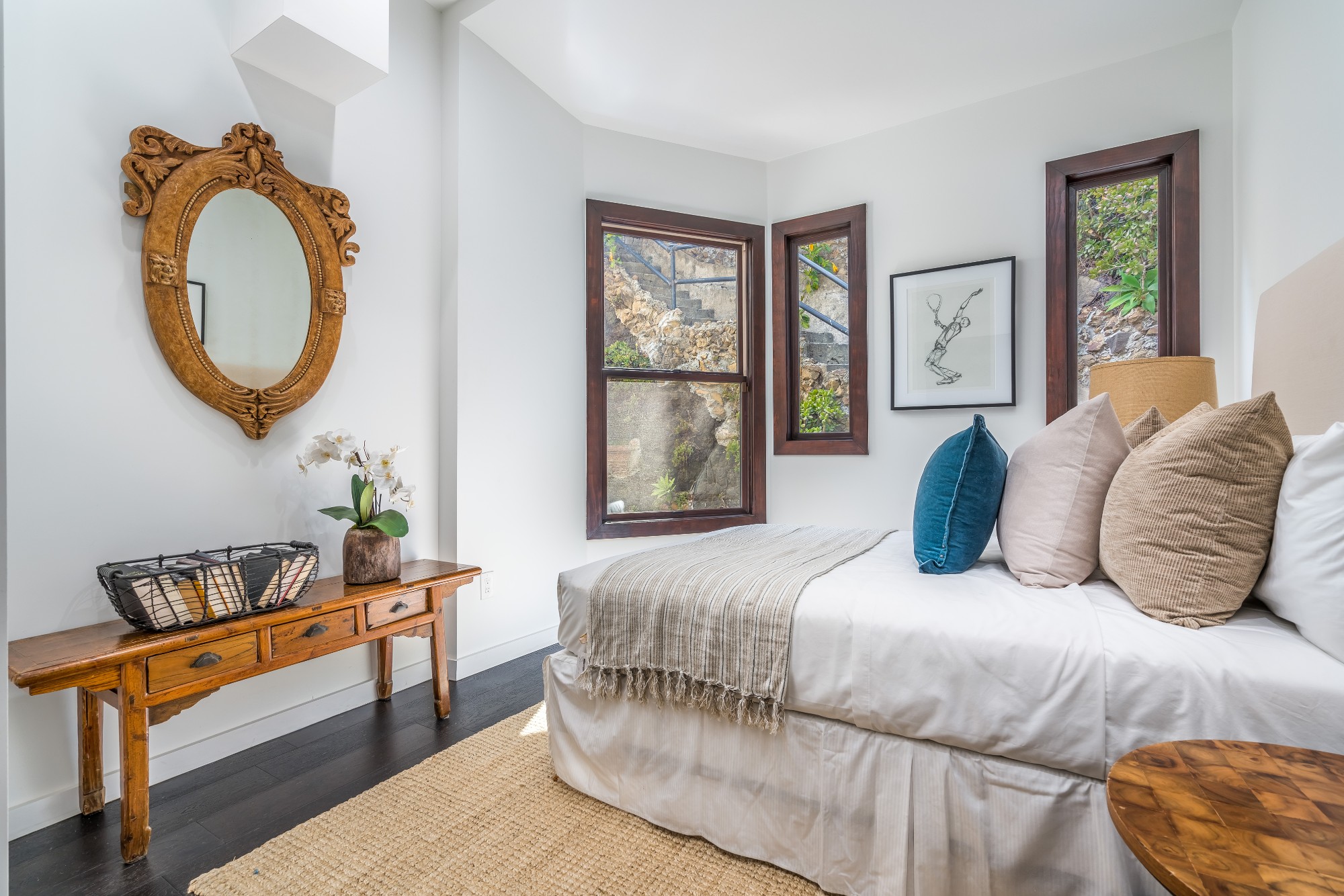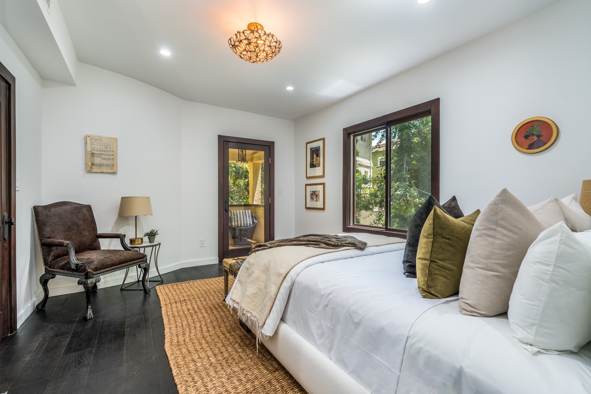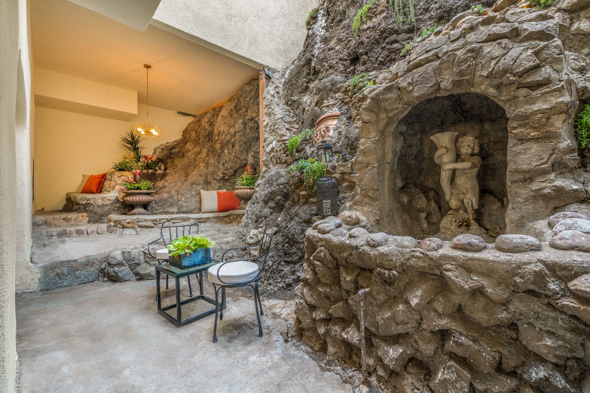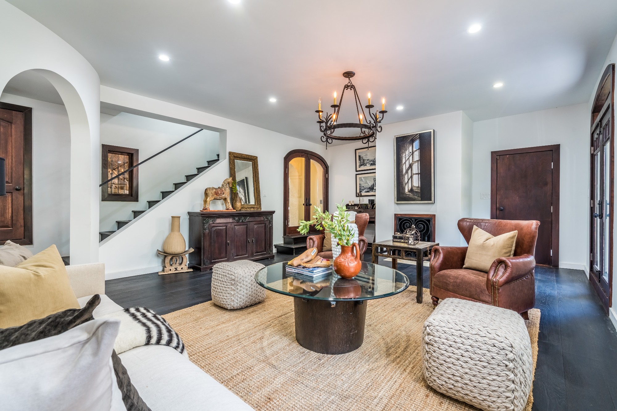 Exquisitely remodeled and restored Spanish Revival located in prime Hollywood Dell. No expense was spared and no detail missed. Enter into an expansive 20' turret entryway which leads to an oversized formal living area, complete with wood-burning fireplace, soaring ceilings, and french doors opening to breezy balconies. Archways with hand-carved wooden details lead to a gourmet chef's kitchen complete with stainless steel appliances, Marble countertops, and backsplash, and eating area with cozy fireplace. Three bedrooms with private balconies, including an owner's suite with walk-in closet and a luxurious, spa-like bathroom with carrera marble flooring, dual sinks, shower, and bathtub. Generously-sized downstairs living/media room with fireplace, perfect for entertaining. Tranquil rooftop terrace surrounded by mature greenery and immaculate landscaping. Stunning backyard with rock-wall vertical garden, fountain, and private grotto nestled into the hillside. 2-car garage with additional parking.