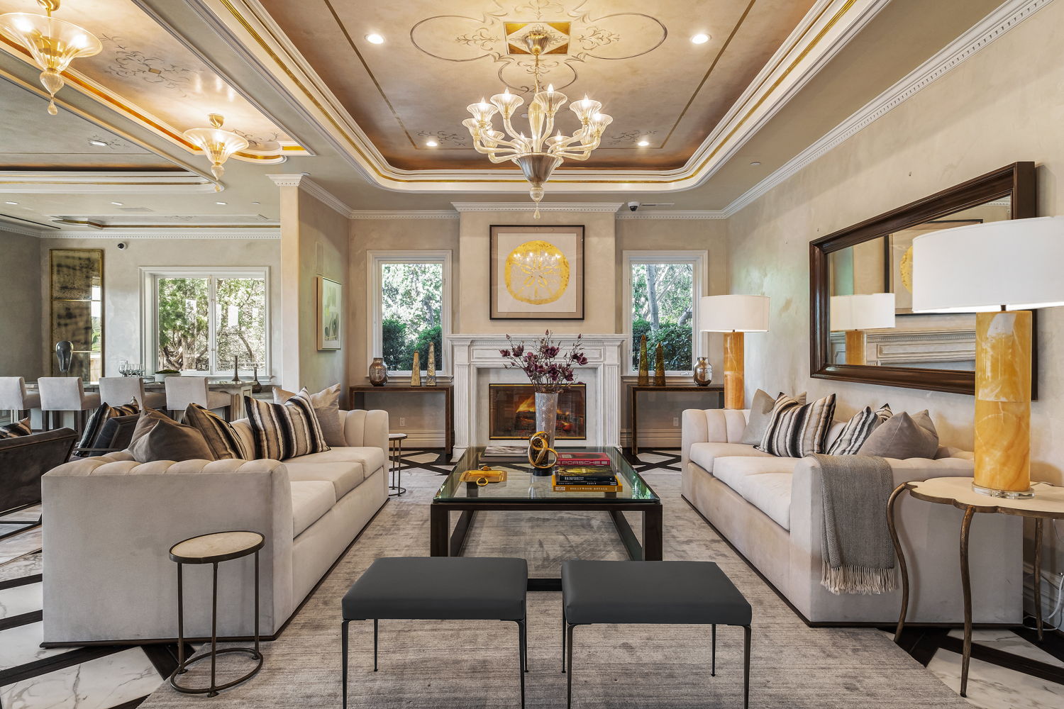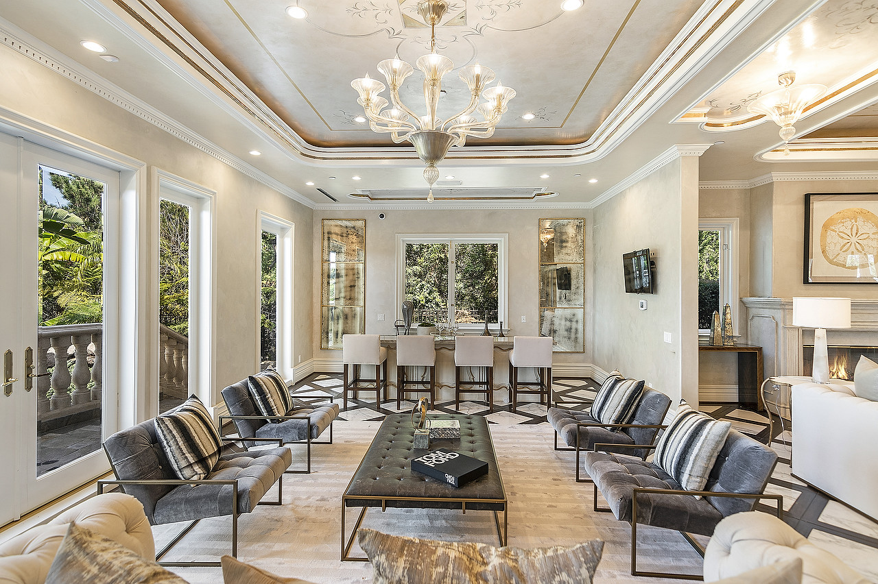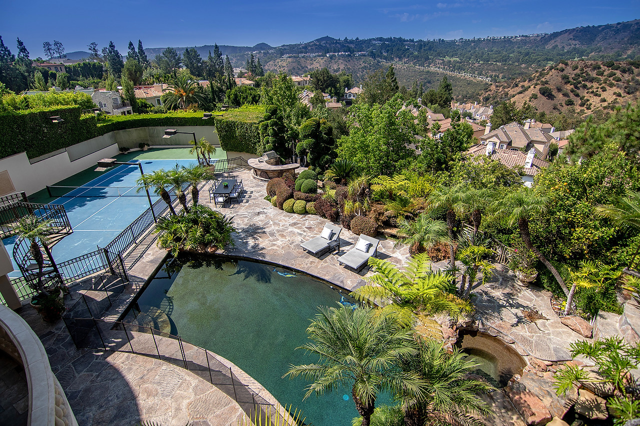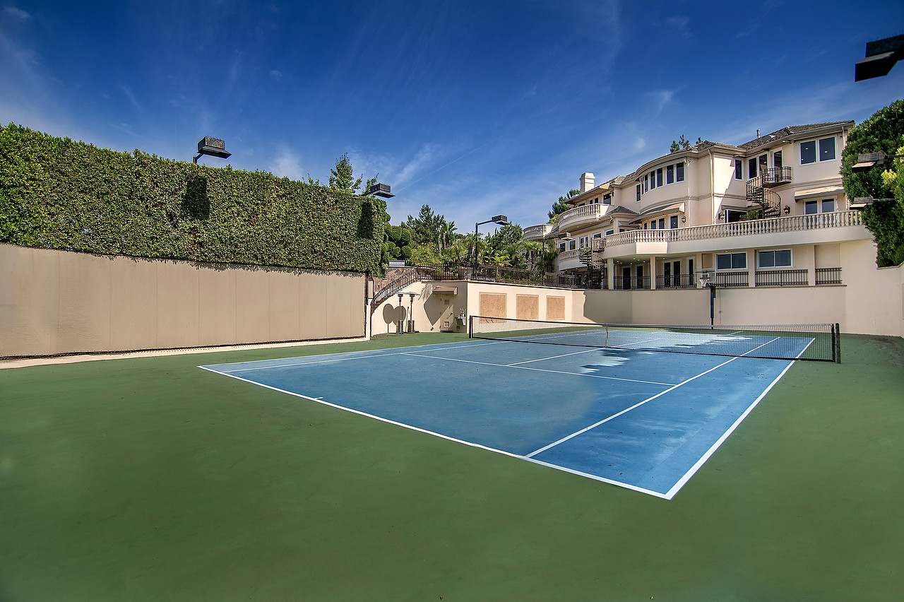 Extraordinary 10,000+ sq. ft. Italian Villa with tennis court and beautiful canyon/city views is situated on a 26,000+ sq. ft. lot at the end of a private cul-de-sac in the prestigious guard-gated community of Bel Air Crest. Completely renovated, this estate exudes style & sophistication with gorgeous ornate detailing & walls of French doors that open to stunning terraces & overlook lush vistas. A 2-story beveled glass & iron wrought front door leads to the impressive formal foyer with dual sweeping staircases, marble floors, & hand-painted ceiling with domed skylight. Stunning living room with intricate Venetian plaster & coffered ceilings, formal dining room, & chef’s kitchen with oversized center island & gourmet appliances. Upstairs is a luxurious master suite with dual oversized baths & walk-in closets, sitting room/gym, sauna, & an additional 3 bedroom suites. Expansive lower-level entertaining space with games room & bar, abundant patio space, and private lagoon-style pool/spa.