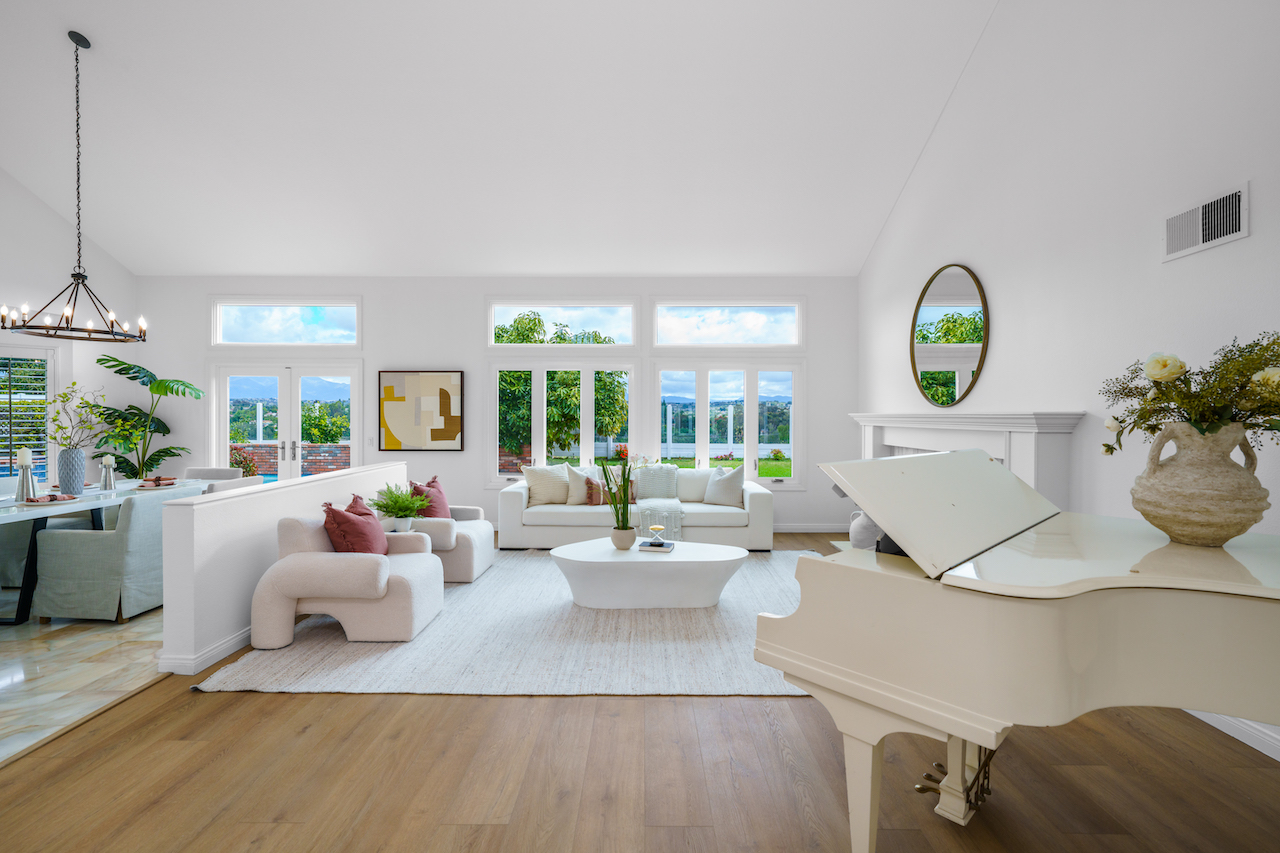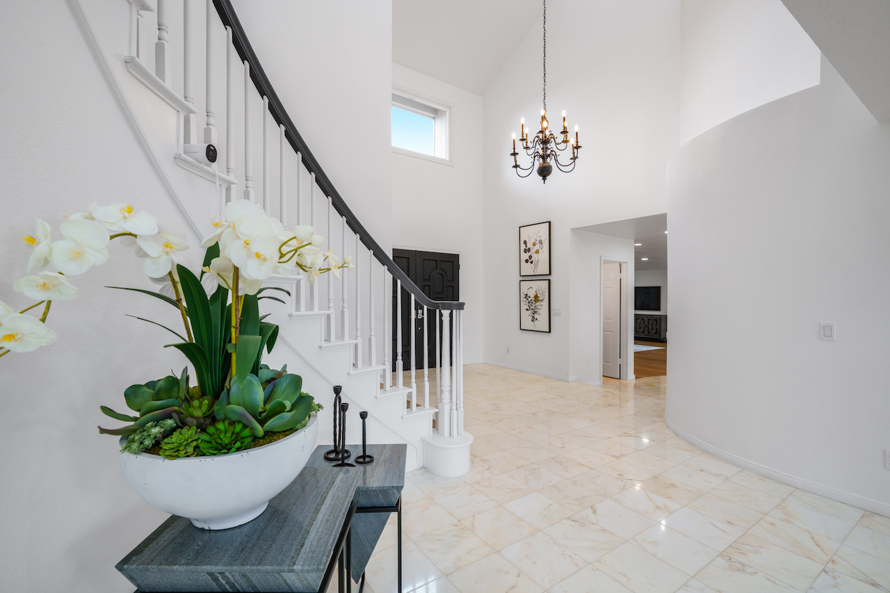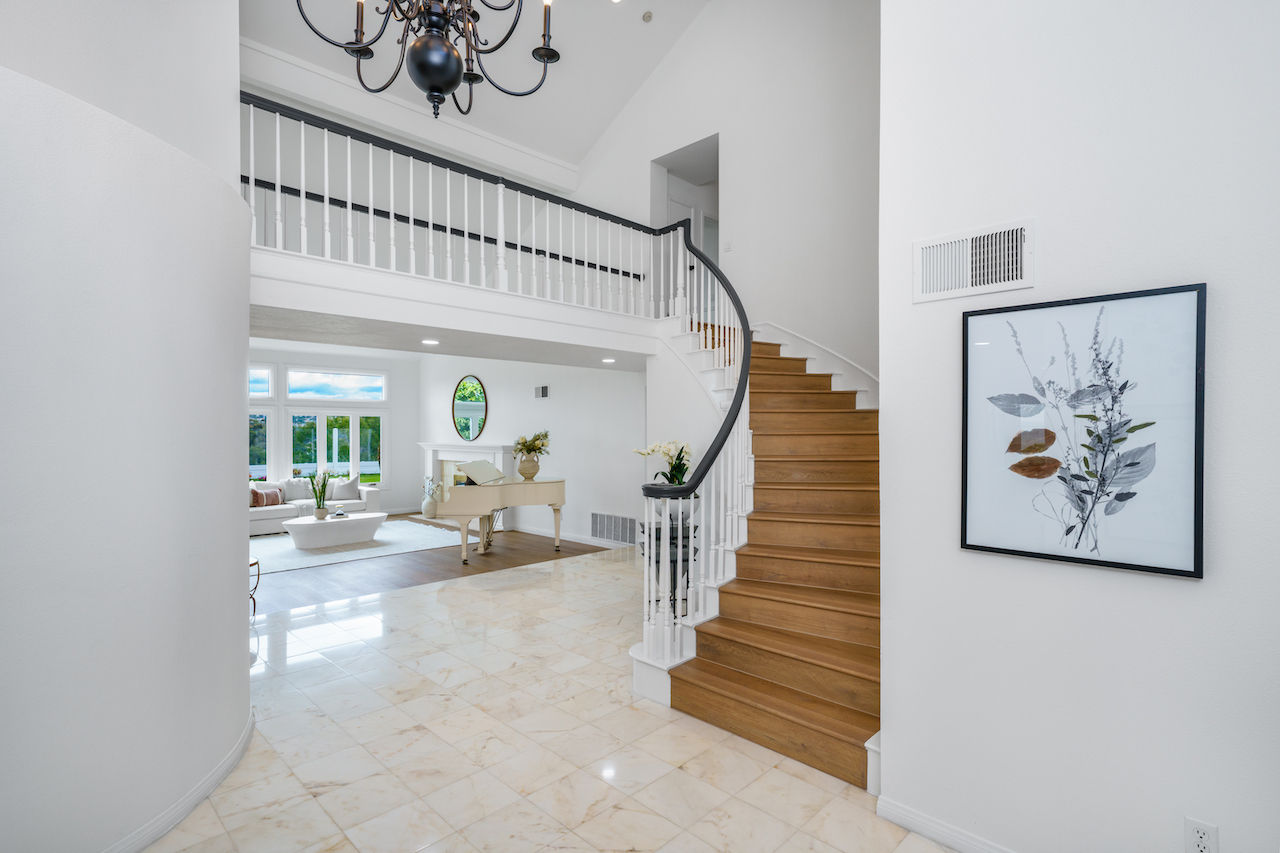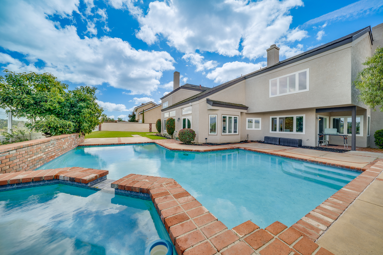 Immerse yourself in luxury at this exquisite residence in the esteemed Nellie Gail Ranch community of Laguna Hills. Meticulously updated, this home seamlessly blends elegance with contemporary comforts. Upon entry through a marble-tiled foyer, revel in the light-filled, open floor plan adorned with low-E, double-paned, tempered glass windows and doors. The state-of-the-art chef's kitchen boasts sleek quartz countertops, a central island, modern white cabinets with chic hardware, and brand-new stainless steel appliances. Flowing effortlessly into the dining and family room areas, the kitchen creates a welcoming living space anchored by a newly revamped fireplace. The ground level encompasses expansive living and dining rooms with soaring two-story ceilings, a convenient downstairs bedroom with an en-suite bathroom, and a dedicated home office. Upstairs, the sunlit primary suite features a spacious walk-in closet and a fully renovated bathroom with brushed marble floors, a custom frameless glass shower, a standalone soaking tub, and new vanities with Carrara marble countertops. Additional living areas include a generous bonus room, a junior suite with a private bathroom, and two bedrooms sharing a full bathroom. Outdoor entertainment is a delight with a newly replastered pool and spa, lush greenery, concrete decking, in-ground irrigation, and captivating views. Thoughtfully updated for comfort and tranquility, this home boasts a new roof, copper piping, elegant lighting fixtures, luxury vinyl flooring, recessed lights, custom cabinetry, smart home features, and fresh paint throughout. Experience the epitome of luxury living in a peaceful setting.
