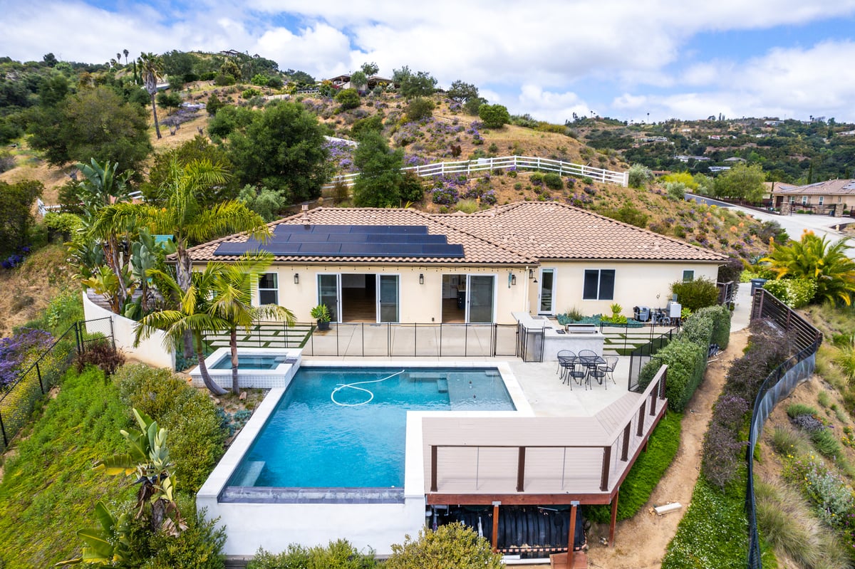 Your Private Mountain-View Retreat in Pala Mesa awaits you! Discover the ultimate escape in this stunning 4-bedroom, 3.5-bathroom home with a 3-car garage, offering 2,767 square feet of luxurious living space on a secluded 1.4-acre lot. Tucked away in the hills of Pala Mesa, this home boasts incredible privacy and sweeping mountain views that create a true sense of serenity. From the moment you enter, you’re welcomed by an inviting interior bathed in natural light, with expansive windows perfectly framing the picturesque surroundings. The open-concept design connects the spacious living and dining areas, ideal for effortless entertaining or quiet evenings at home. The gourmet kitchen is both functional and elegant—perfect for everything from casual meals to elaborate dinners. High-end finishes, quality appliances, and thoughtful design make it a space you’ll love spending time in. Step outside into your very own private oasis. An infinity-edge pool and spa overlook the mountains, while the outdoor kitchen, gazebo, sport court, and play structure offer endless opportunities for relaxation, recreation, and hosting unforgettable gatherings—all with unmatched privacy. This energy-efficient home comes fully equipped with 48 solar panels and two Tesla Powerwalls (valued at approx. $75,000), generating enough power for the entire home and EV charging. Enjoy easy access to the 15 and 76 freeways, while being right next to Pala Mesa Resort and Golf Course. Located within the Bonsall Unified School District, this home combines peaceful seclusion with convenient proximity. Whether you’re seeking a tranquil hideaway or an entertainer’s paradise, this one-of-a-kind property delivers the best of both worlds. Don’t miss this rare opportunity to own a private retreat with stunning mountain views in one of Pala Mesa’s most desirable locations.