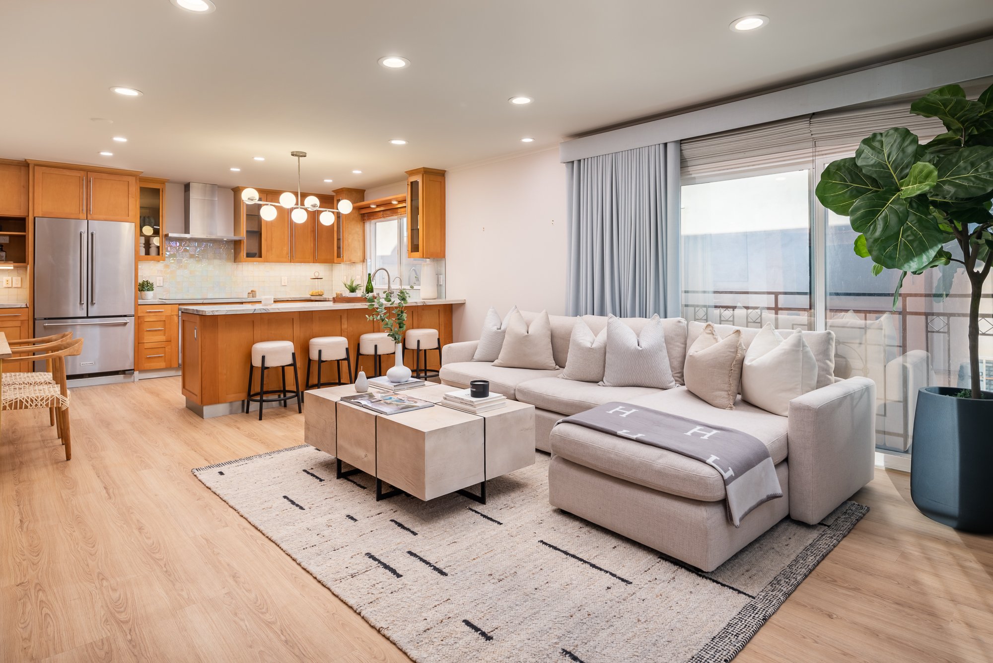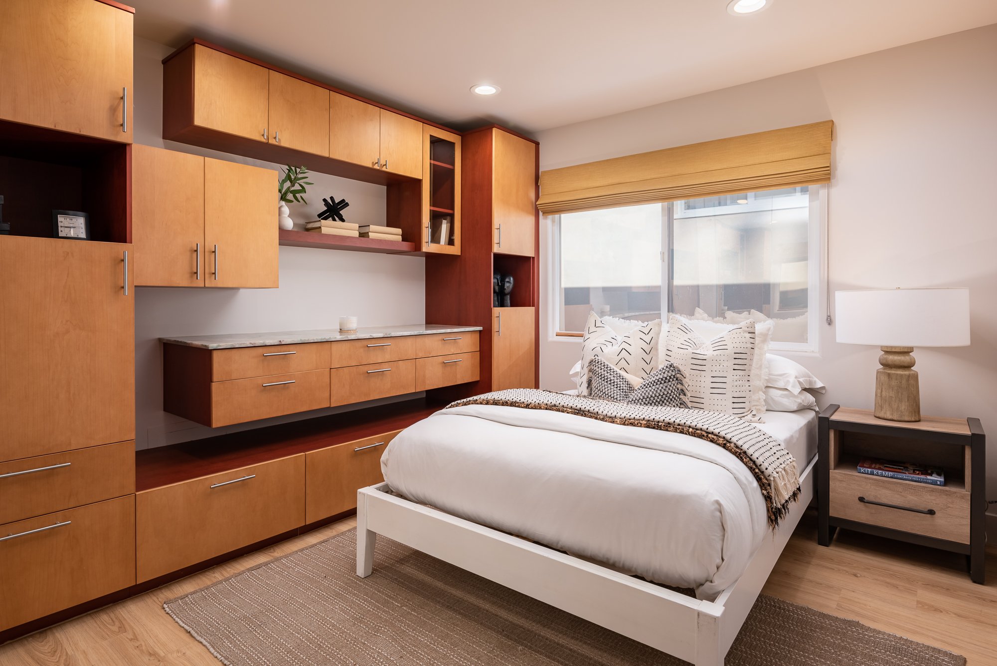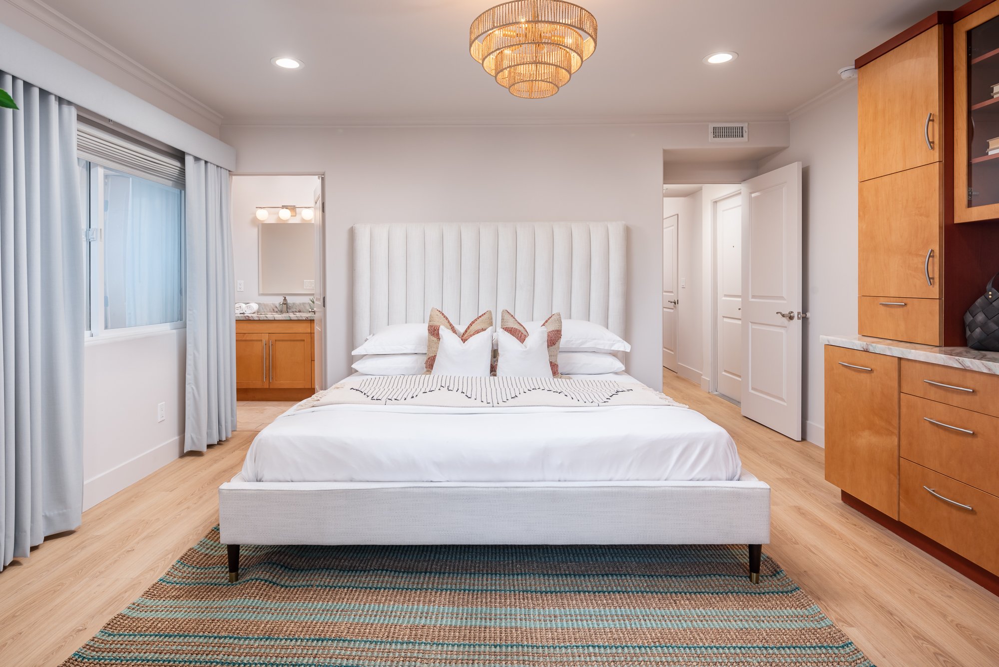 As you step inside, the seamless open-concept layout guides you through a thoughtfully remodeled interior that showcases stunning, custom built-ins providing ample storage solutions throughout the home. The four built-ins from San Diego’s acclaimed Design Studio West are one-of-a kind creations that beautifully enhance the space.
