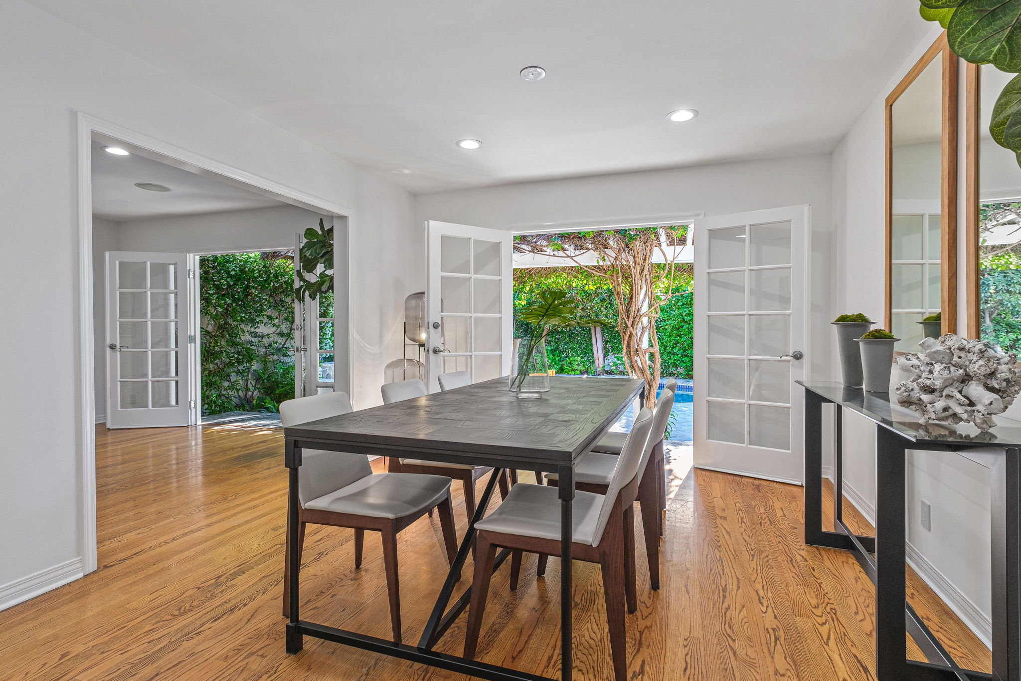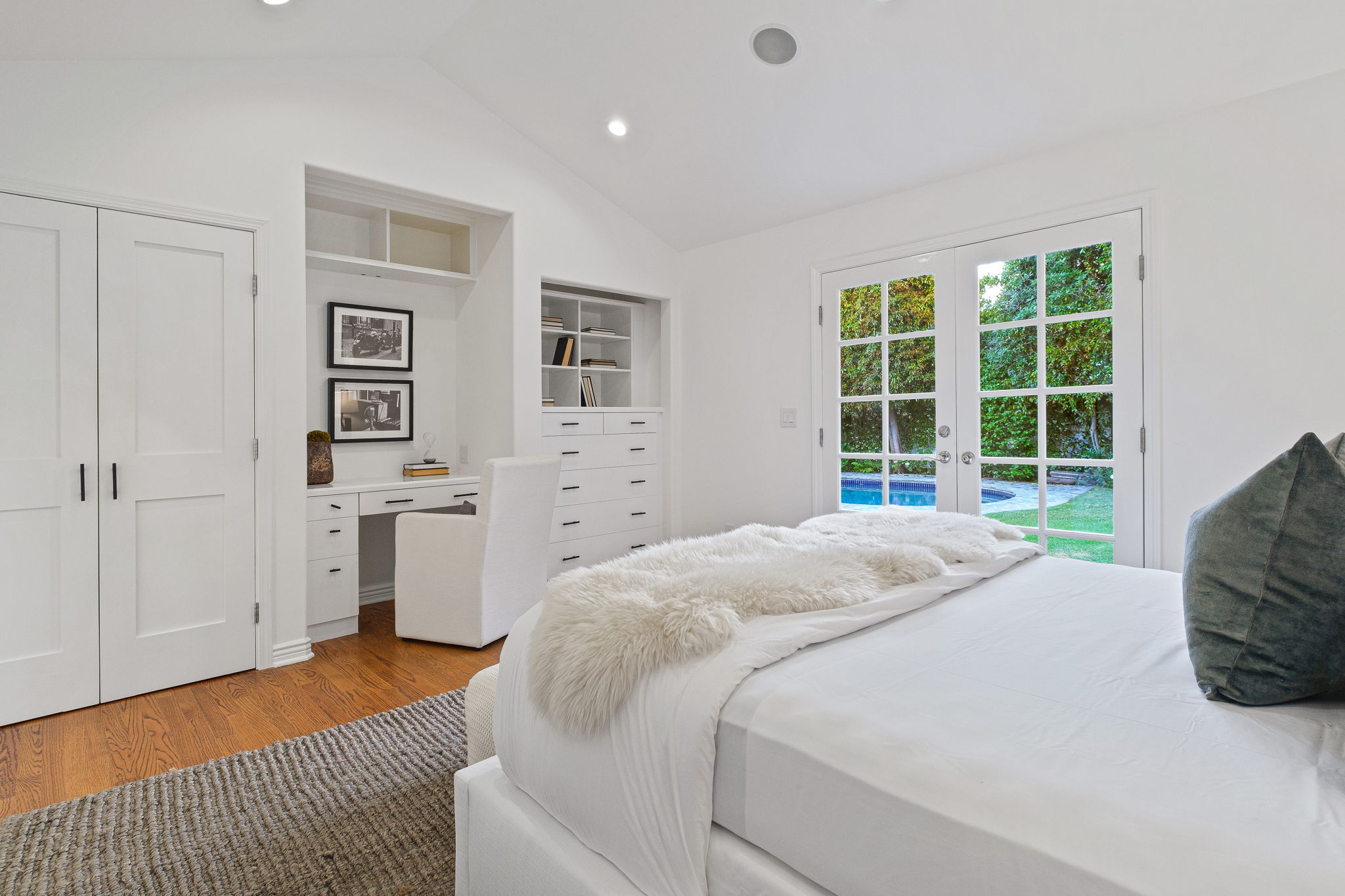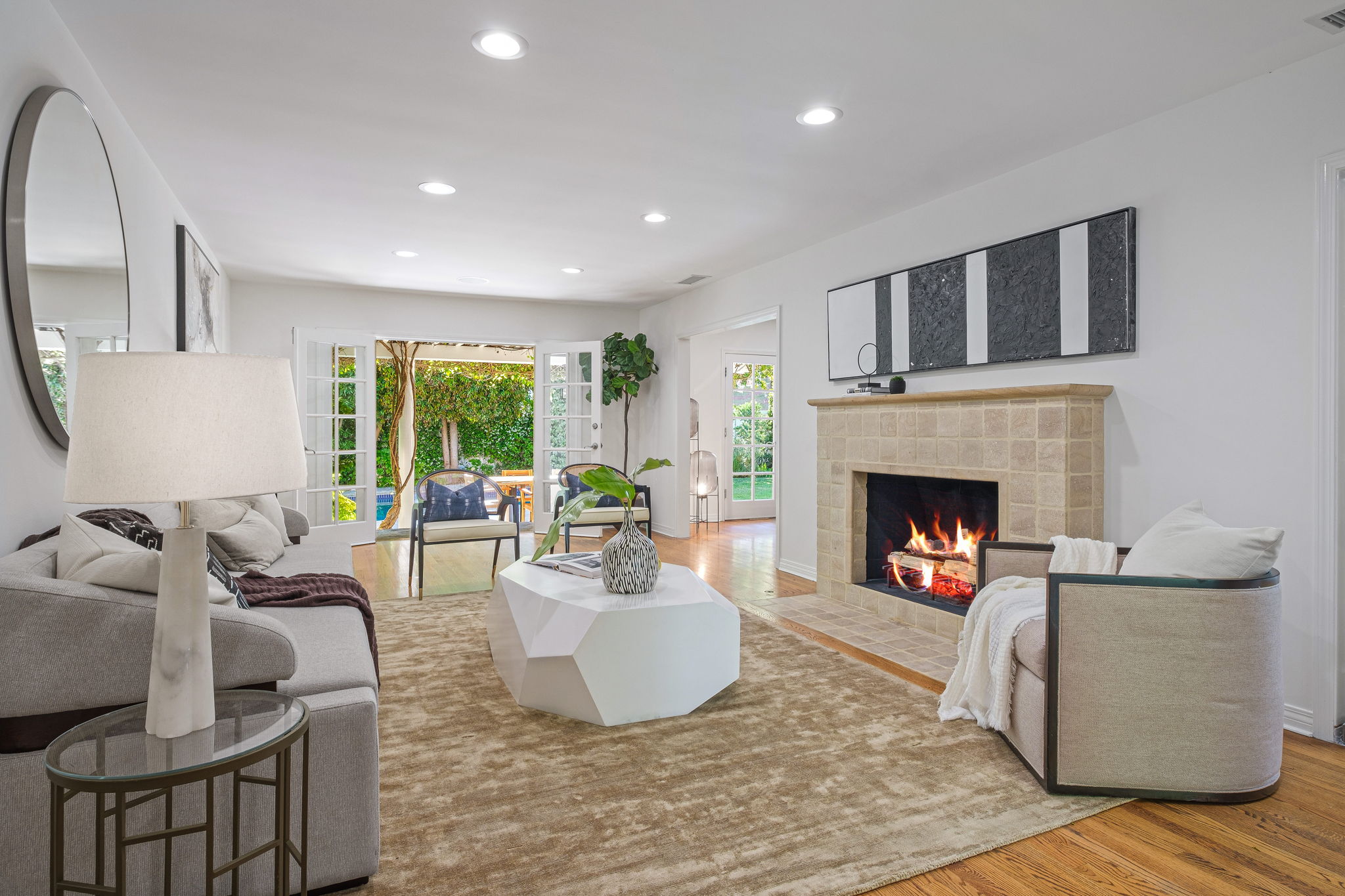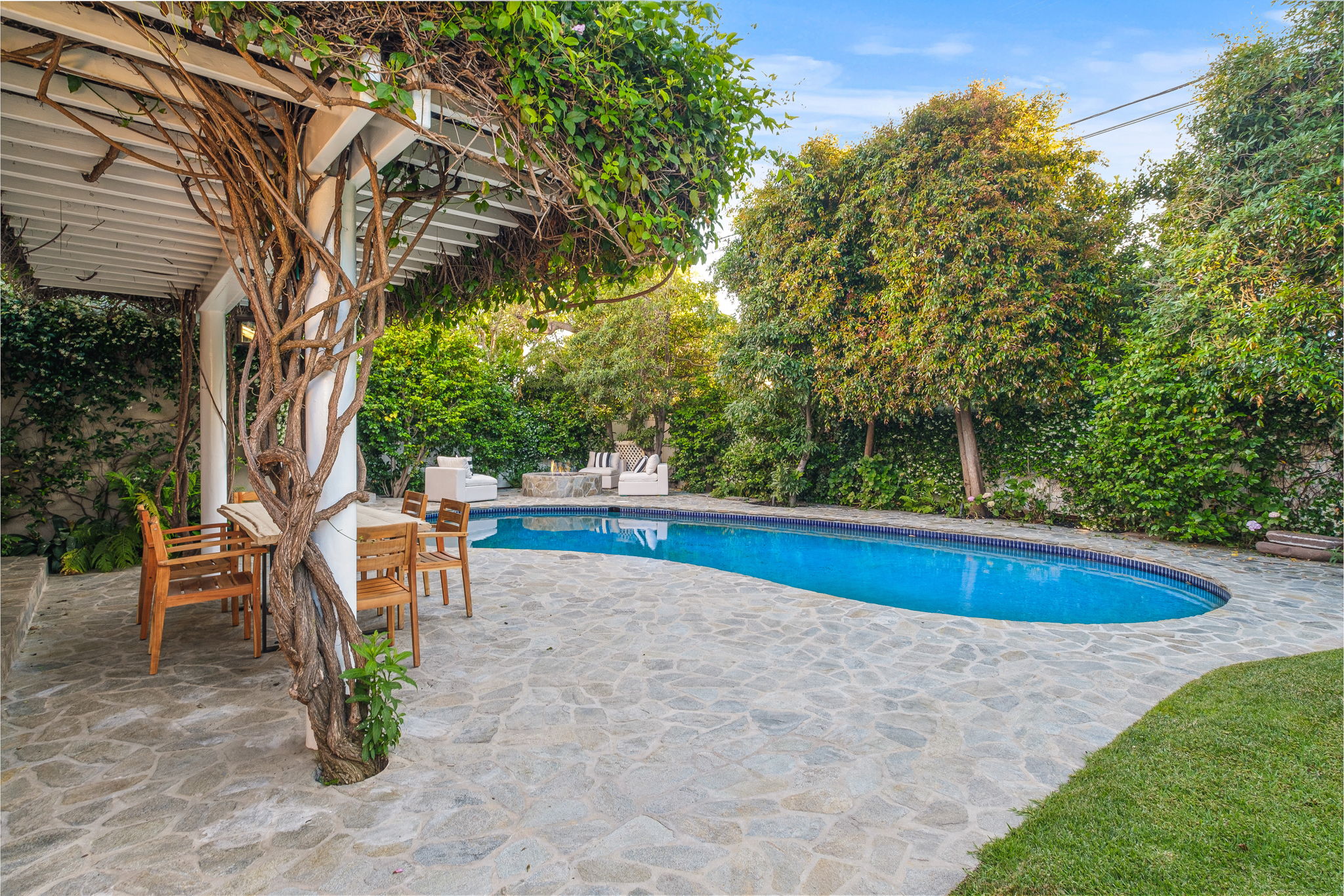 This charming remodeled traditional home in the heart of Brentwood offers a wonderful floor plan and light-filled living spaces. The living room boasts a Travertine fireplace and French doors opening to a lush and private landscaped yard with sun-drenched pool, fire pit, pergola, and entertaining areas. The chef kitchen comes replete with marbled porcelain countertops and top-of-the-line appliances. The owner's suite offers vaulted ceilings, an abundance of natural light, beautiful built-in cabinetry, and a luxurious bathroom and soaking tub. Hardwood floors throughout. A spacious upstairs living area serves as a separate living room, playroom, or fifth bedroom. 2-car garage.