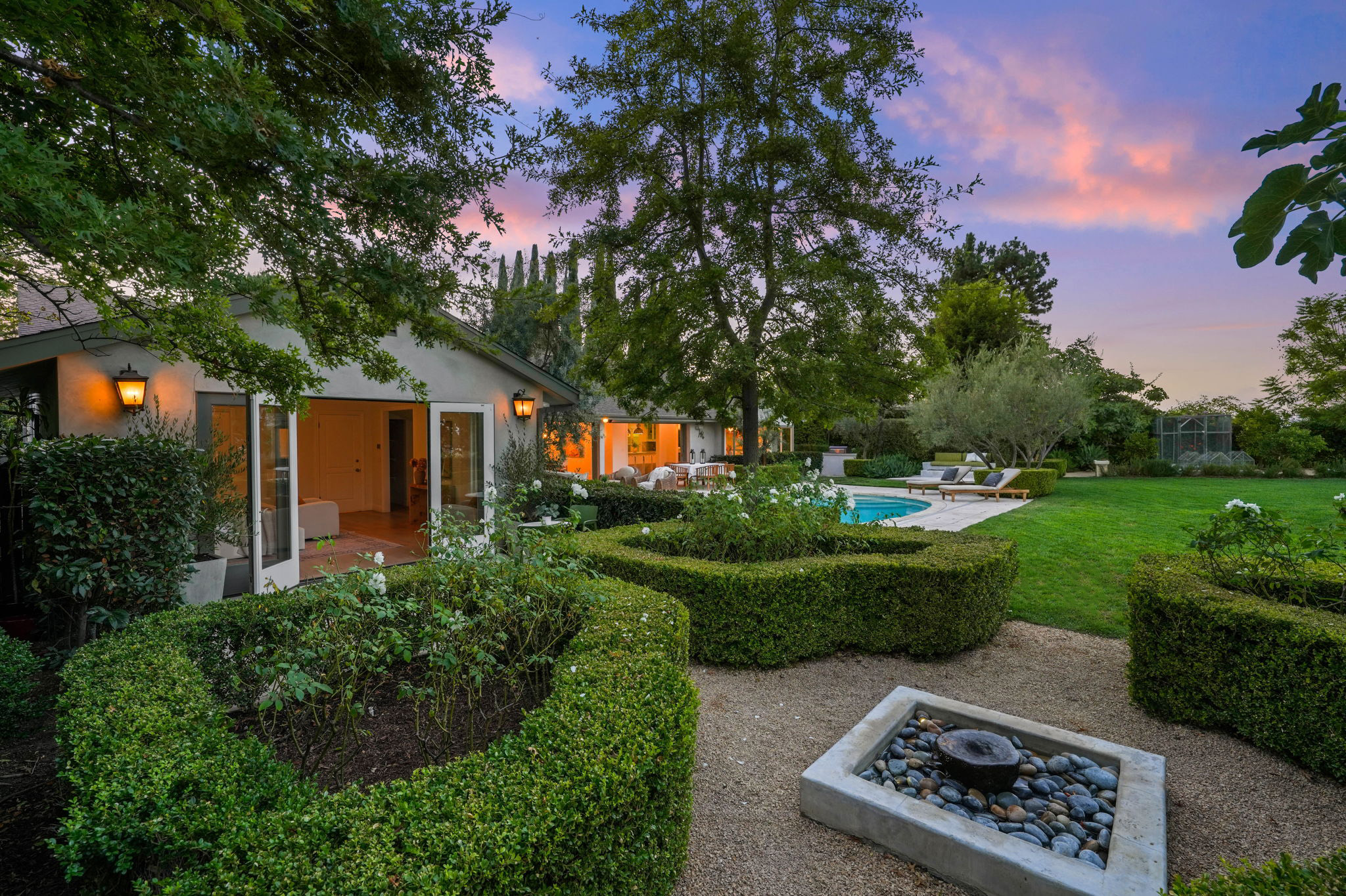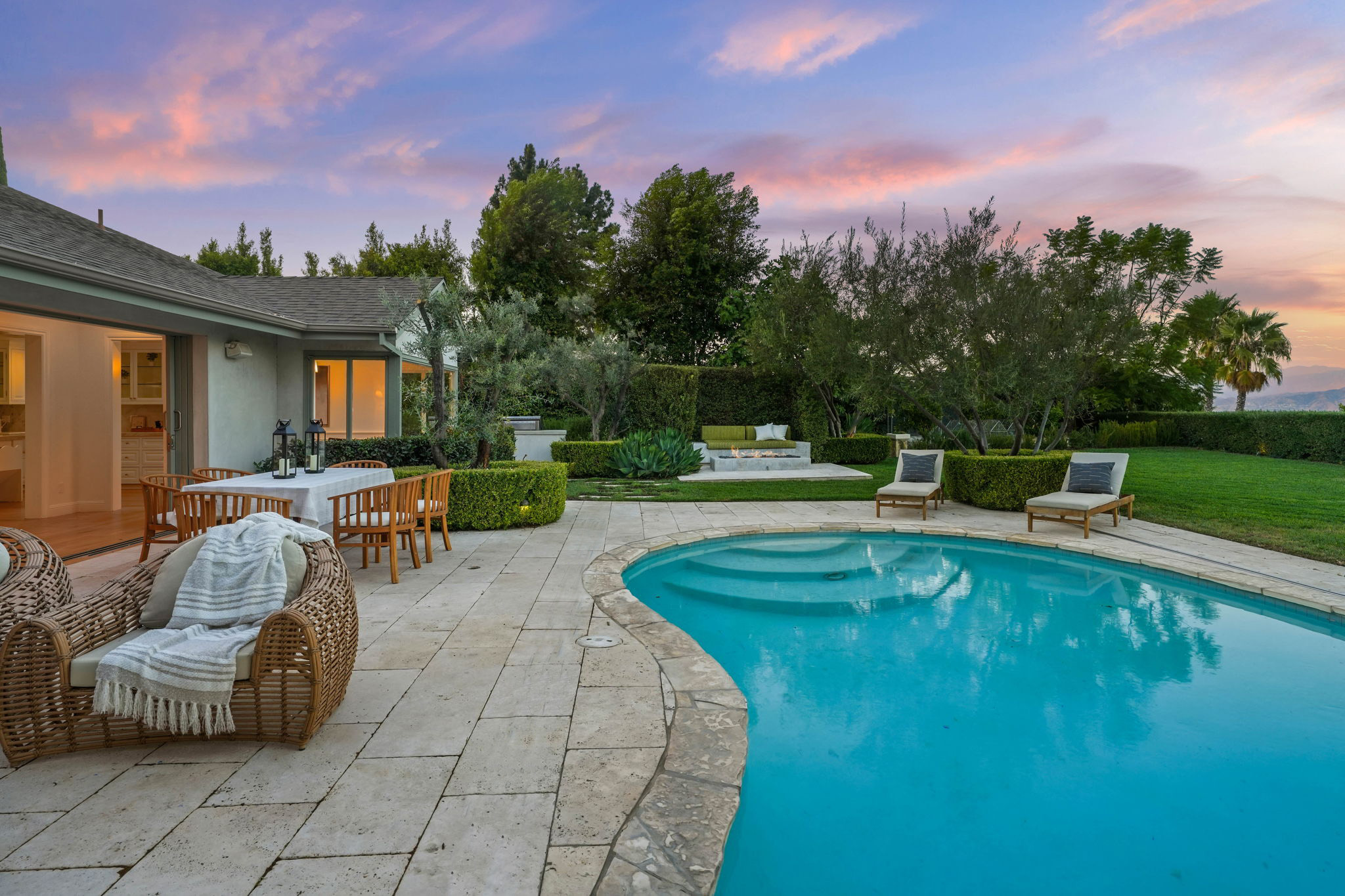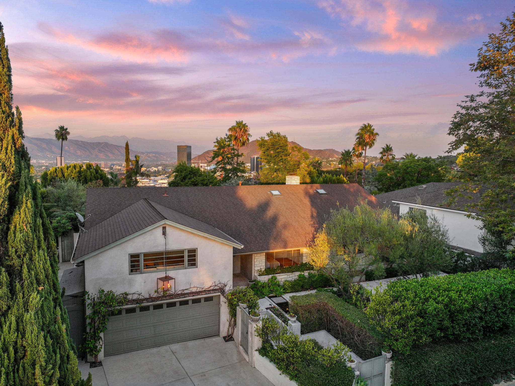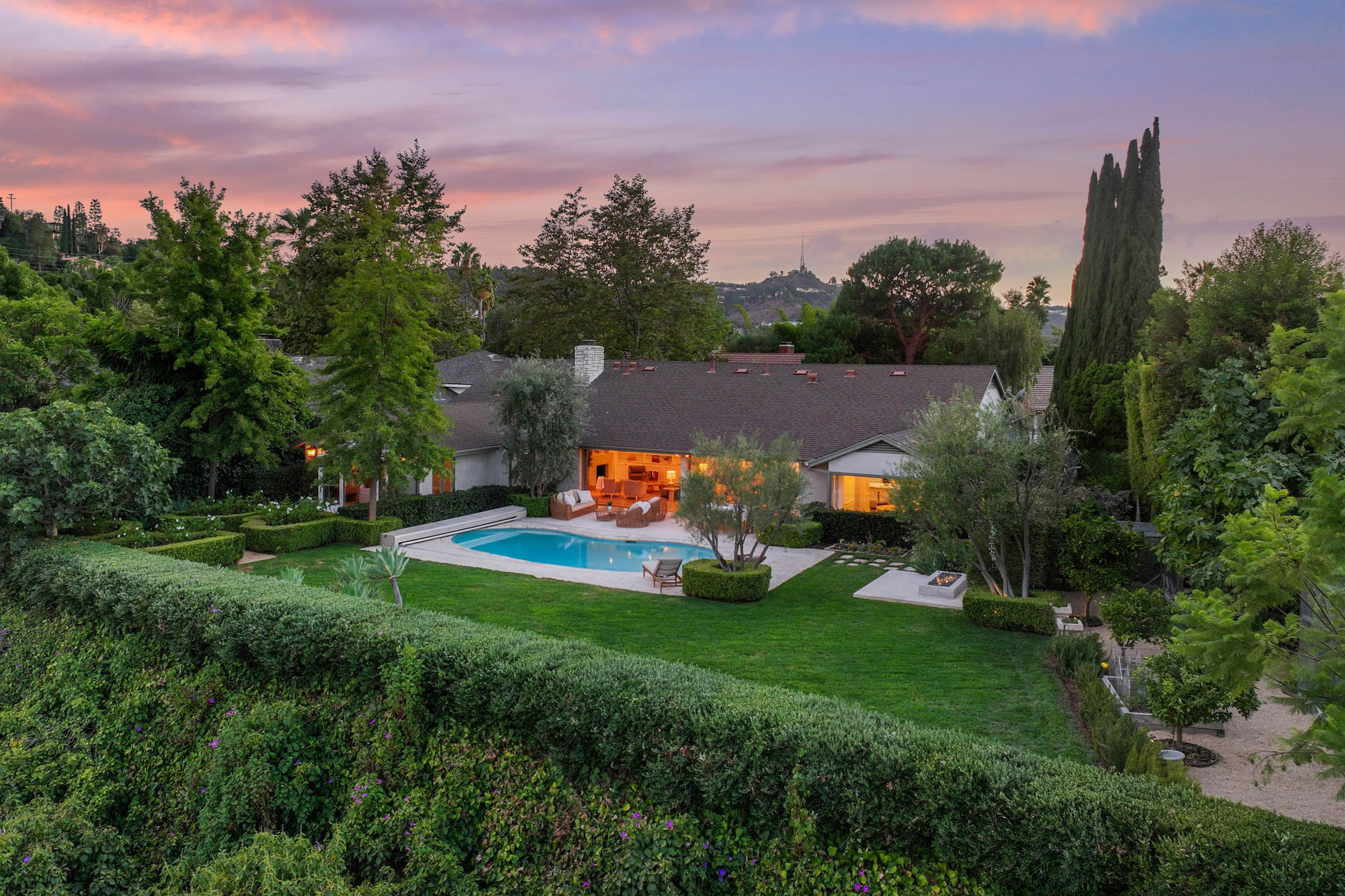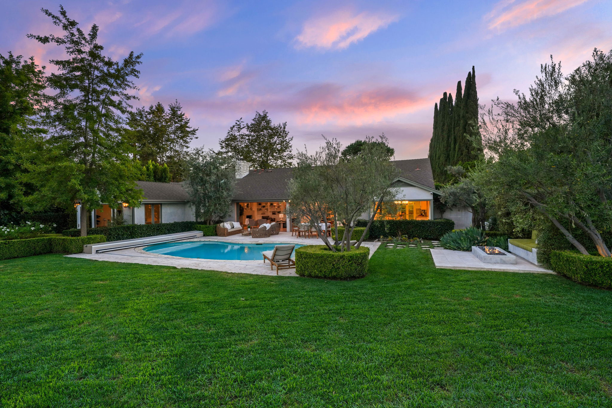 Nestled on a tranquil cul-de-sac in the scenic hills of Studio City, this exceptional trophy property offers unrivaled privacy and breathtaking vistas of the city and mountains. This exquisite single-story residence boasts four bedrooms and four bathrooms, gracefully set on an expansive 15,000+ sq. ft. flat lot adorned with rolling grassy lawns and meticulously manicured grounds. The interior is strikingly sophisticated, featuring a dramatic open floor plan enhanced by elegant white oak floors and expansive walls of glass that create a seamless connection between indoor and outdoor spaces. The entertainer's yard is a true oasis, complete with a sparkling pool, a barbecue area, built-in outdoor seating, a fire pit, and herb, citrus, and rose gardens. The gourmet kitchen is a culinary masterpiece, showcasing luxurious marble countertops, custom-milled cabinetry, a farmhouse sink, and top-of-the-line appliances, including a breathtaking La Cornue range. The bright primary suite opens to a private patio and is accompanied by a spa-like ensuite bathroom clad in marble, featuring a dual vanity, a steam shower, and a spacious walk-in closet. Surrounded by exquisitely landscaped grounds, including a gated front yard with a tranquil fountain and stately olive trees, this property is impeccably designed for even the most discerning occupant. Additional amenities include a two-car garage with ample driveway parking.