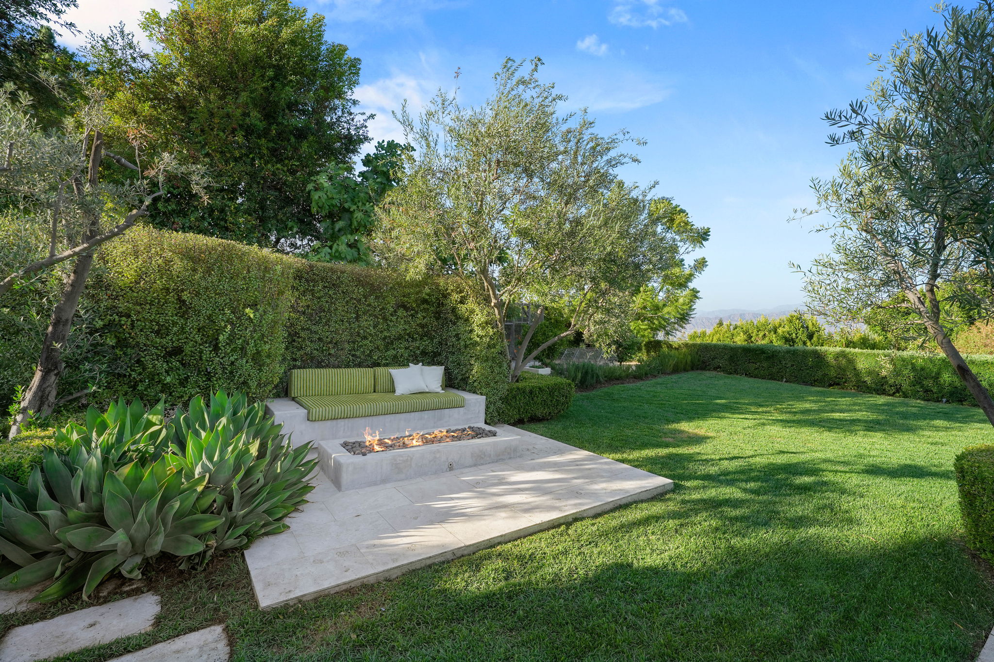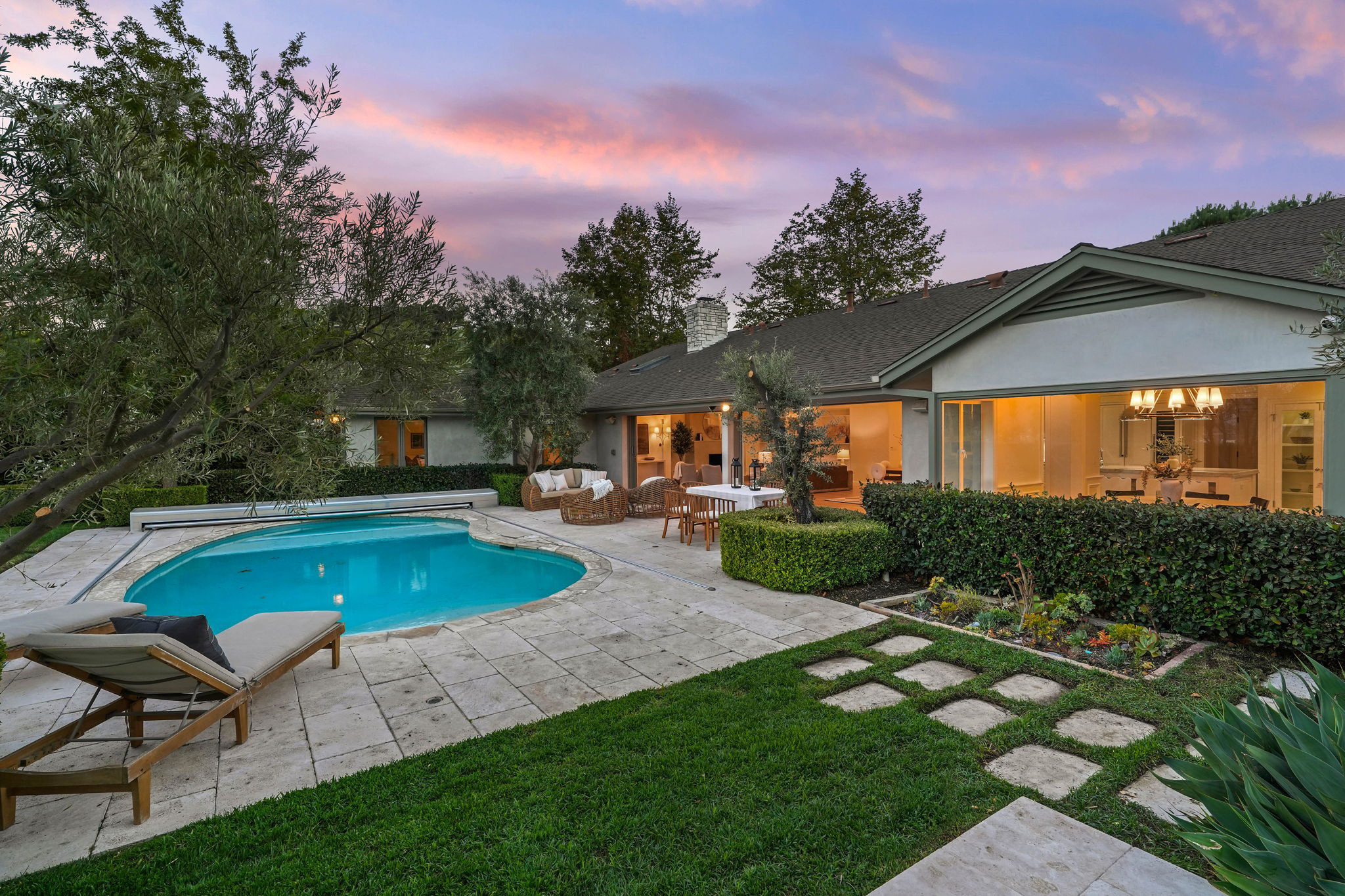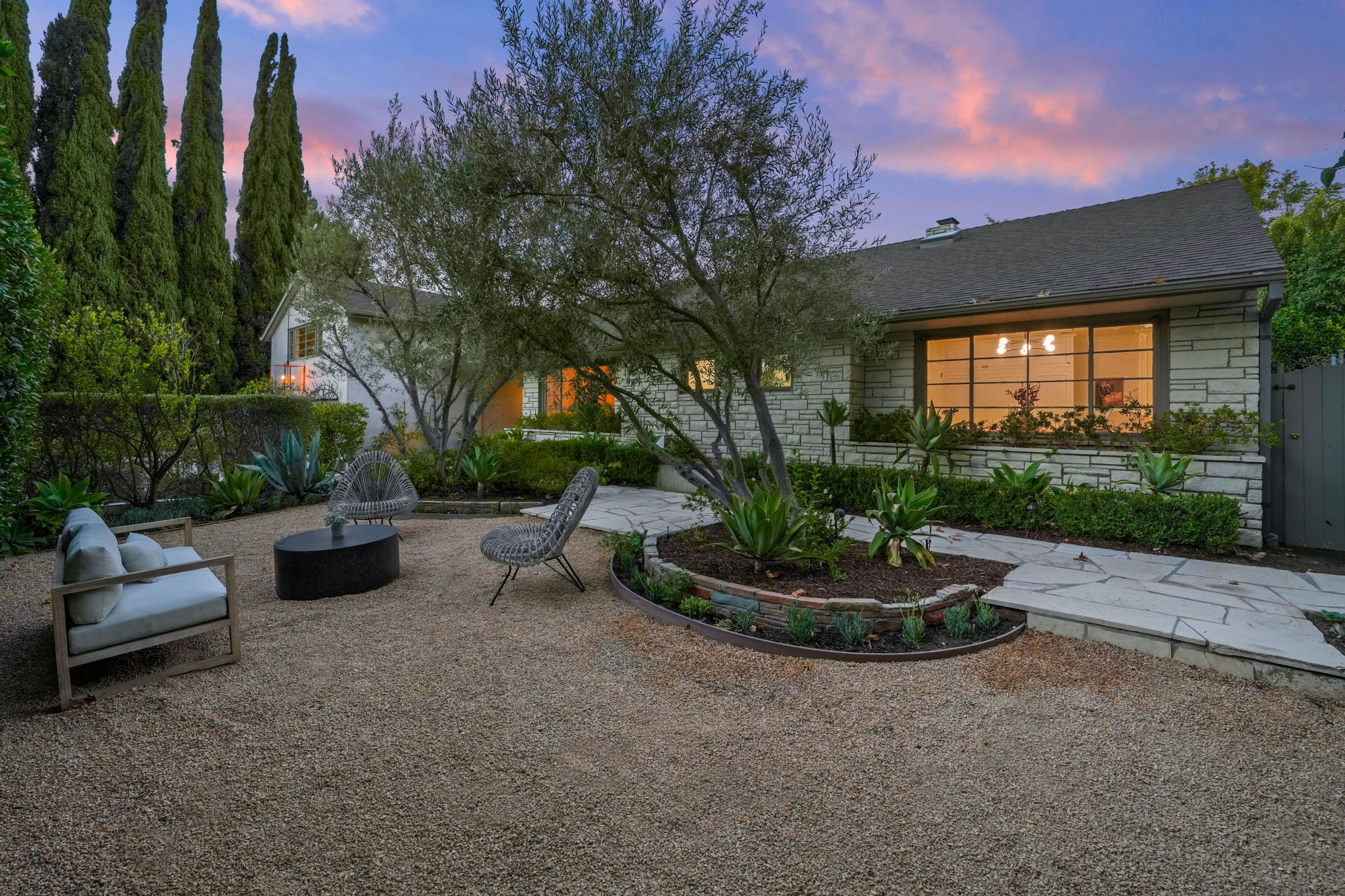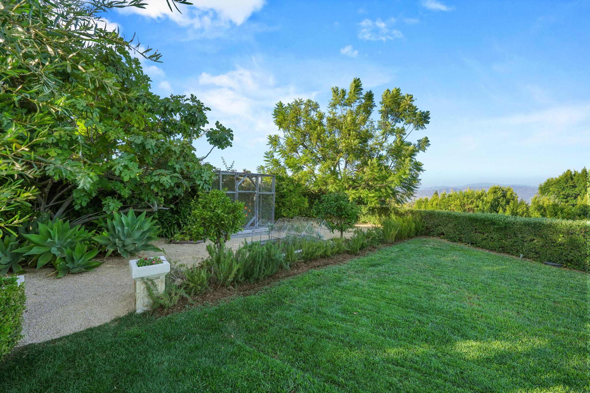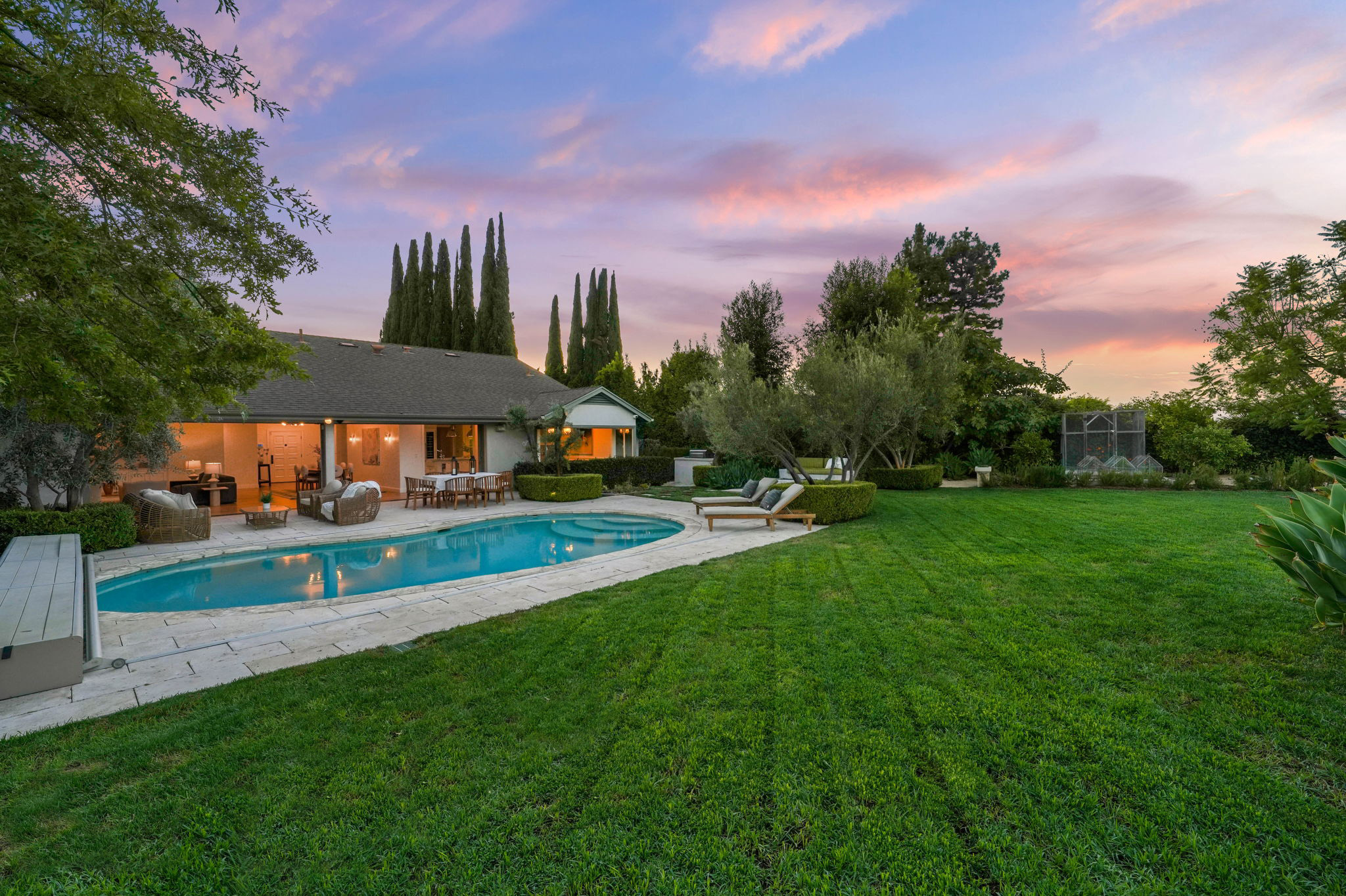 Nestled on a tranquil cul-de-sac in the scenic hills of Studio City, this exceptional trophy property offers unrivaled privacy and breathtaking vistas of the city and mountains. This exquisite single-story residence boasts four bedrooms and four bathrooms, gracefully set on an expansive 15,000+ sq. ft. flat lot adorned with rolling grassy lawns and meticulously manicured grounds. The interior is strikingly sophisticated, featuring a dramatic open floor plan enhanced by elegant white oak floors and expansive walls of glass that create a seamless connection between indoor and outdoor spaces. The entertainer's yard is a true oasis, complete with a sparkling pool, a barbecue area, built-in outdoor seating, a fire pit, and herb, citrus, and rose gardens. The gourmet kitchen is a culinary masterpiece, showcasing luxurious marble countertops, custom-milled cabinetry, a farmhouse sink, and top-of-the-line appliances, including a breathtaking La Cornue range. The bright primary suite opens to a private patio and is accompanied by a spa-like ensuite bathroom clad in marble, featuring a dual vanity, a steam shower, and a spacious walk-in closet. Surrounded by exquisitely landscaped grounds, including a gated front yard with a tranquil fountain and stately olive trees, this property is impeccably designed for even the most discerning occupant. Additional amenities include a two-car garage with ample driveway parking.