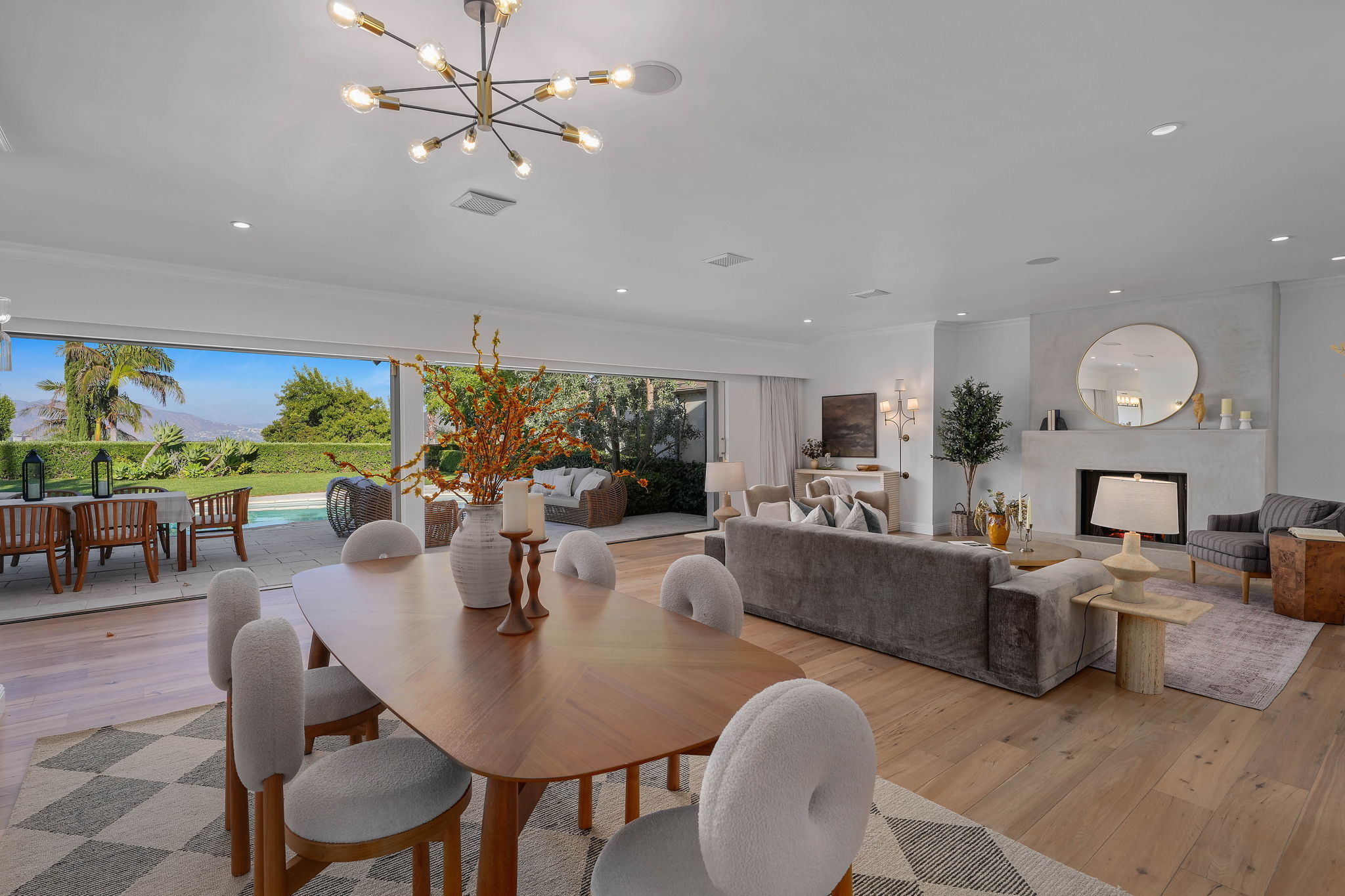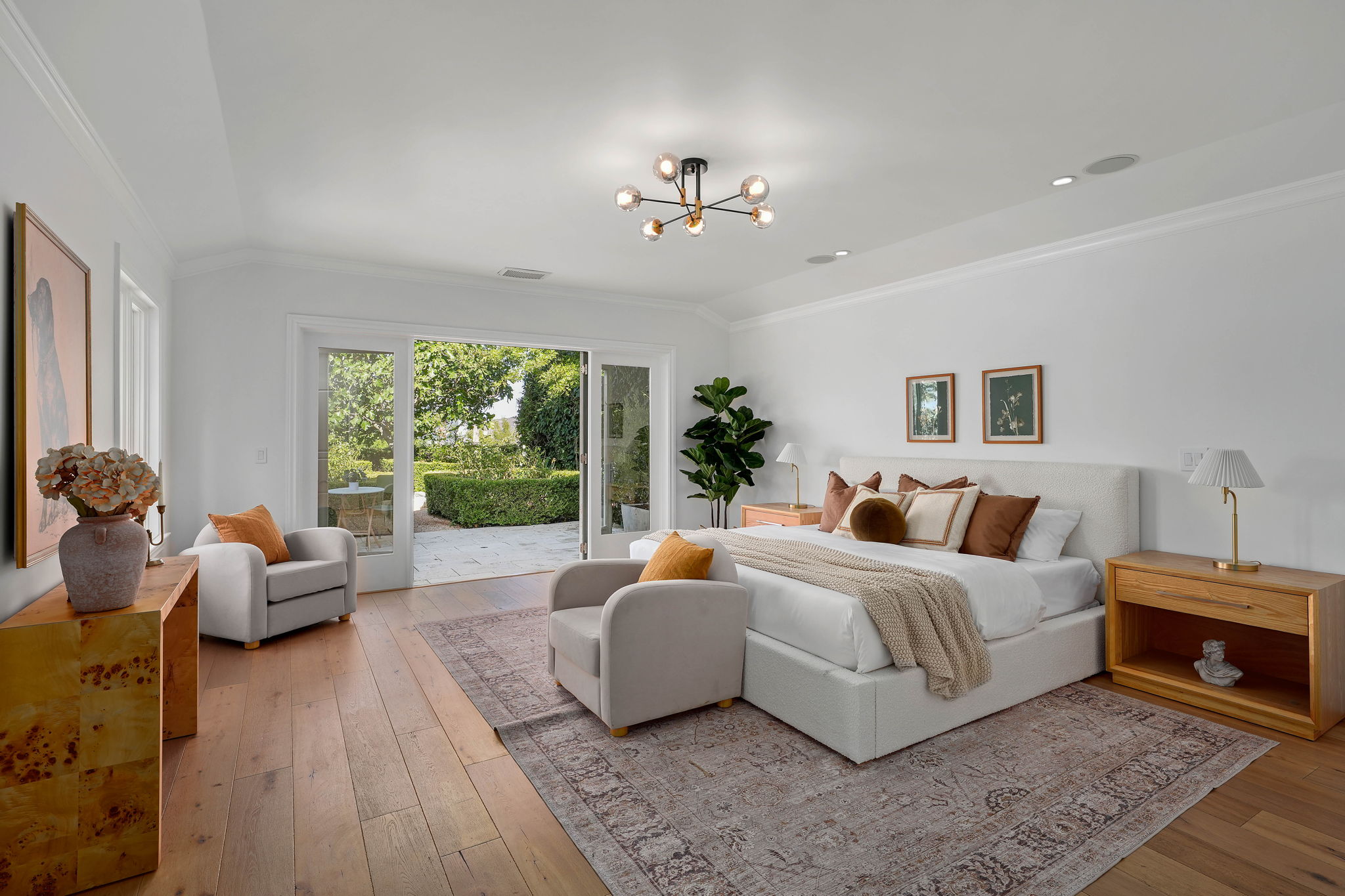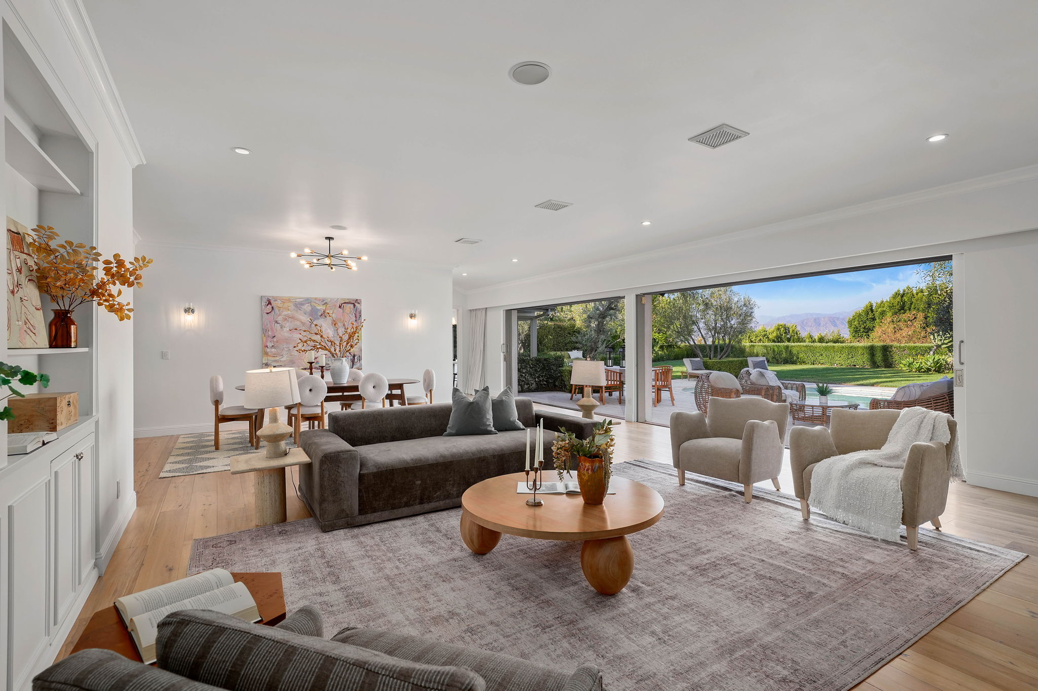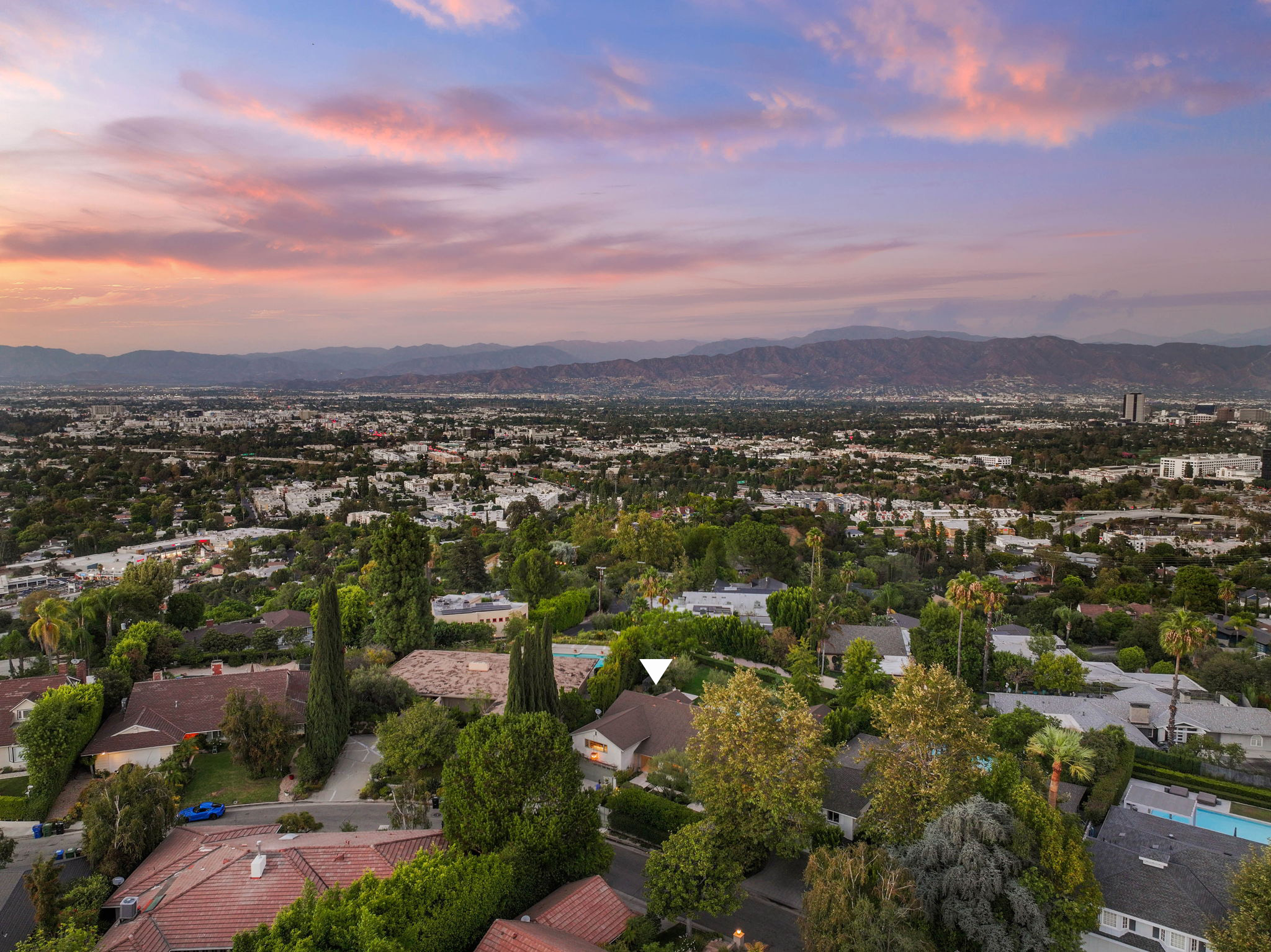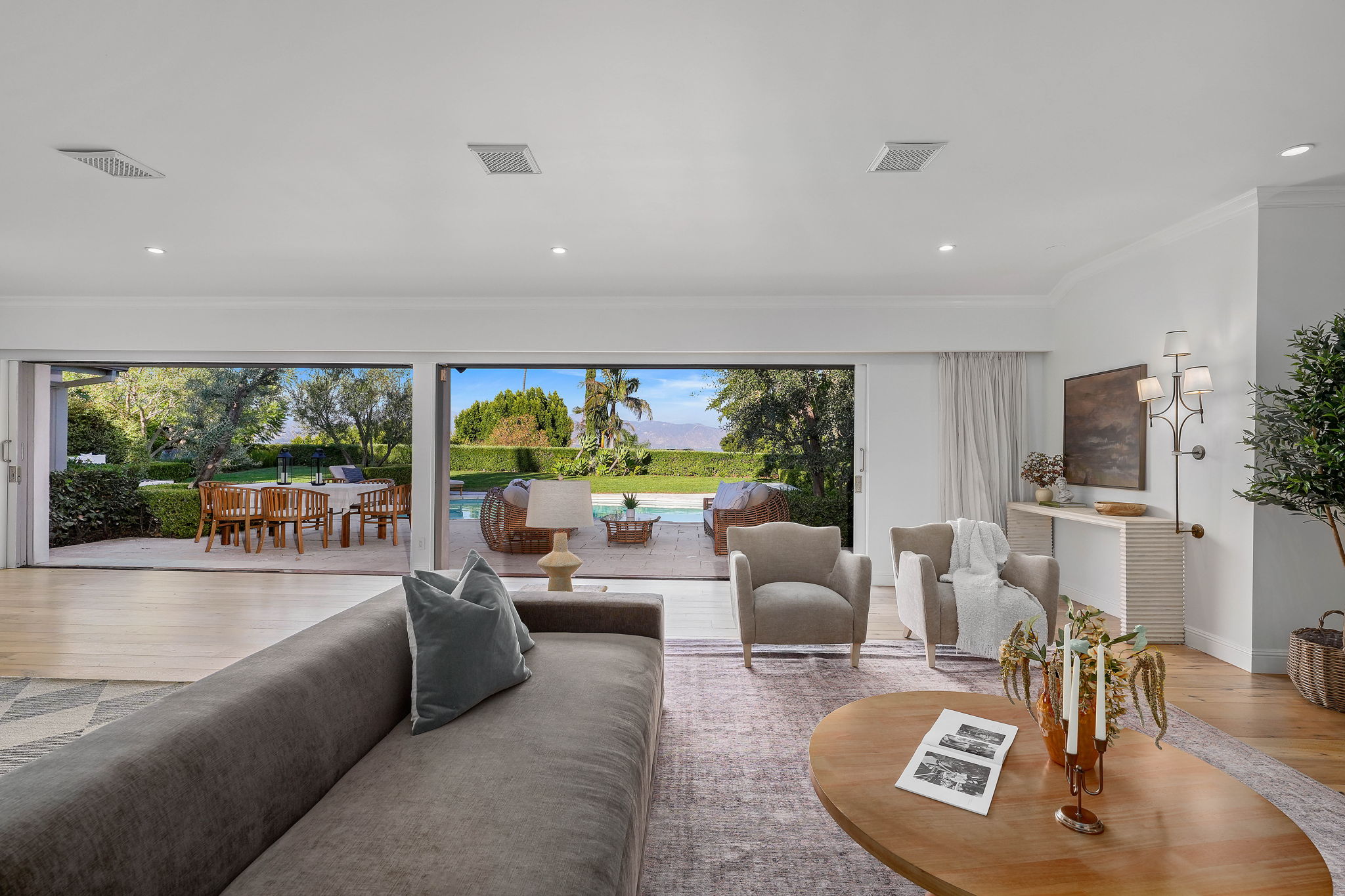 Nestled on a tranquil cul-de-sac in the scenic hills of Studio City, this exceptional trophy property offers unrivaled privacy and breathtaking vistas of the city and mountains. This exquisite single-story residence boasts four bedrooms and four bathrooms, gracefully set on an expansive 15,000+ sq. ft. flat lot adorned with rolling grassy lawns and meticulously manicured grounds. The interior is strikingly sophisticated, featuring a dramatic open floor plan enhanced by elegant white oak floors and expansive walls of glass that create a seamless connection between indoor and outdoor spaces. The entertainer's yard is a true oasis, complete with a sparkling pool, a barbecue area, built-in outdoor seating, a fire pit, and herb, citrus, and rose gardens. The gourmet kitchen is a culinary masterpiece, showcasing luxurious marble countertops, custom-milled cabinetry, a farmhouse sink, and top-of-the-line appliances, including a breathtaking La Cornue range. The bright primary suite opens to a private patio and is accompanied by a spa-like ensuite bathroom clad in marble, featuring a dual vanity, a steam shower, and a spacious walk-in closet. Surrounded by exquisitely landscaped grounds, including a gated front yard with a tranquil fountain and stately olive trees, this property is impeccably designed for even the most discerning occupant. Additional amenities include a two-car garage with ample driveway parking.