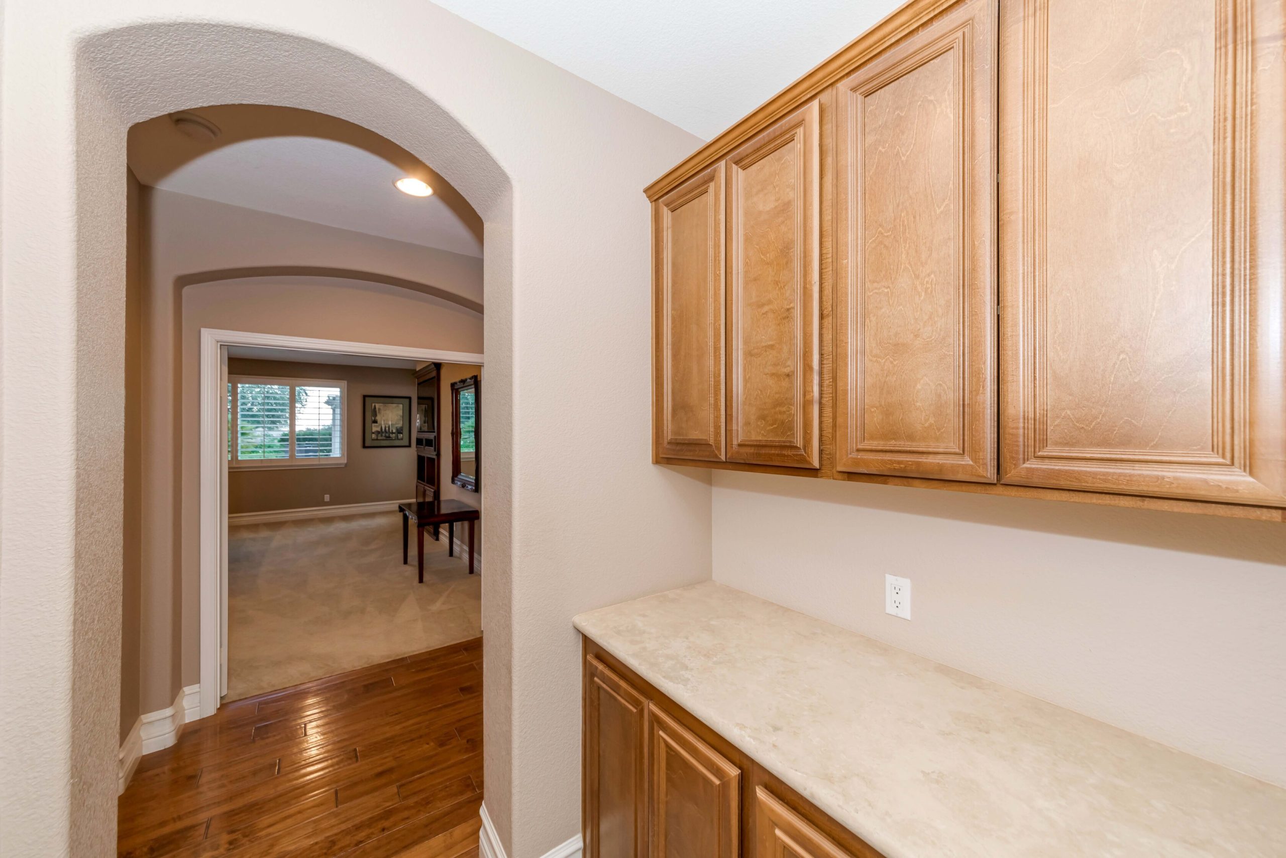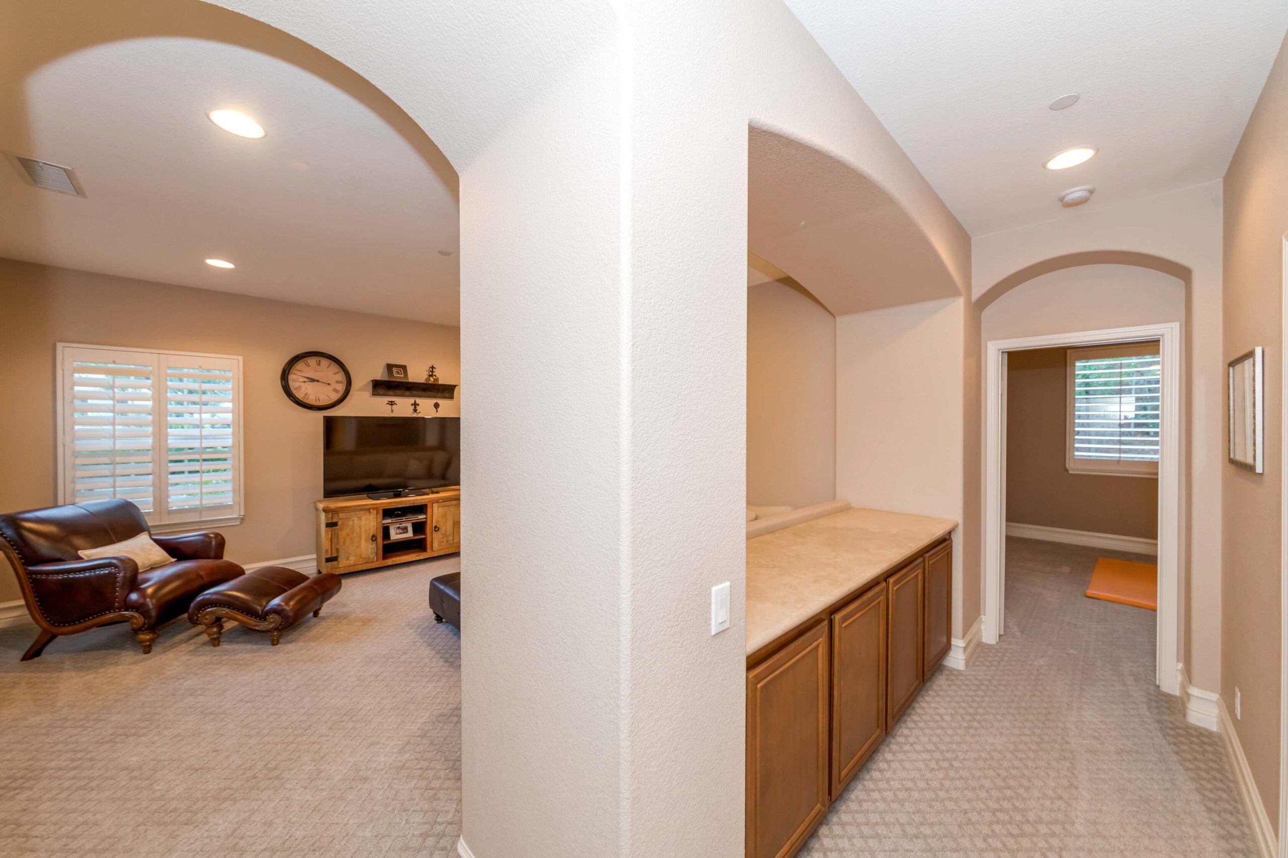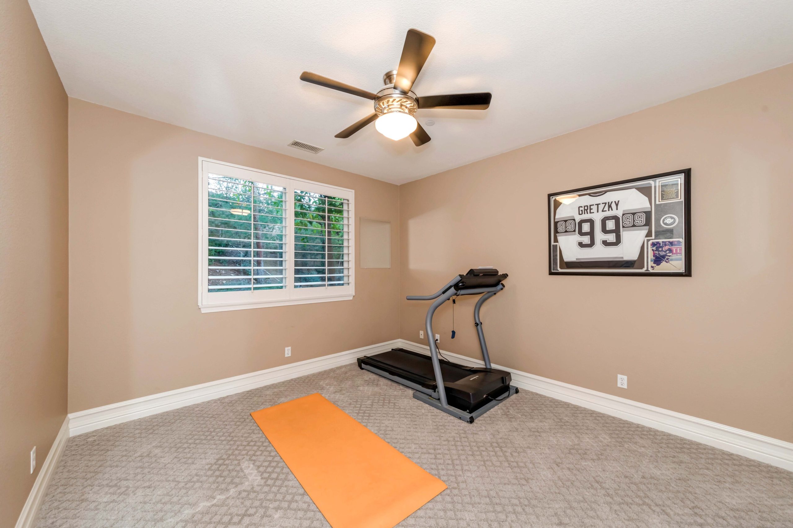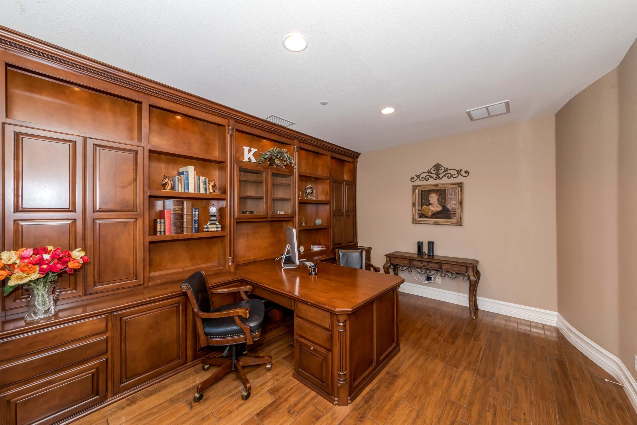 doors provides a sophisticated workspace adorned with custom-built desks and cabinets. The bonus room offers flexibility, allowing you to tailor