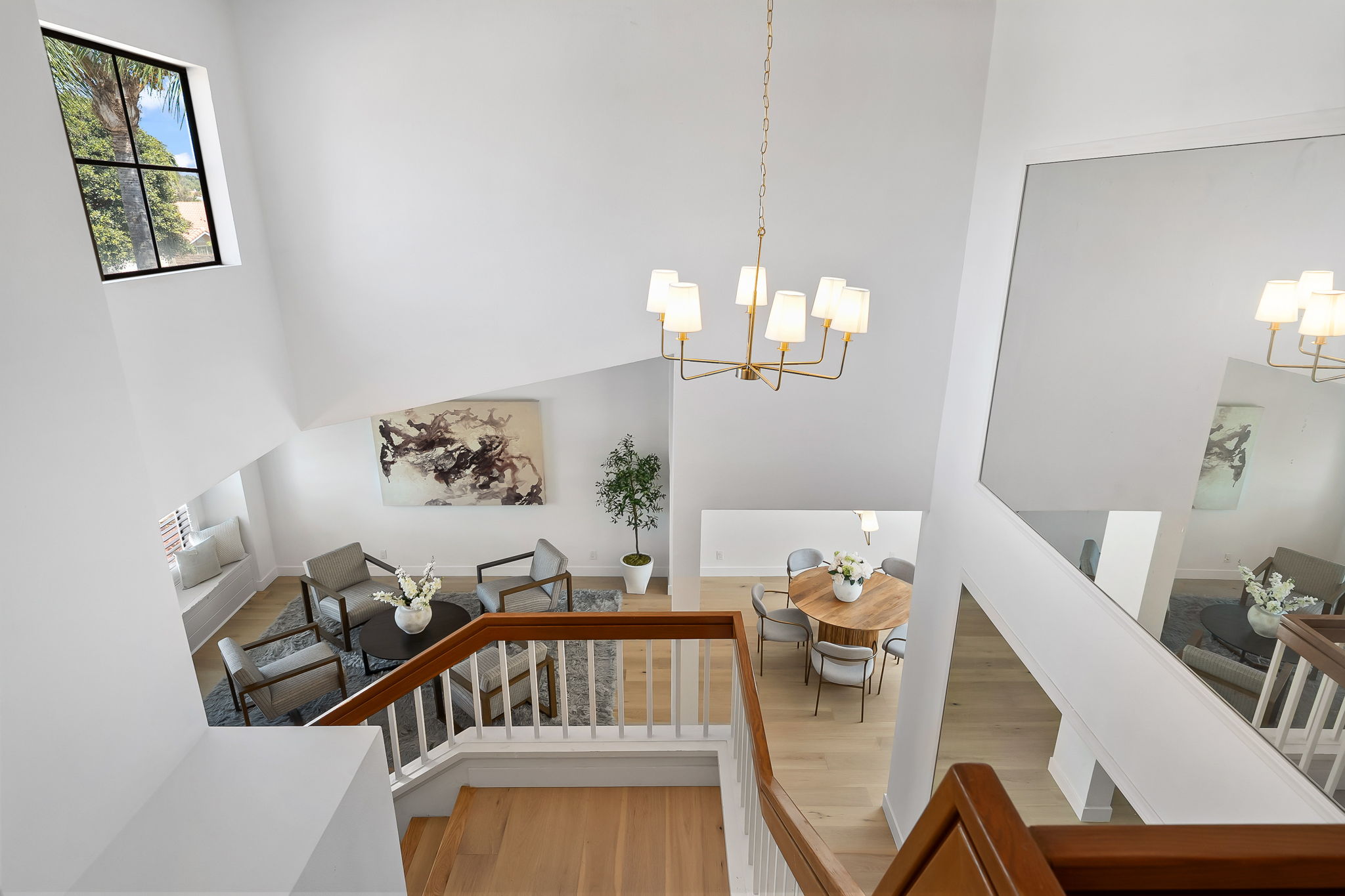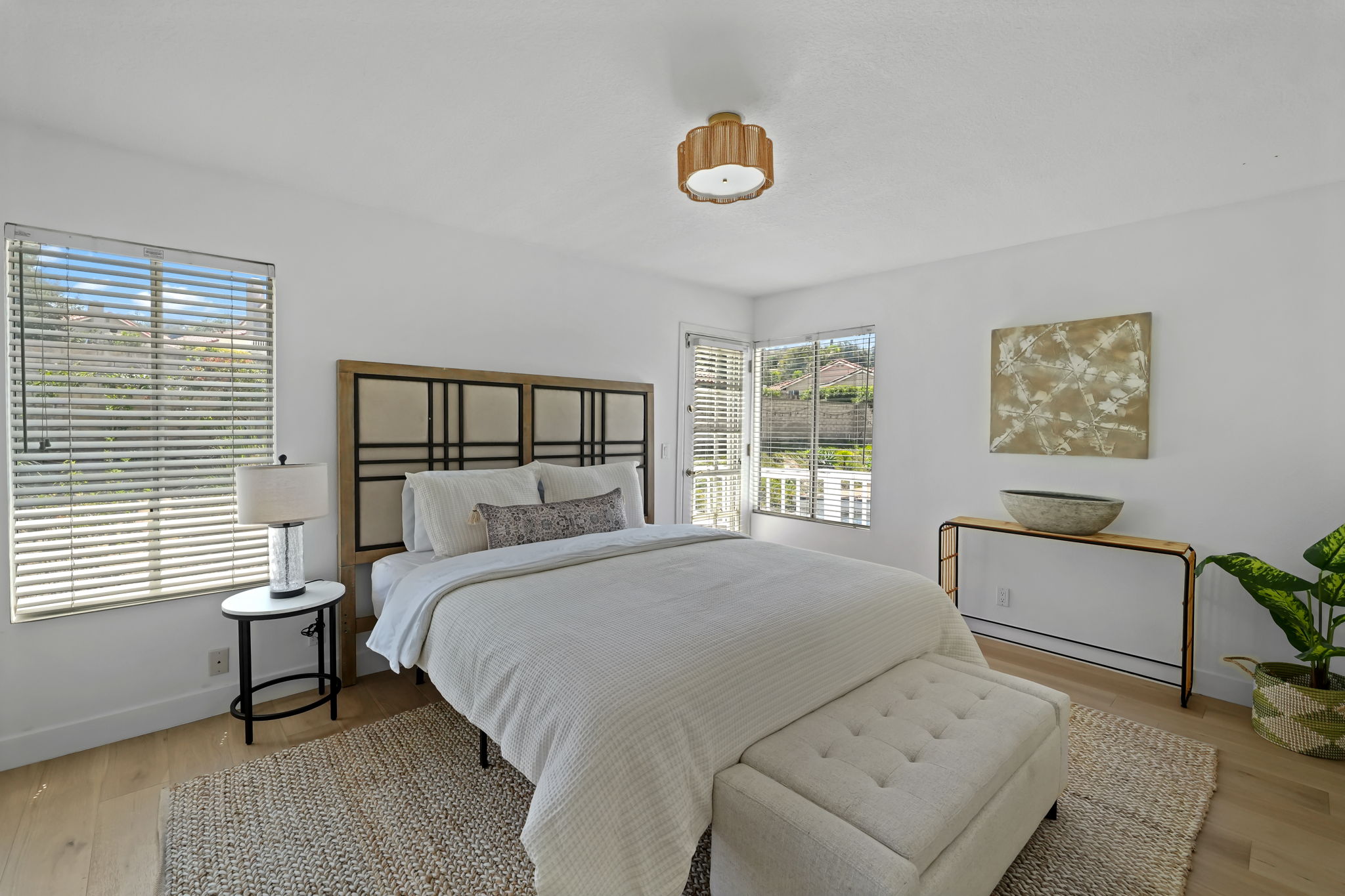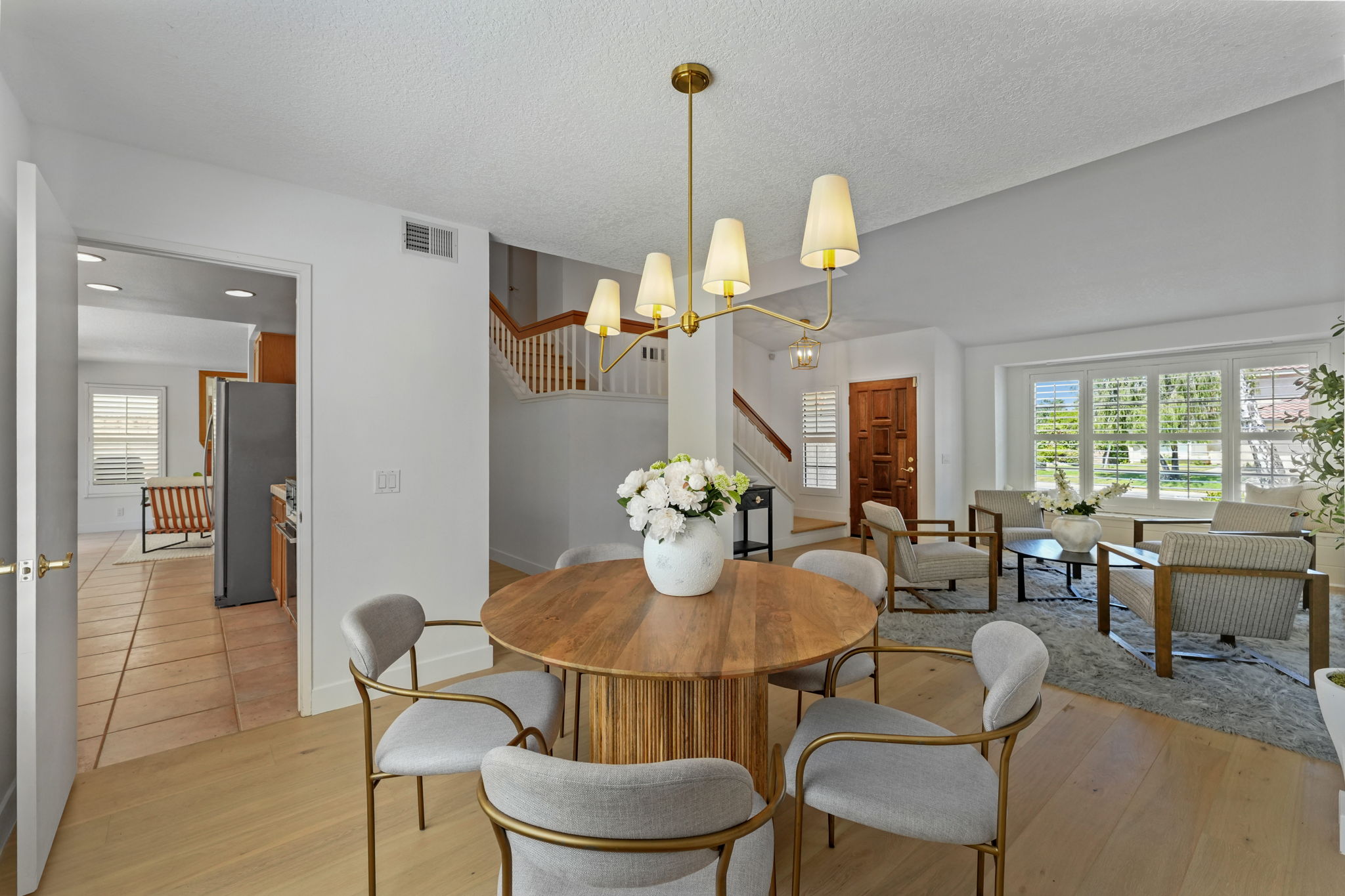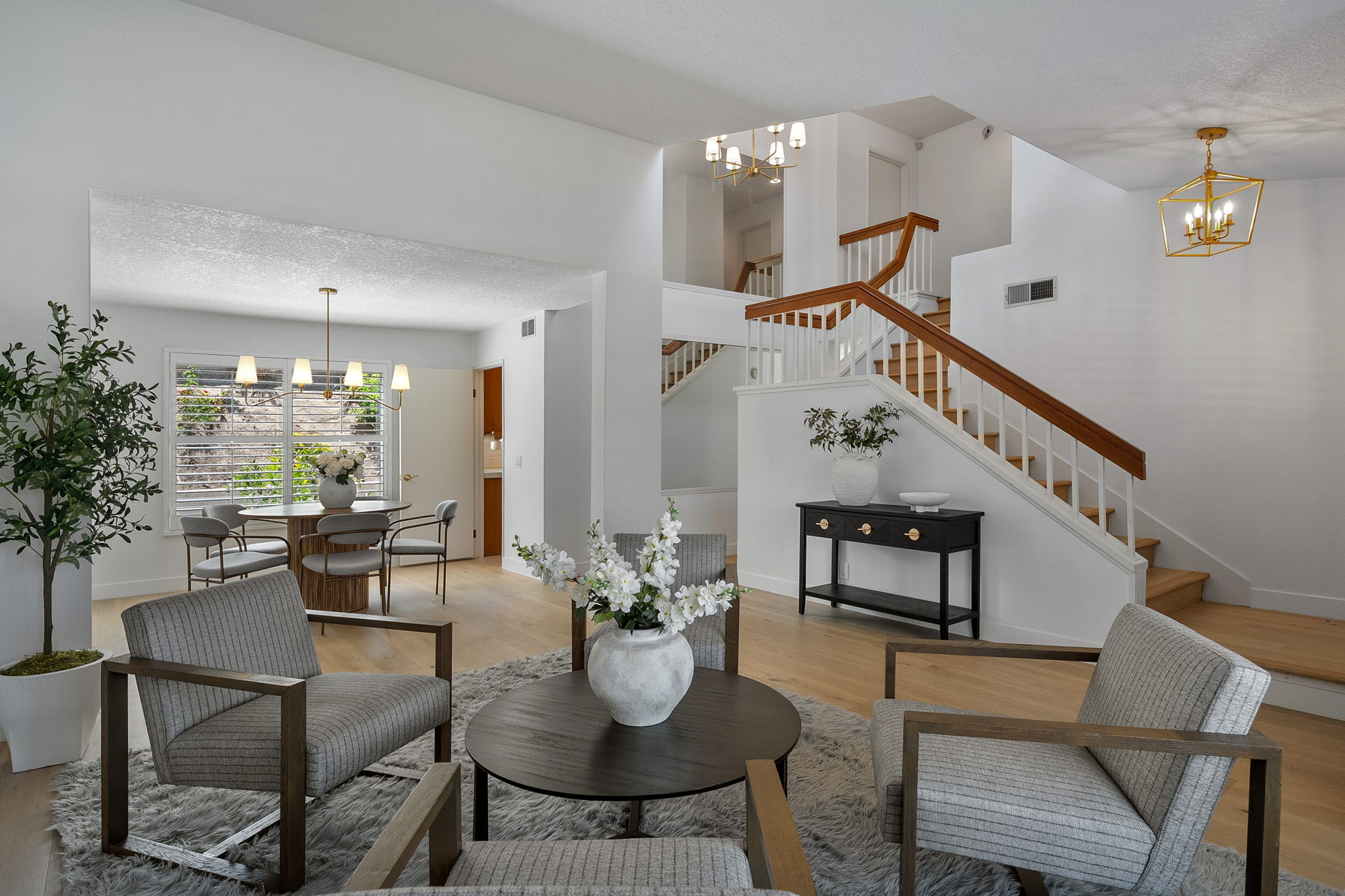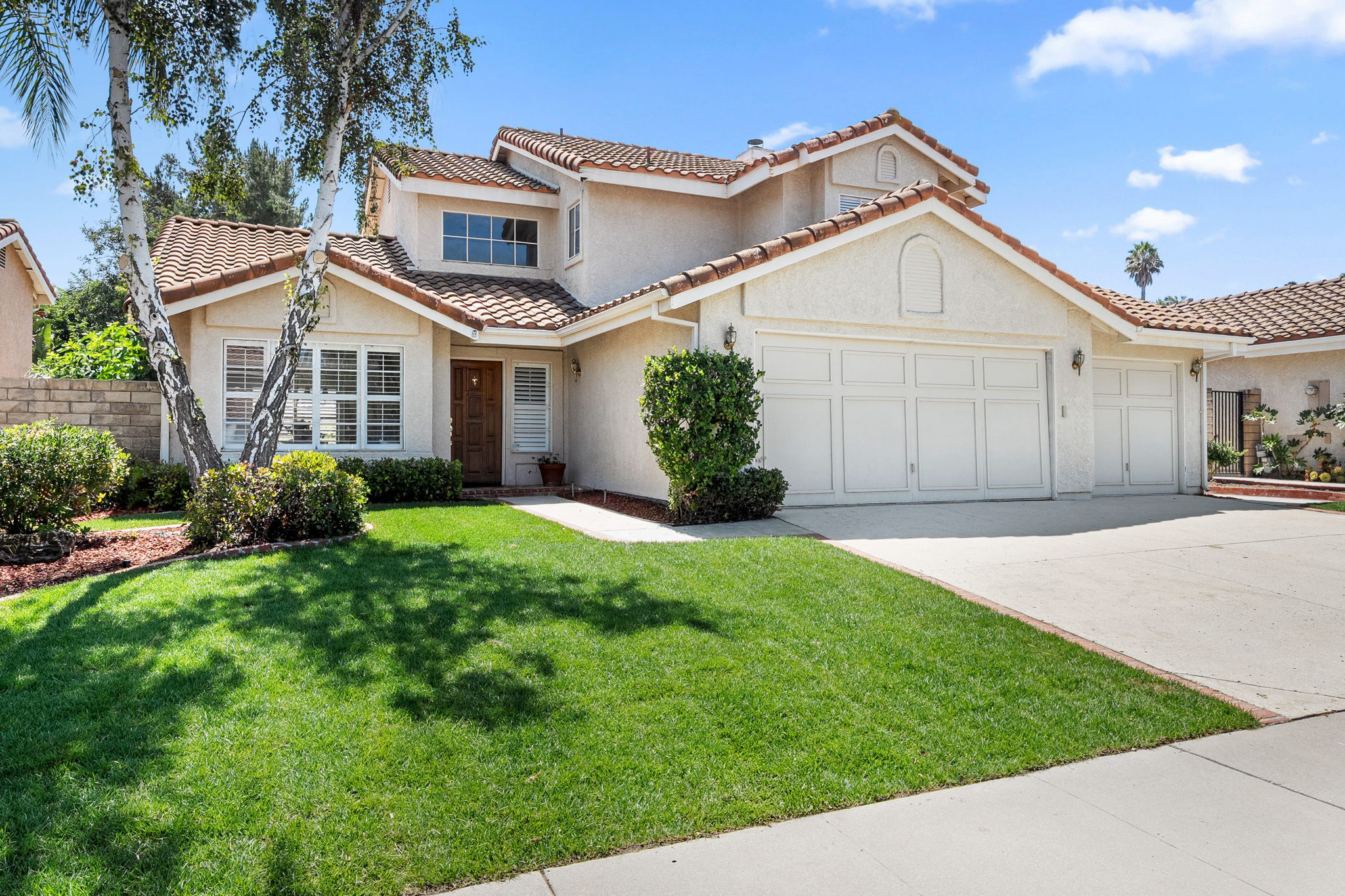 Discover unparalleled charm in this exquisite Moorpark home, nestled in the desirable Peach Hill community. This home captivates with inviting curb appeal, a spacious 3-car garage, and an open-concept layout designed for modern living. Step through the welcoming entryway into a bright living and dining area, where soaring vaulted ceilings create an airy ambiance. Newly installed luxury wide-plank oak hardwood flooring flows seamlessly throughout, adding warmth and sophistication. The dining area transitions effortlessly into the kitchen, overlooking a cozy family room anchored by a charming brick fireplace. Sliding glass doors lead to an expansive backyard, brimming with potential for a lush lawn, playhouse, or pool (buyer to verify). Entertain in style under the covered patio, perfect for al fresco dining. The main level also features a convenient indoor laundry room and powder room. Ascend the grand, extra-wide staircase, illuminated by a stunning chandelier, to the upper level. The primary suite is a private sanctuary, boasting two closets, a spacious ensuite bathroom with double vanity sinks, soaking tub and shower, and access to an expansive deck overlooking the tranquil backyard. Two additional guest bedrooms and a full bathroom complete the upstairs, offering comfort and versatility. Located minutes from top-rated schools, dining, shopping, and easy freeway access, this home combines convenience with the freedom of no HOA fees.