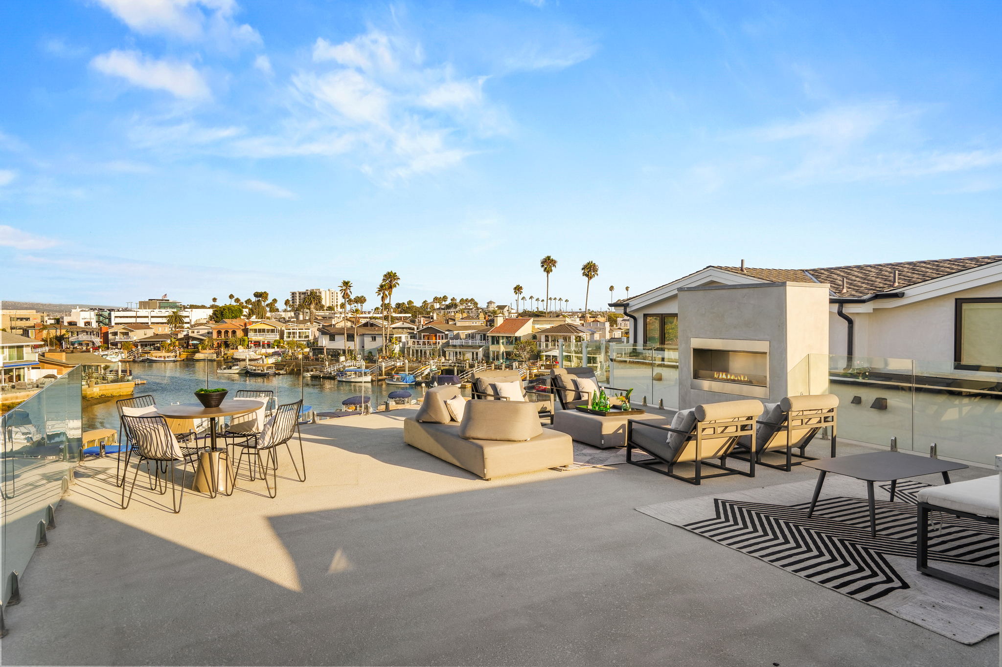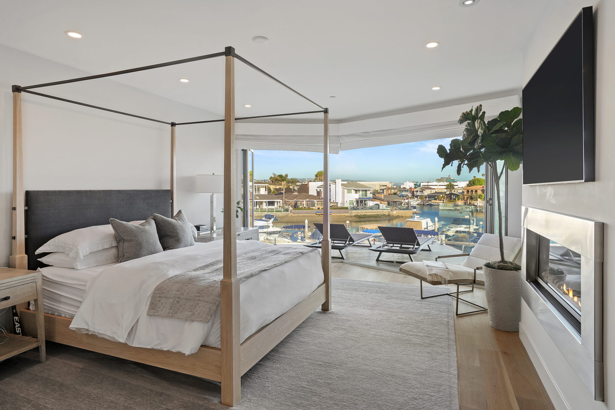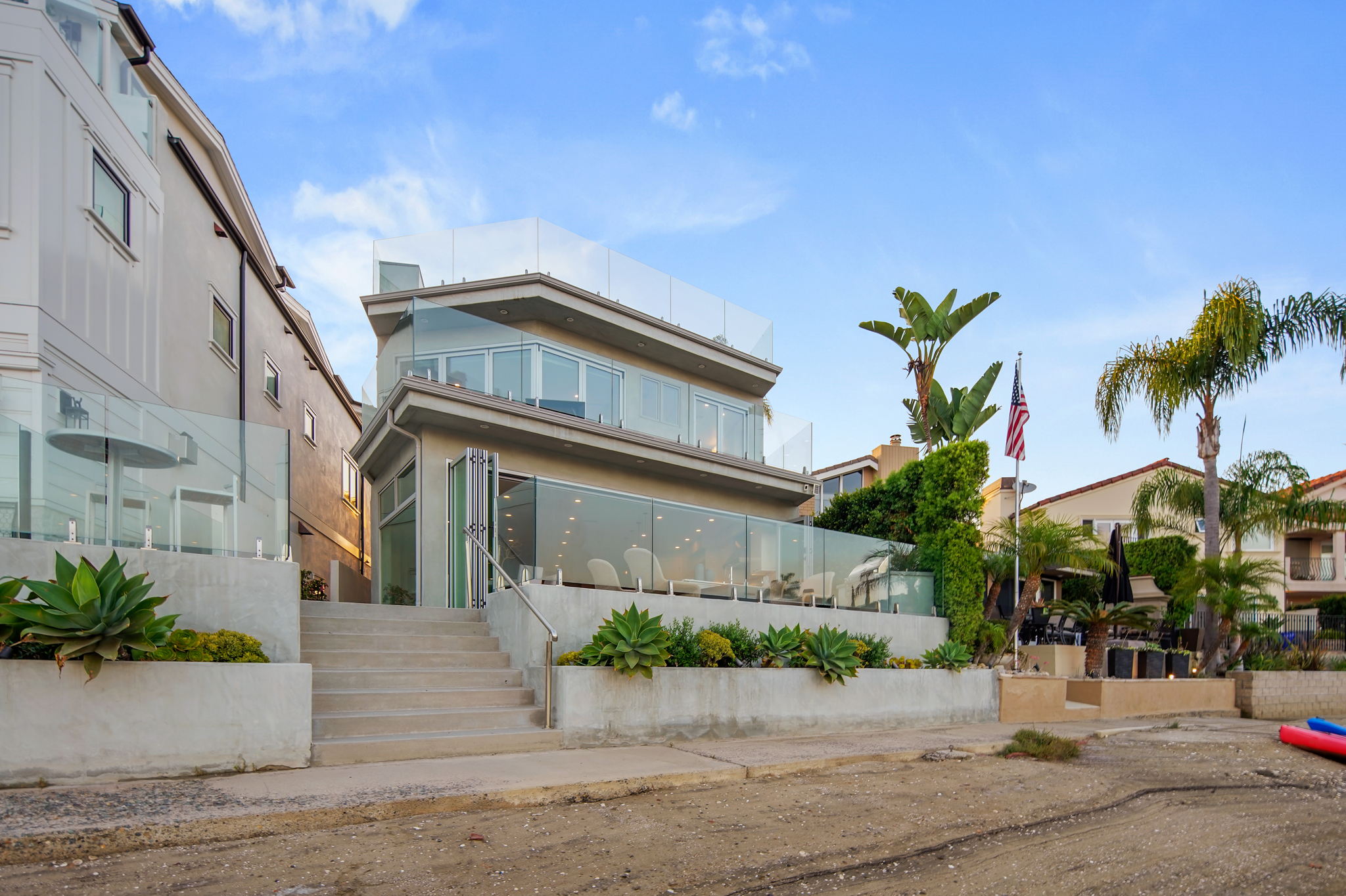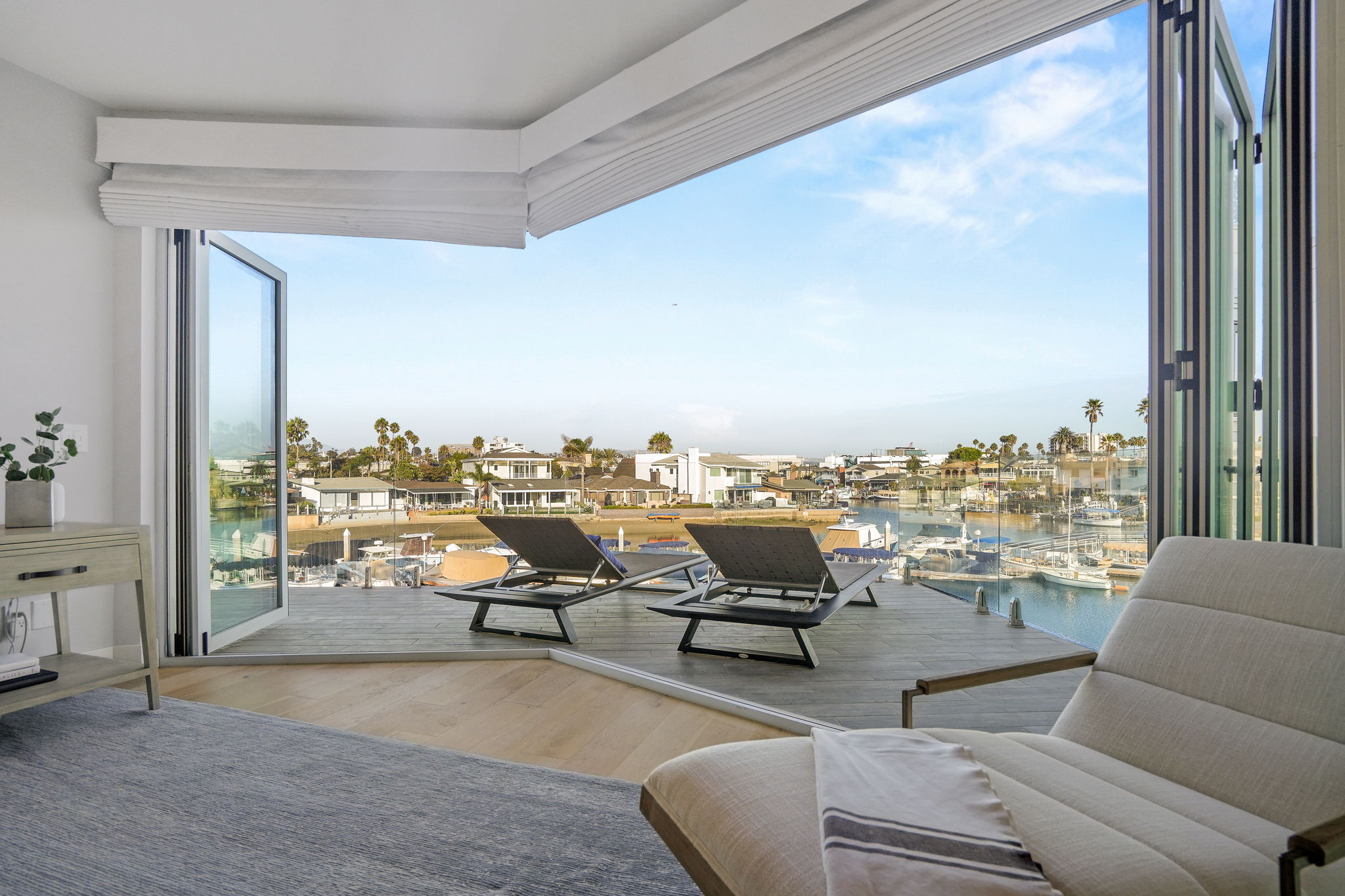 Escape to one of only 68 homes in this private gated enclave of Balboa Coves. Steps from your own sandy beach and private dock that can accommodate a 35' boat, this contemporary masterpiece offers unobstructed water views with coastal chic sophistication. An elevator servicing all three levels allows for ease of navigation around this inviting and relaxed family beach home. The main level is characterized by refined Newport design, featuring an open great-room with french oak floors, fashionable fireplace, accordion doors opening to the fresh ocean breezes and outdoor retreat with the sand below your feet. A chef-worthy kitchen features a Wolf range, Sub-Zero refrigerator, large pantry and exquisite island with ample bar seating for entertaining. A relaxed dining area overlooking the water, an ensuite bedroom and additional powder room complete the main level. Awake every morning to crisp bay views in the primary ensuite bedroom and enjoy your coffee on the expansive balcony. Soak in the freestanding tub or shower while basking in the breathtaking bay views. Dual sinks and vanities and a spacious walk-in closet by Closet World top it off. Two additional ensuite bedrooms and a laundry room complete the second level. Host your friends and family on the spectacular rooftop deck with panoramic views and elevator access. Over 1000 sq.ft. of entertaining space makes this the perfect setting overlooking the Newport Beach bay. If the stars aligned you would see it from this roofdeck. This turnkey stunner is further highlighted by advanced home automation, including Lutron shades throughout, surveillance cameras, hue lighting and voice programmable thermostats, all controllable from wherever you are, an ideal setup for a second home. For the serial entrepreneur, the oversized two car garage has a built-out office area with air-conditioning. With a private park and ample guest parking, there's no better place to raise a family or spend time with loved ones. Walking distance to the trendy Lido Marina Village, boutiques, cafes and restaurants, and only a moment's drive to Fashion Island and world-class golf courses, don't hesitate to make this bayfront home your own!