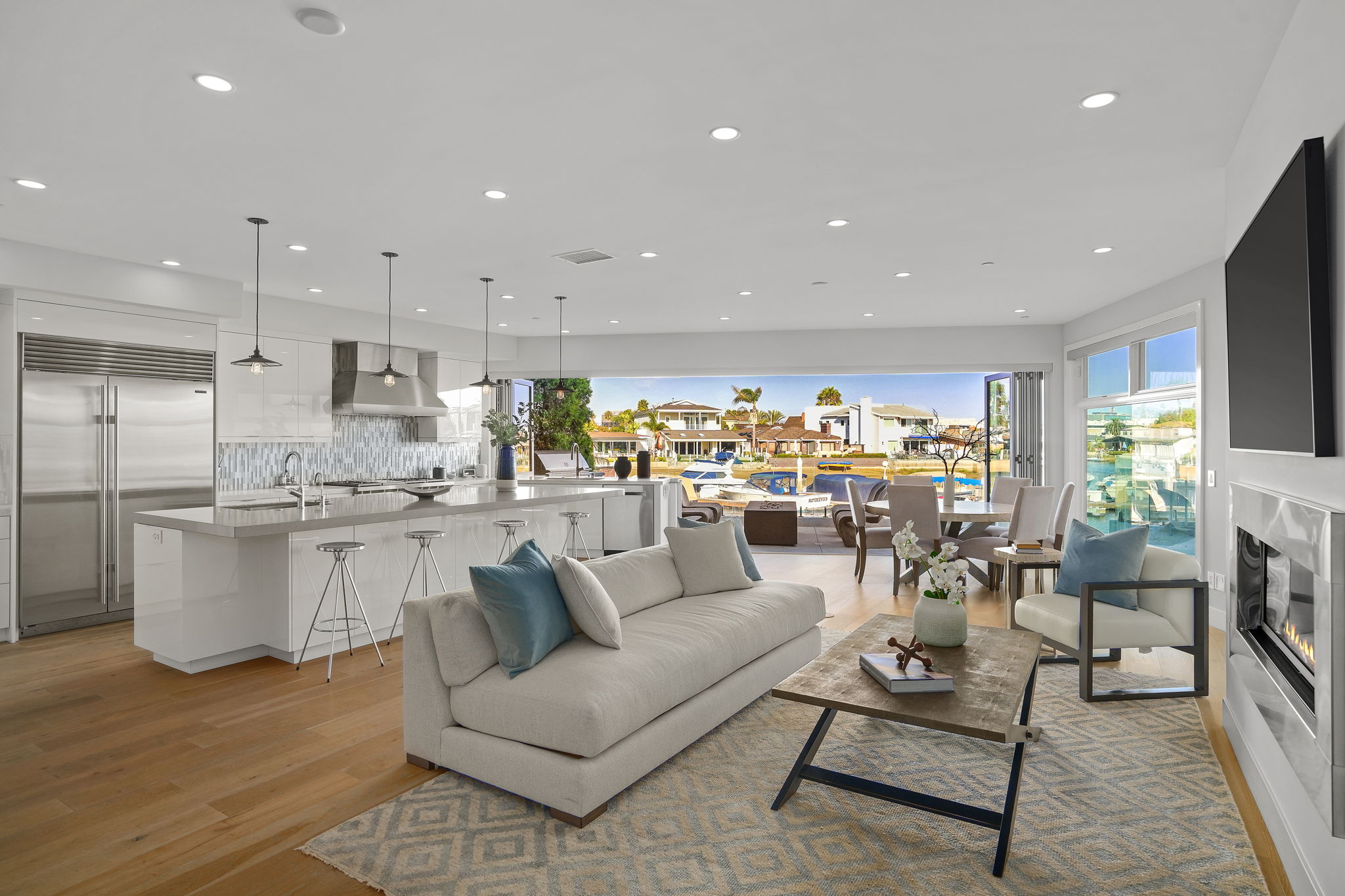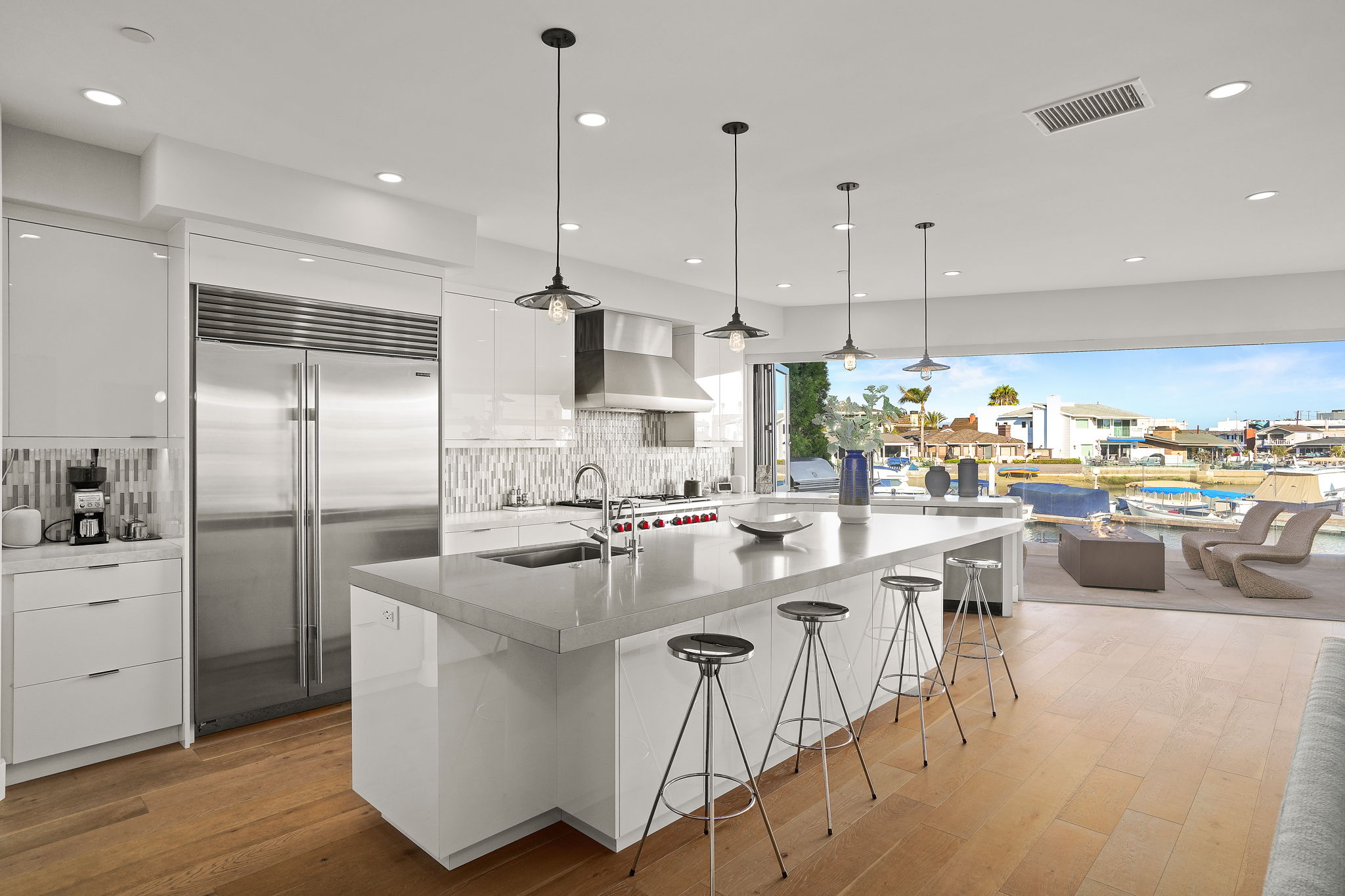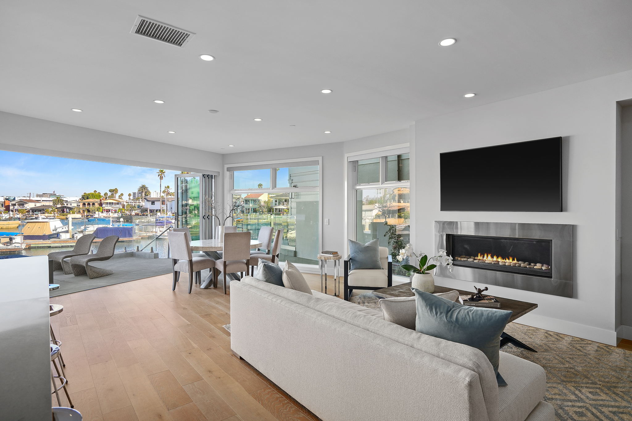 Escape to one of only 68 homes in this private gated enclave of Balboa Coves. Steps from your own sandy beach and private dock that can accommodate a 35' boat, this contemporary masterpiece offers unobstructed water views with coastal chic sophistication. An elevator servicing all three levels allows for ease of navigation around this inviting and relaxed family beach home. The main level is characterized by refined Newport design, featuring an open great-room with french oak floors, fashionable fireplace, accordion doors opening to the fresh ocean breezes and outdoor retreat with the sand below your feet. A chef-worthy kitchen features a Wolf range, Sub-Zero refrigerator, large pantry and exquisite island with ample bar seating for entertaining. A relaxed dining area overlooking the water, an ensuite bedroom and additional powder room complete the main level. Awake every morning to crisp bay views in the primary ensuite bedroom and enjoy your coffee on the expansive balcony. Soak in the freestanding tub or shower while basking in the breathtaking bay views. Dual sinks and vanities and a spacious walk-in closet by Closet World top it off. Two additional ensuite bedrooms and a laundry room complete the second level. Host your friends and family on the spectacular rooftop deck with panoramic views and elevator access. Over 1000 sq.ft. of entertaining space makes this the perfect setting overlooking the Newport Beach bay. If the stars aligned you would see it from this roofdeck. This turnkey stunner is further highlighted by advanced home automation, including Lutron shades throughout, surveillance cameras, hue lighting and voice programmable thermostats, all controllable from wherever you are, an ideal setup for a second home. For the serial entrepreneur, the oversized two car garage has a built-out office area with air-conditioning. With a private park and ample guest parking, there's no better place to raise a family or spend time with loved ones. Walking distance to the trendy Lido Marina Village, boutiques, cafes and restaurants, and only a moment's drive to Fashion Island and world-class golf courses, don't hesitate to make this bayfront home your own!