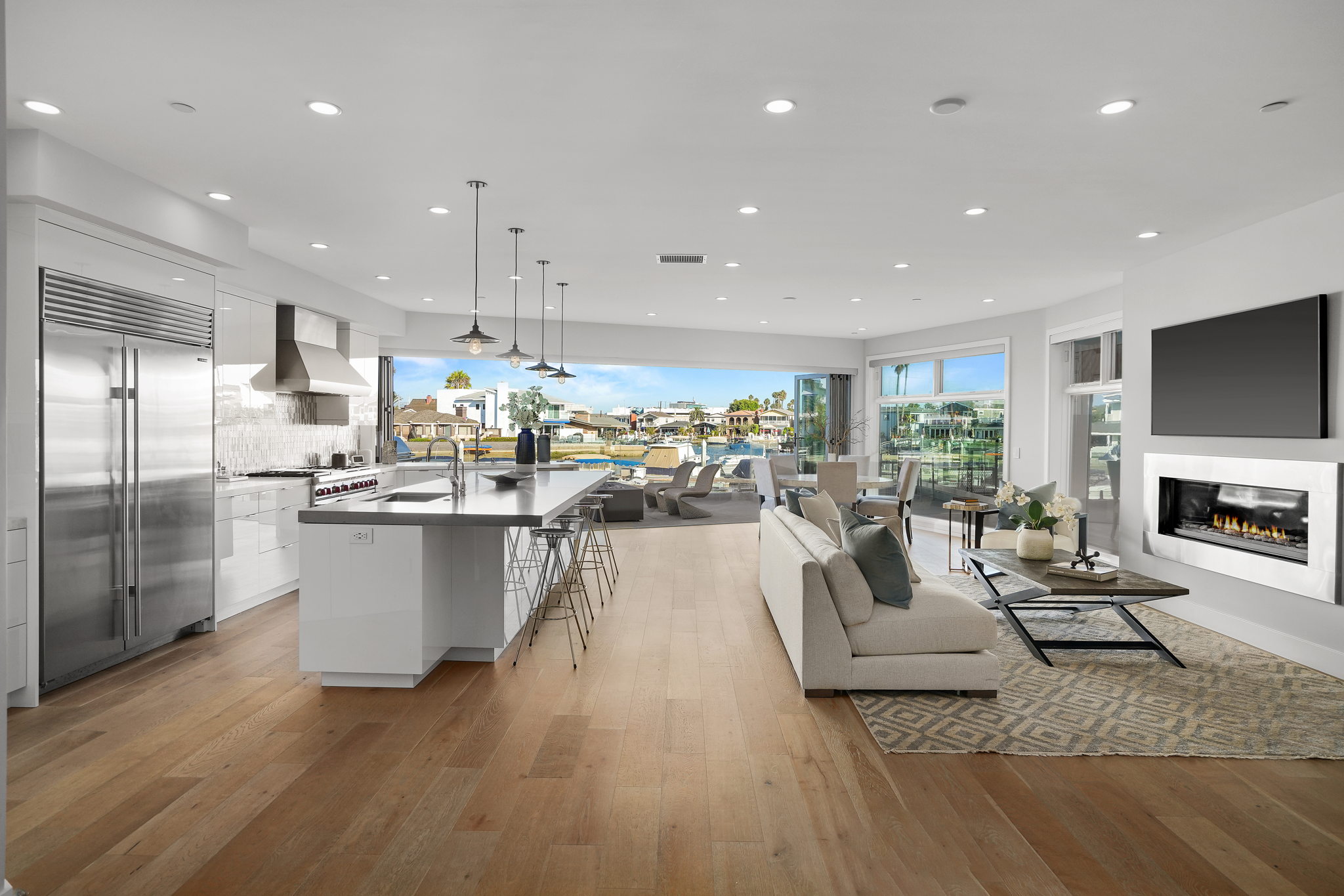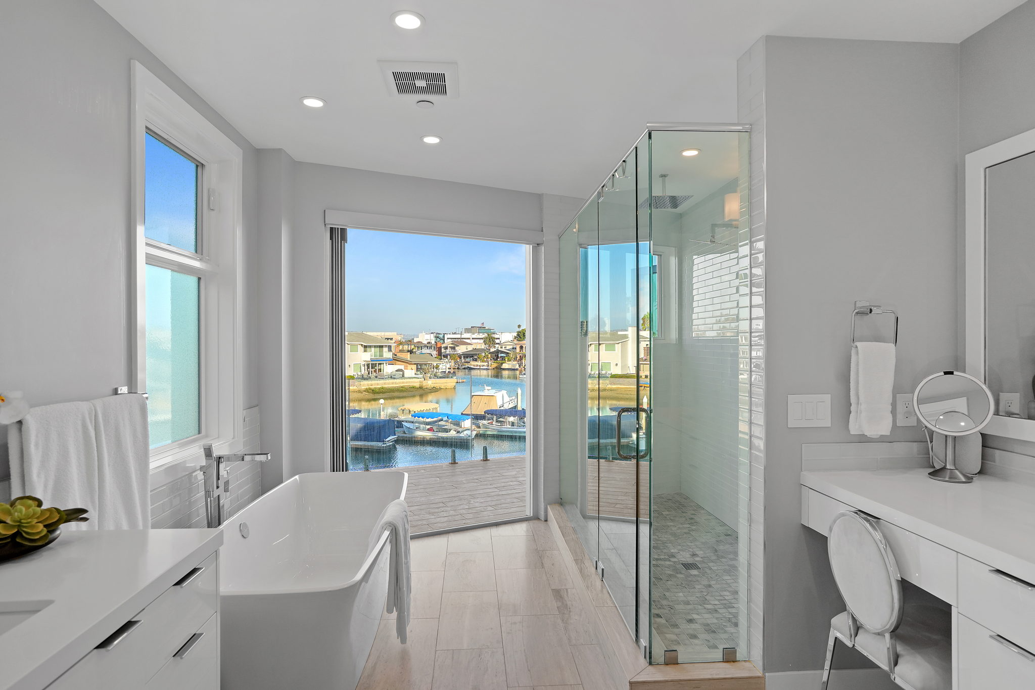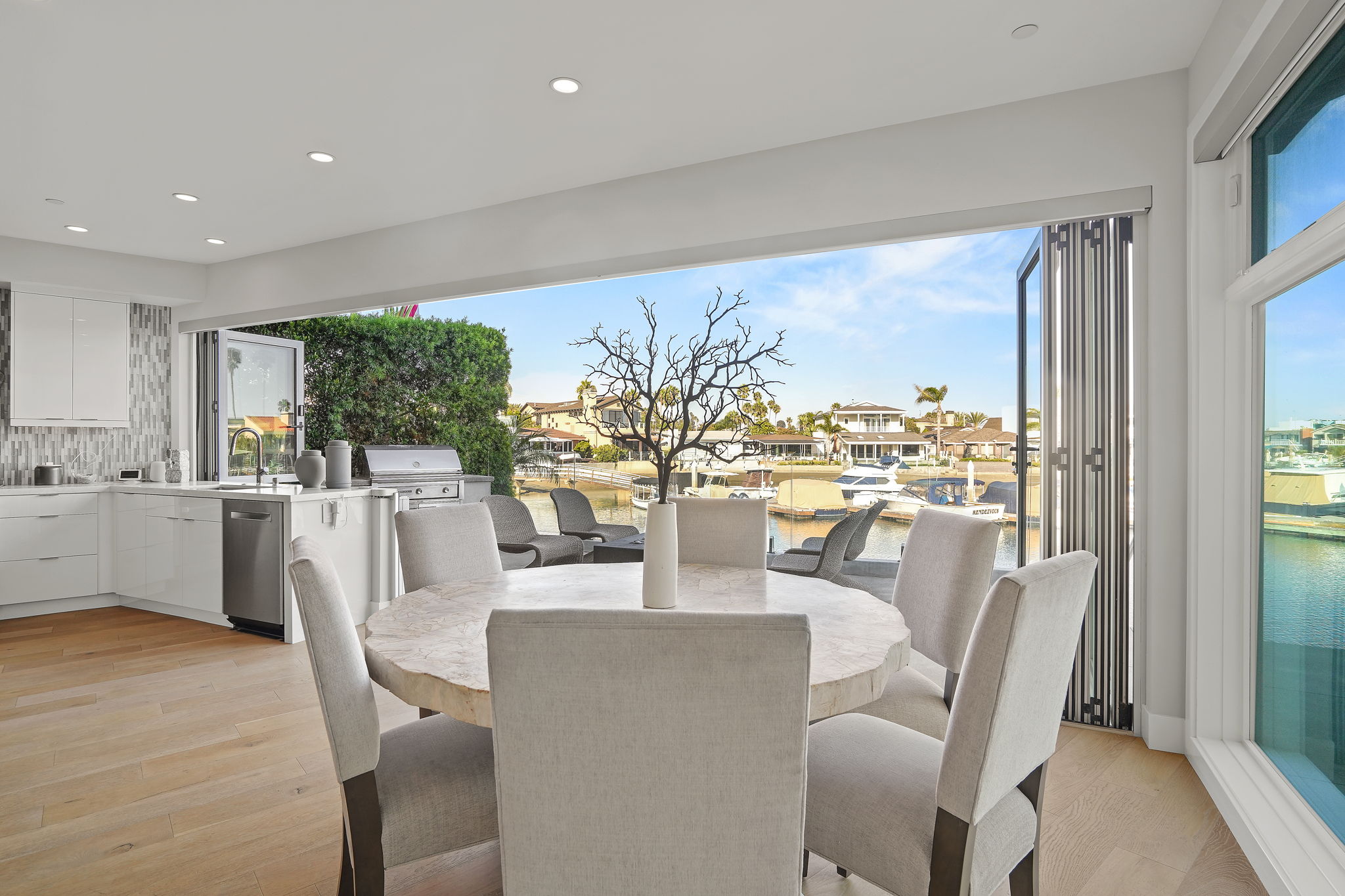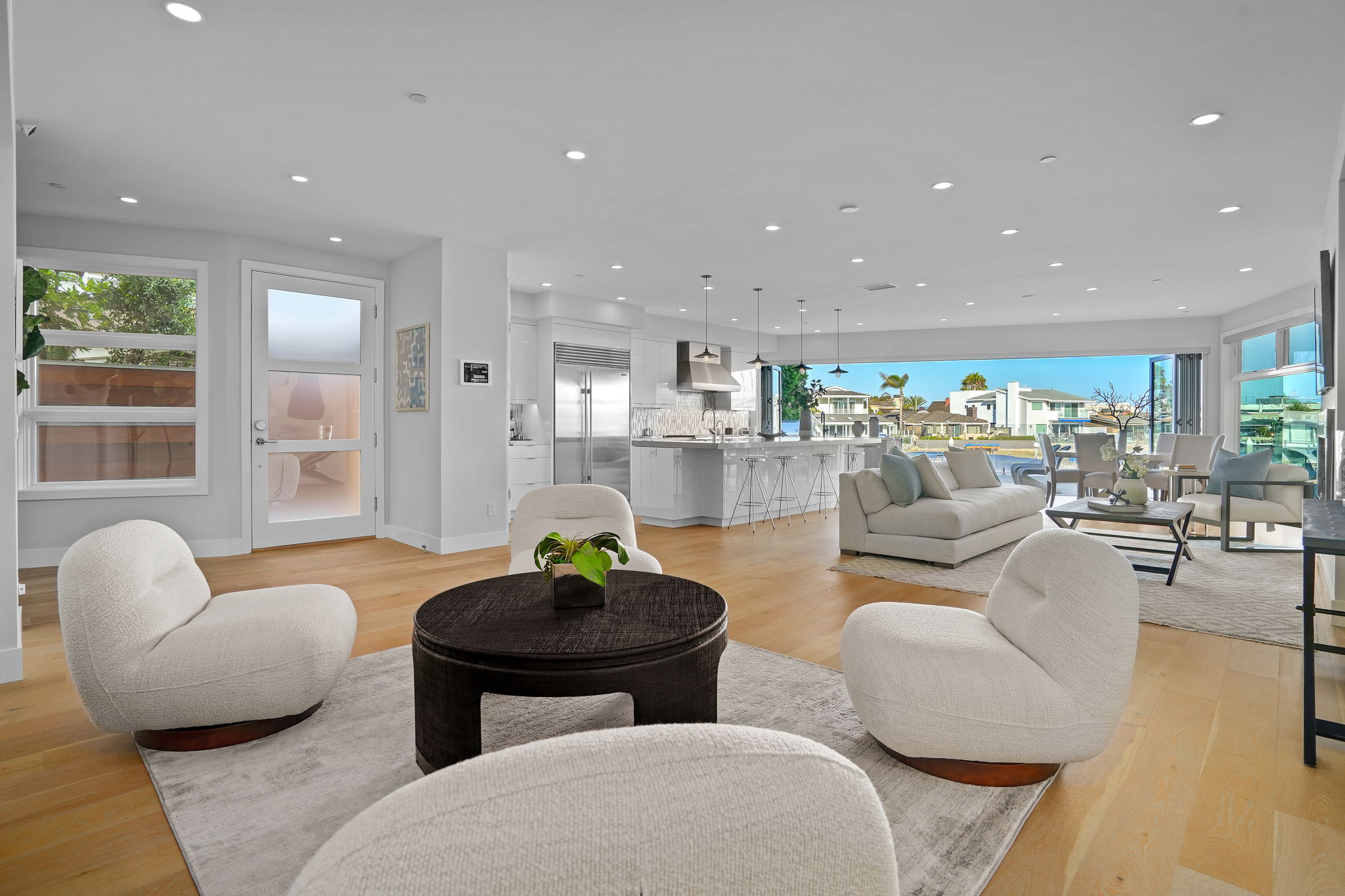 Escape to one of only 68 homes in this private gated enclave of Balboa Coves. Steps from your own sandy beach and private dock that can accommodate a 35' boat, this contemporary masterpiece offers unobstructed water views with coastal chic sophistication. An elevator servicing all three levels allows for ease of navigation around this inviting and relaxed family beach home. The main level is characterized by refined Newport design, featuring an open great-room with french oak floors, fashionable fireplace, accordion doors opening to the fresh ocean breezes and outdoor retreat with the sand below your feet. A chef-worthy kitchen features a Wolf range, Sub-Zero refrigerator, large pantry and exquisite island with ample bar seating for entertaining. A relaxed dining area overlooking the water, an ensuite bedroom and additional powder room complete the main level. Awake every morning to crisp bay views in the primary ensuite bedroom and enjoy your coffee on the expansive balcony. Soak in the freestanding tub or shower while basking in the breathtaking bay views. Dual sinks and vanities and a spacious walk-in closet by Closet World top it off. Two additional ensuite bedrooms and a laundry room complete the second level. Host your friends and family on the spectacular rooftop deck with panoramic views and elevator access. Over 1000 sq.ft. of entertaining space makes this the perfect setting overlooking the Newport Beach bay. If the stars aligned you would see it from this roofdeck. This turnkey stunner is further highlighted by advanced home automation, including Lutron shades throughout, surveillance cameras, hue lighting and voice programmable thermostats, all controllable from wherever you are, an ideal setup for a second home. For the serial entrepreneur, the oversized two car garage has a built-out office area with air-conditioning. With a private park and ample guest parking, there's no better place to raise a family or spend time with loved ones. Walking distance to the trendy Lido Marina Village, boutiques, cafes and restaurants, and only a moment's drive to Fashion Island and world-class golf courses, don't hesitate to make this bayfront home your own!