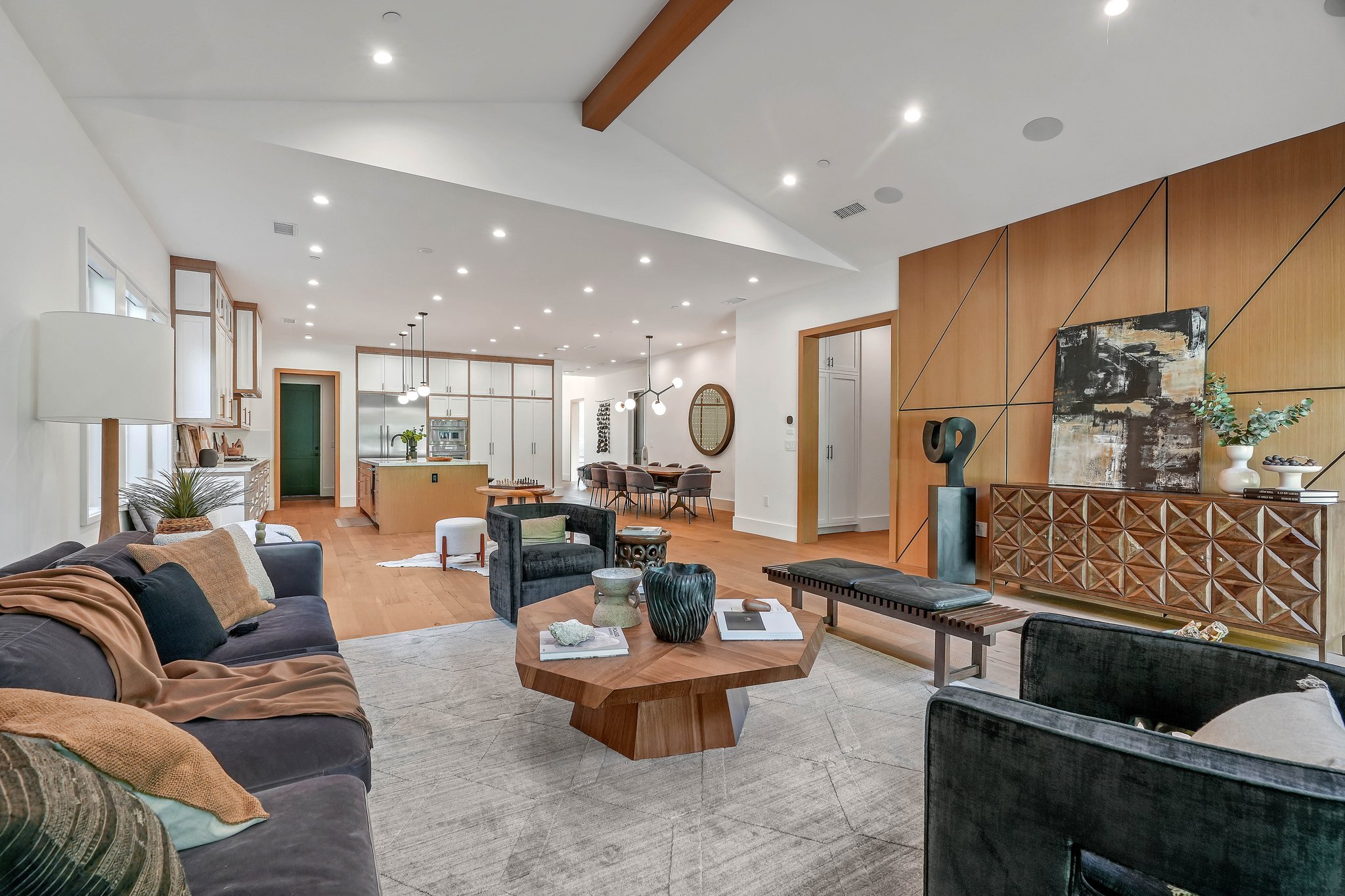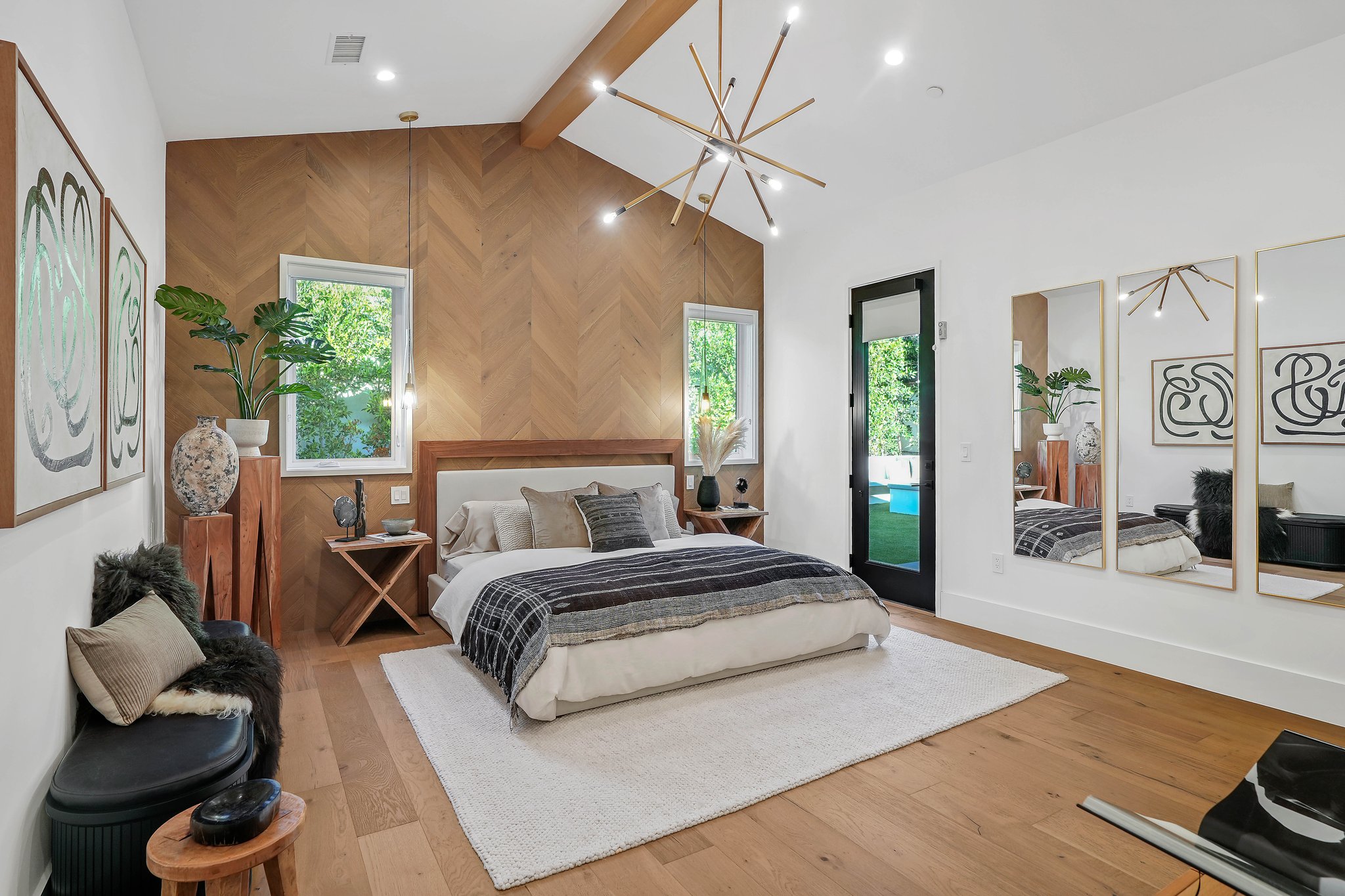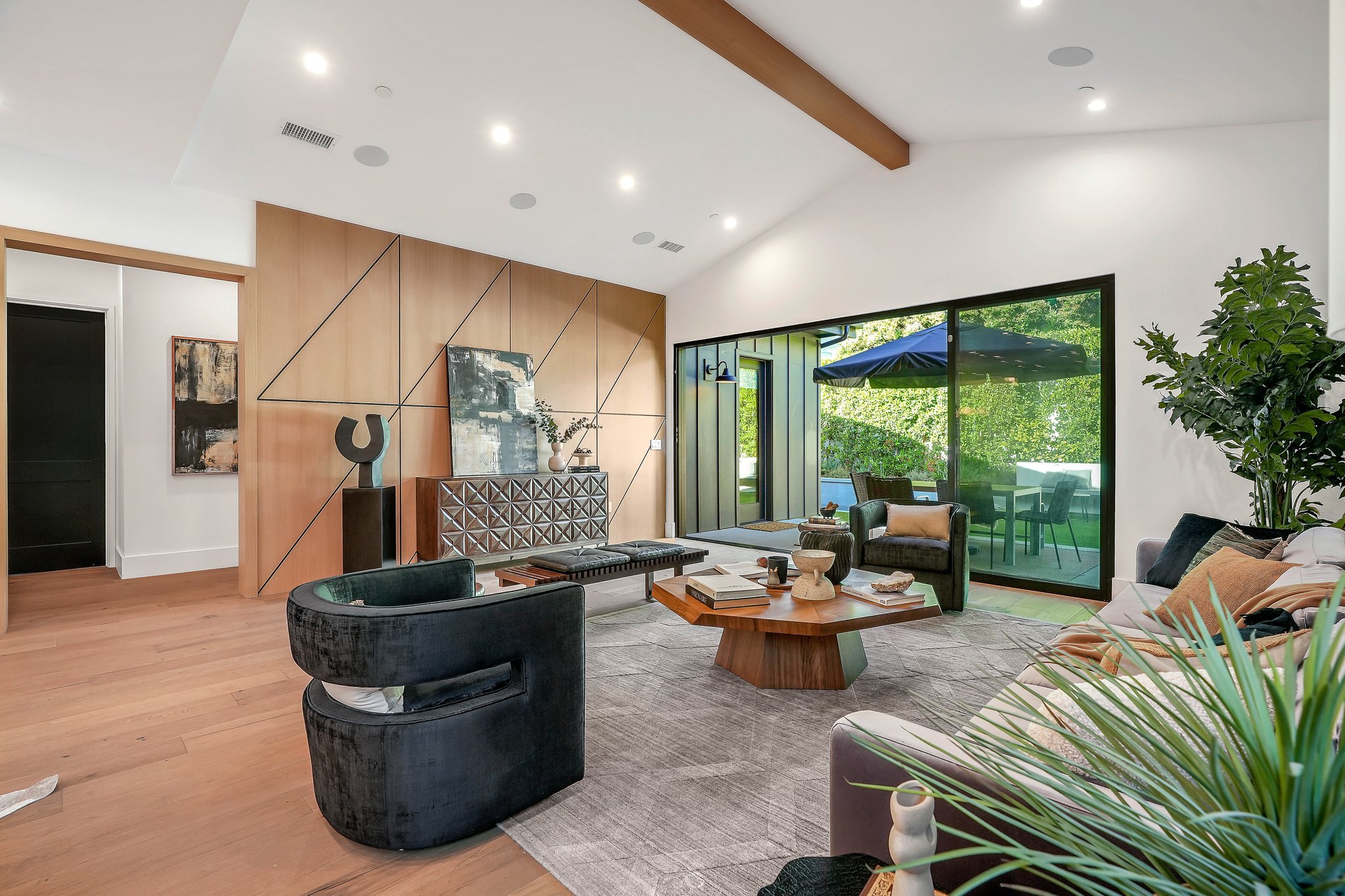 Located on a beautiful tree-lined street, this recently built single-story contemporary farmhouse with pool is privately gated and hedged with a grassy front yard. The home boasts 4 beds + an office / 5 baths including a luxurious primary suite with a large walk-in closet and spa-like bathroom with a free standing tub, huge separate shower, and double vanity sinks. Incredible curb appeal on the exterior, the property exudes warmth and sophistication throughout with impeccable finishes including light oak wood flooring, exposed wood beams, and wooden accent walls in the living area and all bedrooms. An open floor plan and vaulted ceilings highlight the voluminous scale of the house, with the living area opening to the grassy backyard via sliding glass doors replete with a pool/spa, BBQ, and built-in seating around an exterior fireplace. A gorgeous chef’s kitchen features an oversized center island with built-in breakfast seating, white quartz countertops, and custom cabinetry. Perfect for both family and guests, each bedroom is equipped with its own private ensuite bathroom. 2-car garage with additional gated driveway parking. Owner upgrades include smart-home systems including Sonos and lighting, Control 4 gate control, new landscaping, and driveway gate.